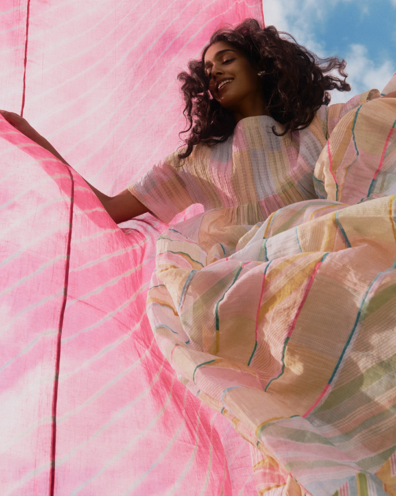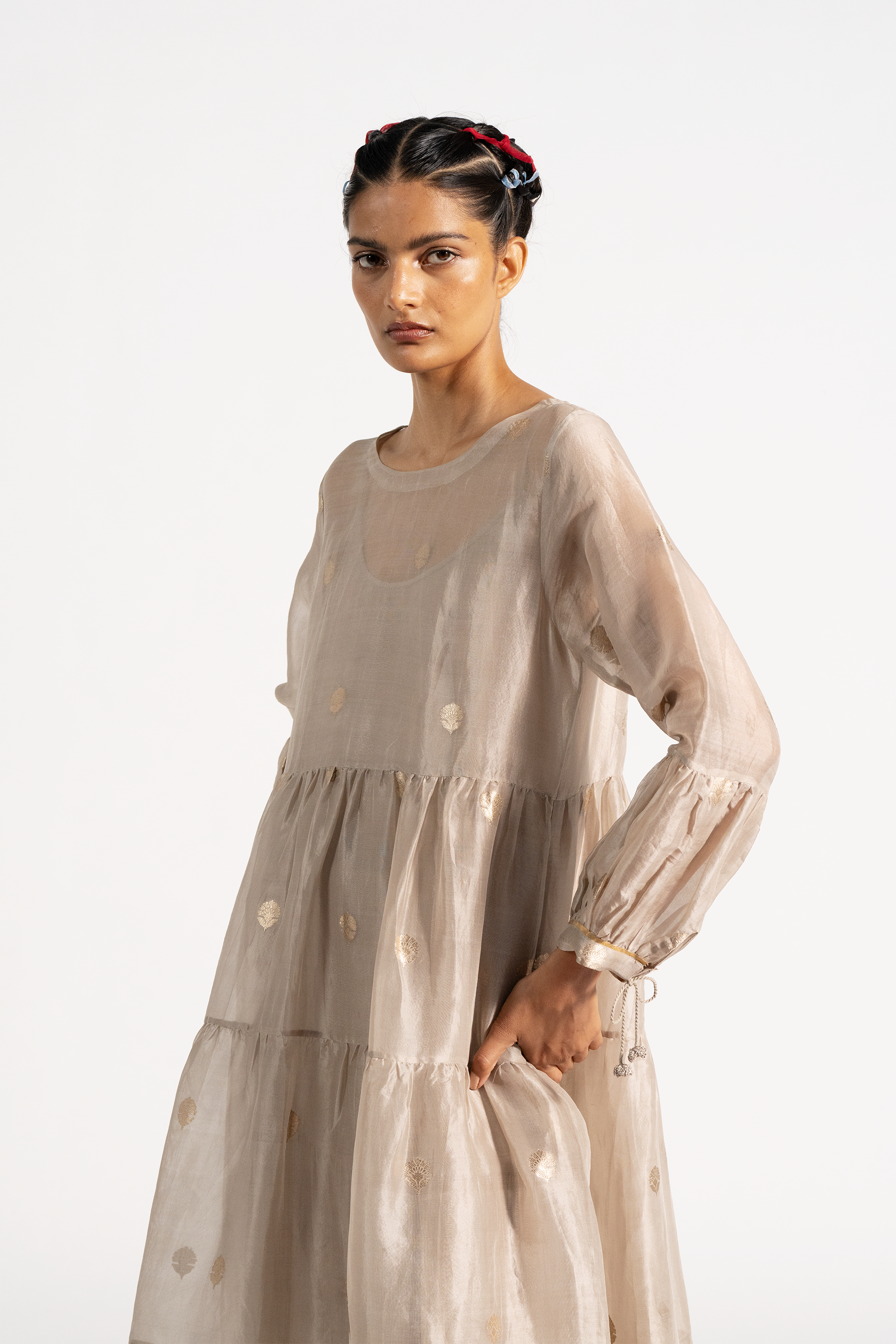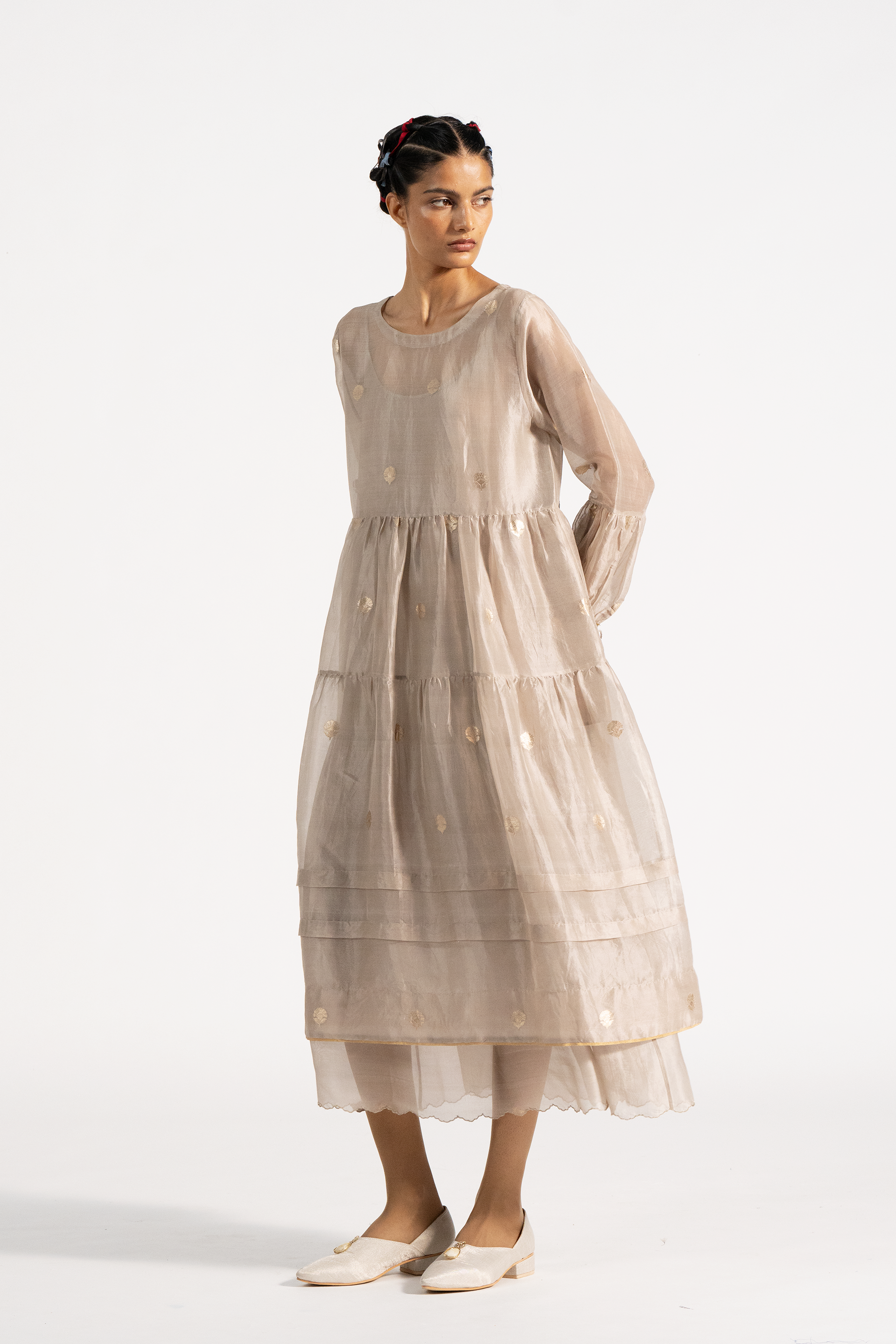 Relaxed fit round neck tiered dress in gold jacquard buta organza. Comes with a complimentary cotton silk lining.