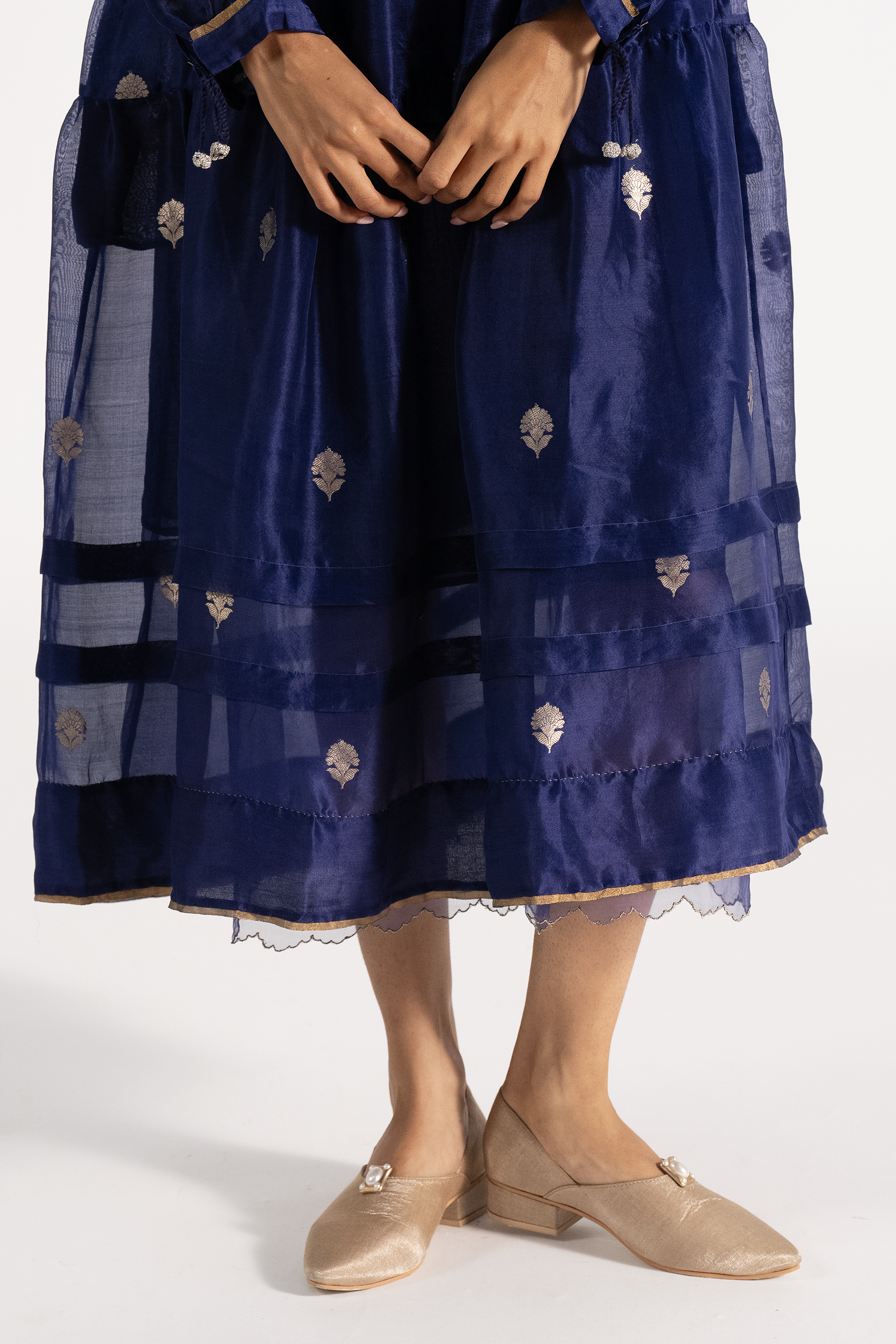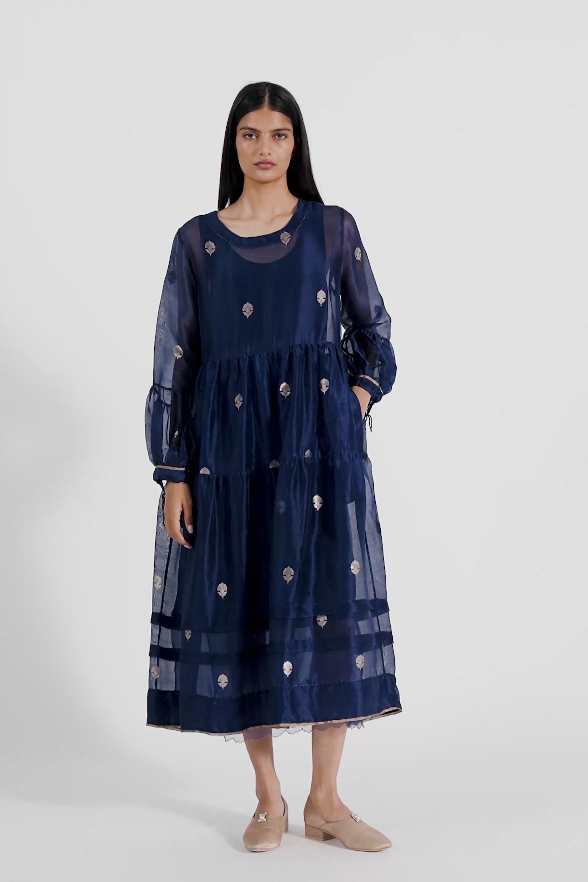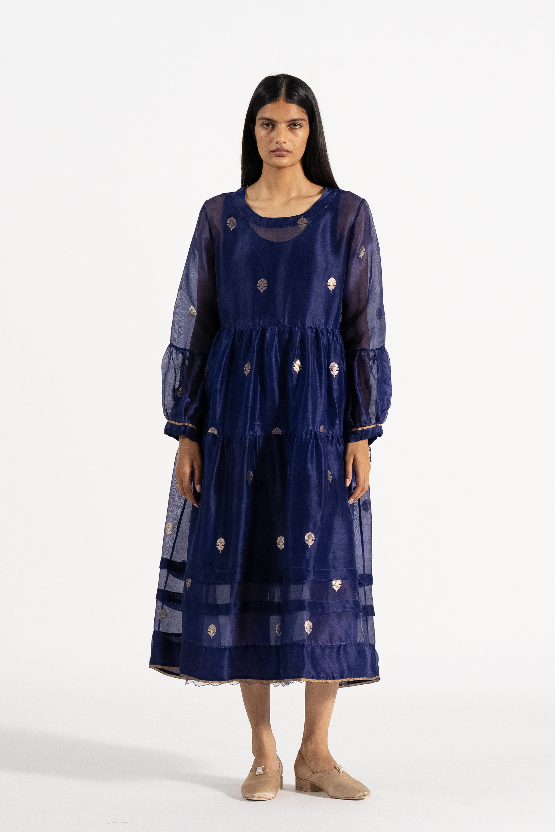 Relaxed Fit Round Neck Tiered Dress In Gold Jacquard Buta Organza.comes With A Separate Cotton Silk Lining