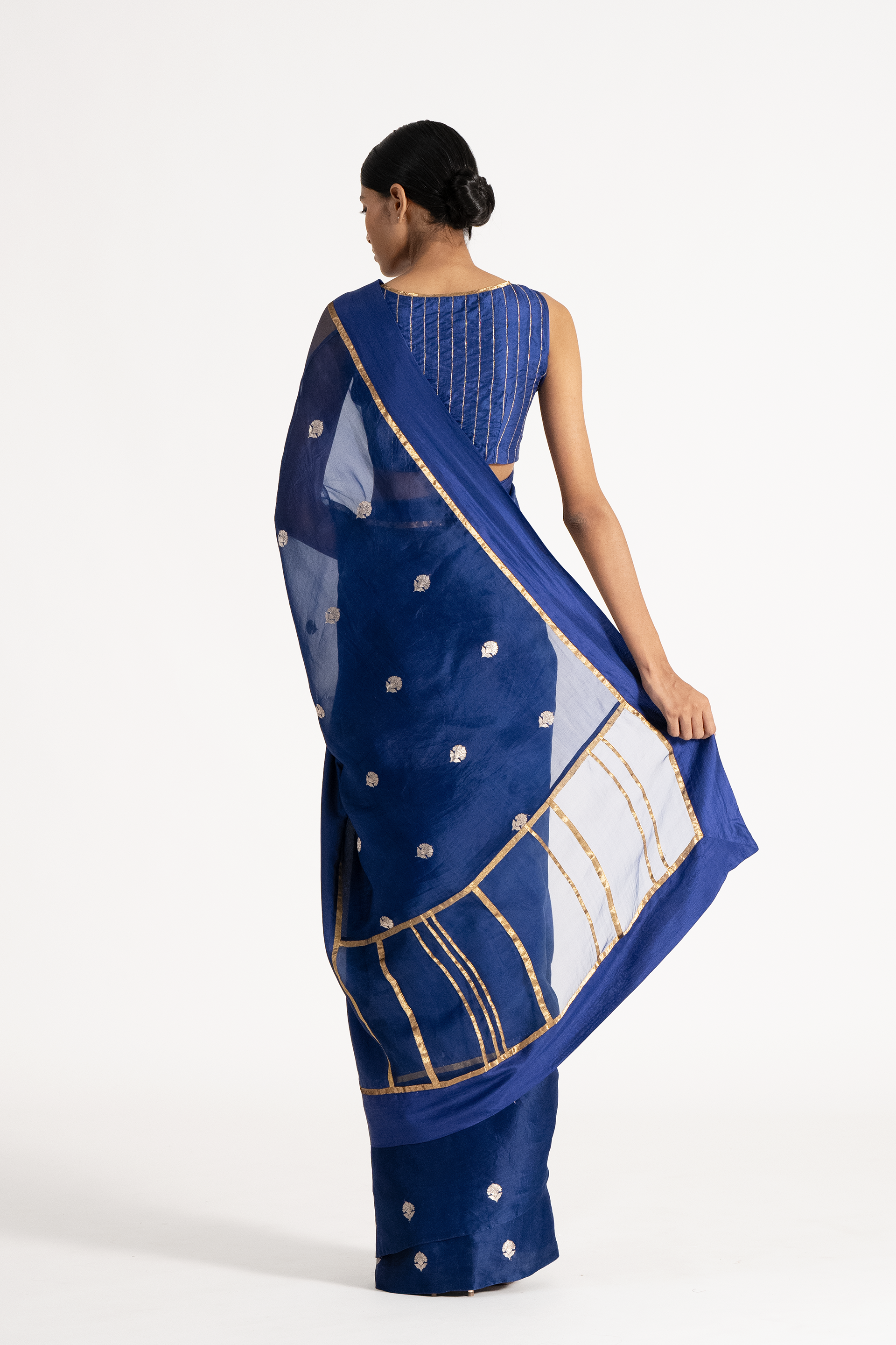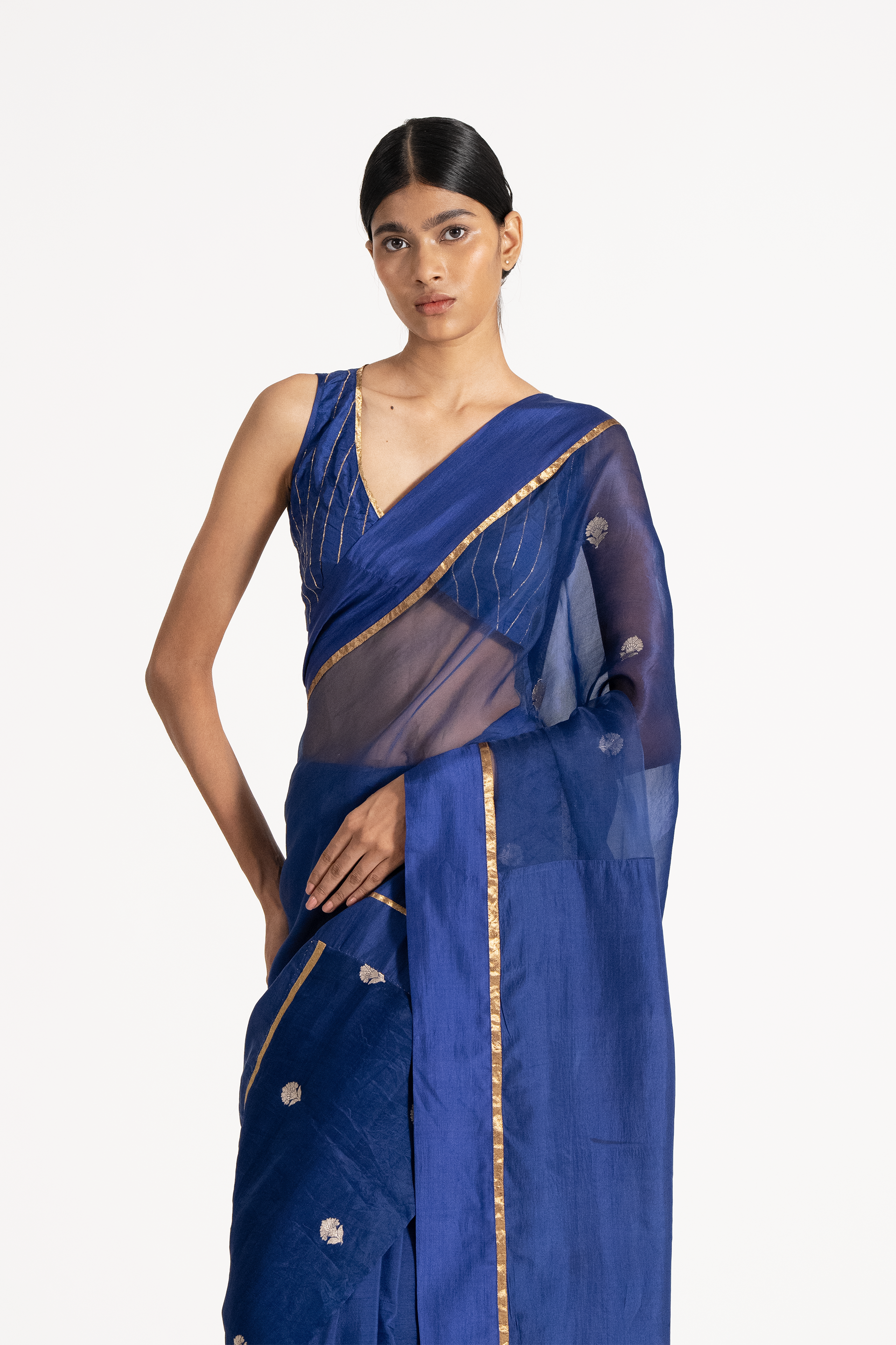 Patchwork Saree In Silk, Jacquard Butti And Organza With Piping Detail On Border.