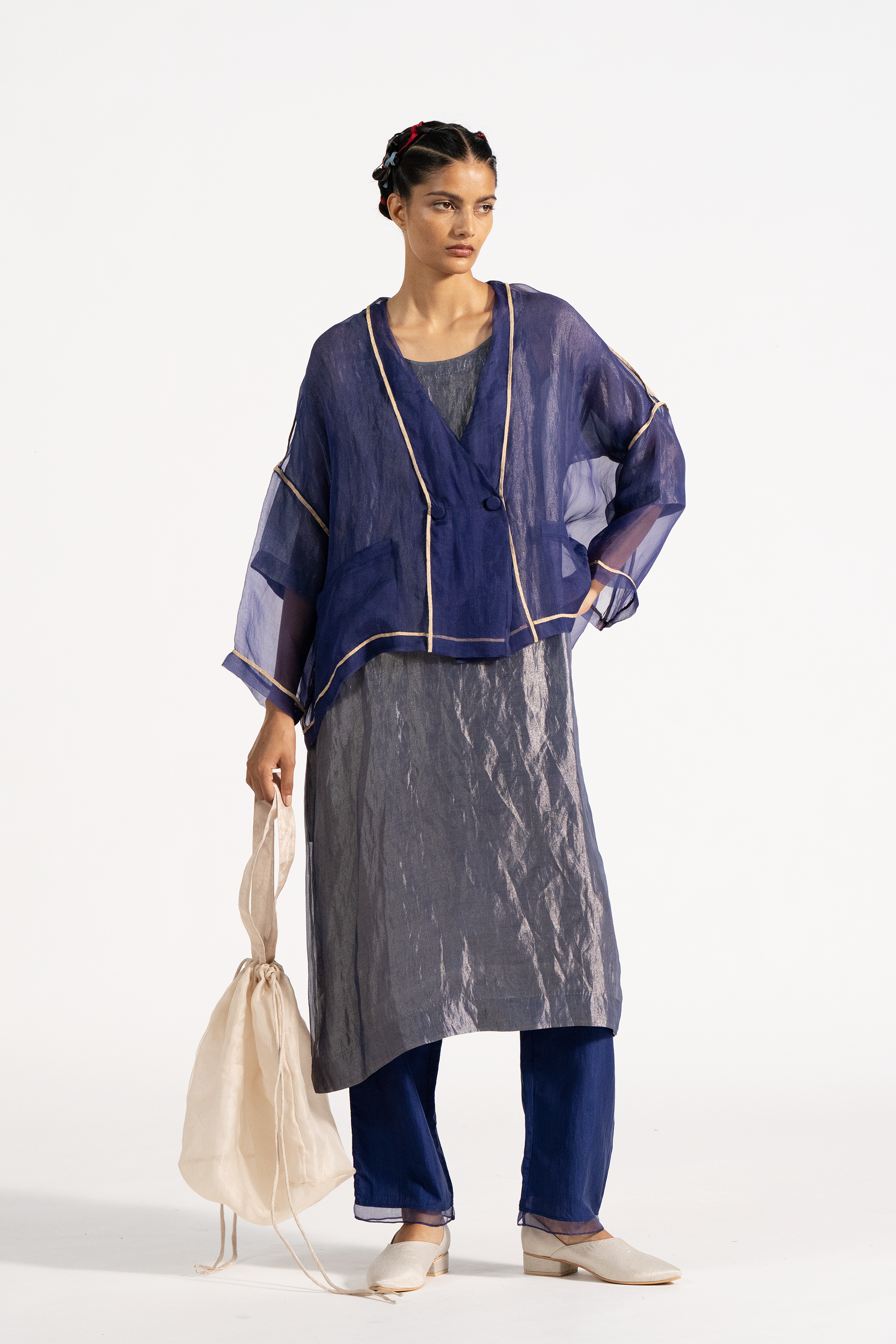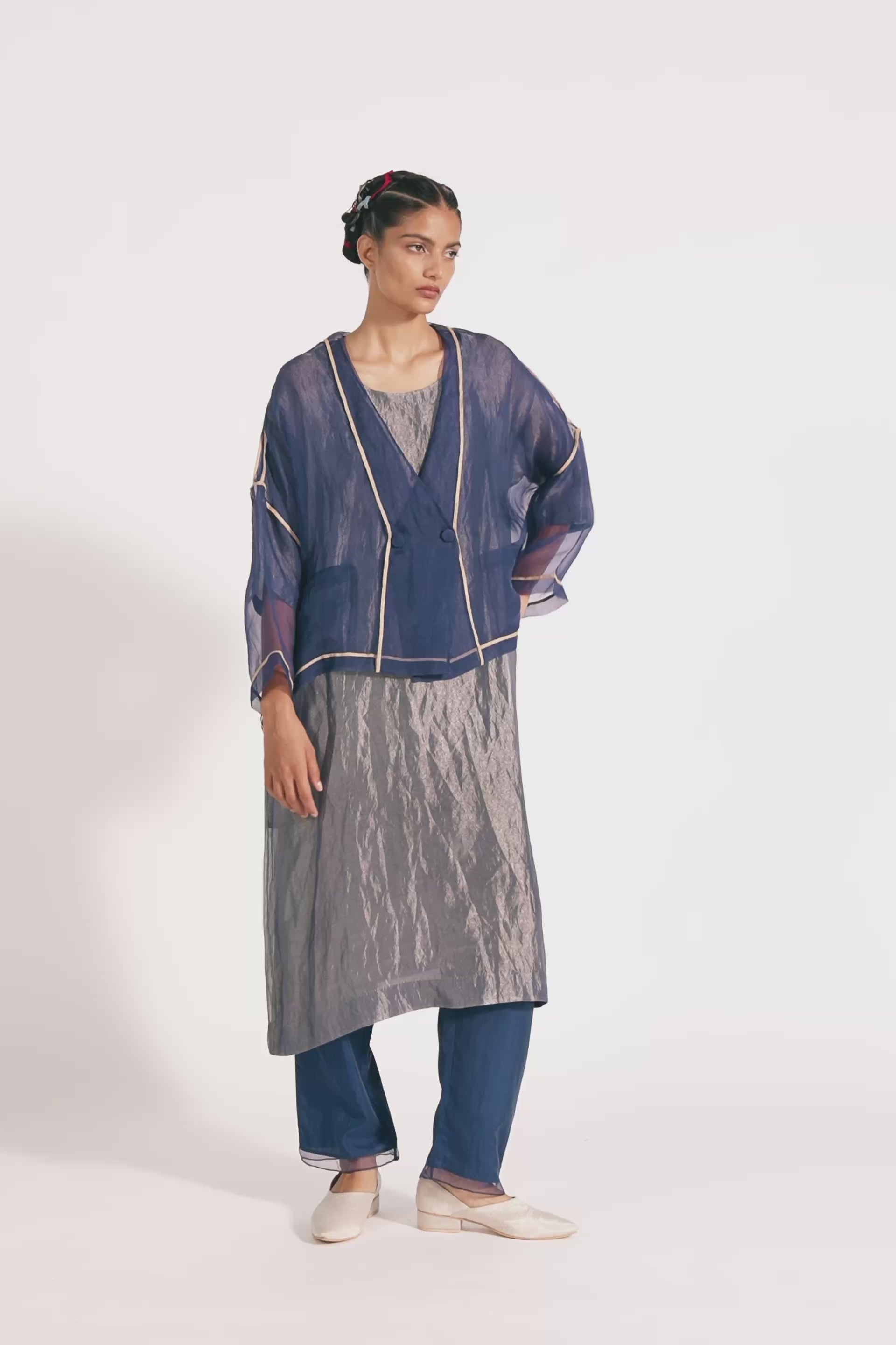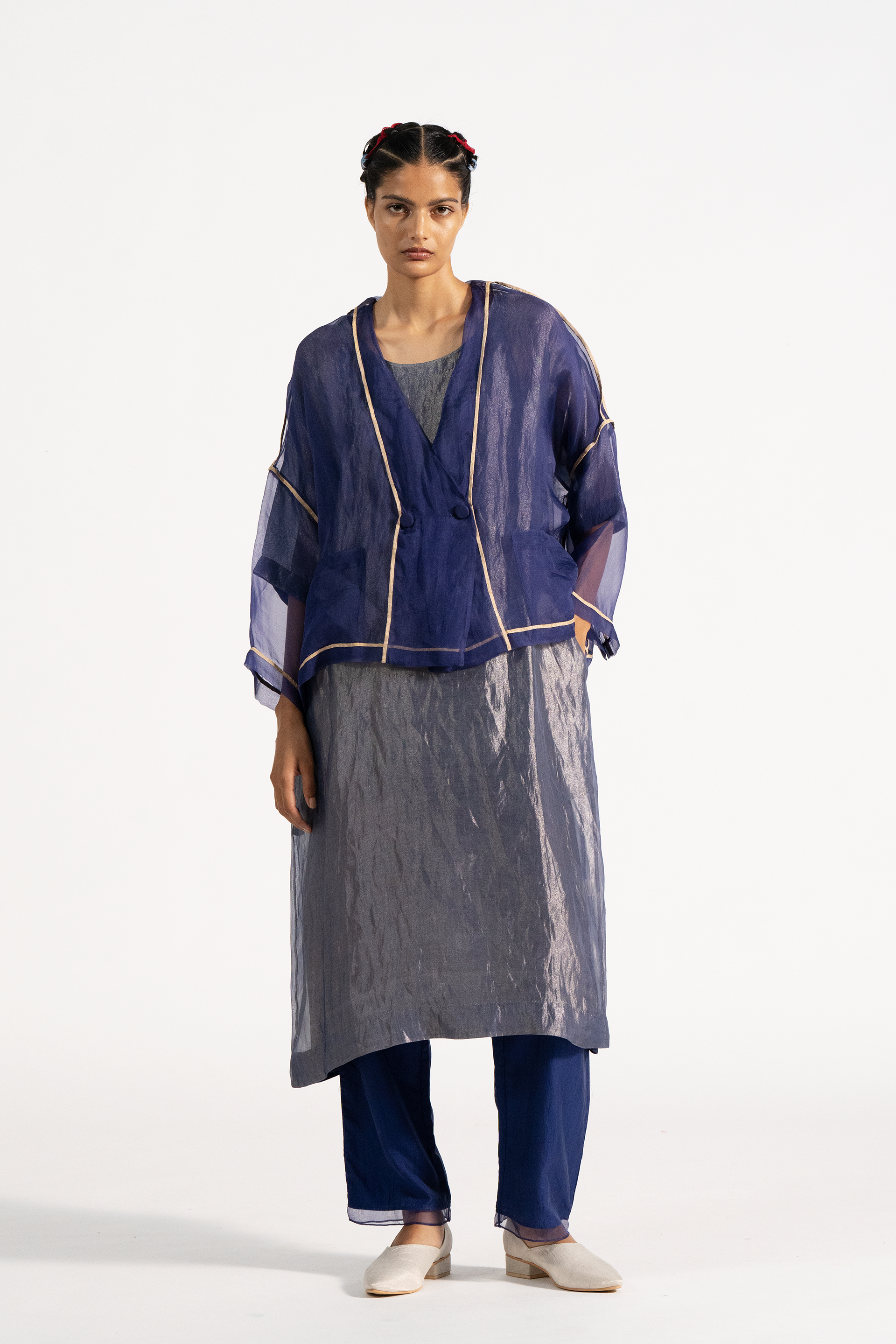 Relaxed fit drop shoulder double breasted v neck short jacket in organza with relaxed fit tunic kurta dress in organza tissue. Comes with a separate cotton silk lining. The look is completed with straight silk  trouser with organza border on hem.