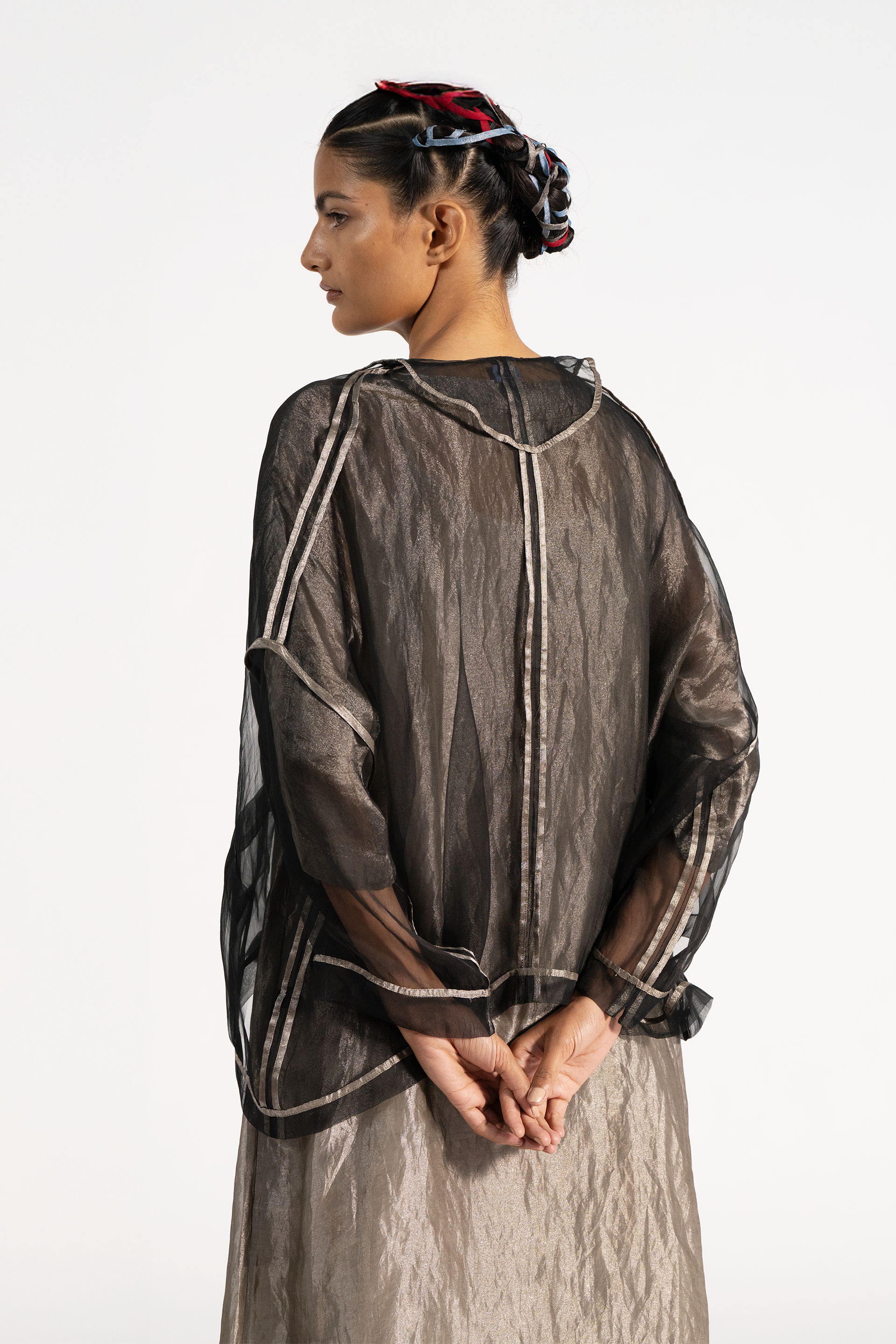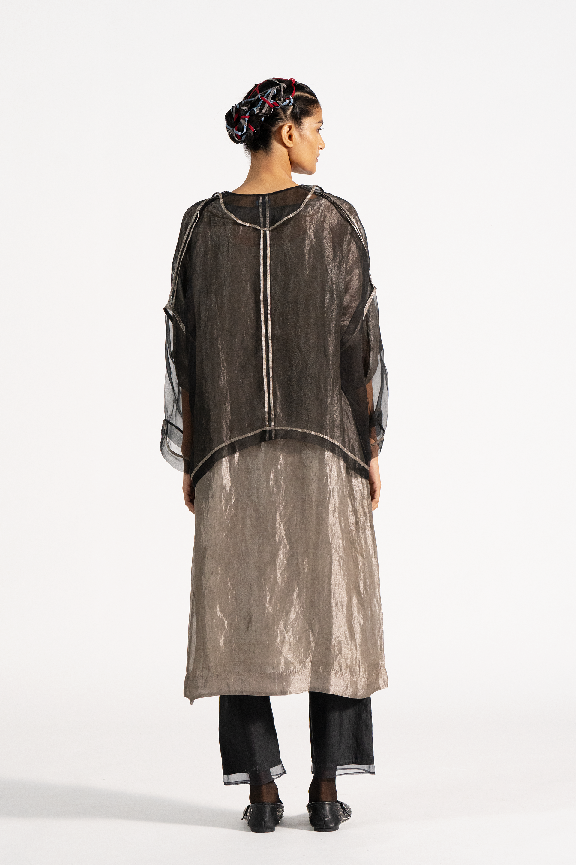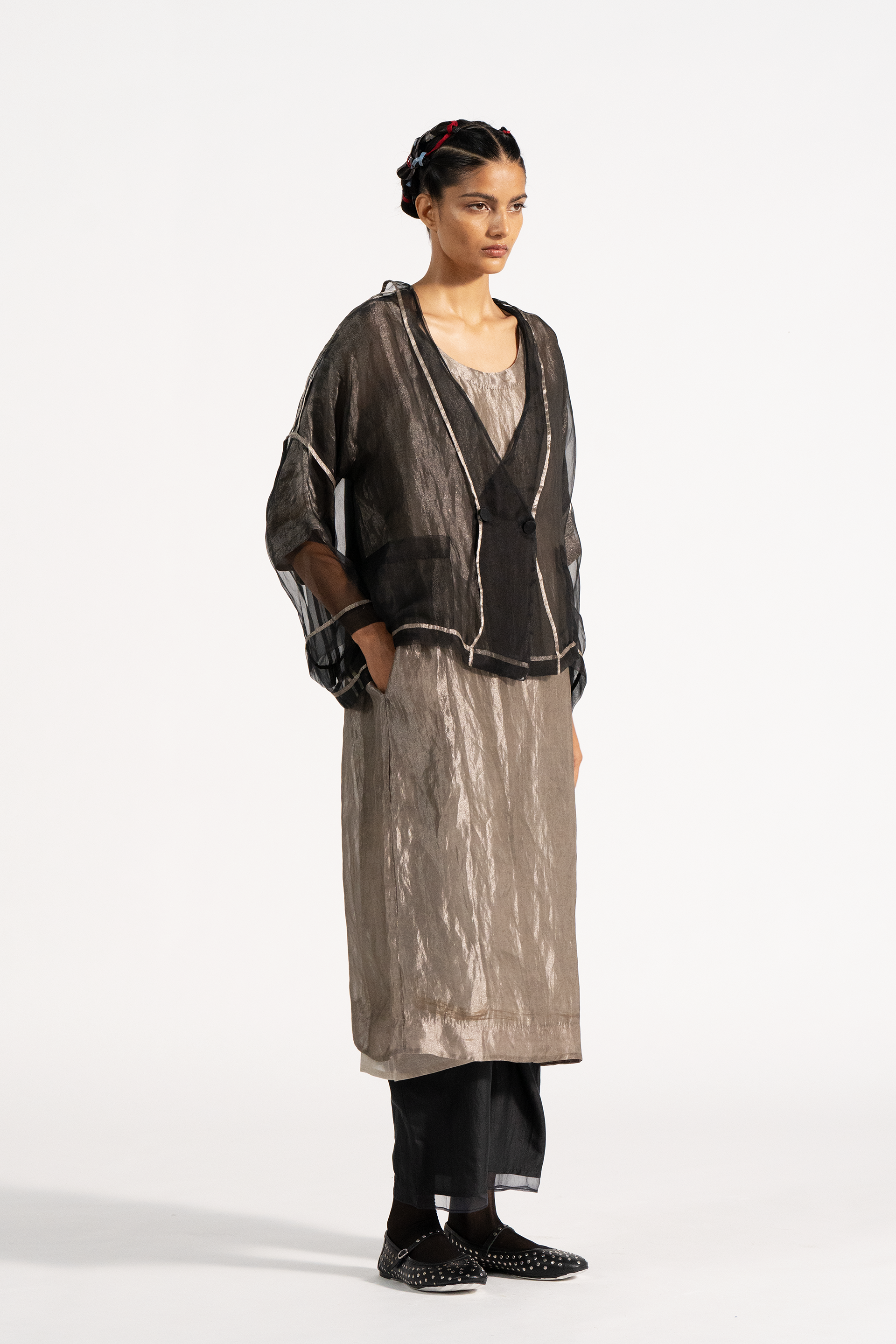 Relaxed fit drop shoulder double breasted v neck short jacket in organza with relaxed fit tunic kurta dress in organza tissue. Comes with a separate cotton silk lining. The look is completed with straight fit silk trouser with organza border on hem.
