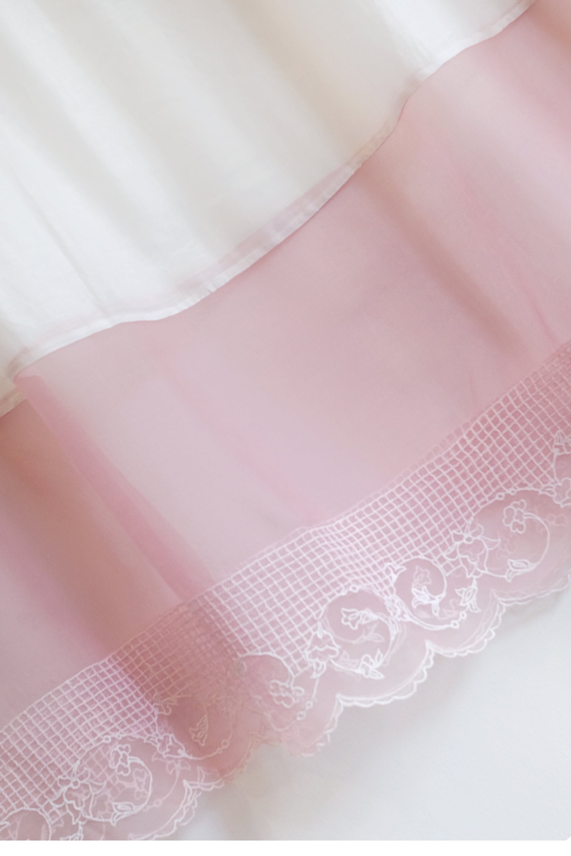 A refined tiered cotton silk lining garment with an organza embroidered hem, showcasing intricate thread work.