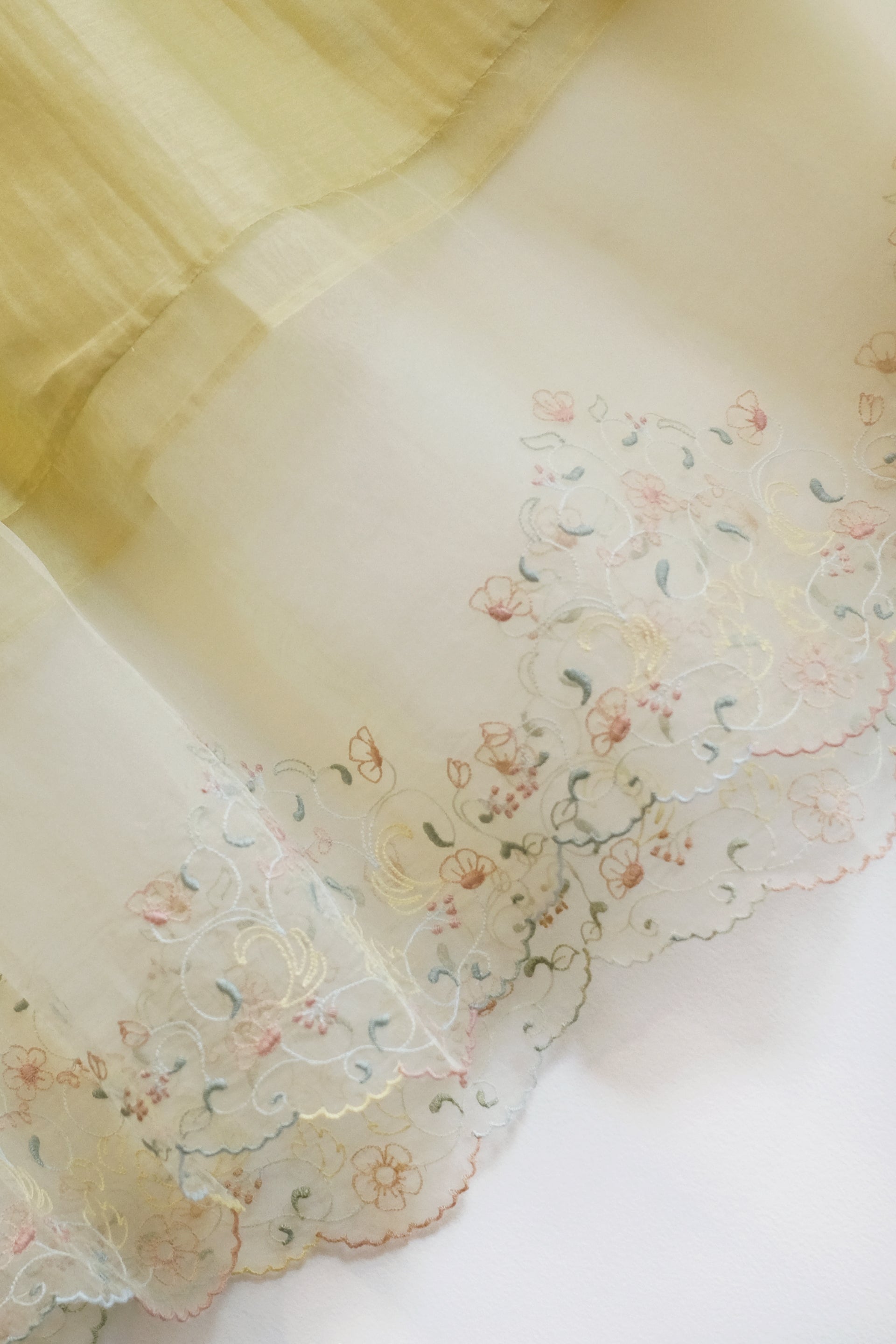 A refined tiered cotton silk lining garment with an organza embroidered hem, showcasing intricate thread work.