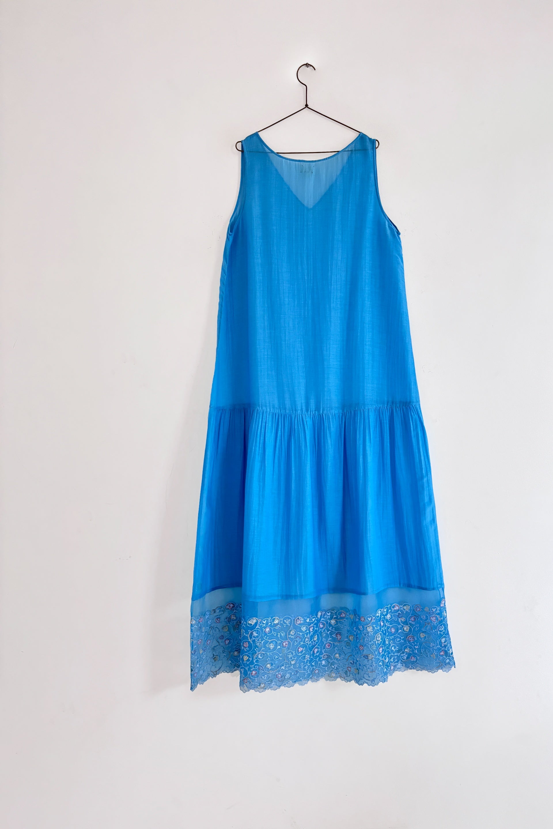 A tiered lining in cotton silk, adorned with an embroidered organza trim along the hem, beautifully highlighted by intricate thread and zari work throughout.