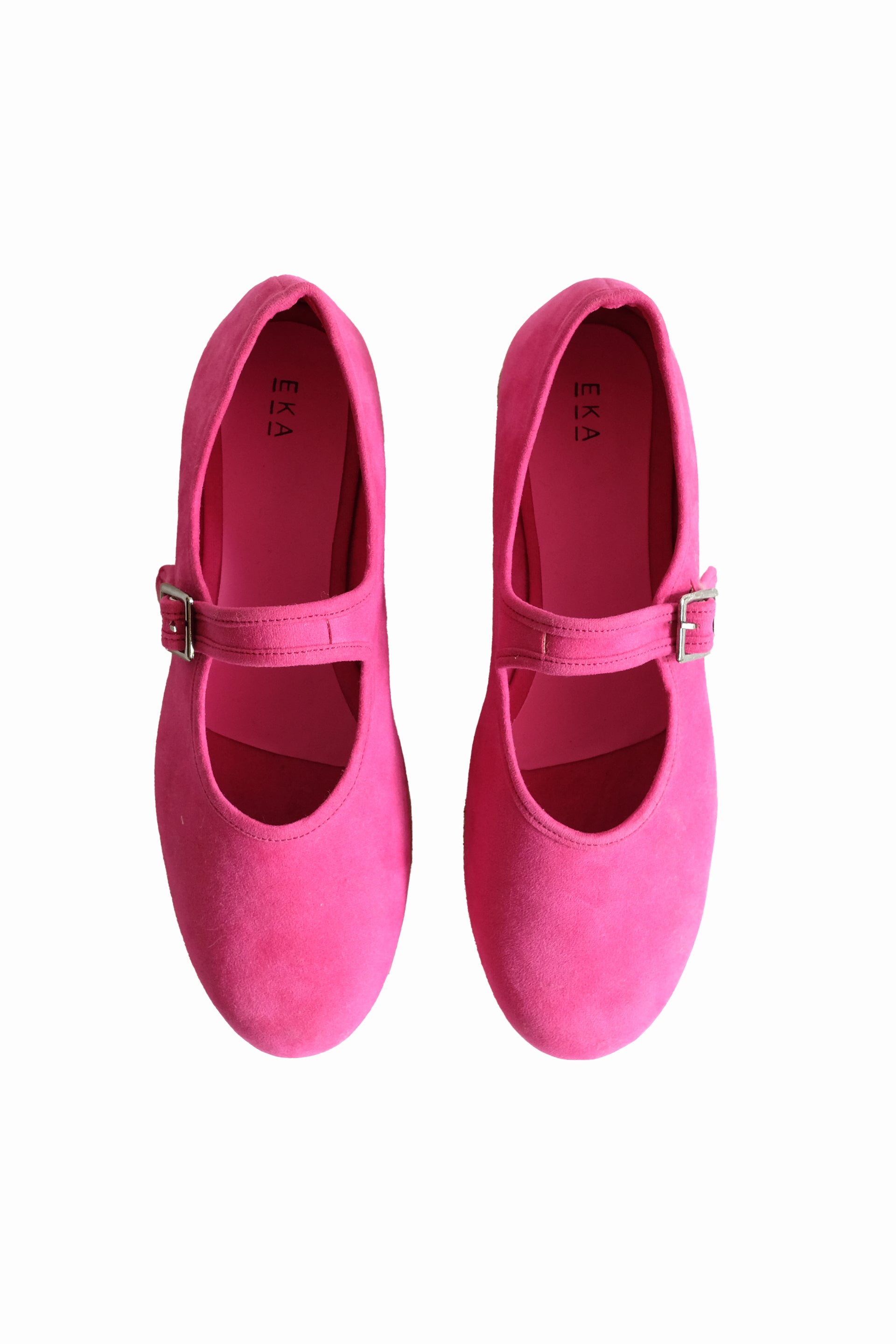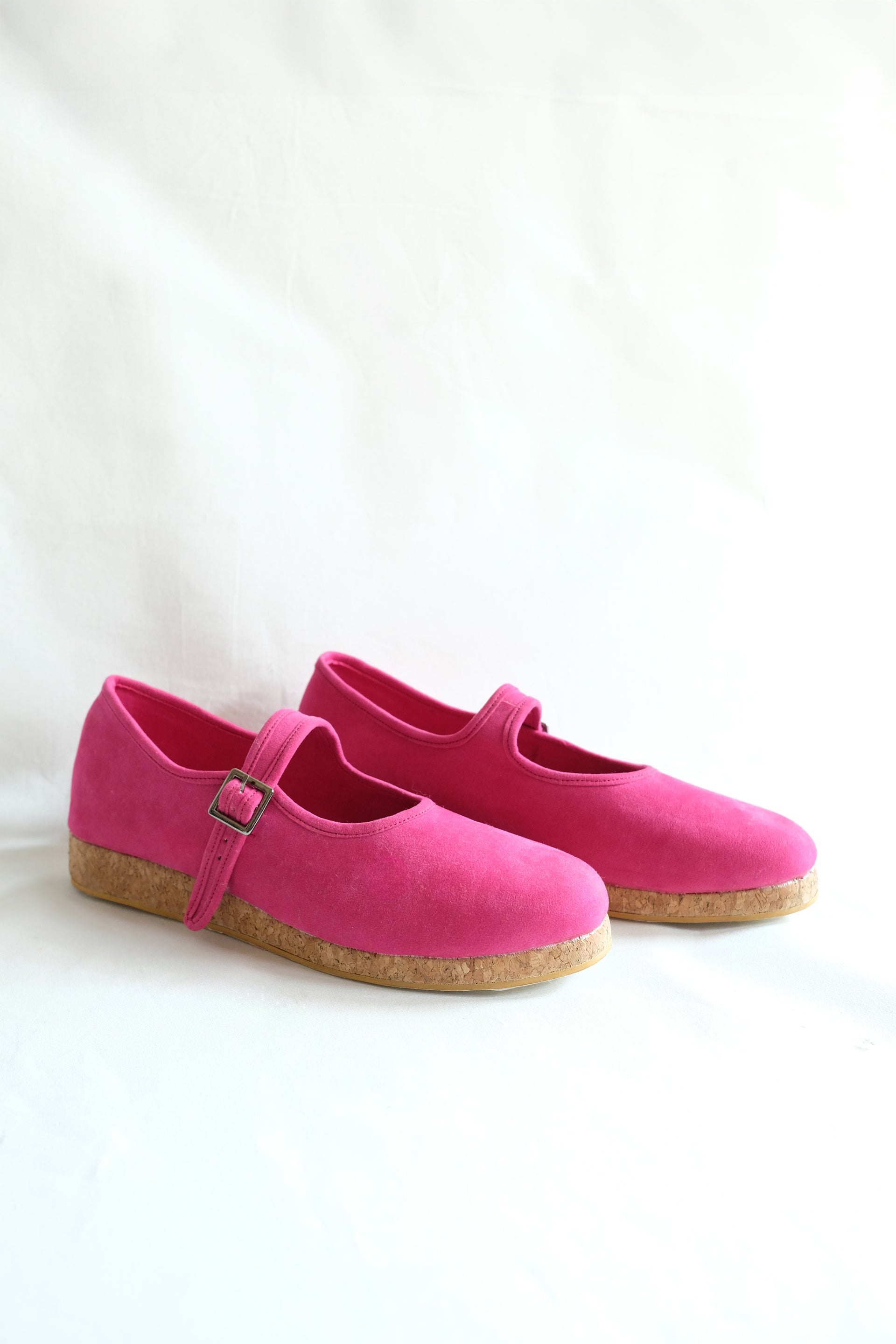 Mary Jane–style flats with contrast edge binding and a natural cork-textured sole