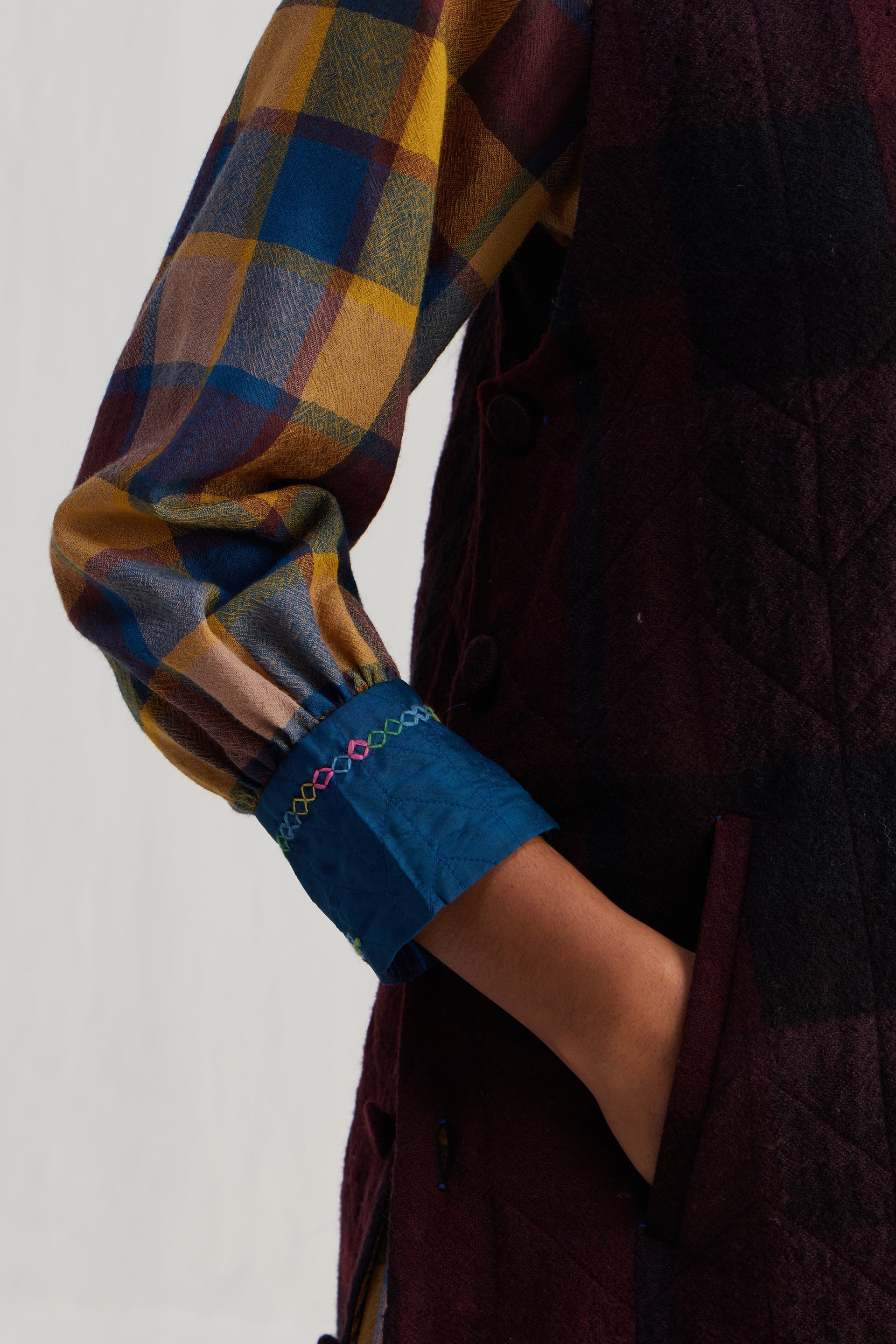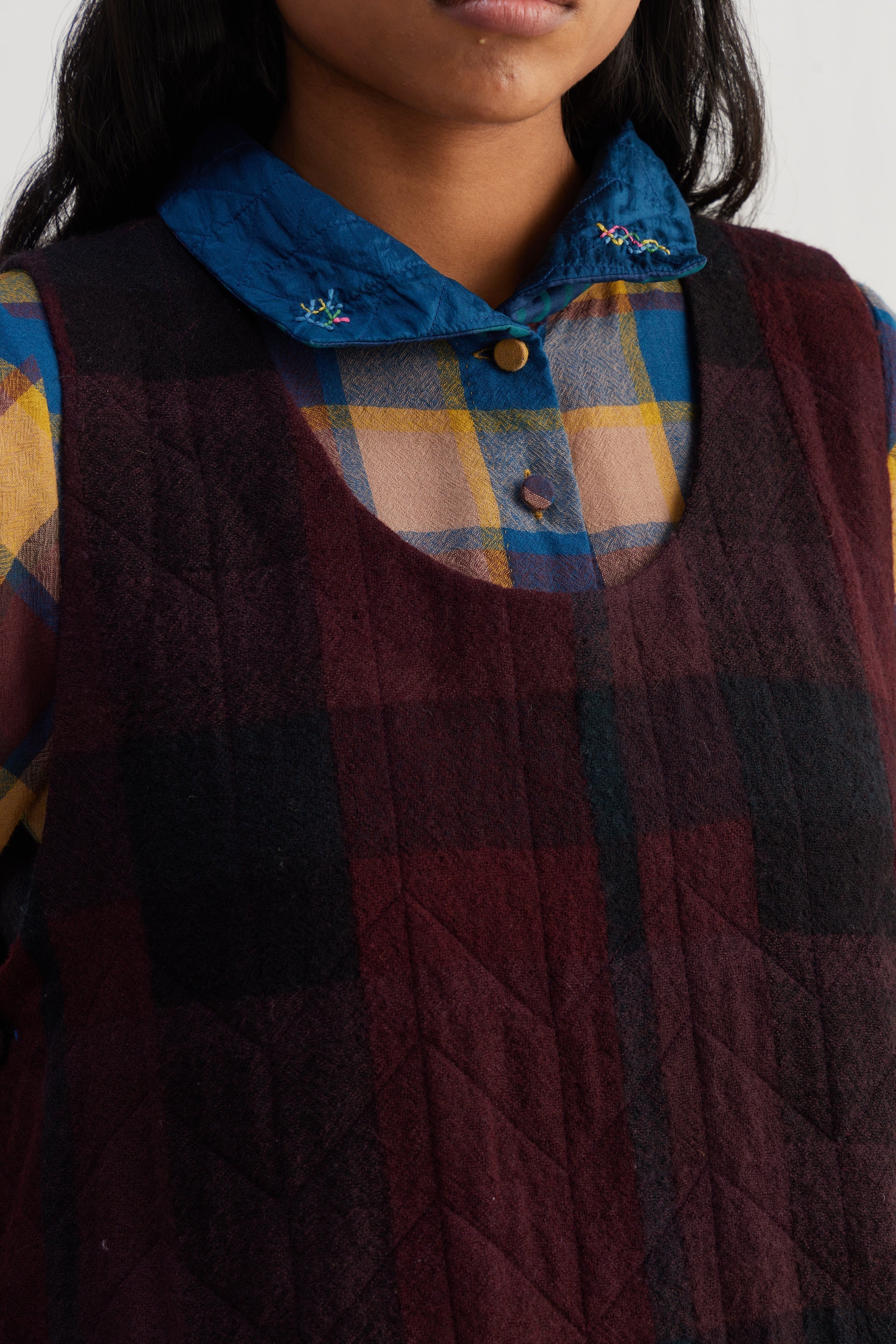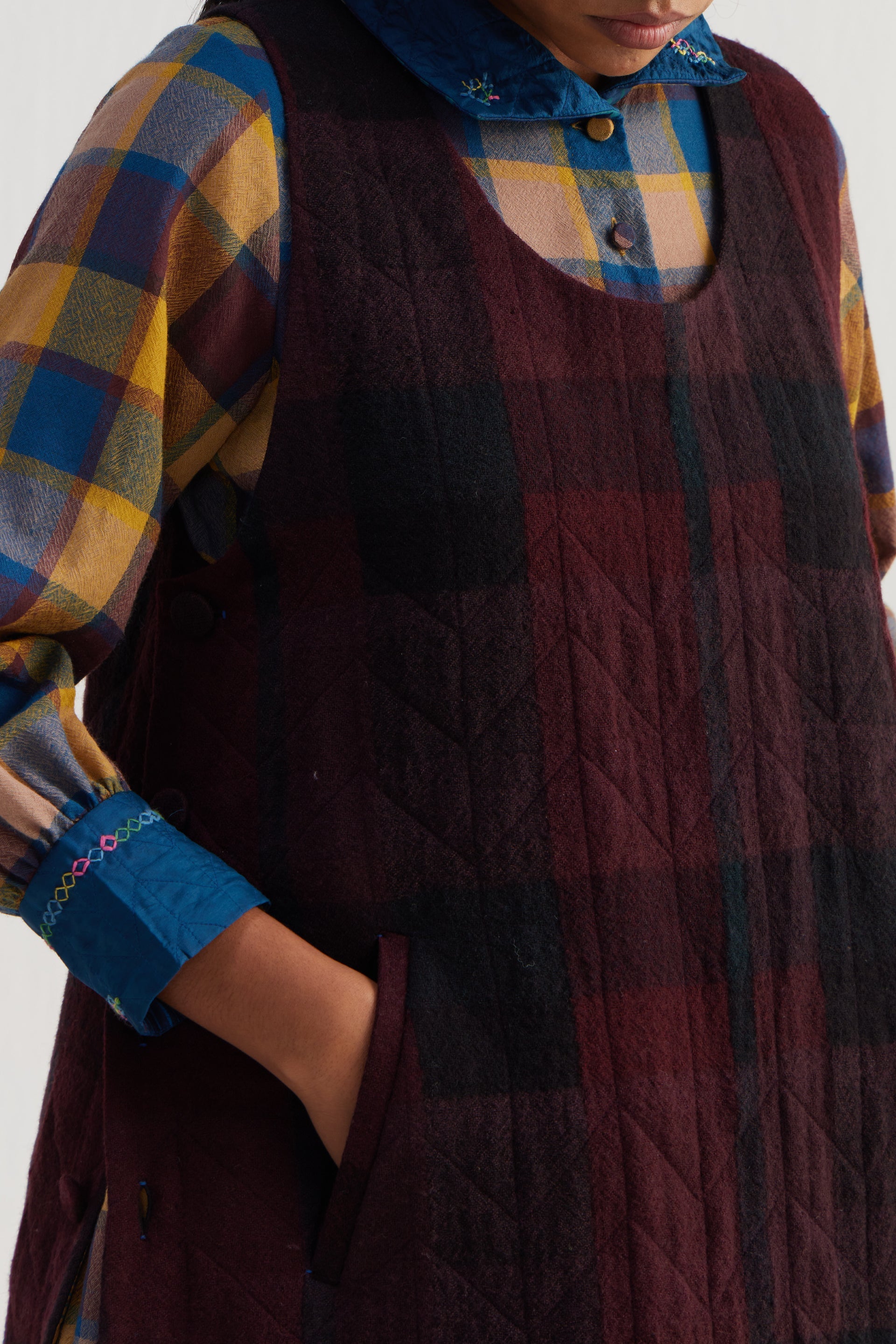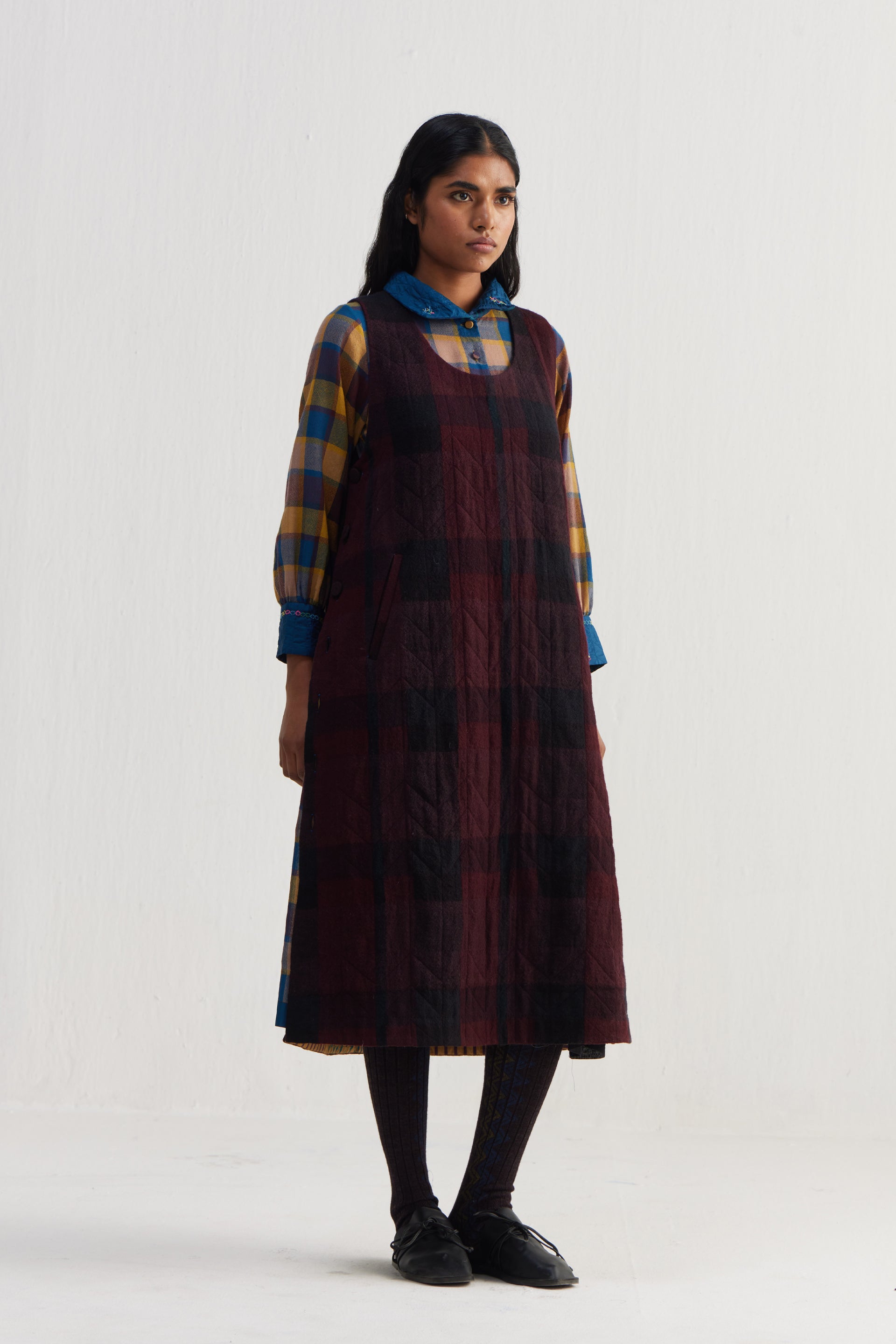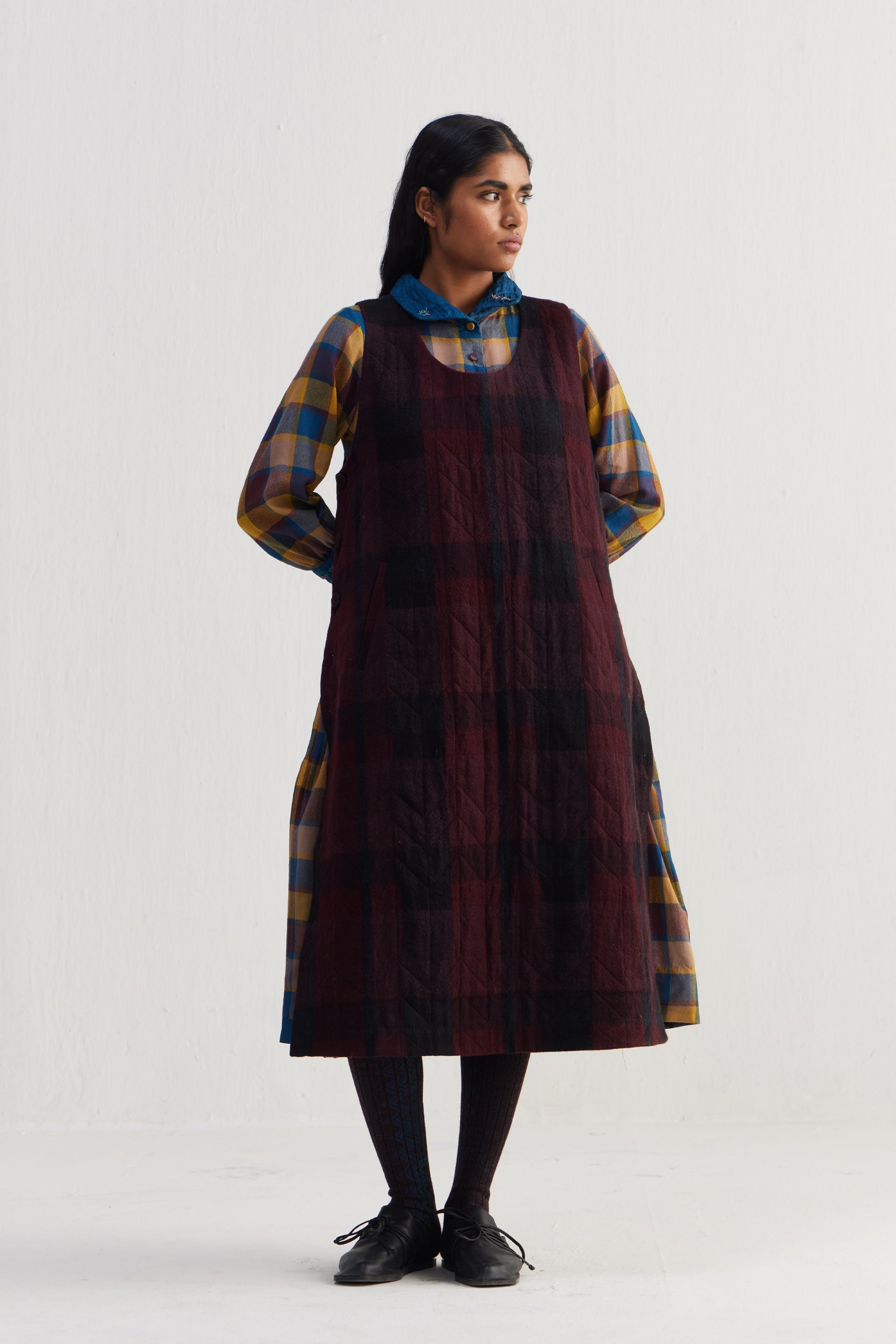 Round neckline sleeveless quilted dress with button-down side seam placket. Constructed in checkered 100% merino wool. Finished with collage handblock print 100% silk fabric facing detail.
