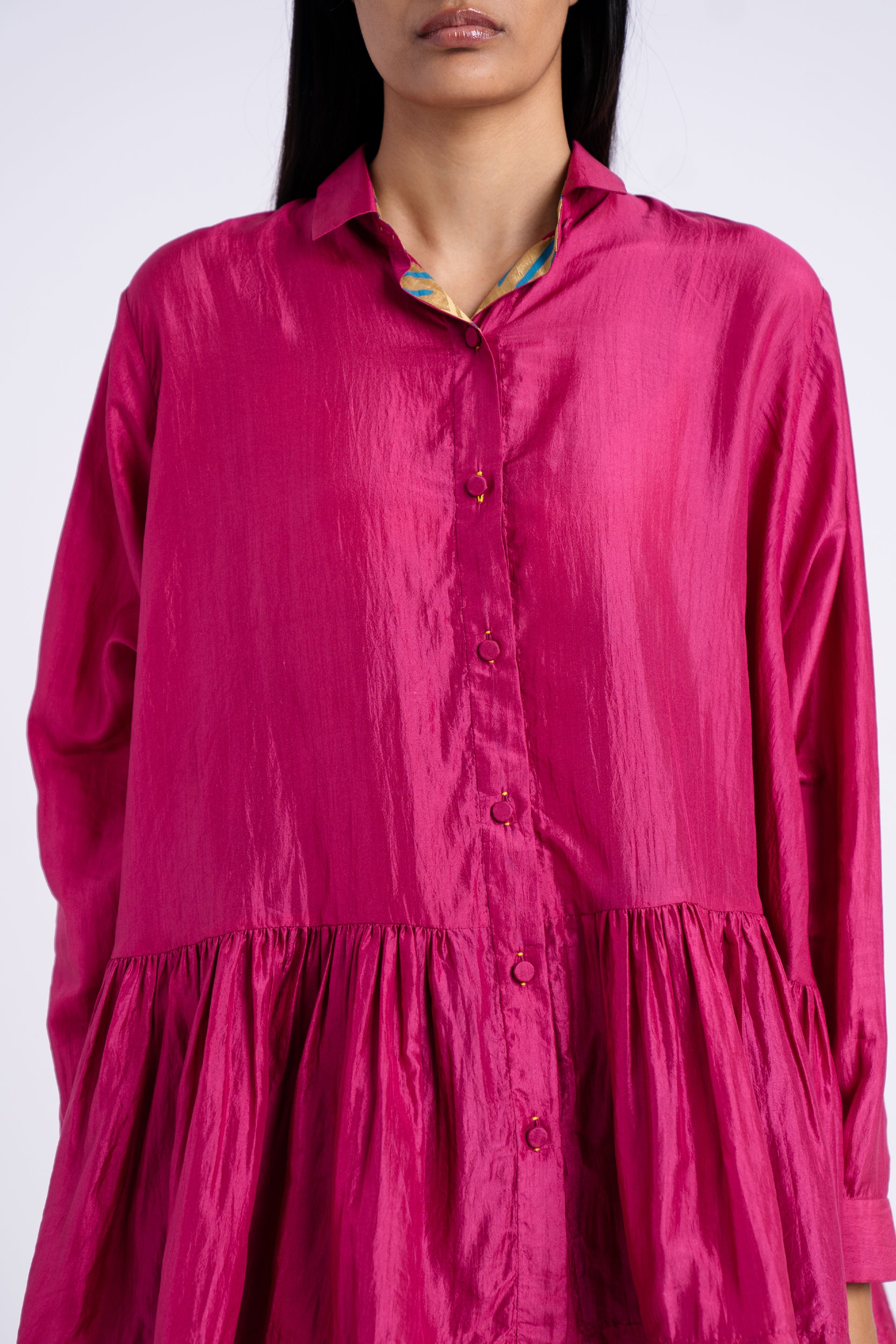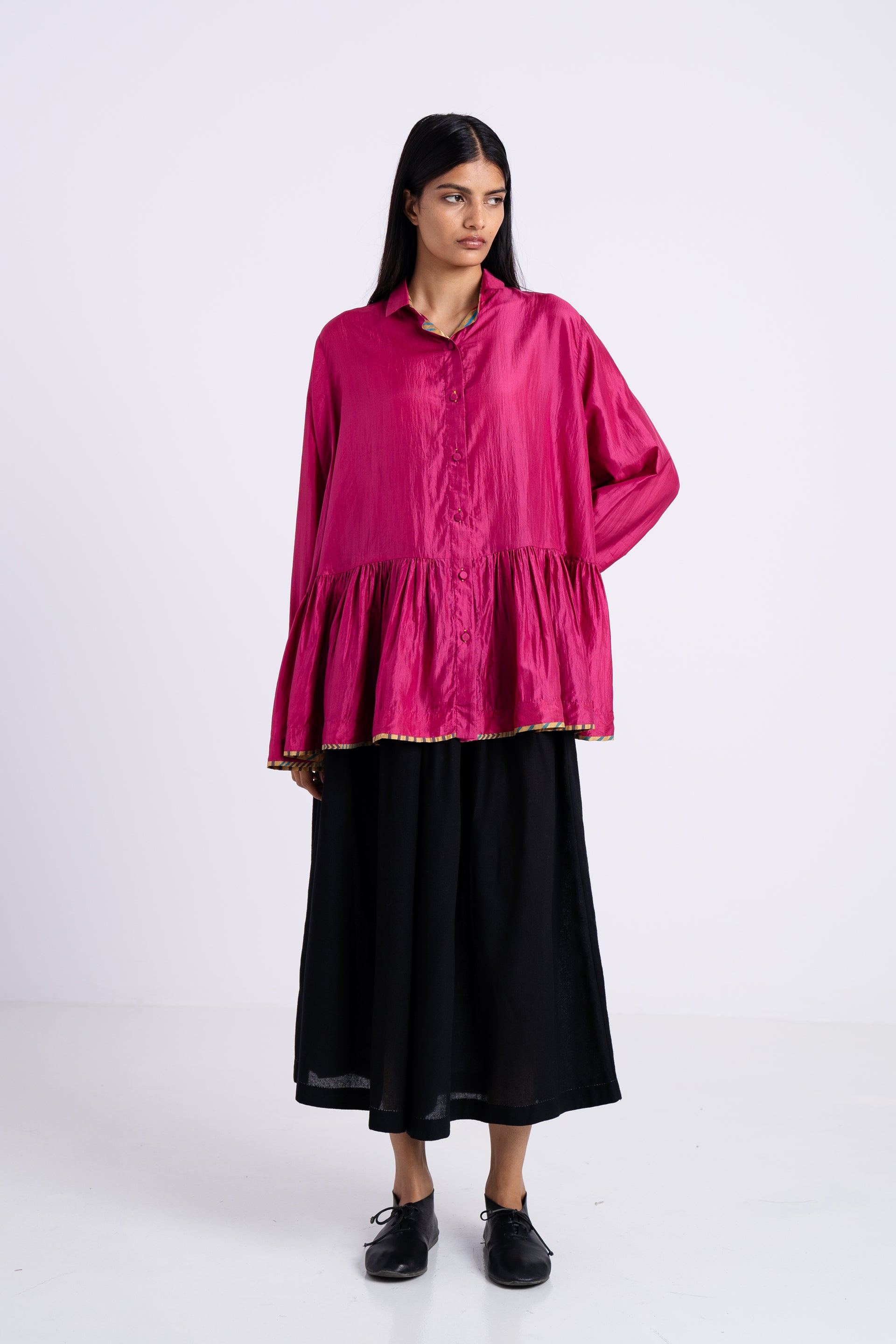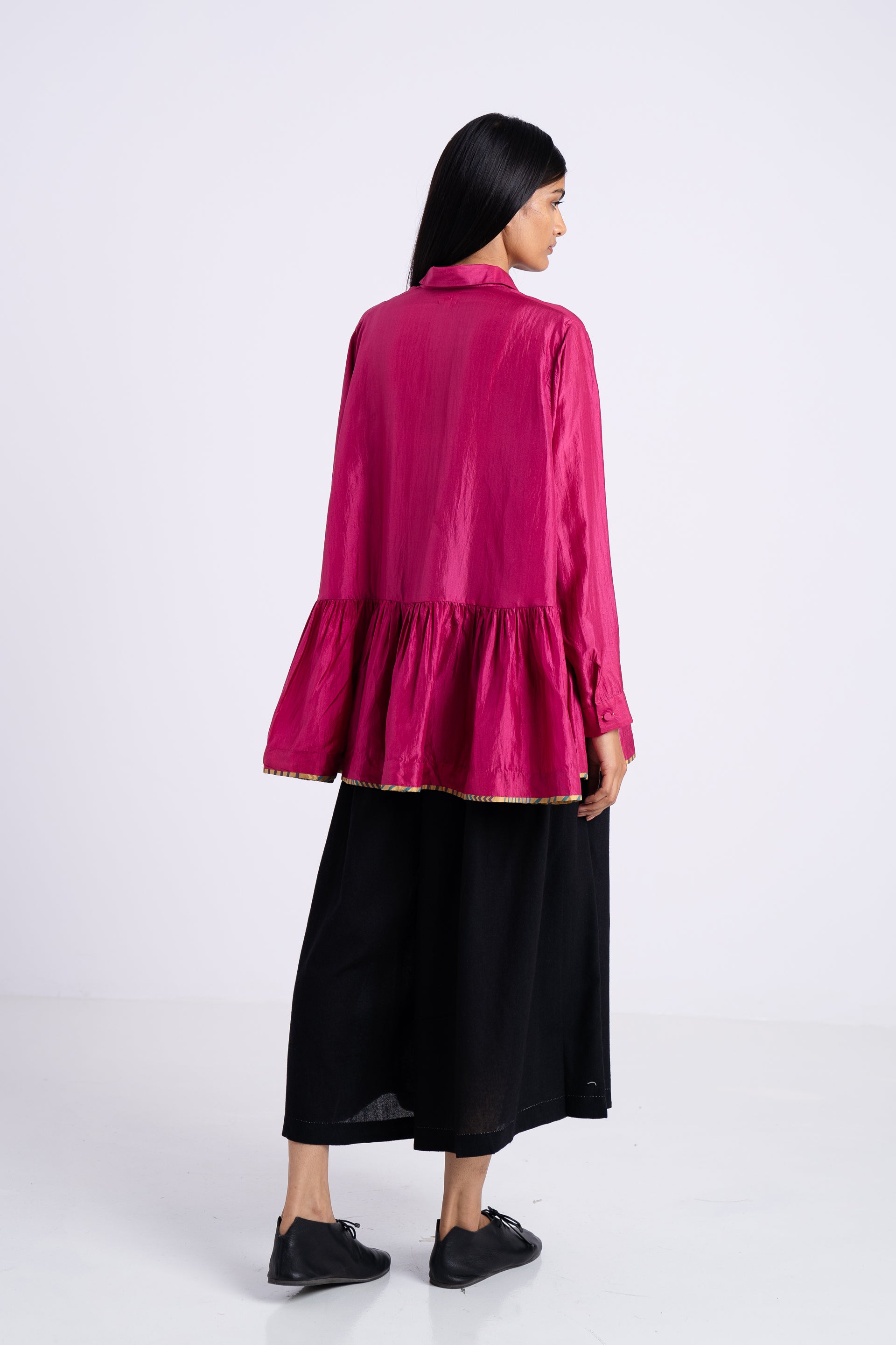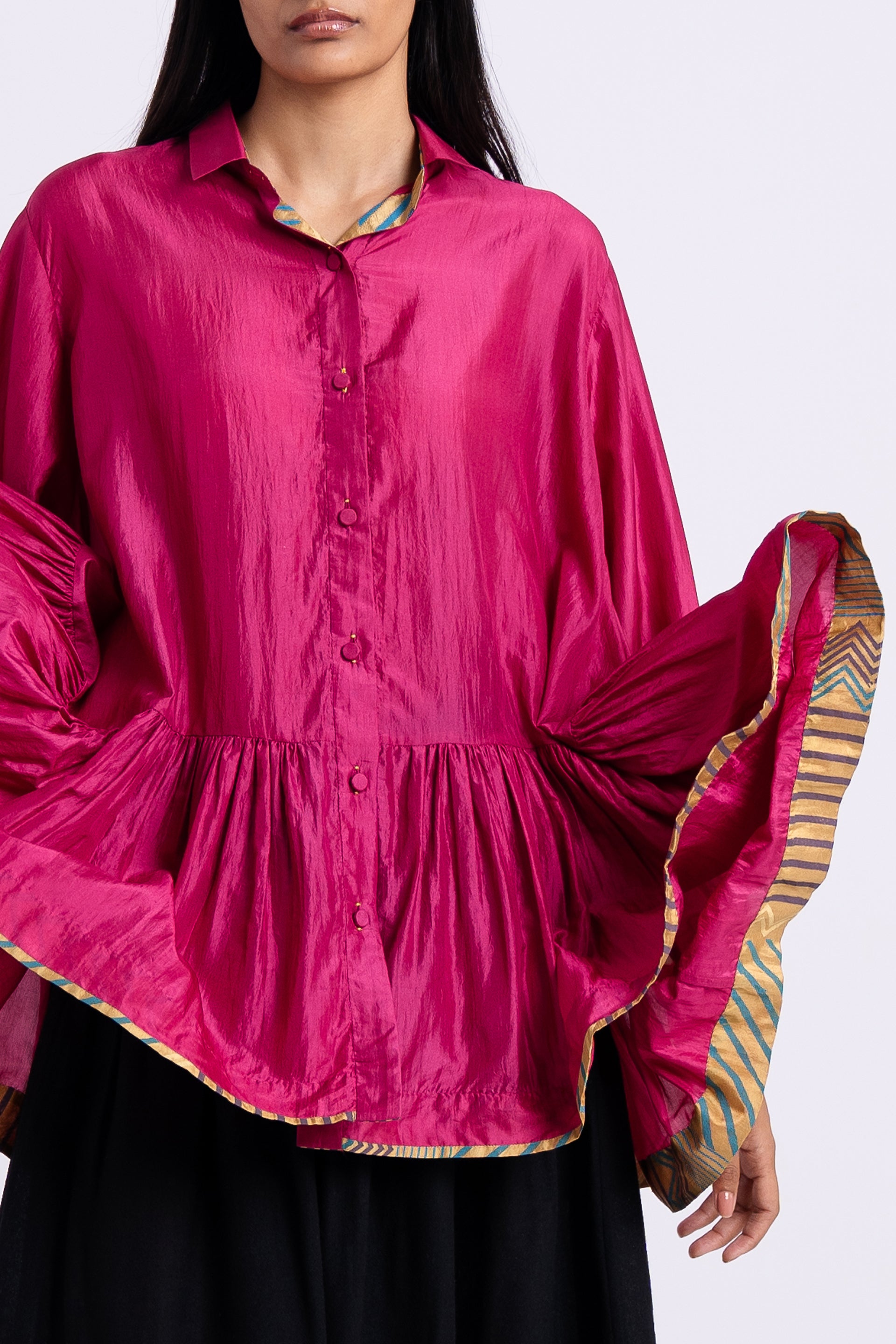 Front open top constructed in 100% silk with contrast hand block printed piping and facing on hem and sleeves.