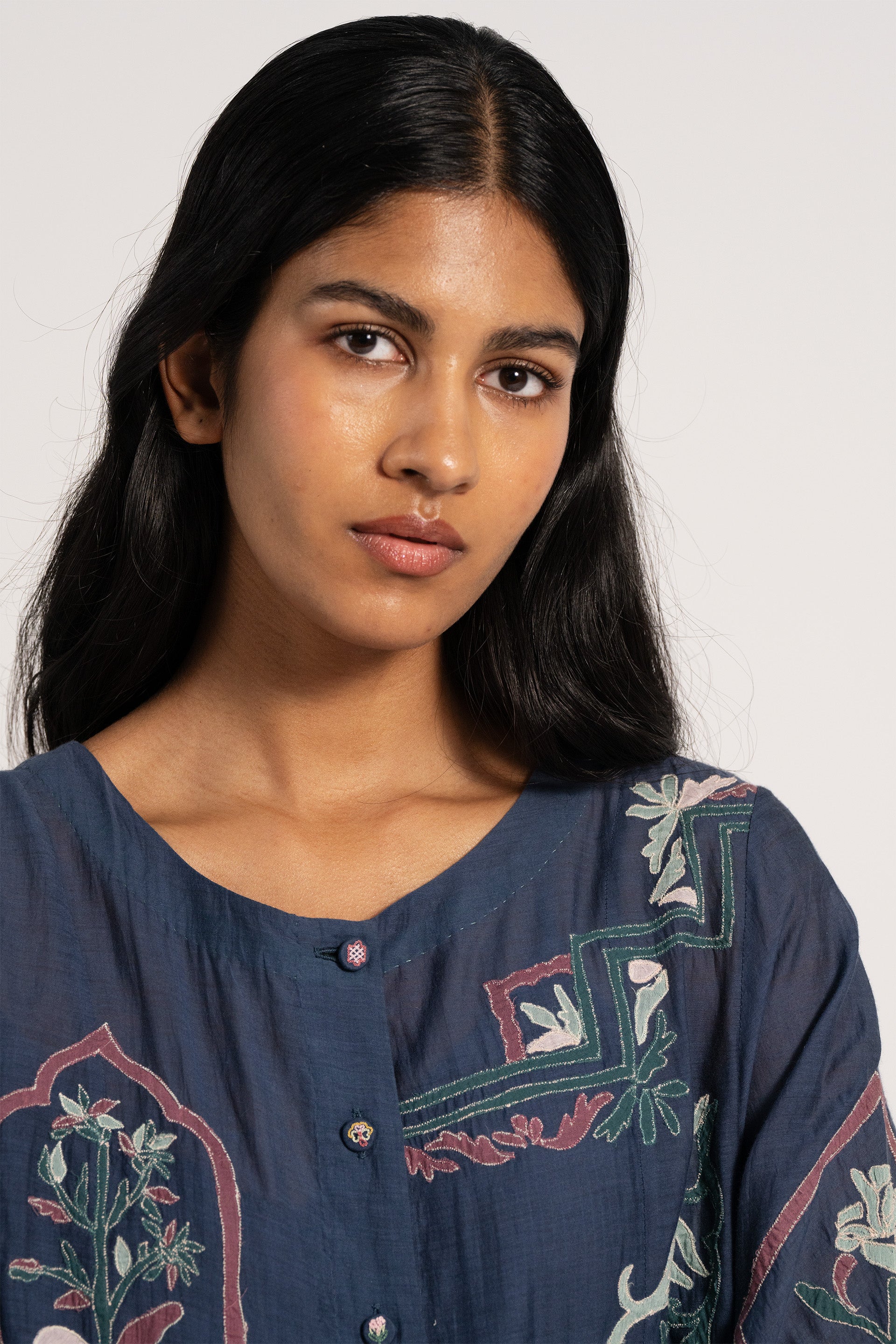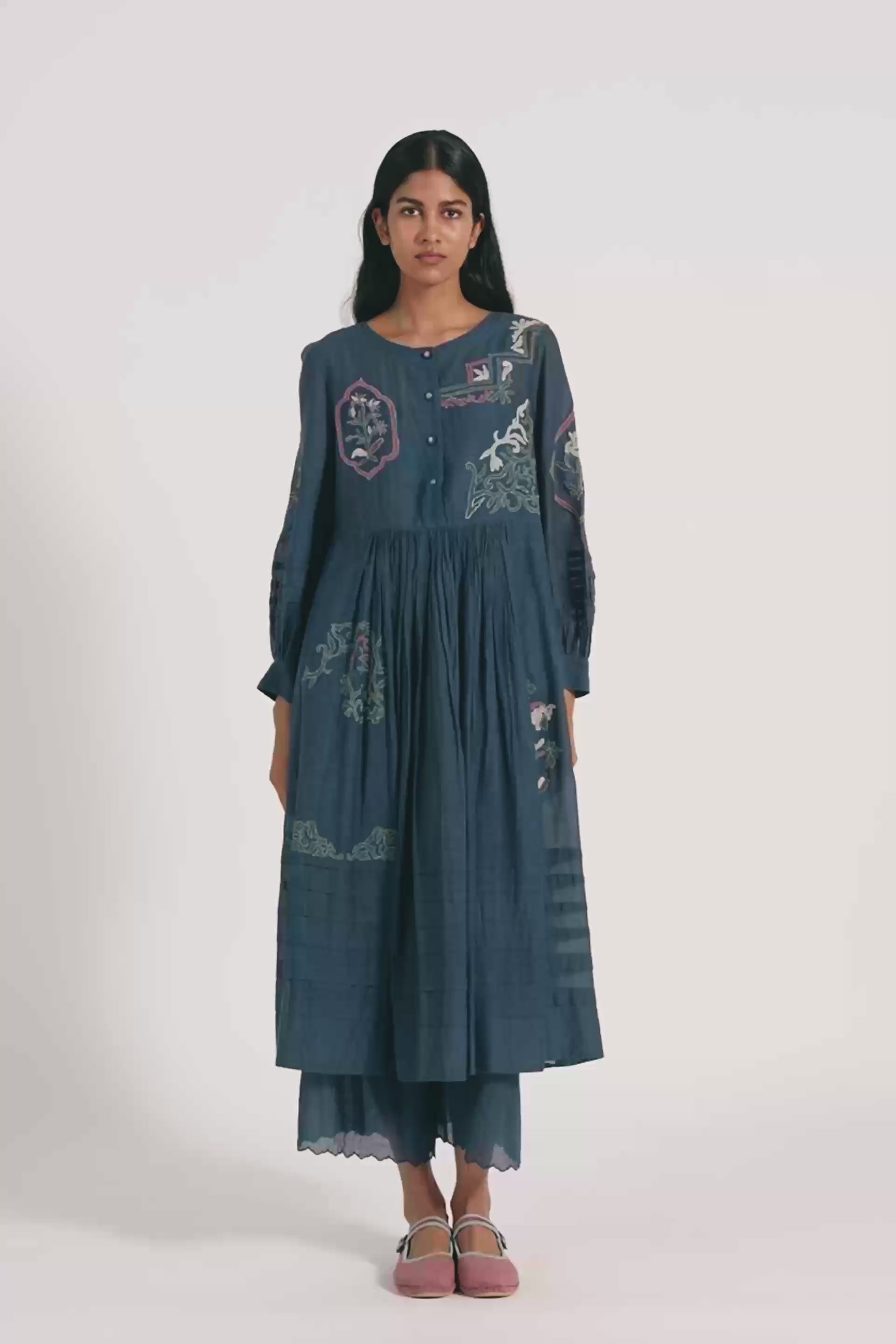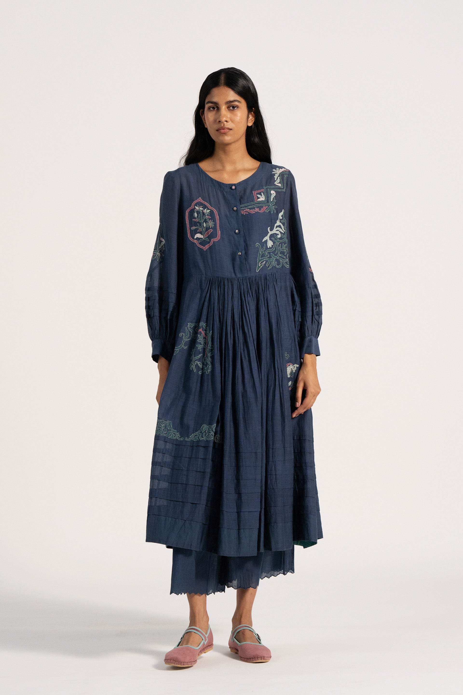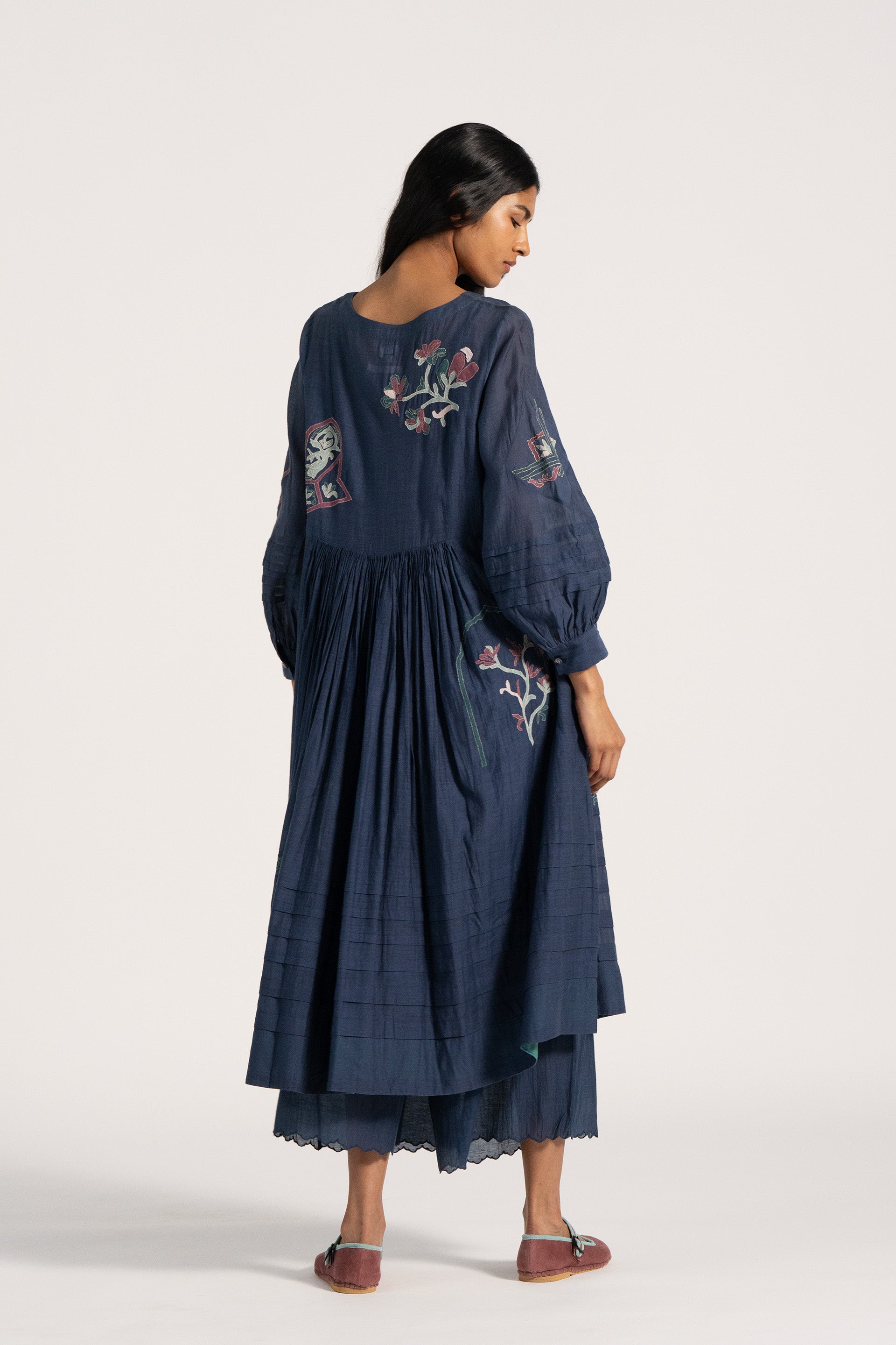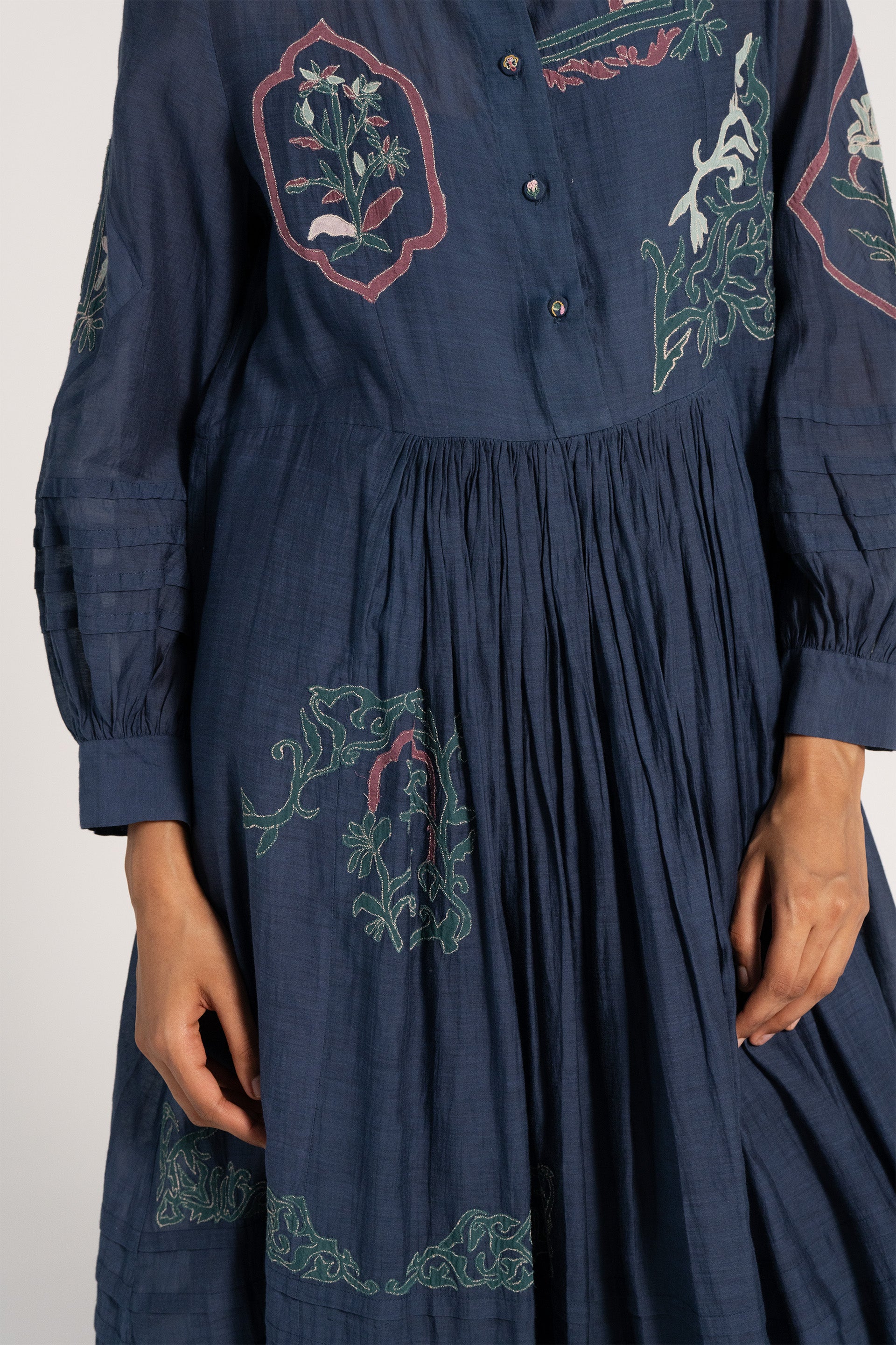 Round neck midi dress with applique detail on hem and puff sleeves in cotton silk blend.