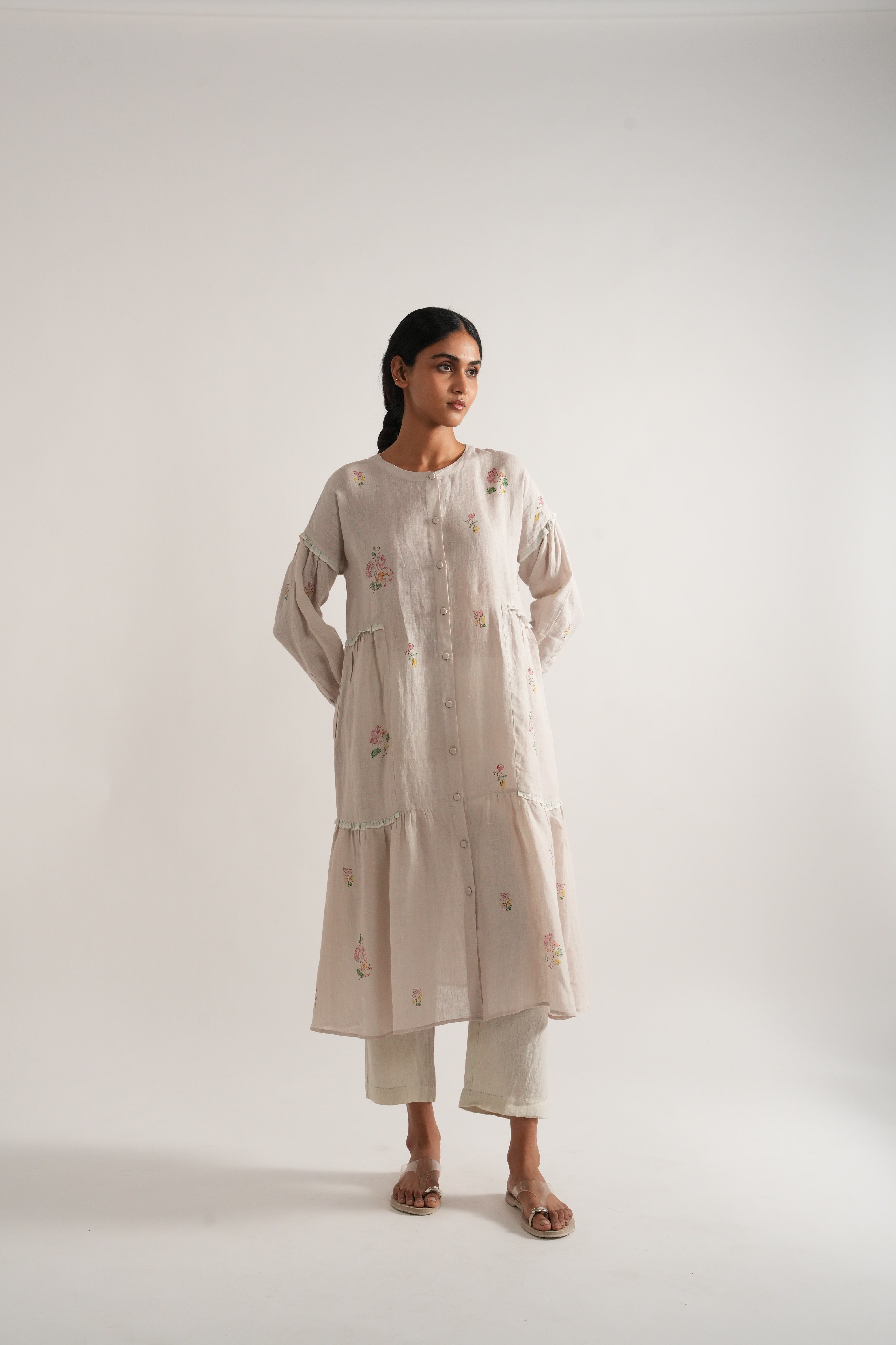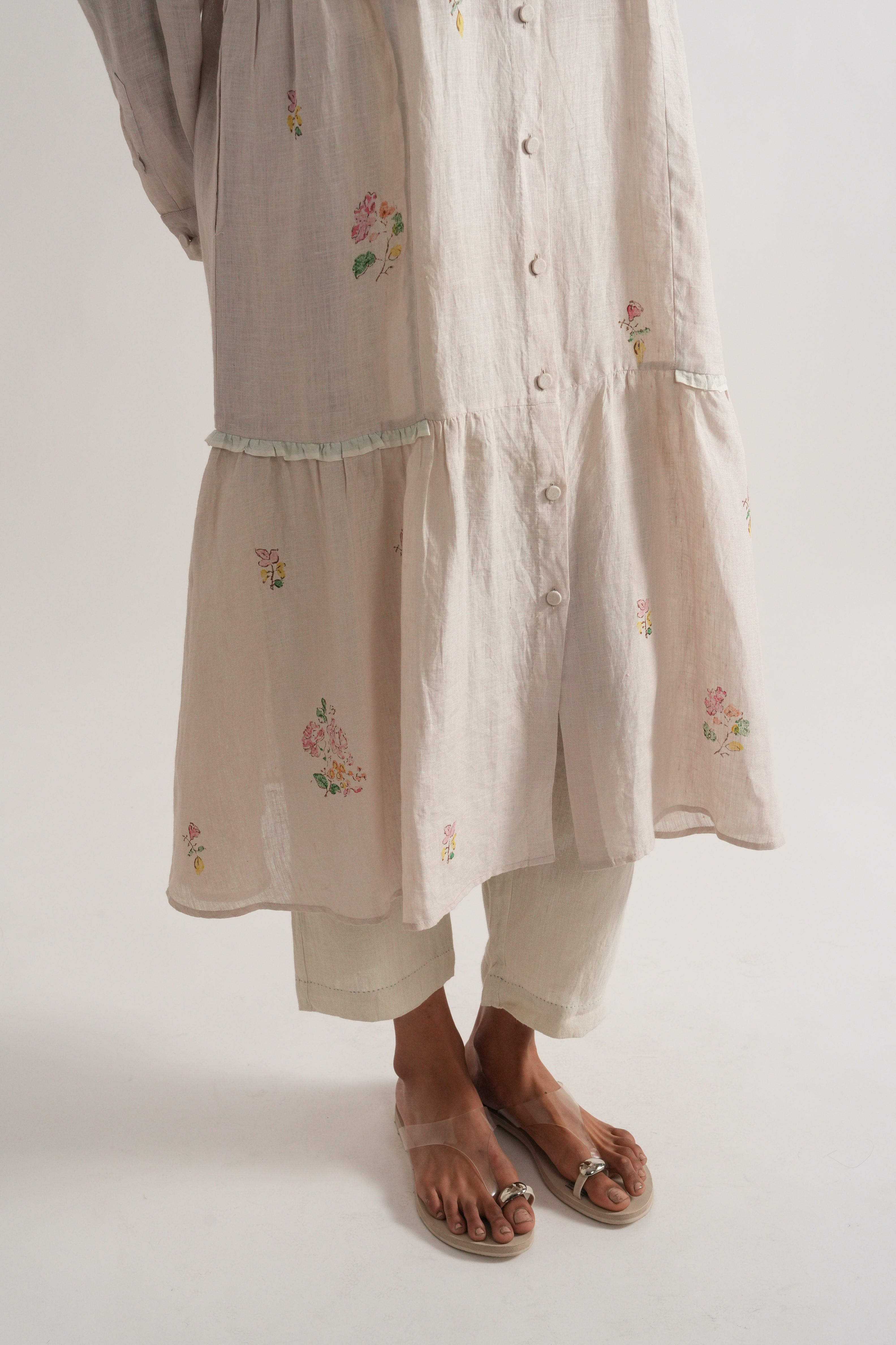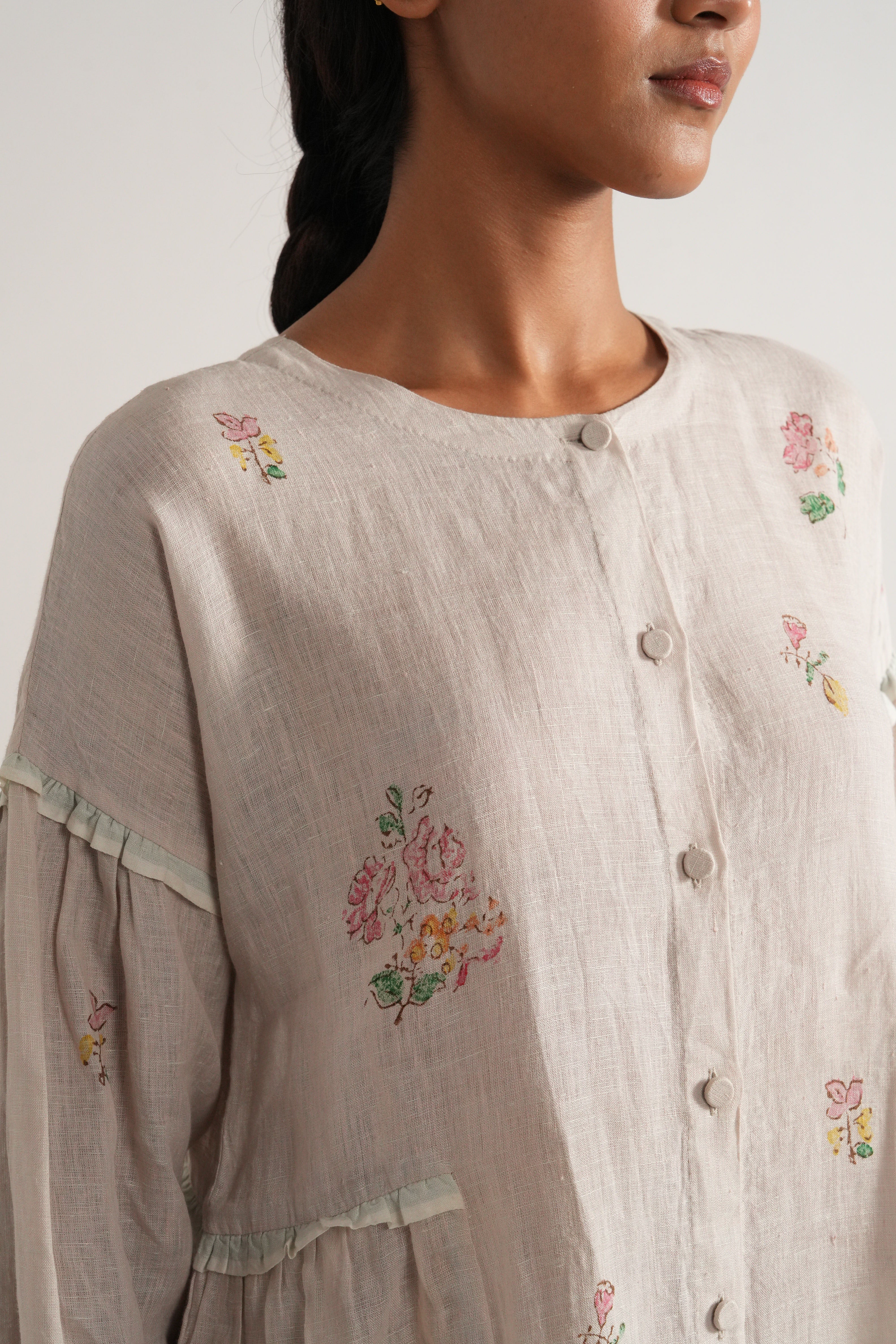 Front open dress with selvage frills on side panels and sleeves with hand block printed placement print