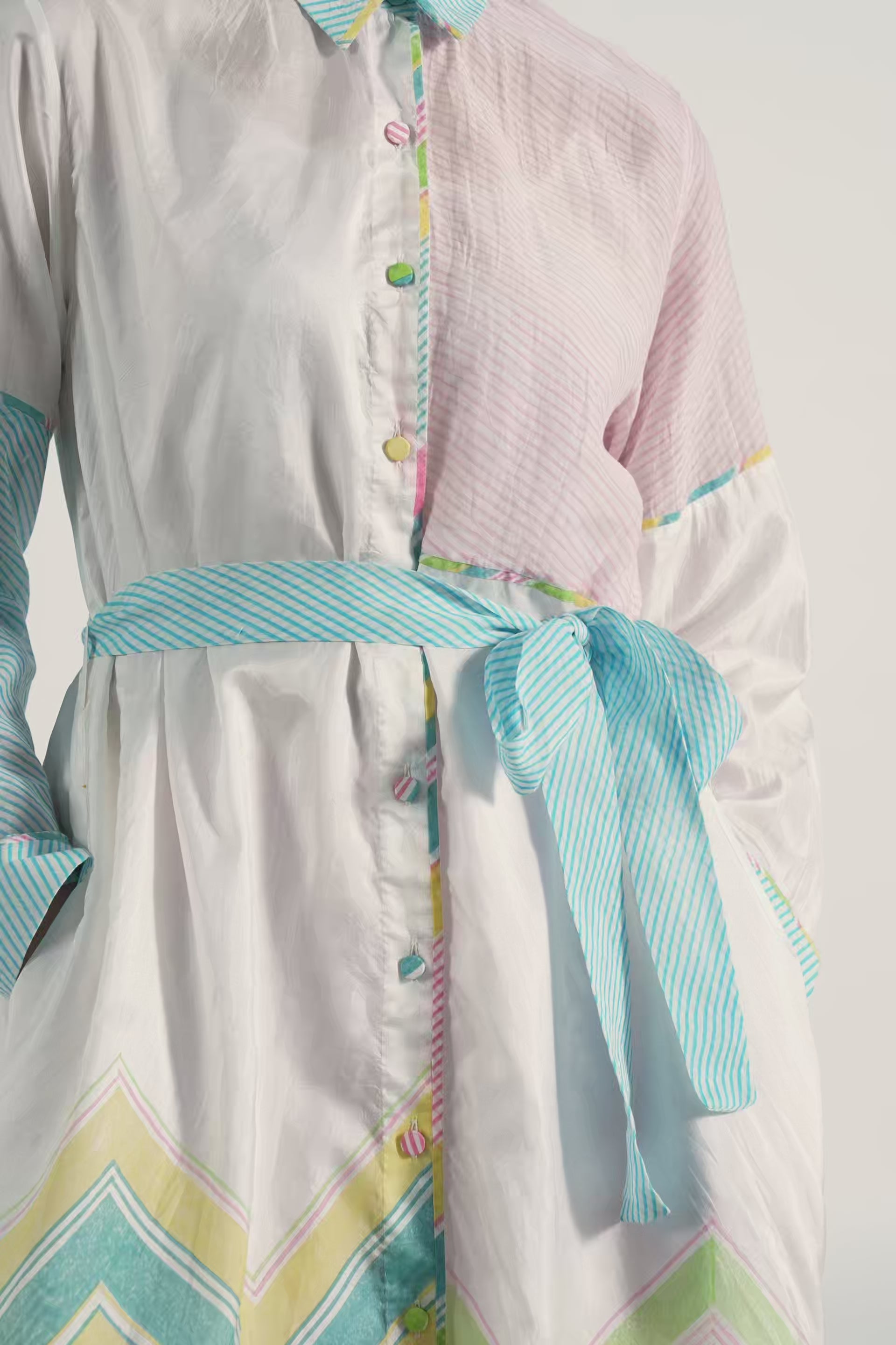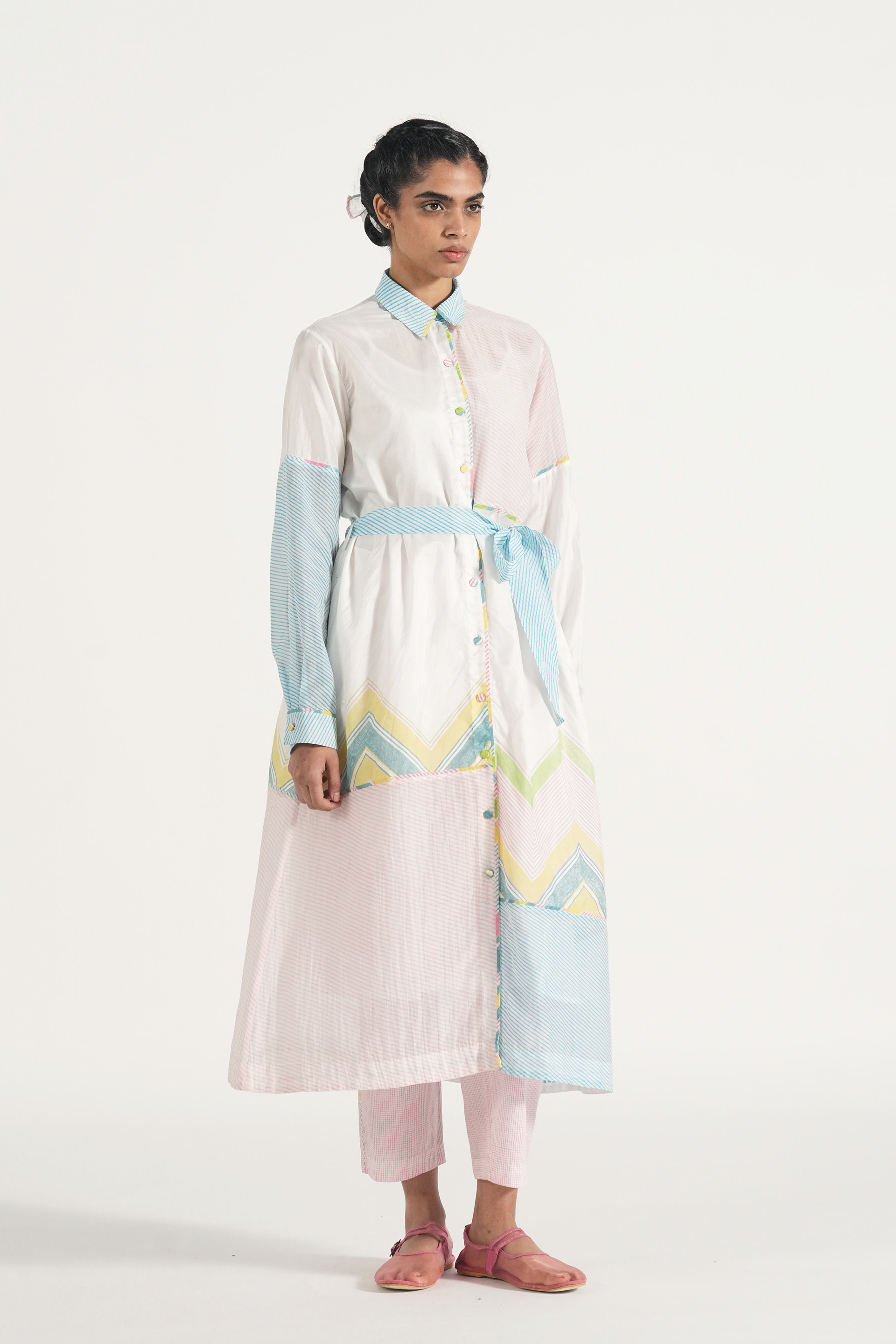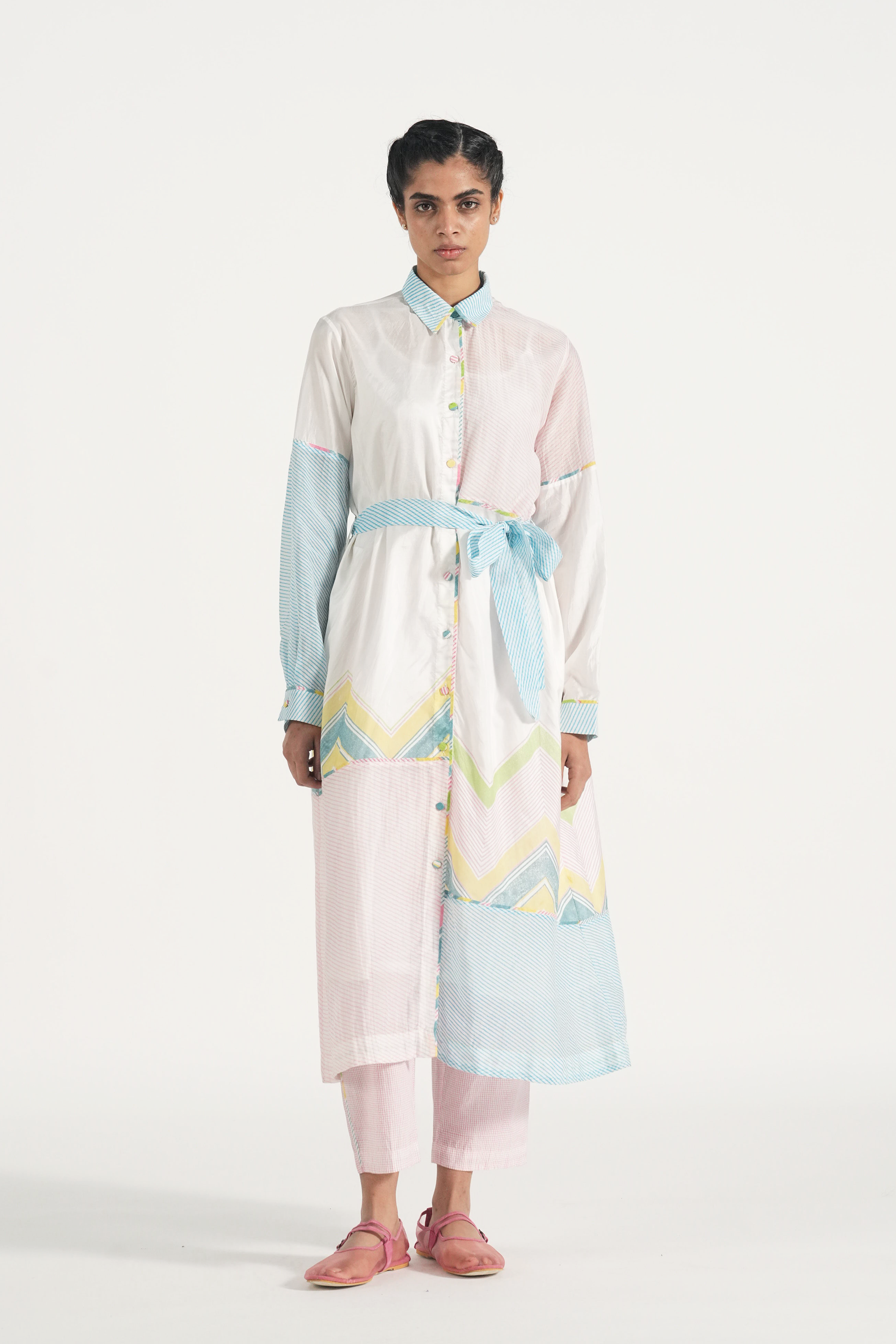 Straight fit patchwork long shirt dress in handblocked chevron print and multi diagonal stripes. Comes with a complimentary lining.