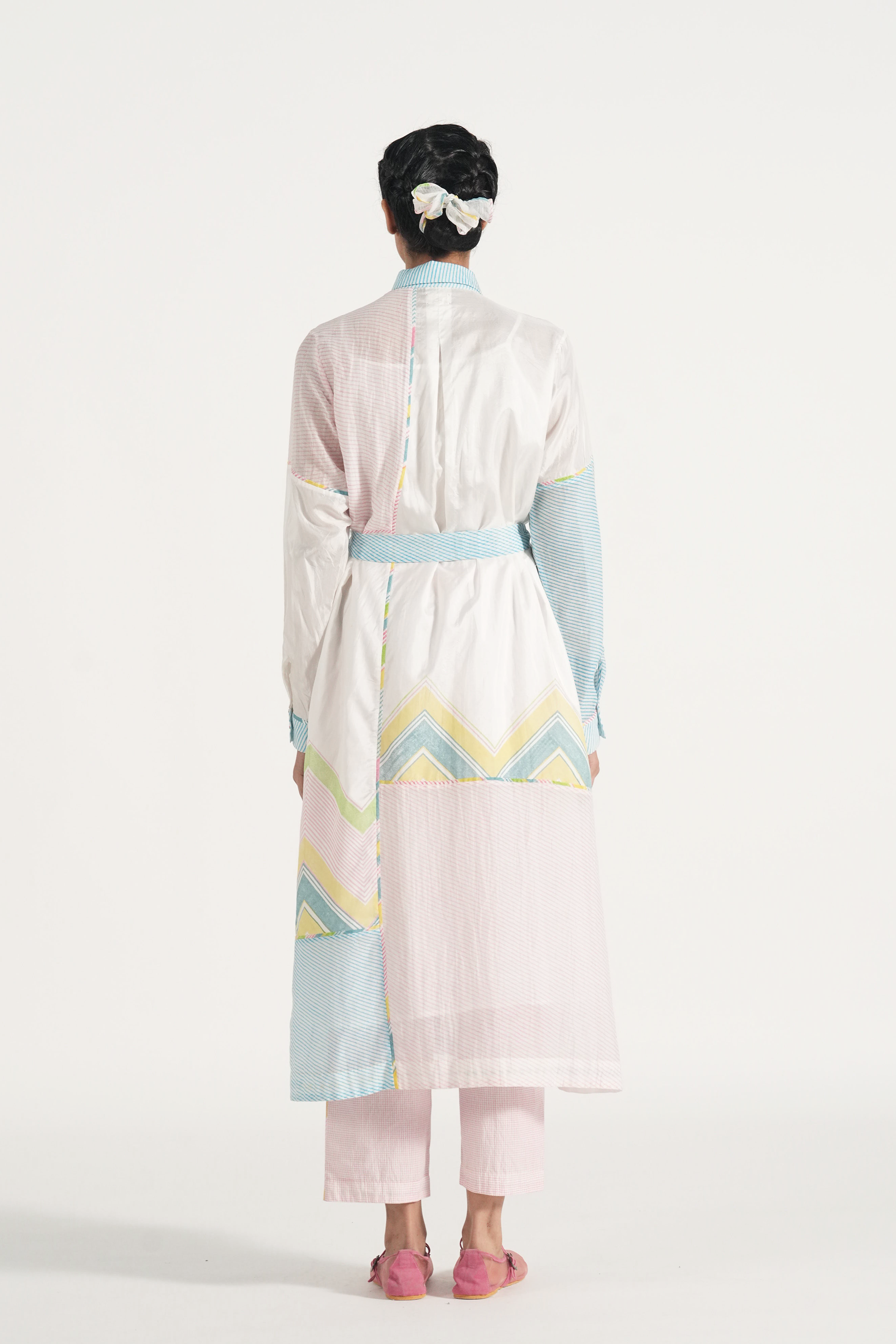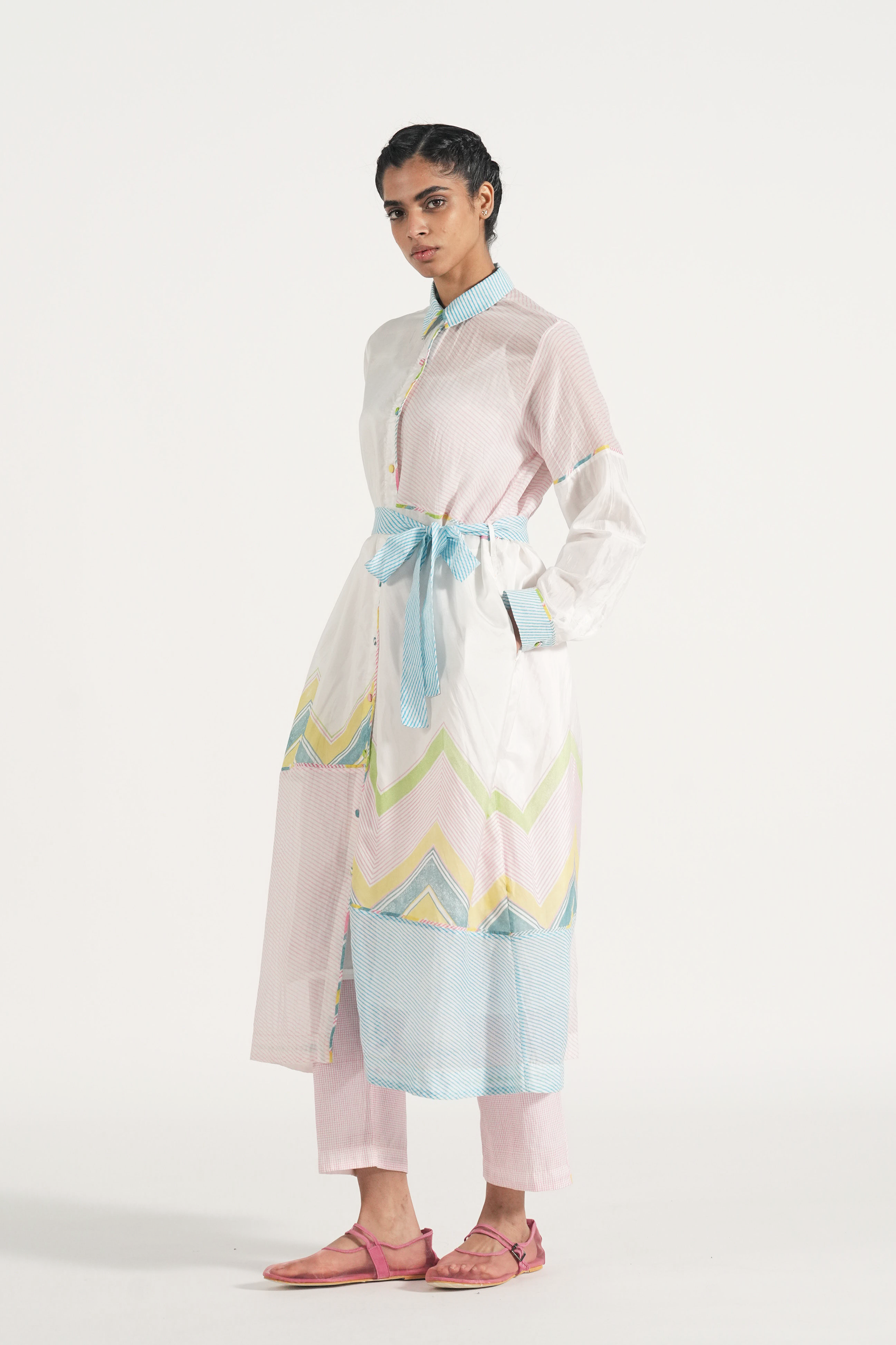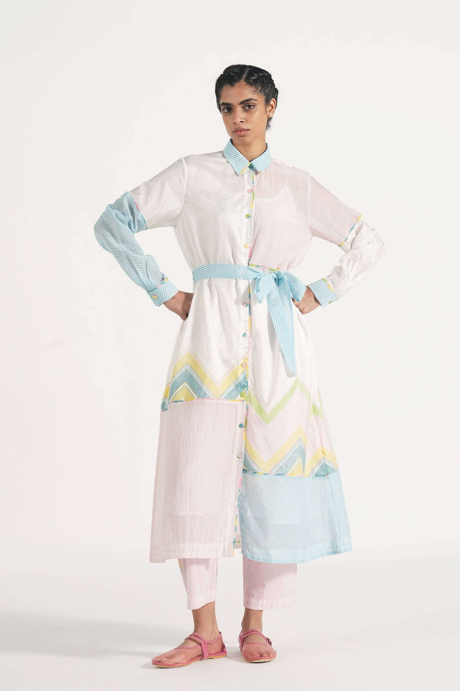 Straight fit patchwork long shirt dress in handblocked chevron print and multi diagonal stripes. Comes with a complimentary lining.