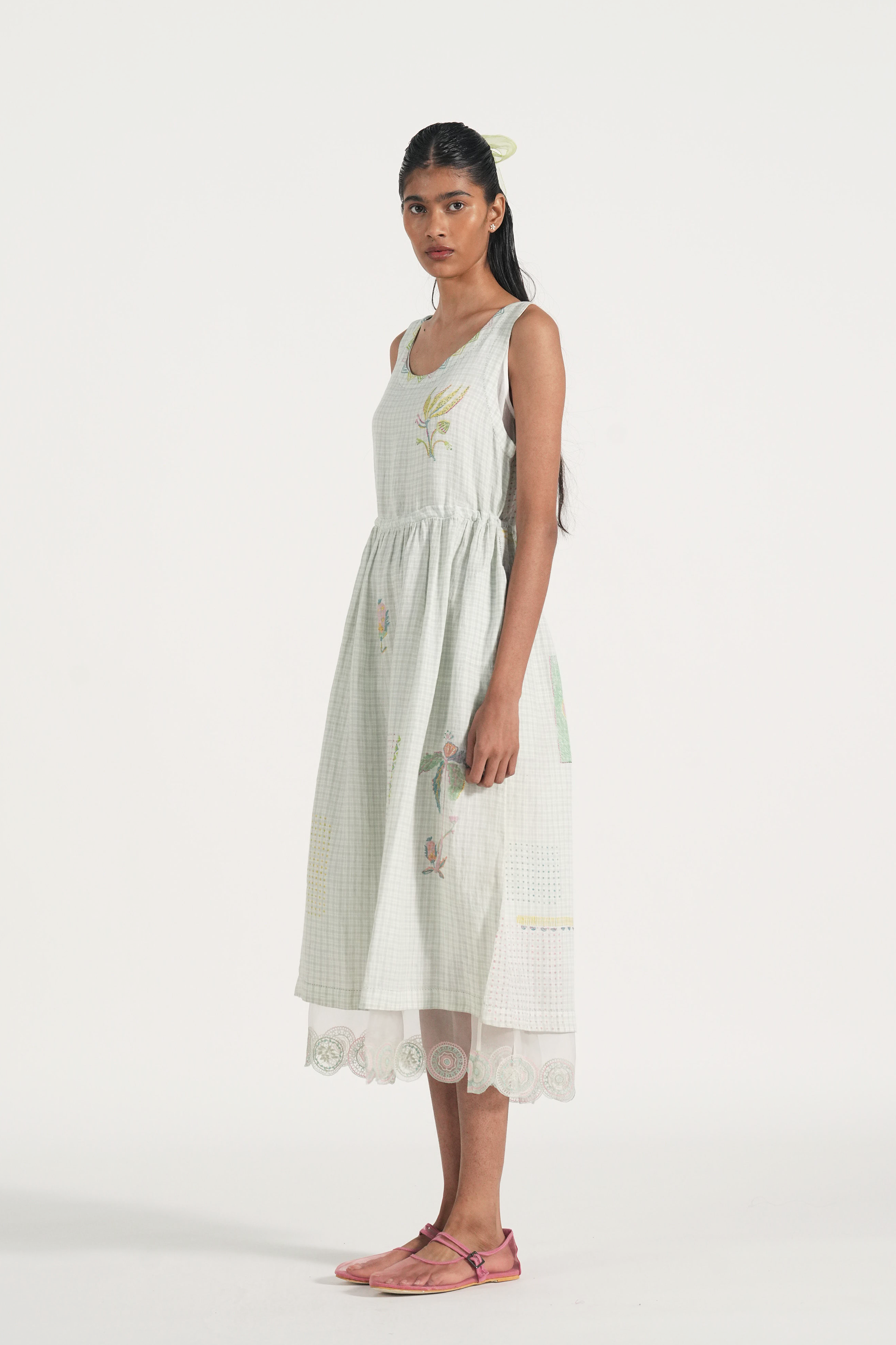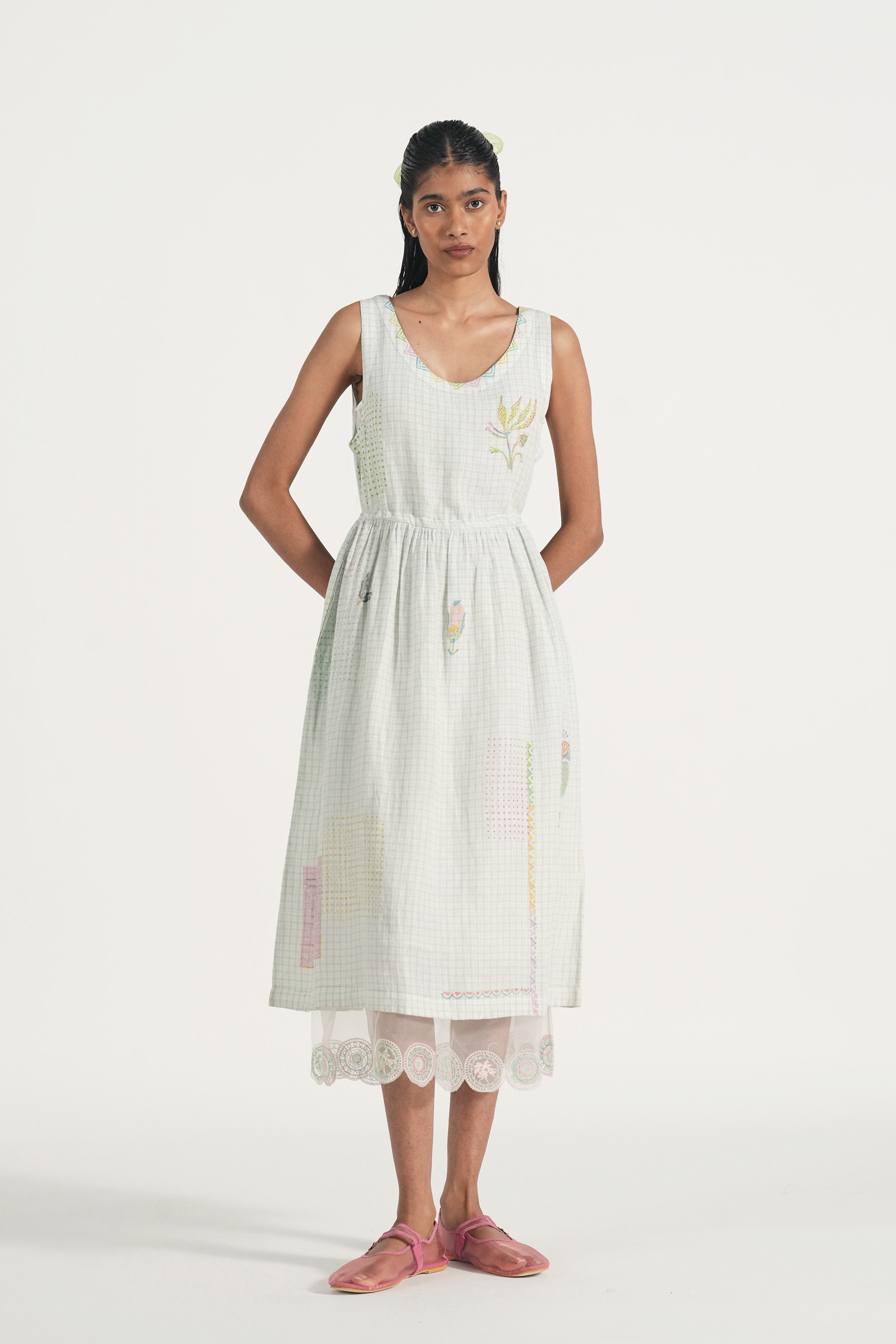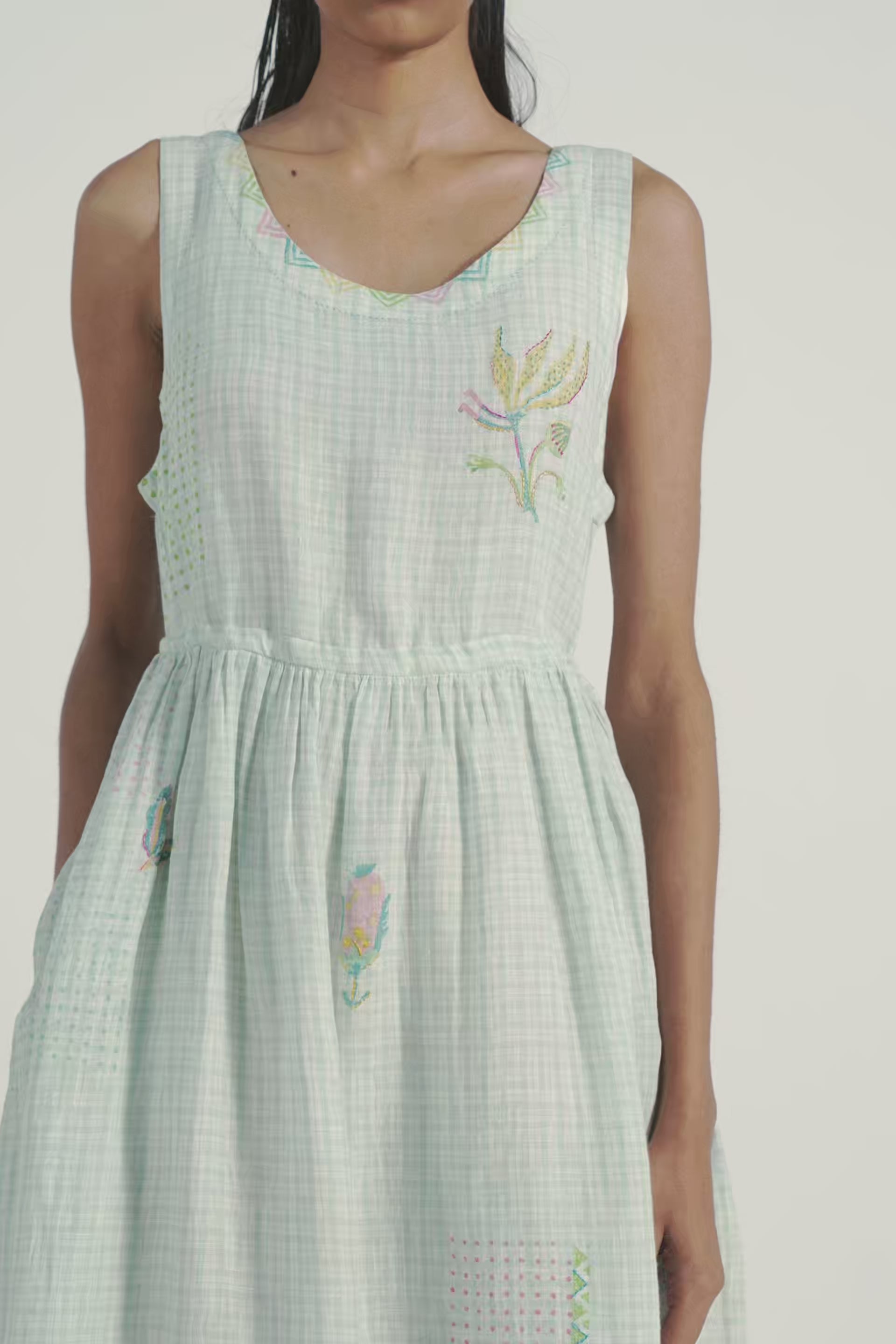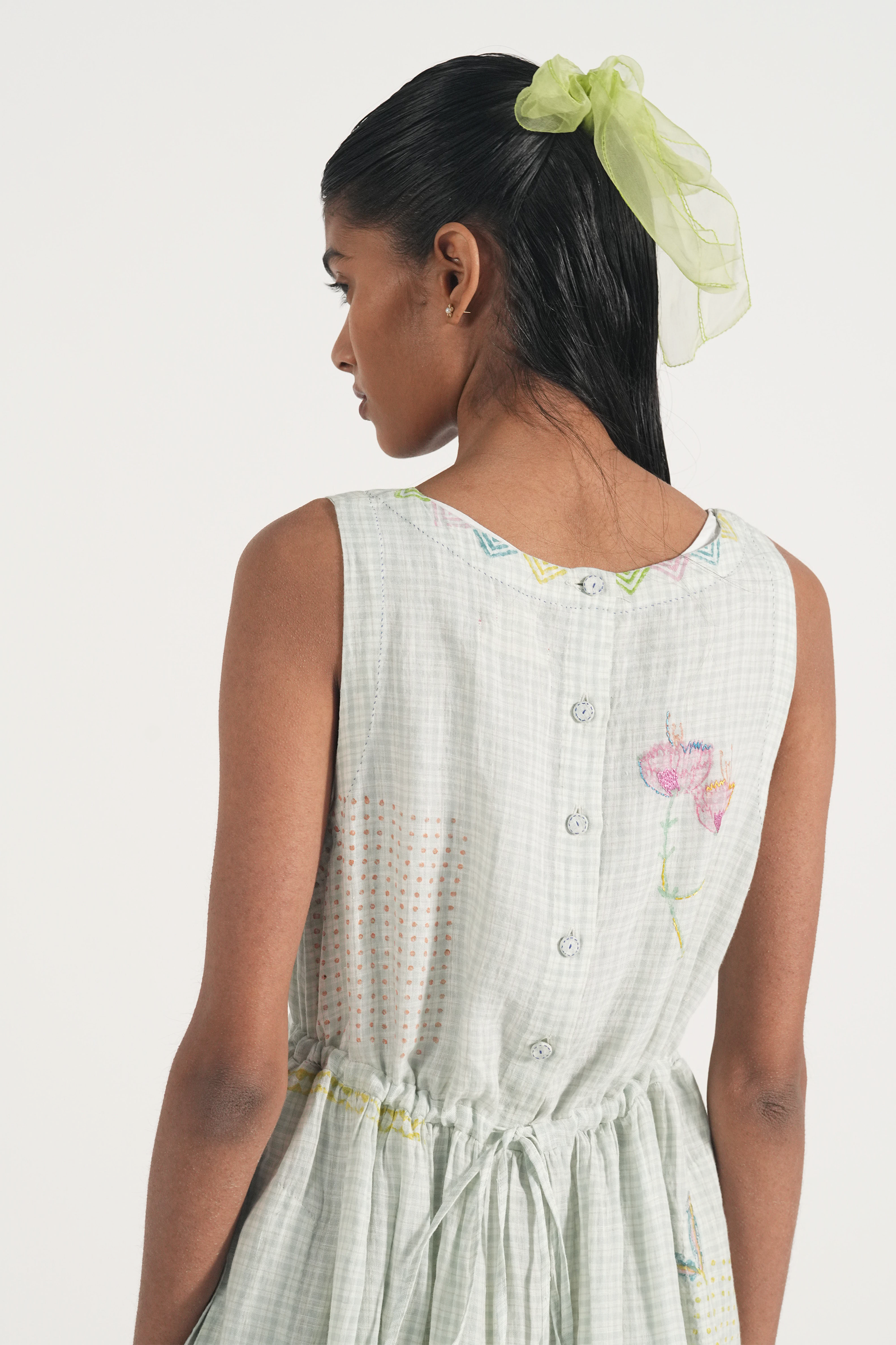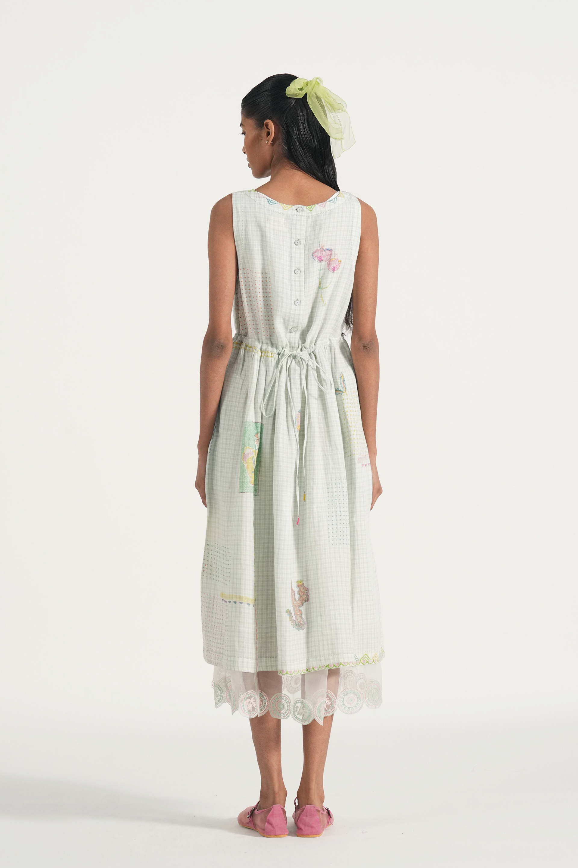 Sleeveless waist cut dress in placement hand block print accentuated with hand embroidery details