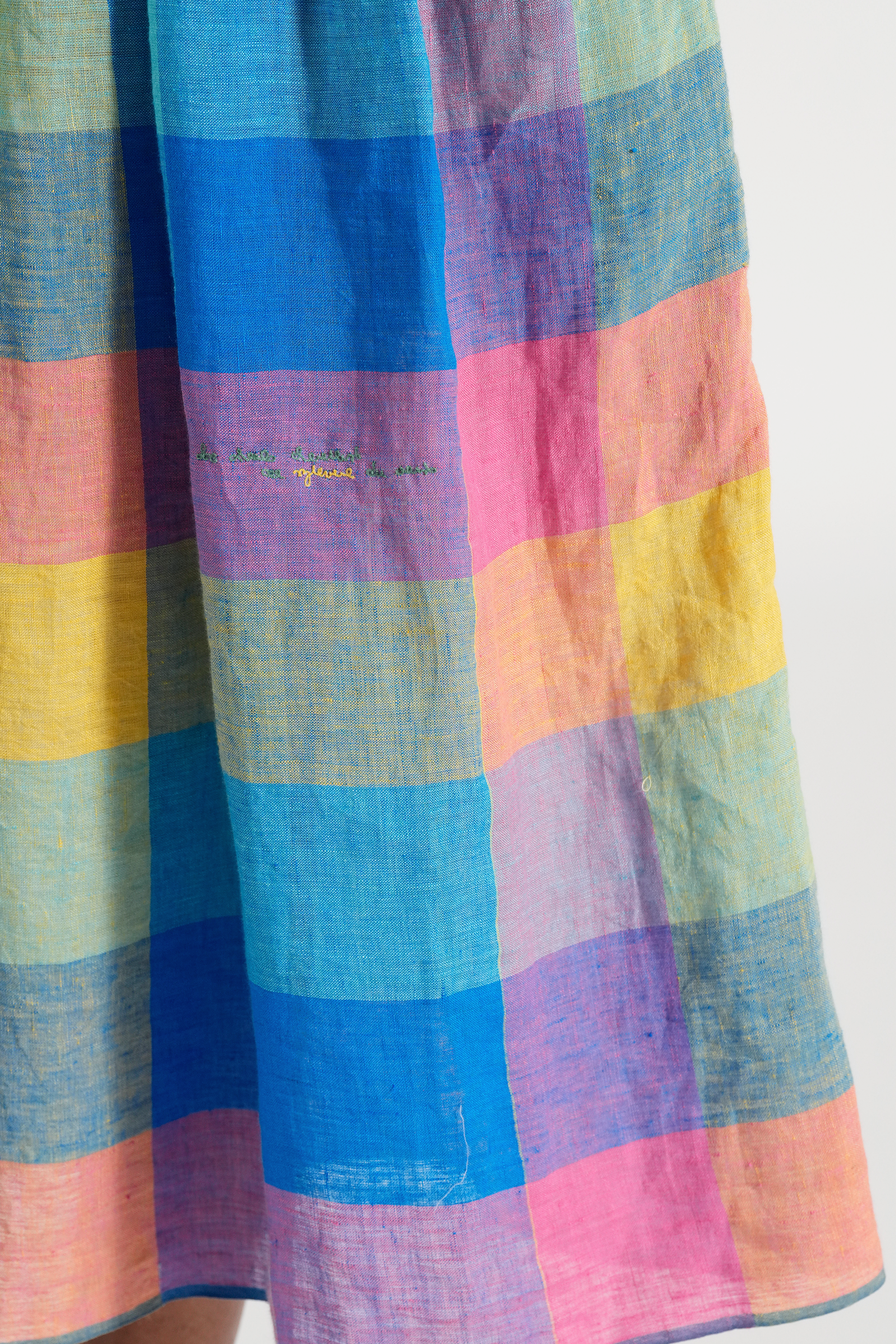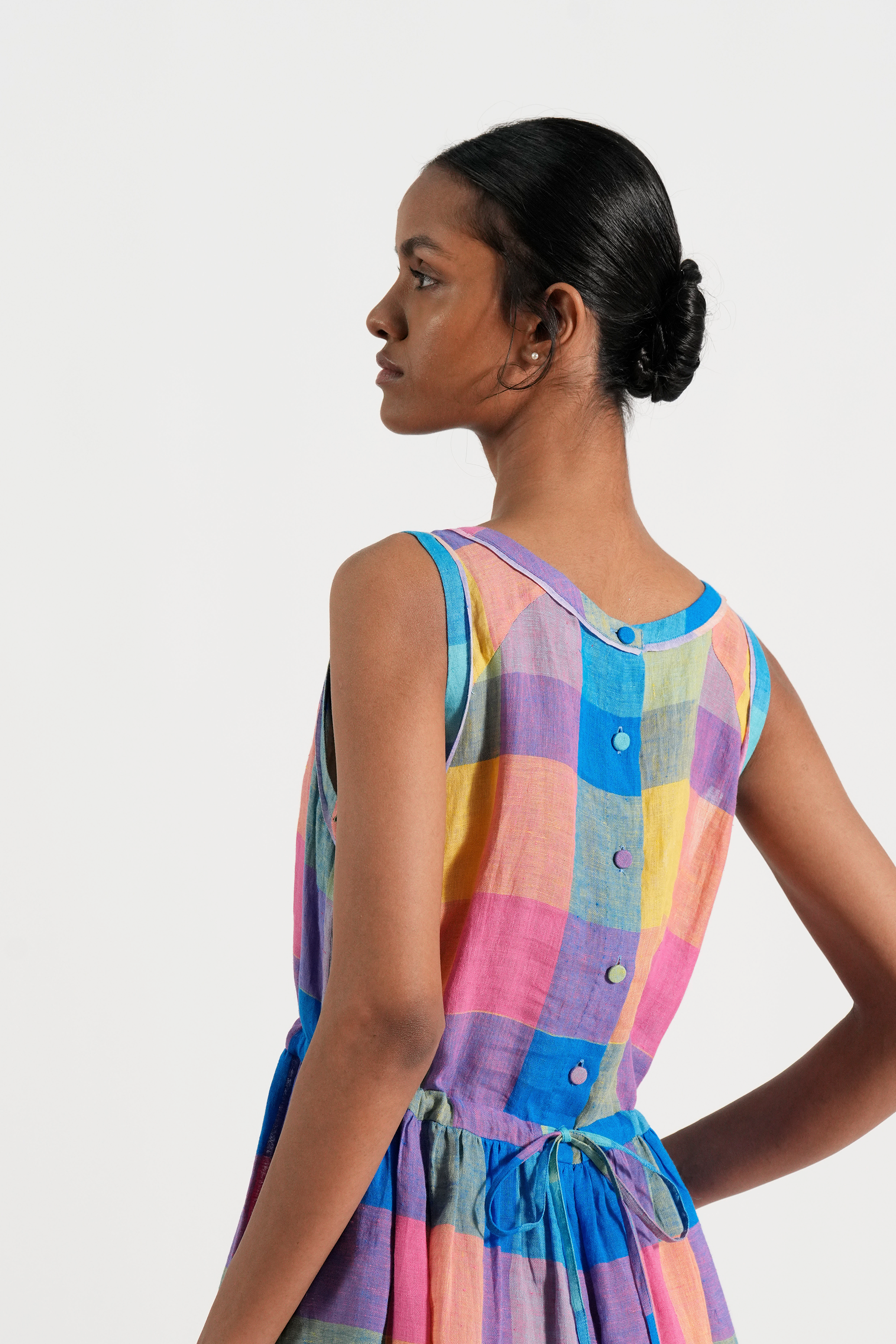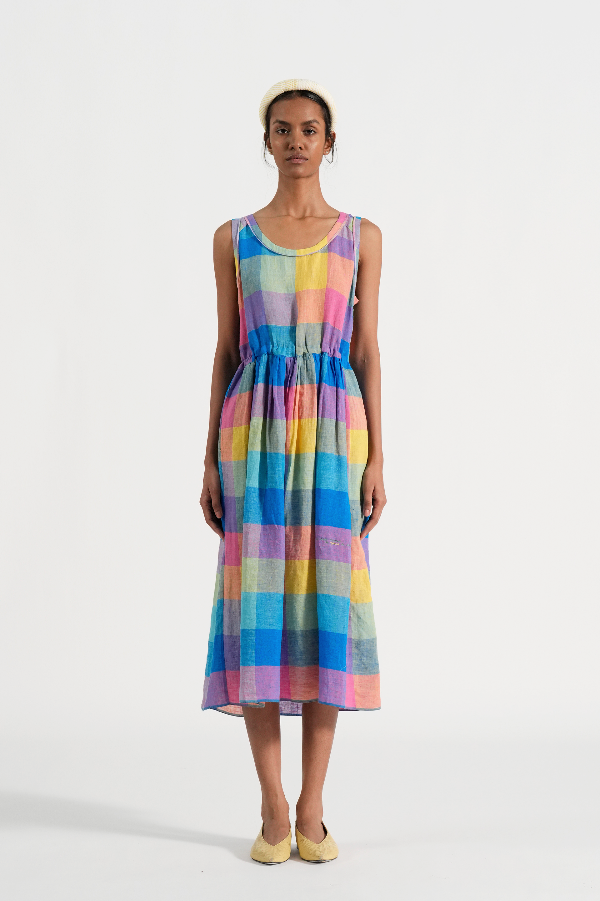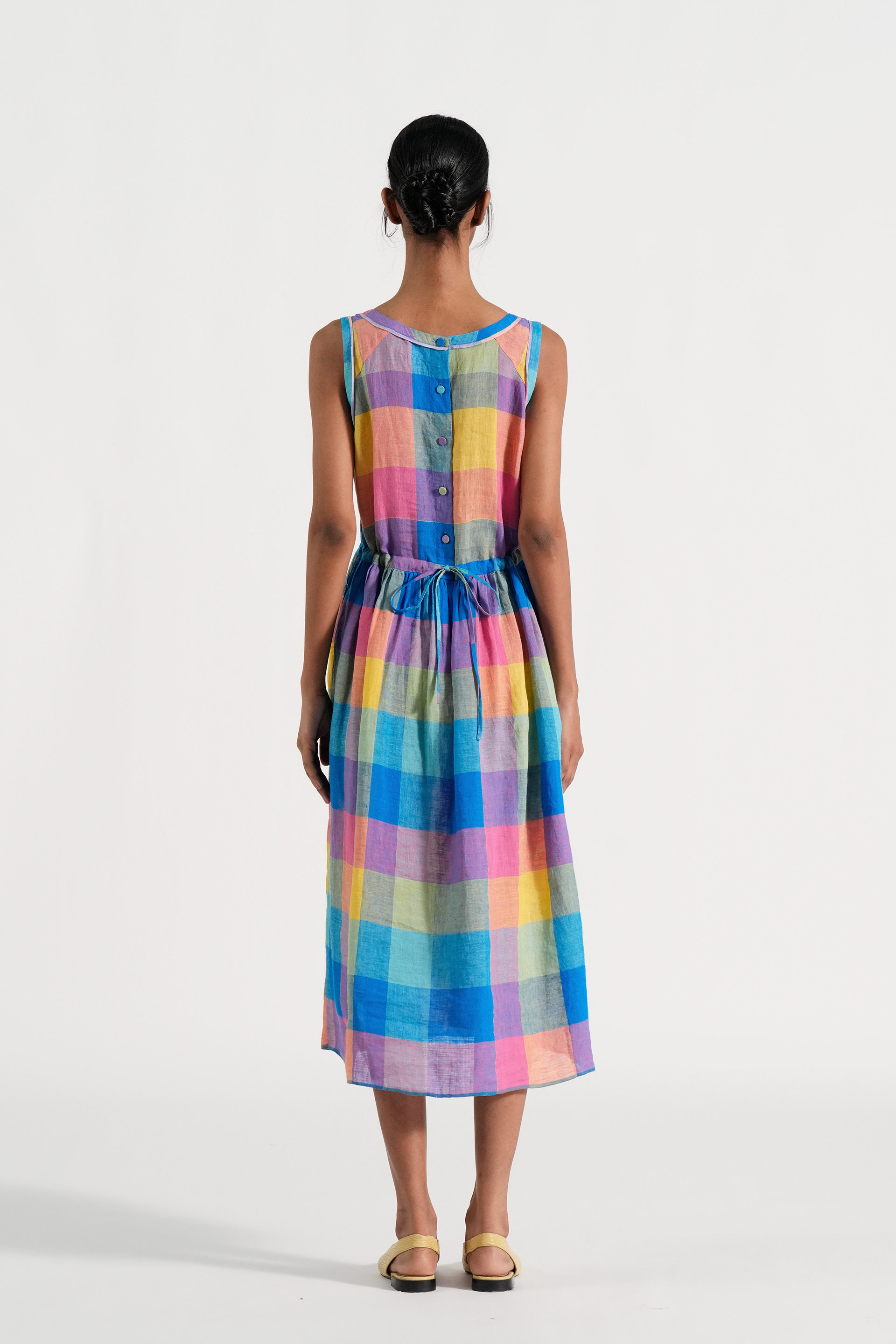 Sleeveless gathered midi dress in multicolor chunky checks.
