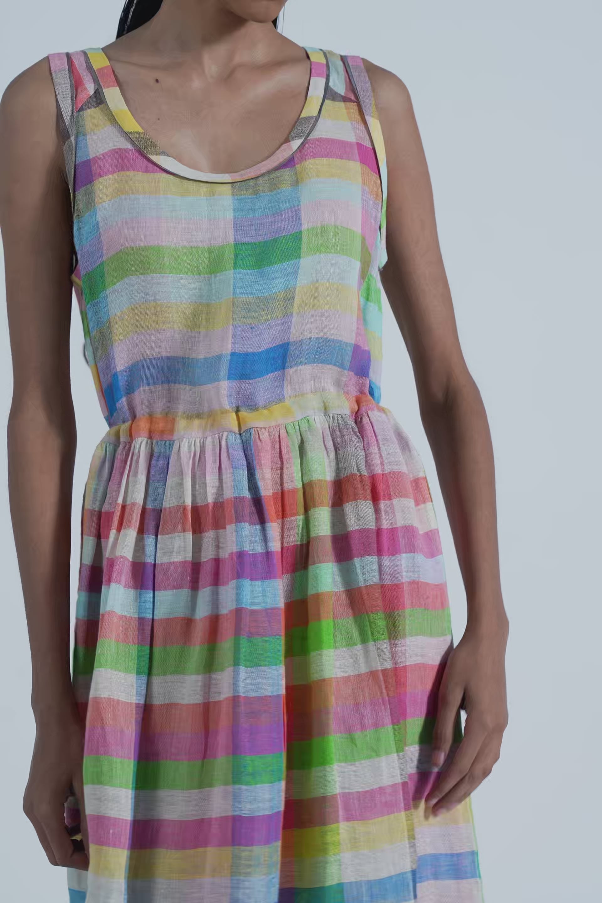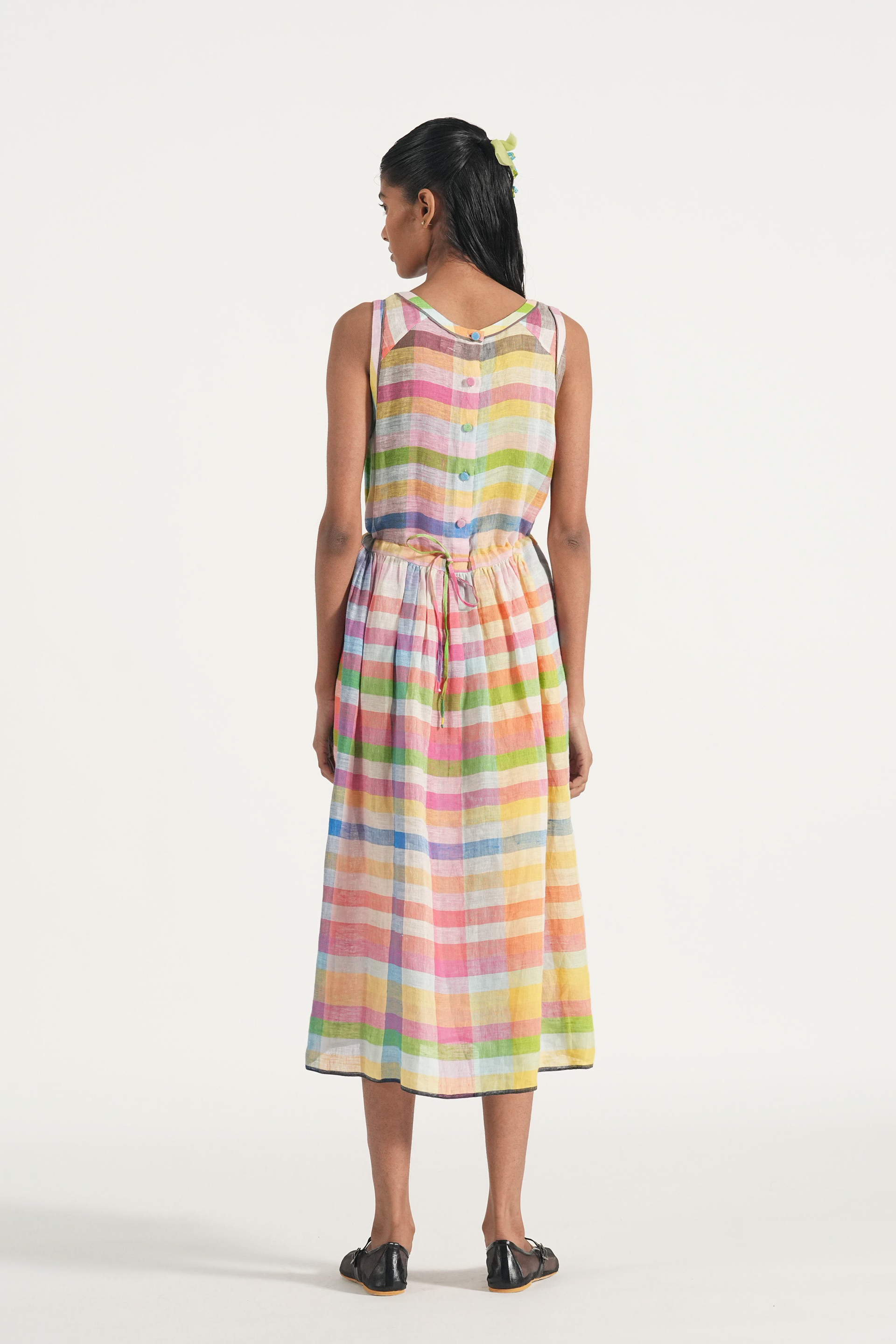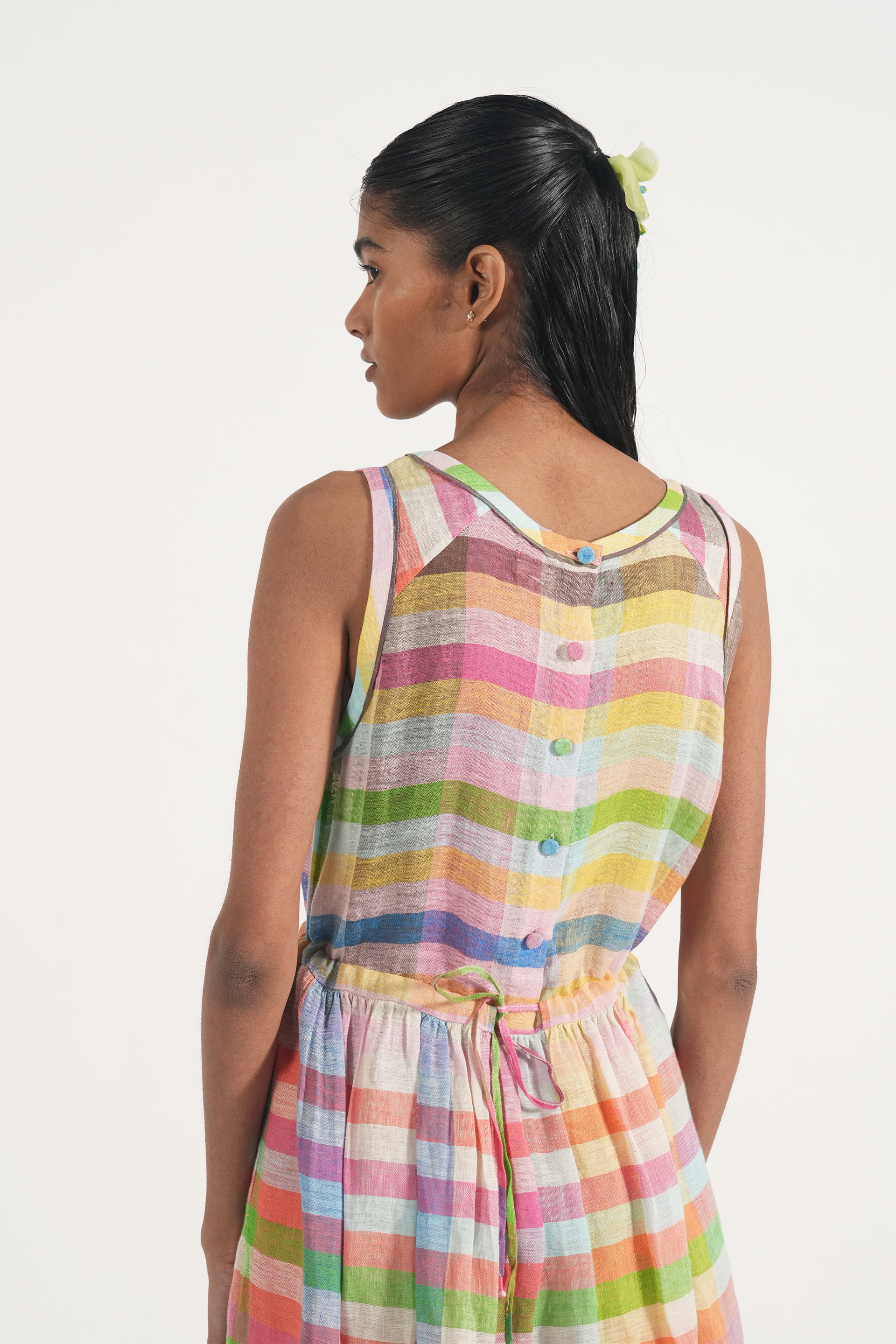 Sleeveless waist gathered easy summer dress in multicolor chunky linen checks with back waist tie up and contrast selvage details