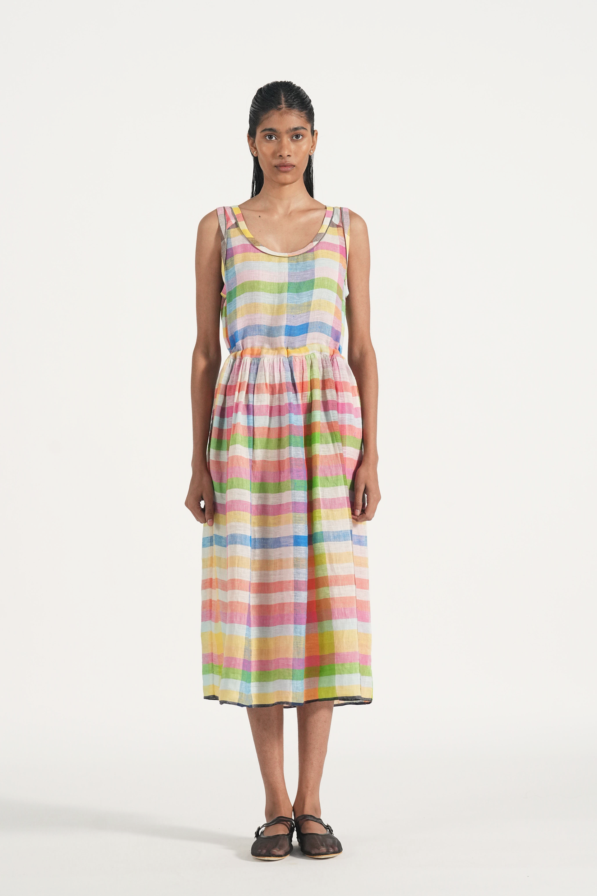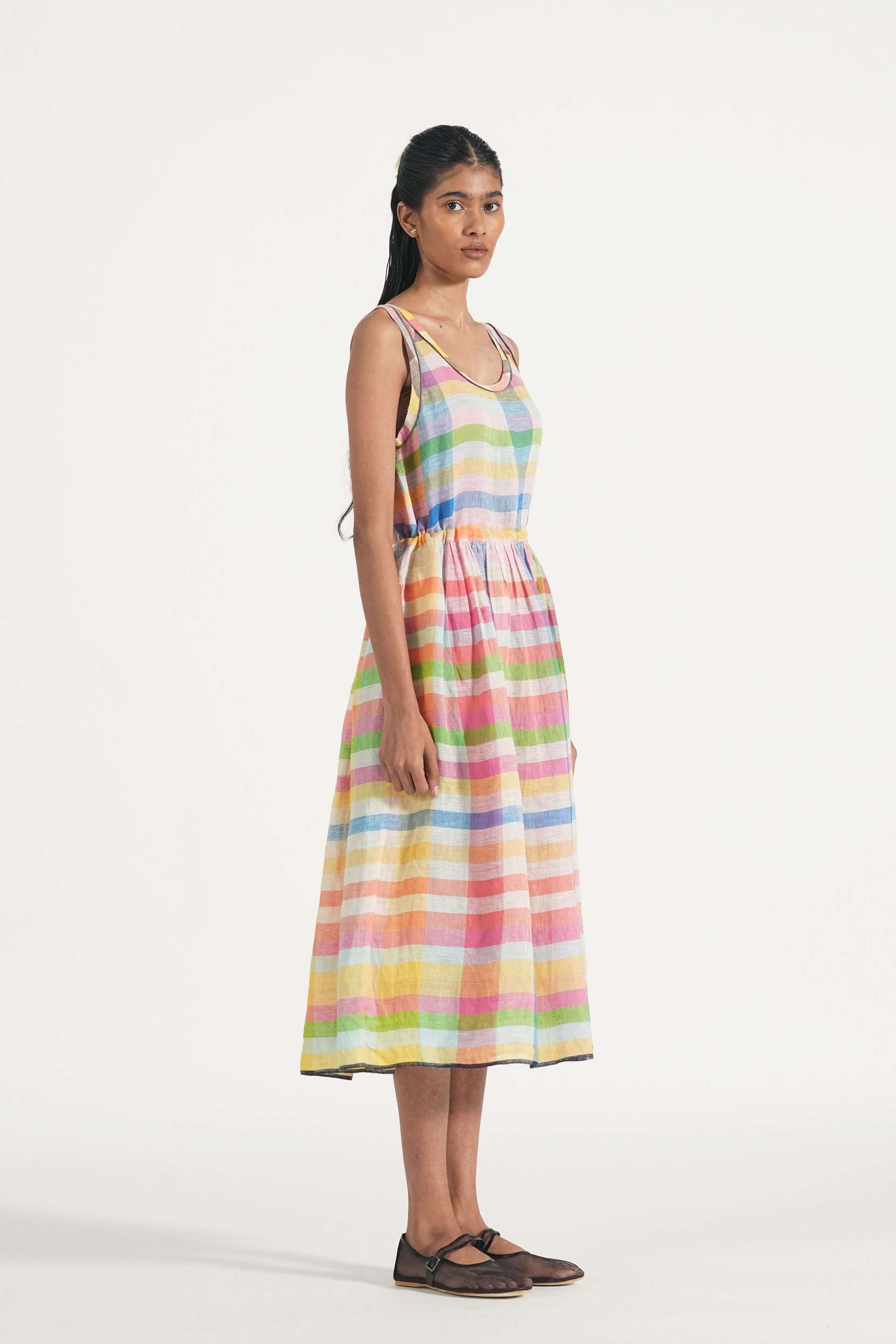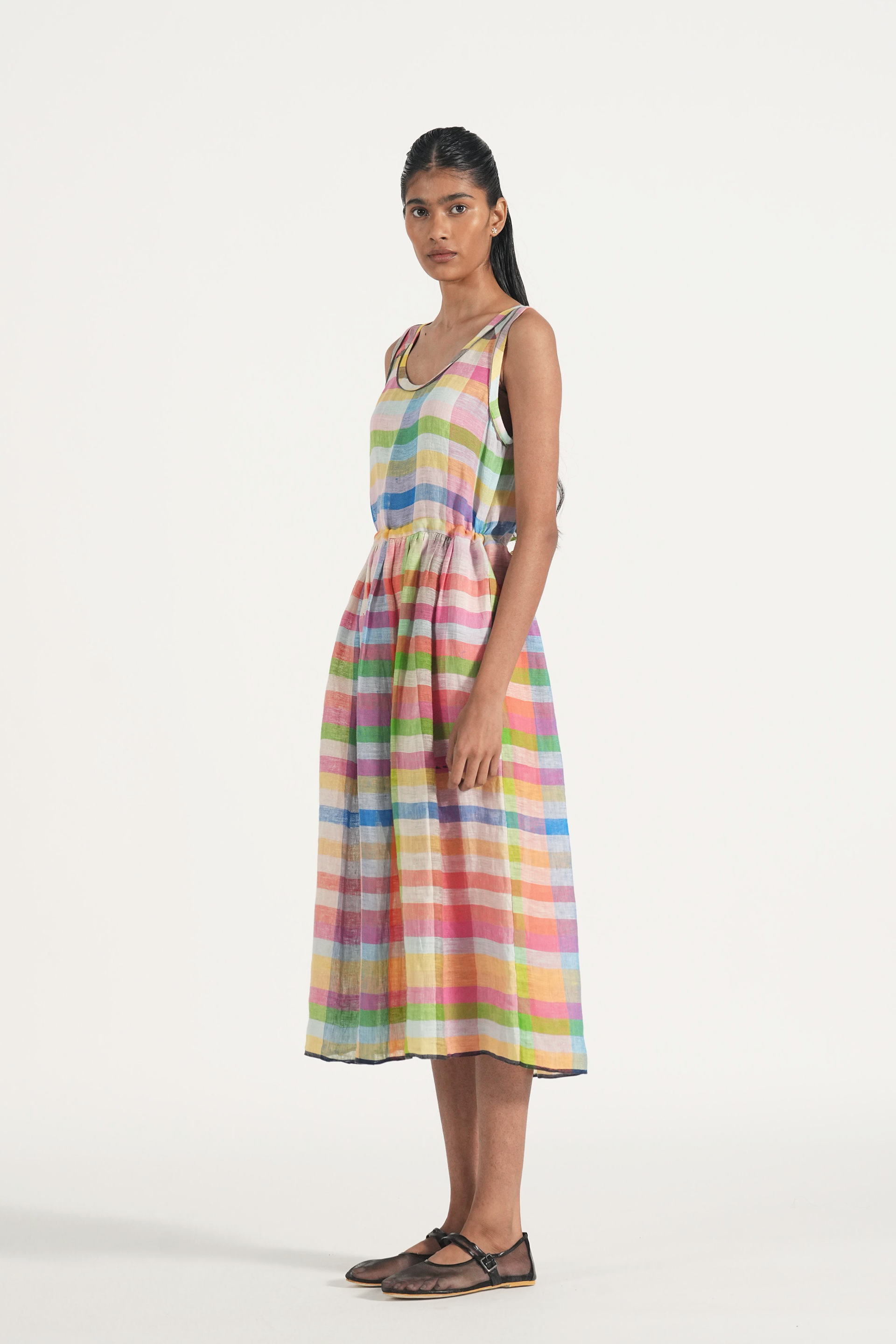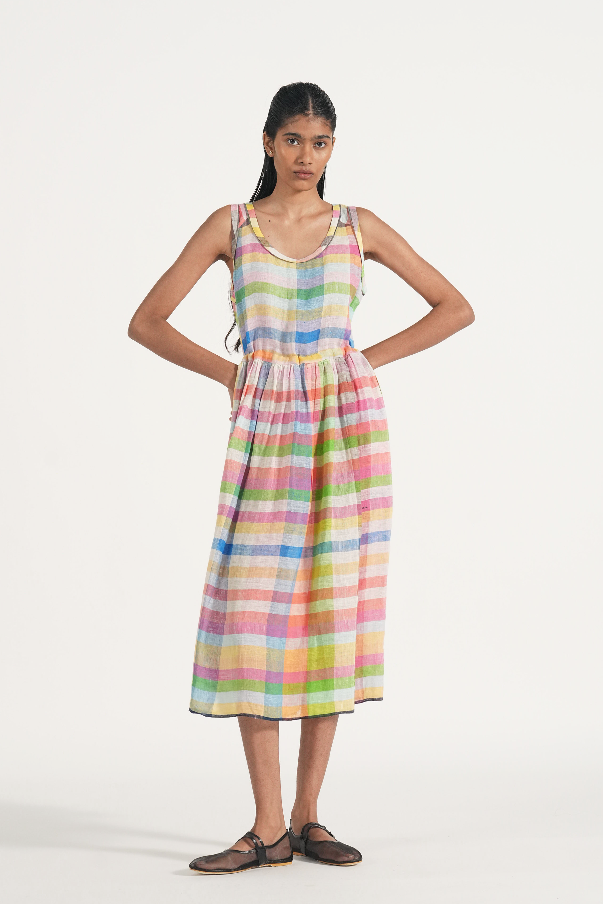 Sleeveless waist gathered easy summer dress in multicolor chunky linen checks with back waist tie up and contrast selvage details