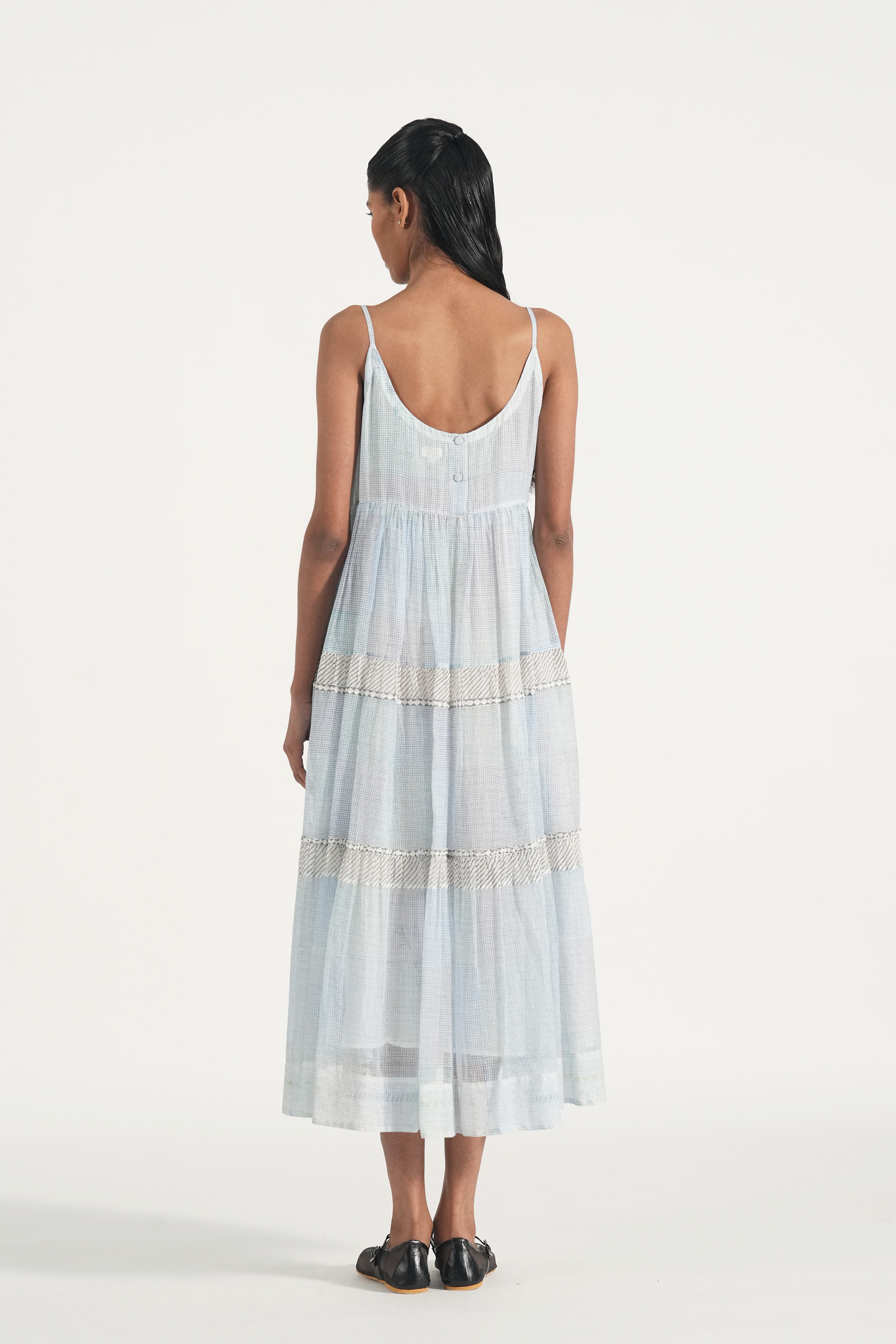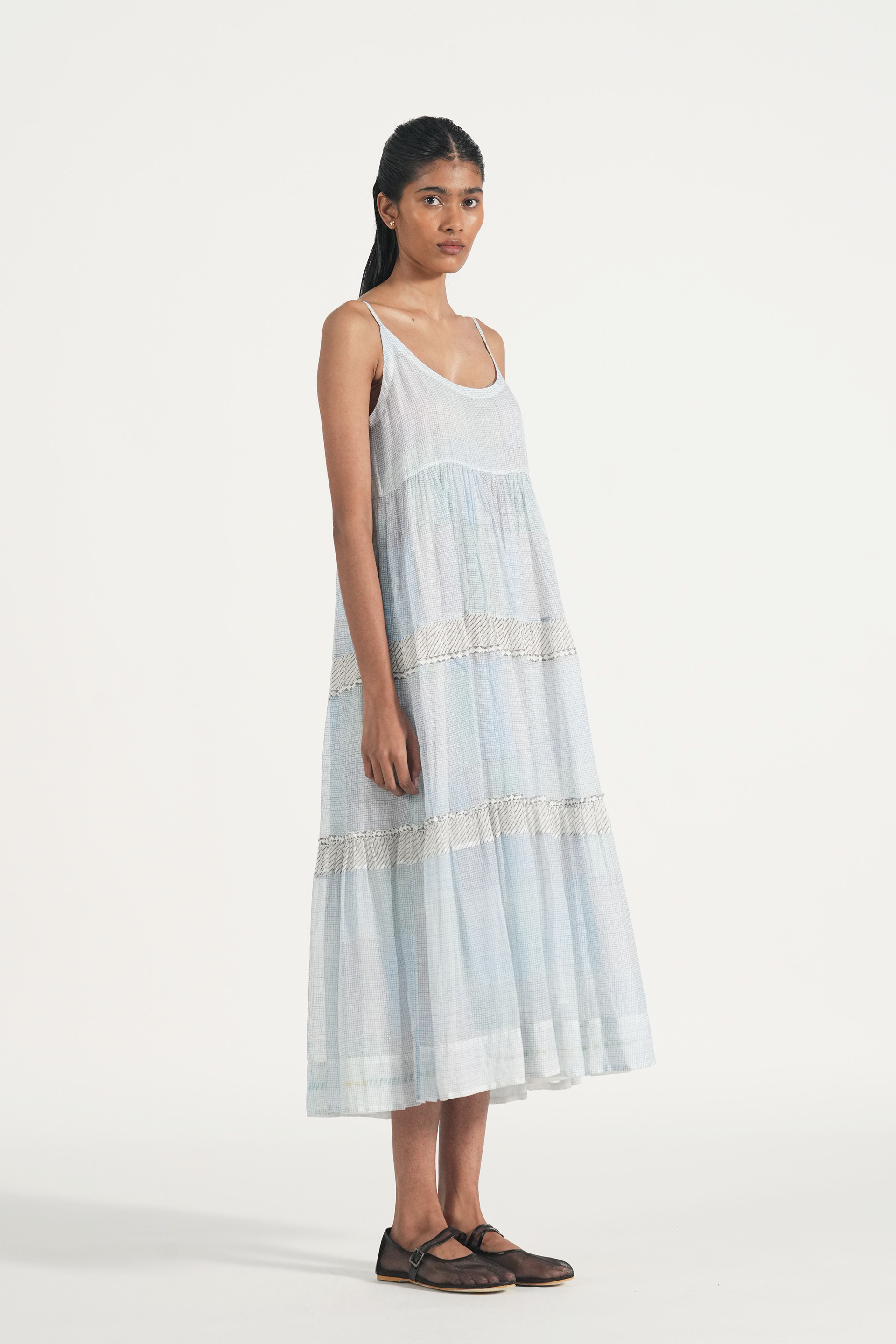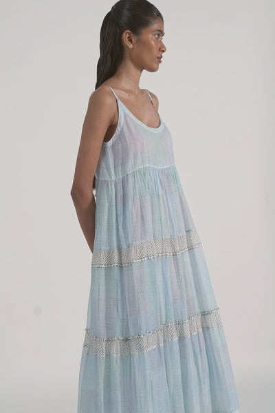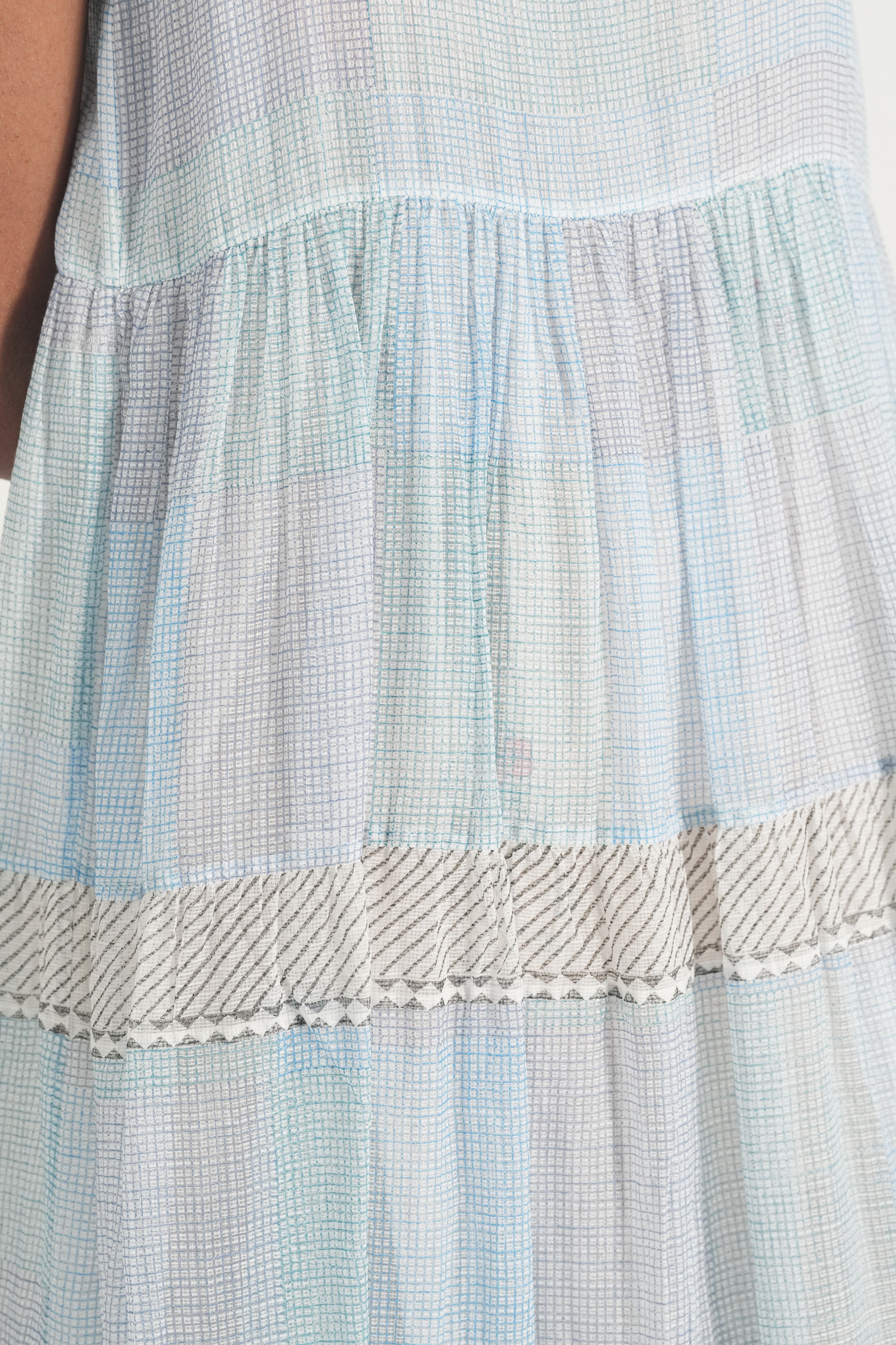 Spaghetti strap summer dress, hand block printed multi check print. Llined in co-silk.