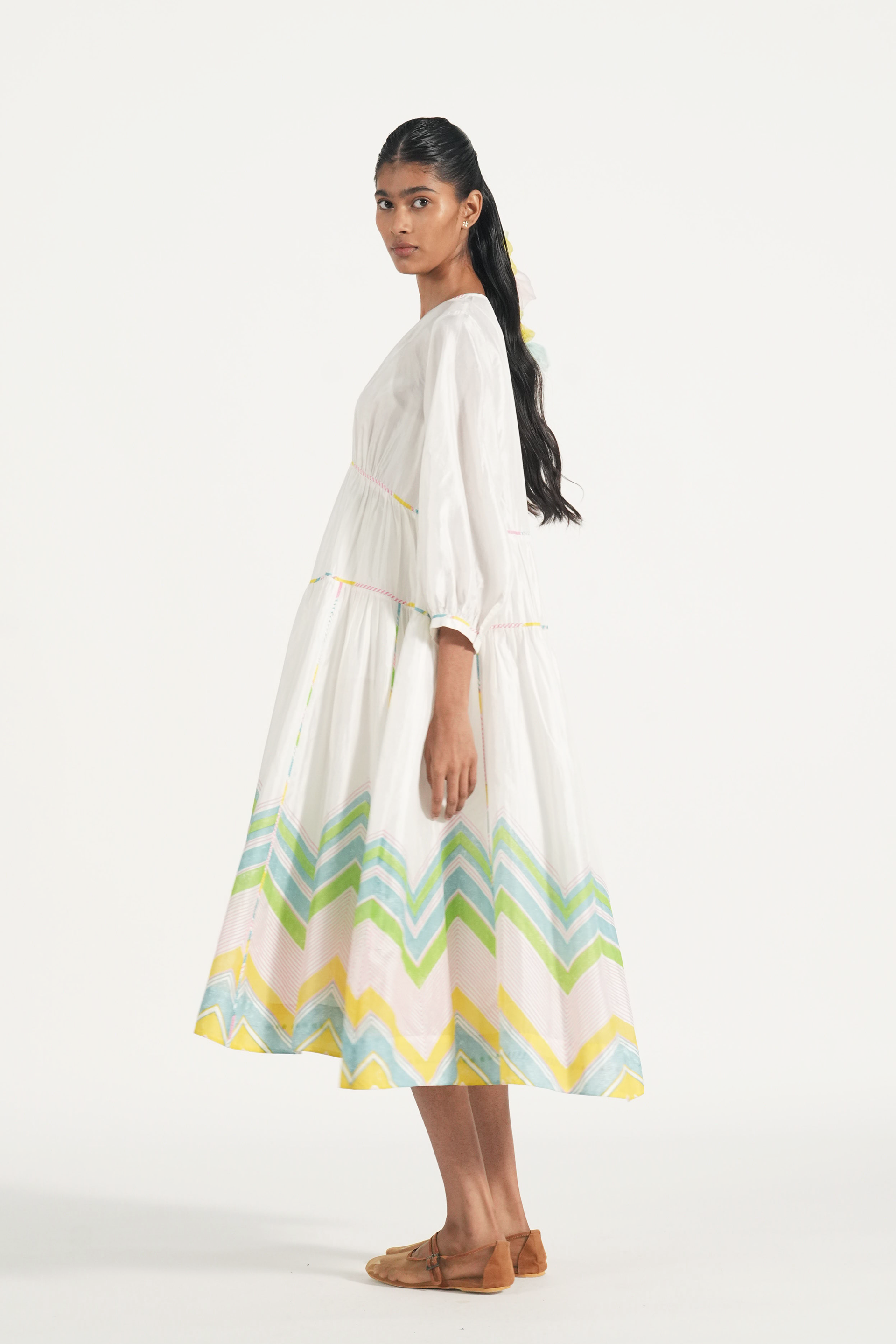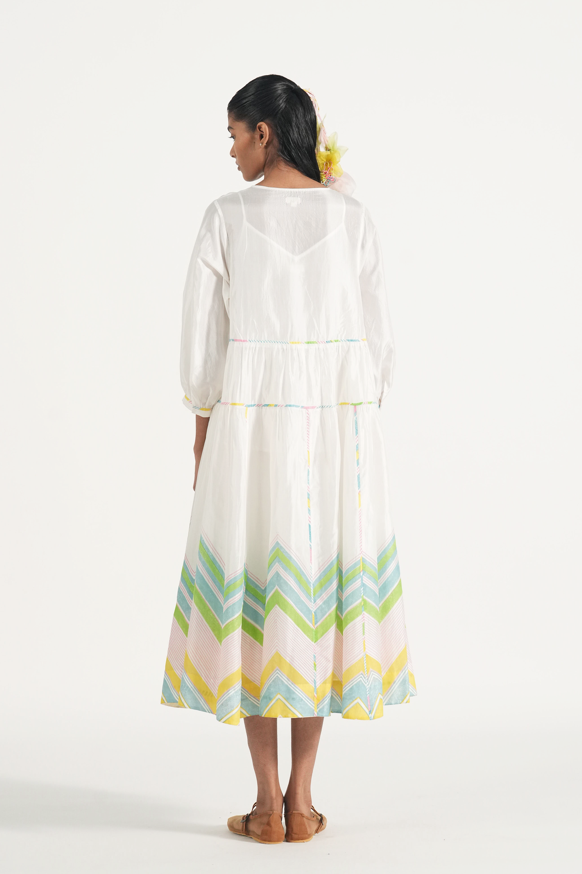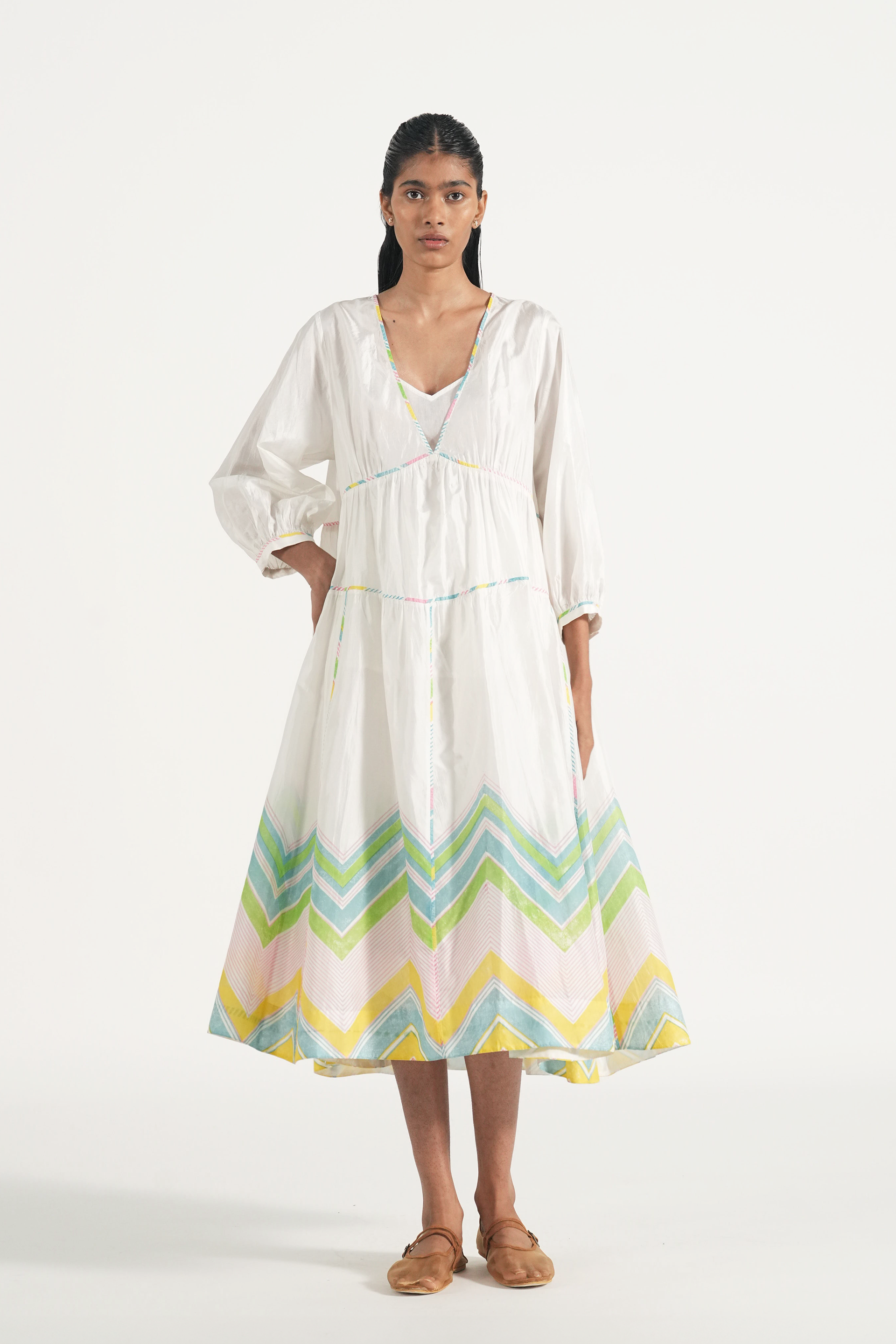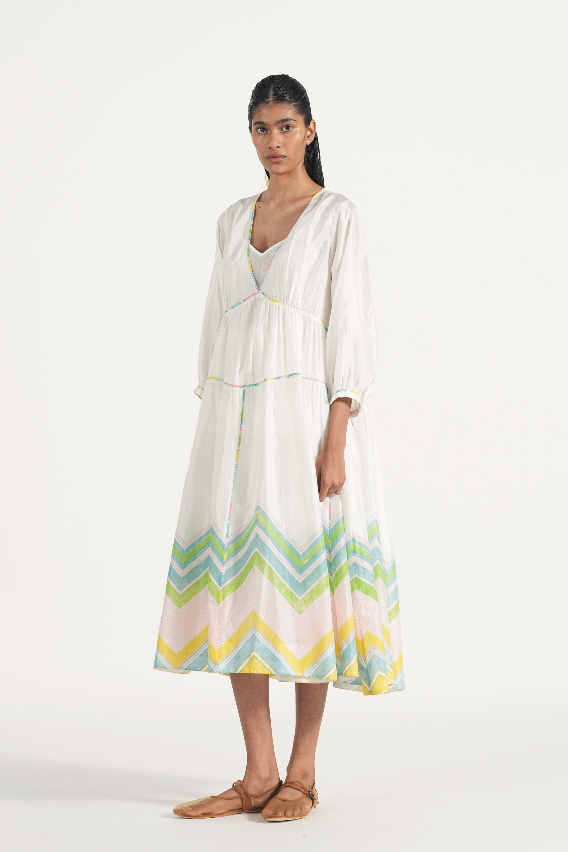 Midi length dress in multicolor diagonal print. And hand block printed contrasting binding detail. Comes with a complimentary lining.