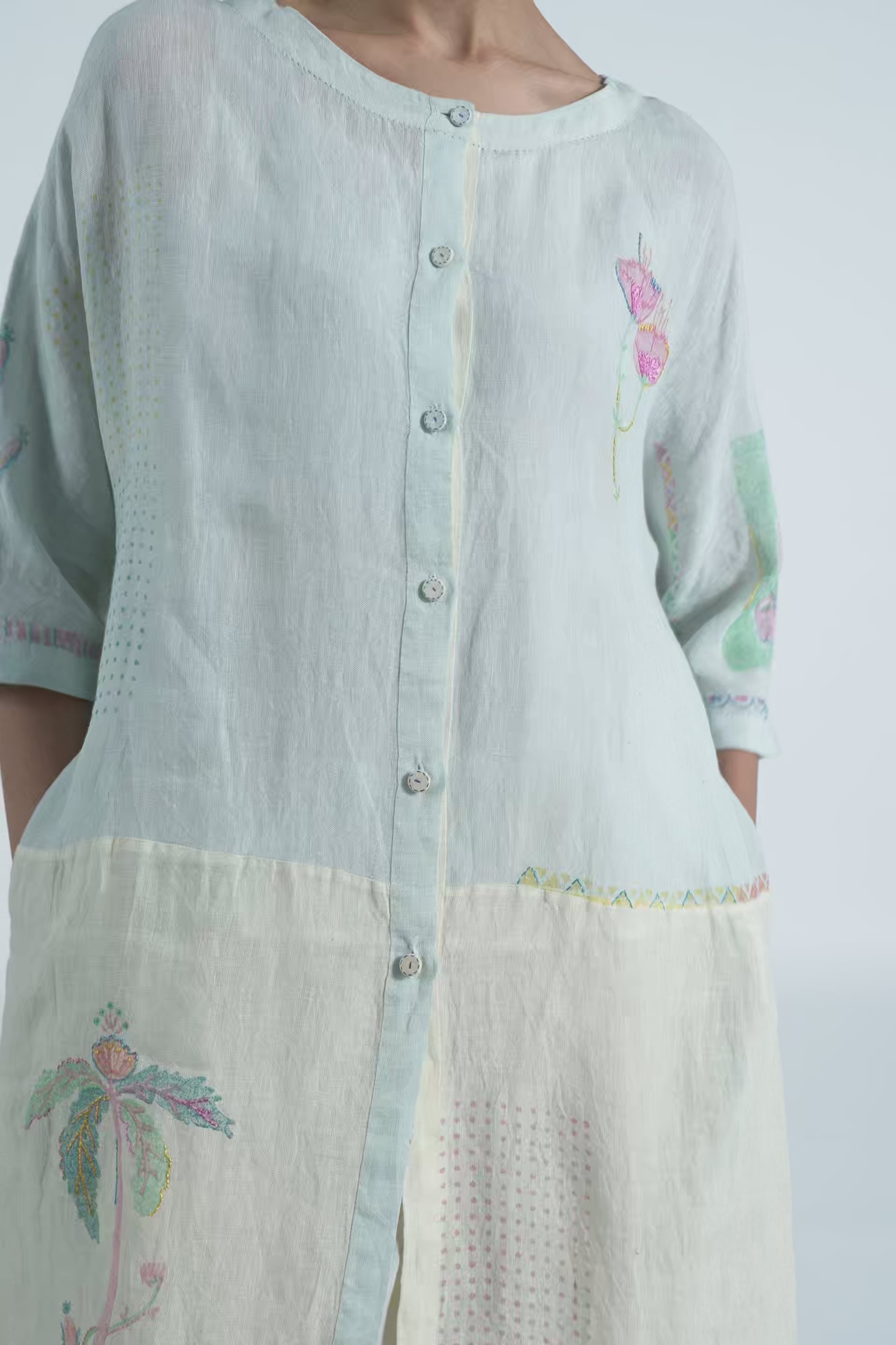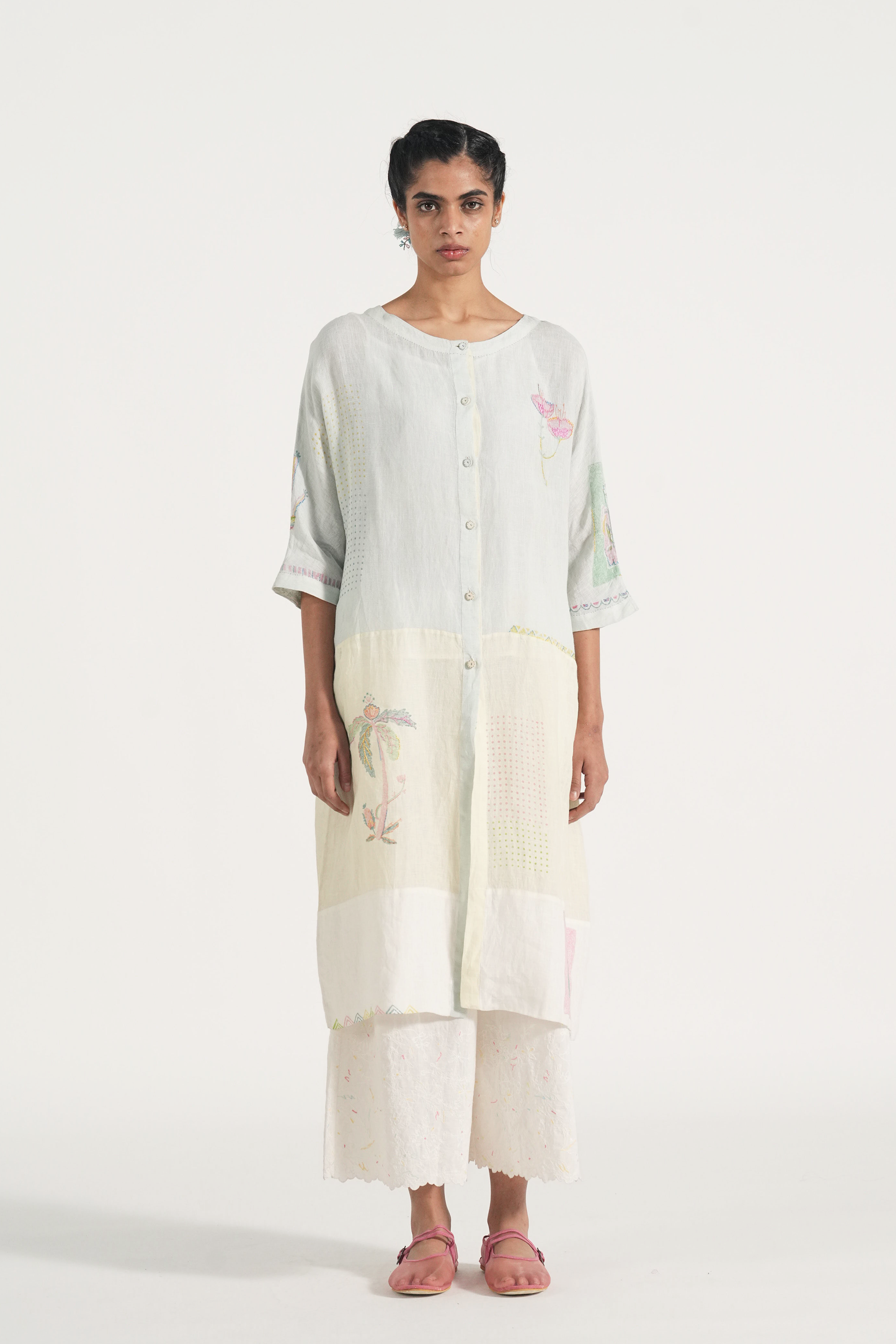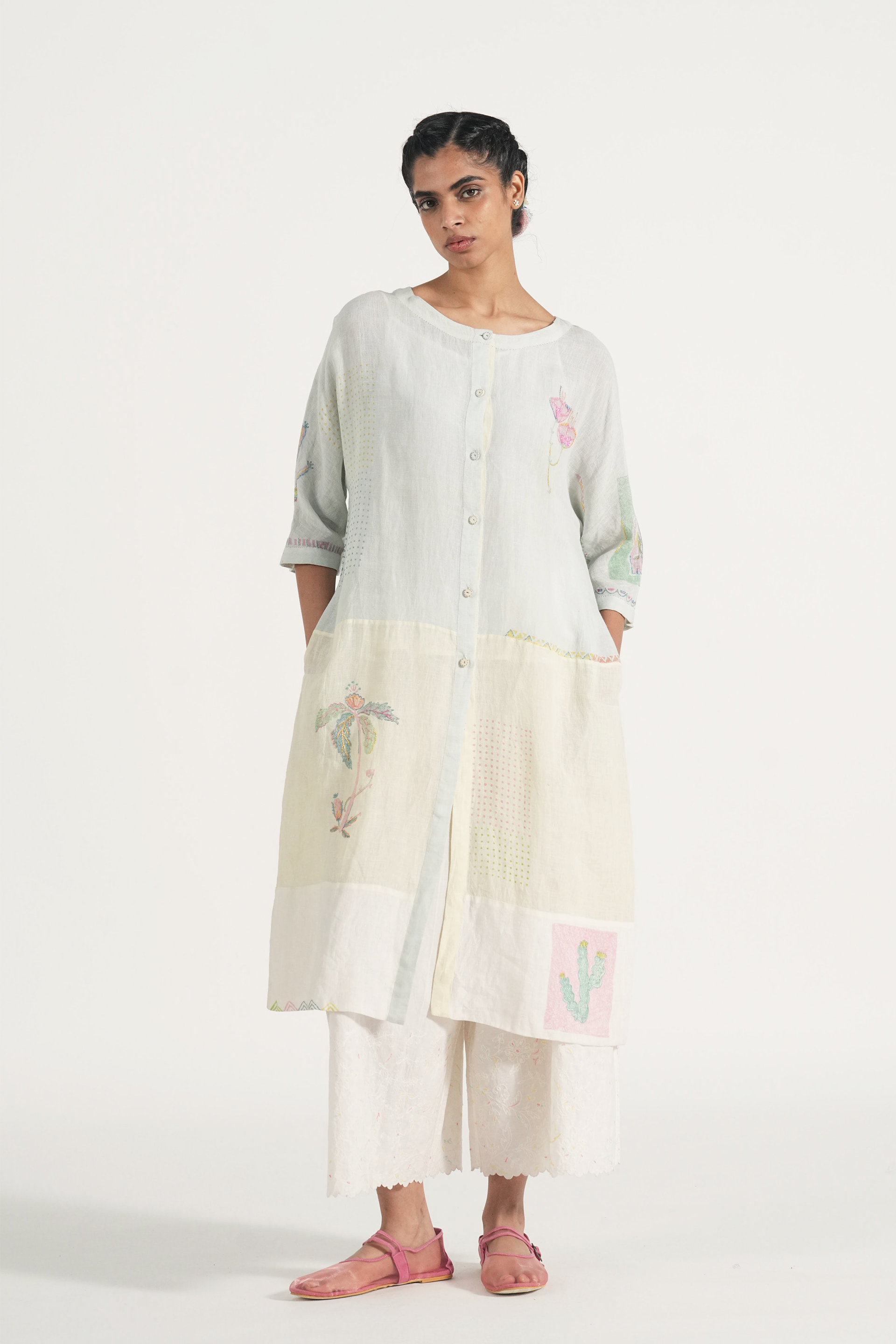 Front open kurta patchwork dress in placement hand block print accentuated with hand embroidery details