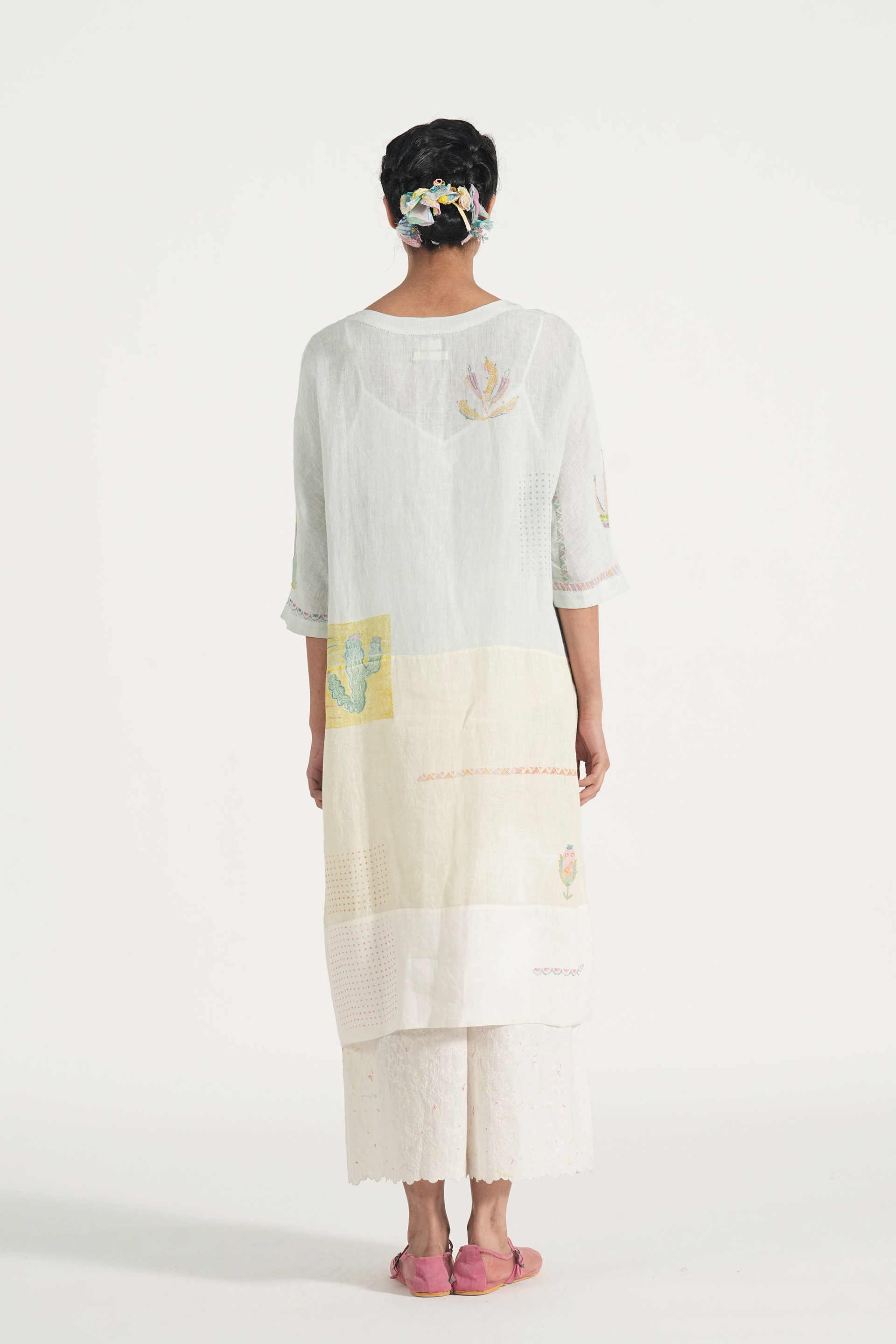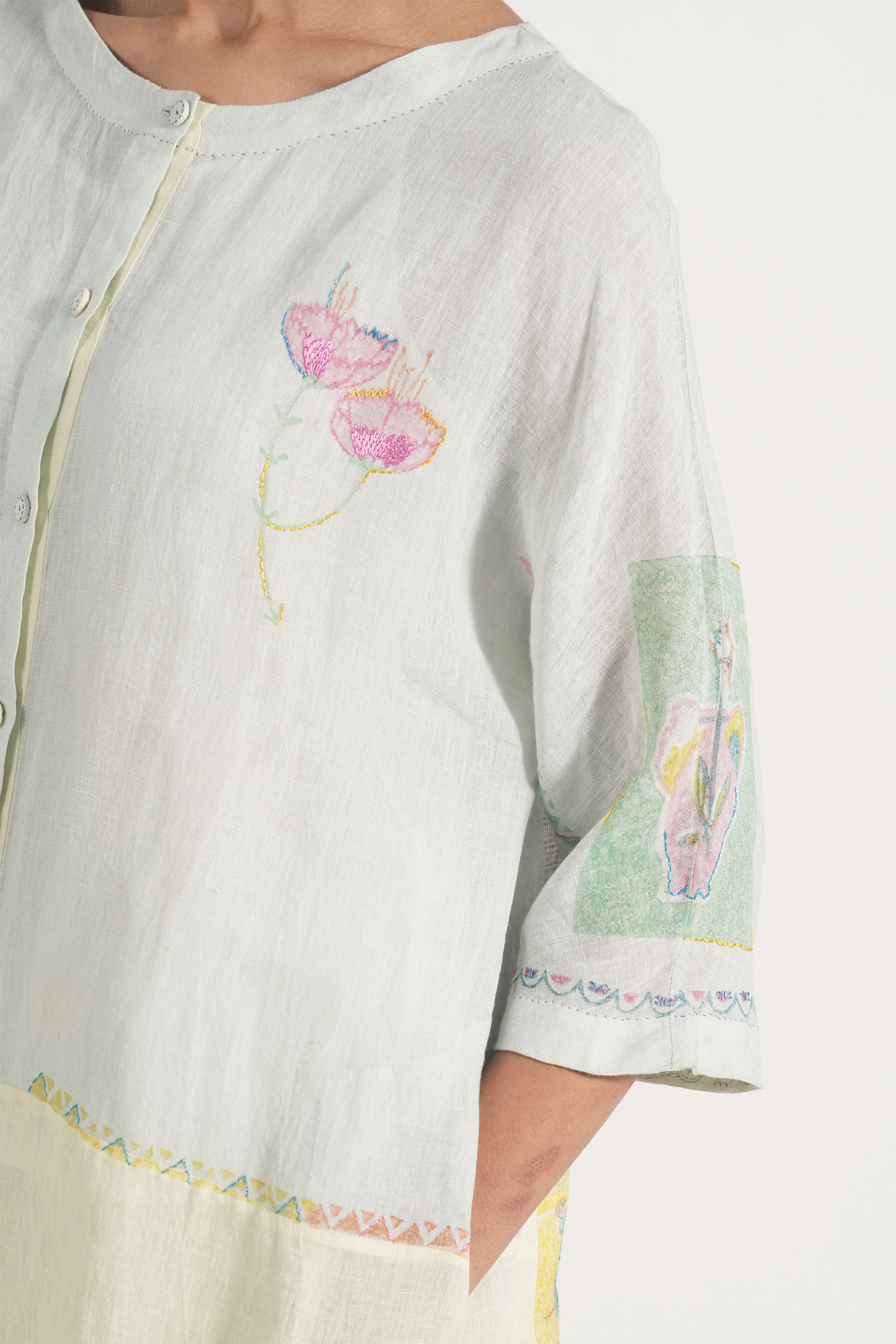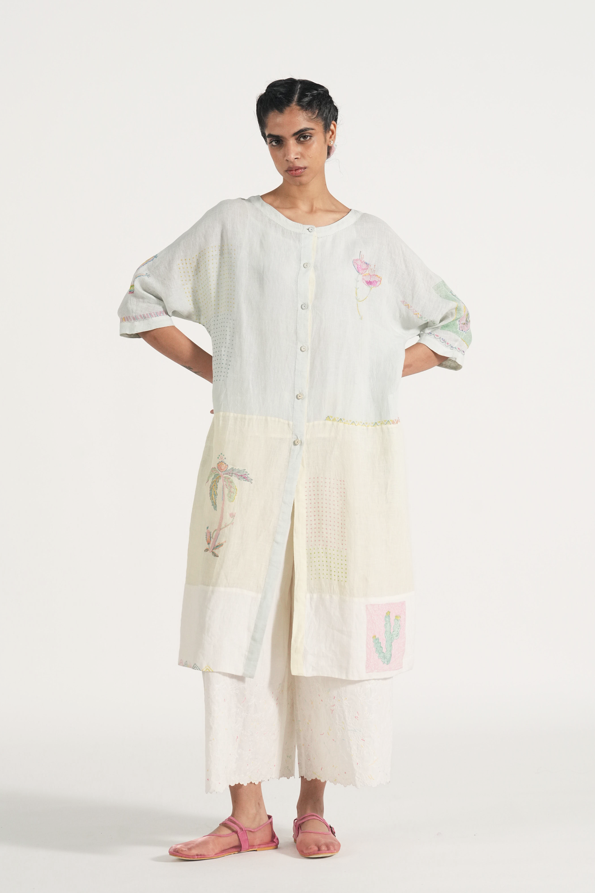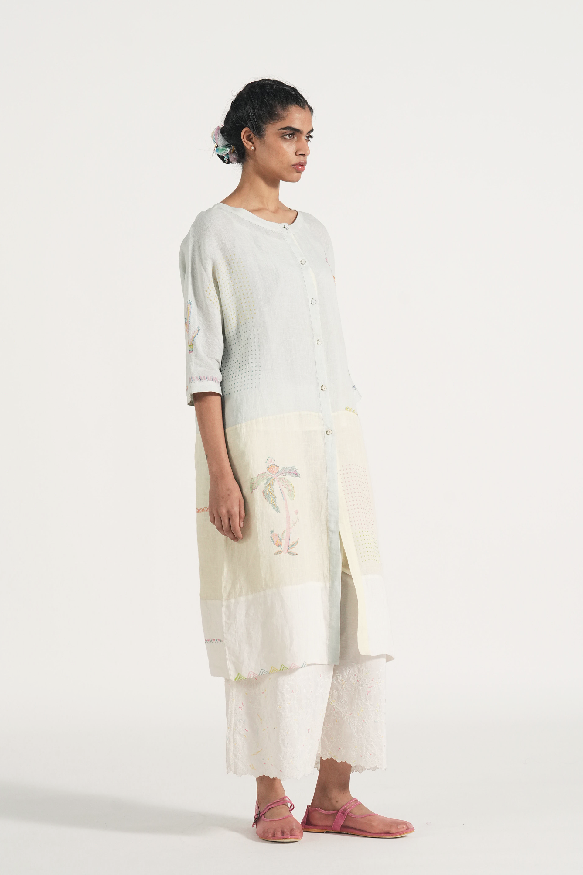 Front open kurta patchwork dress in placement hand block print accentuated with hand embroidery details