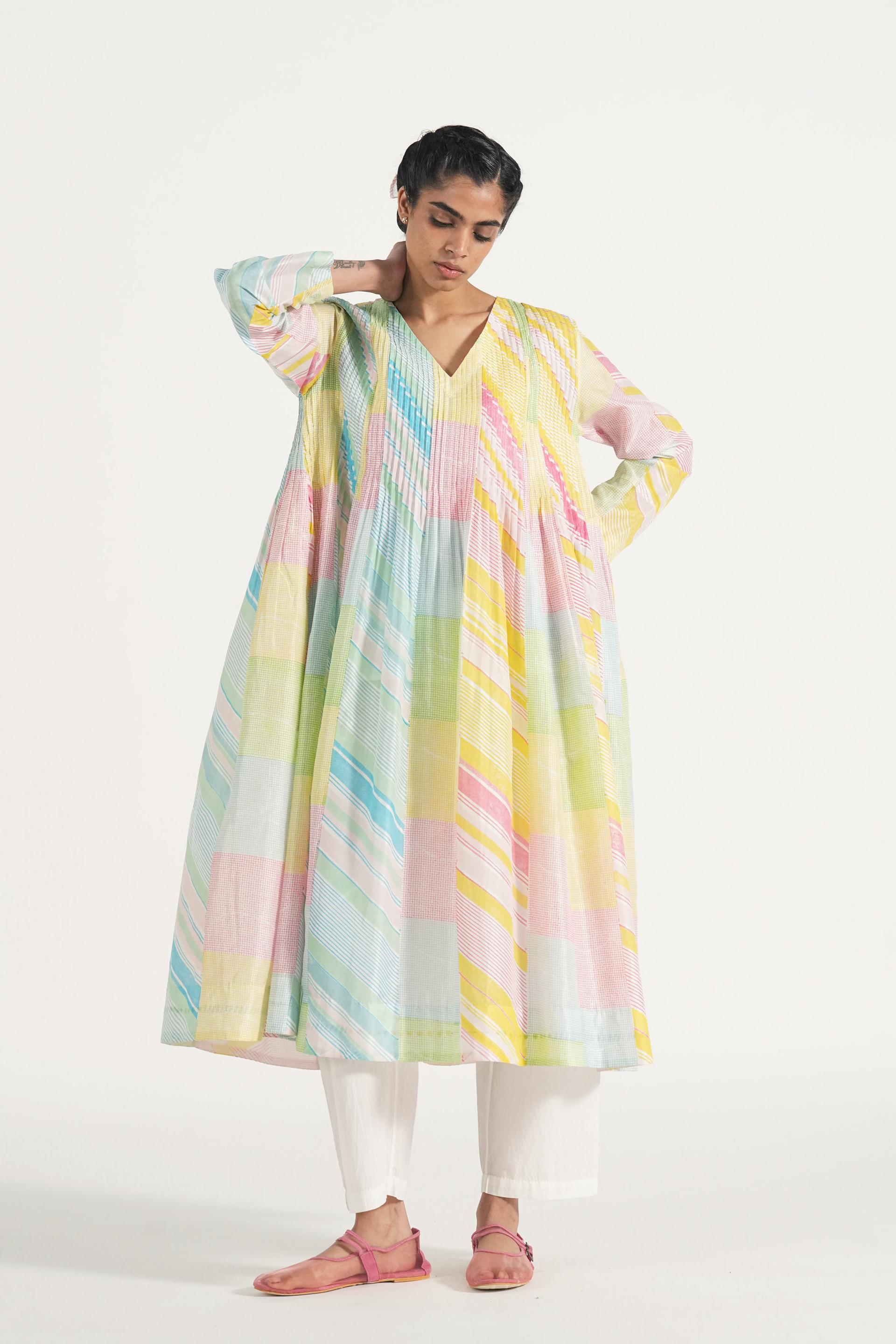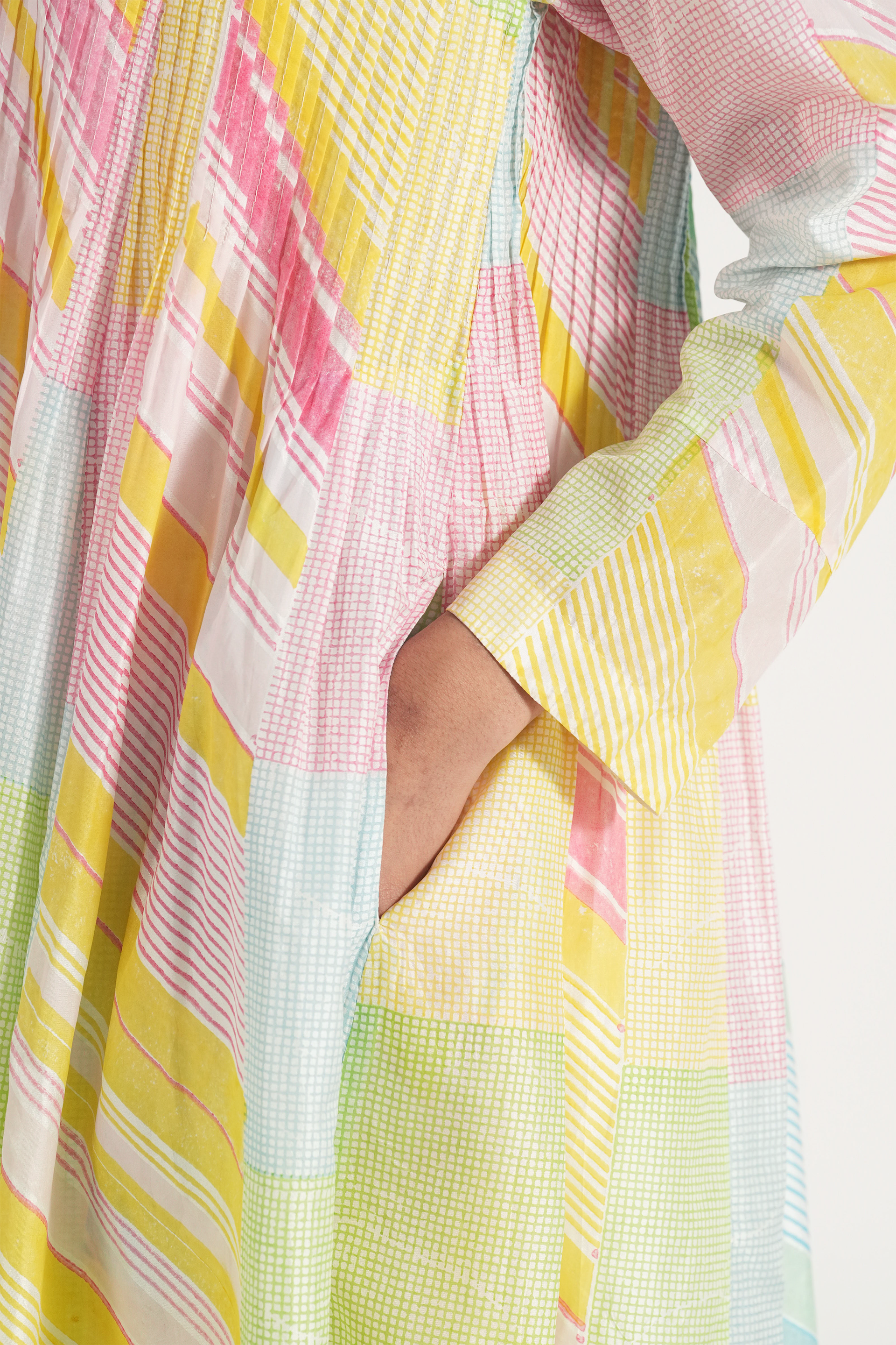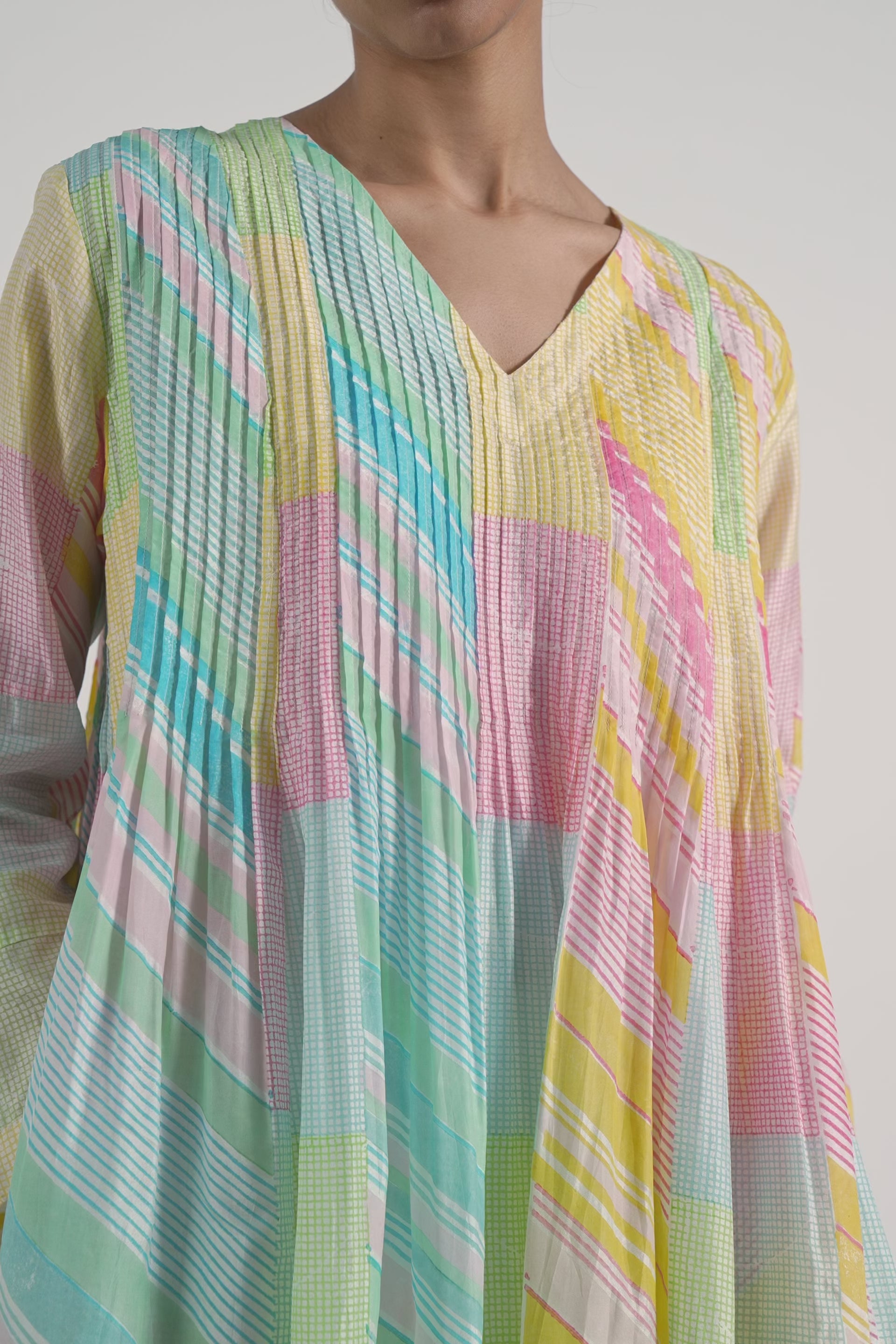 Pintuck relaxed fit tunic dress in hand block printed diagonal stripes and checks