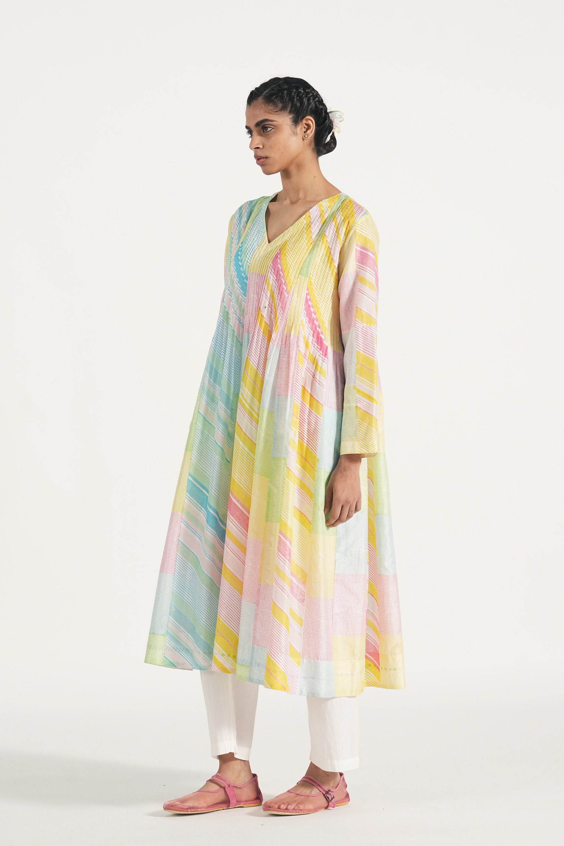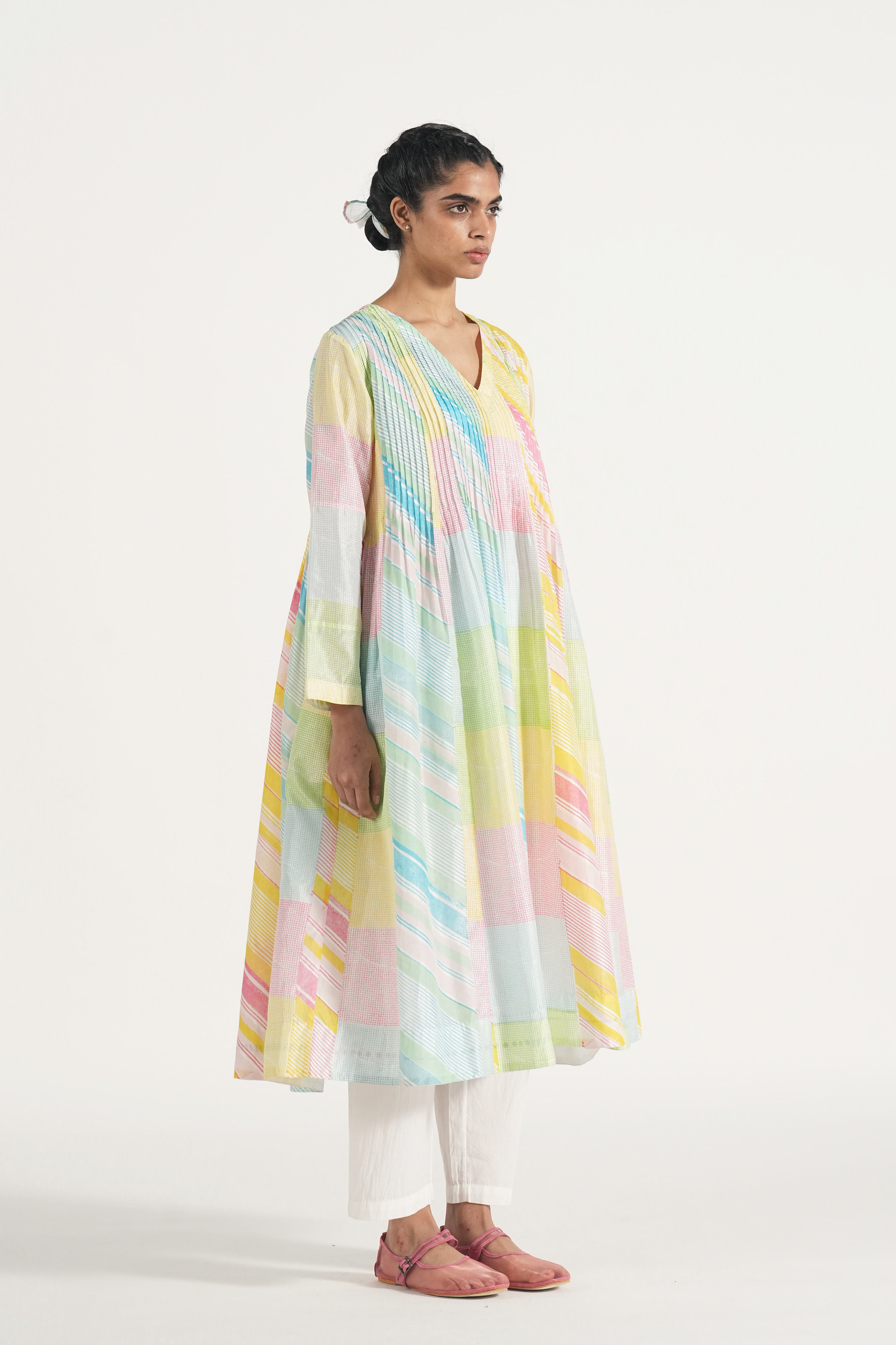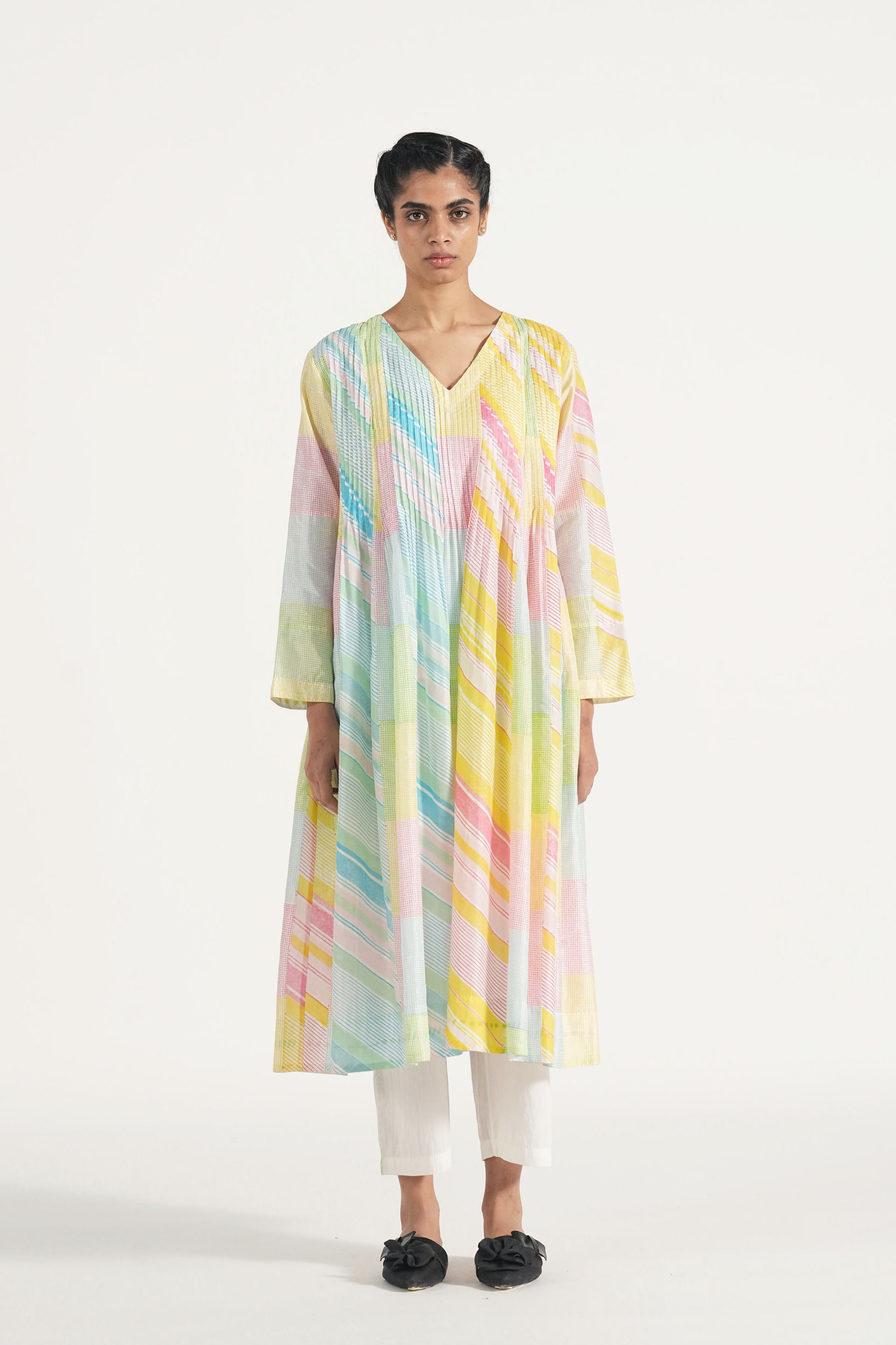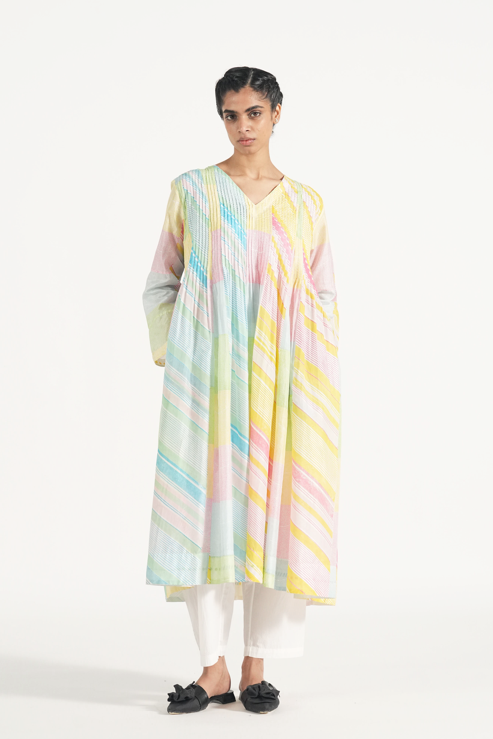 Pintuck relaxed fit tunic dress in hand block printed diagonal stripes and checks
