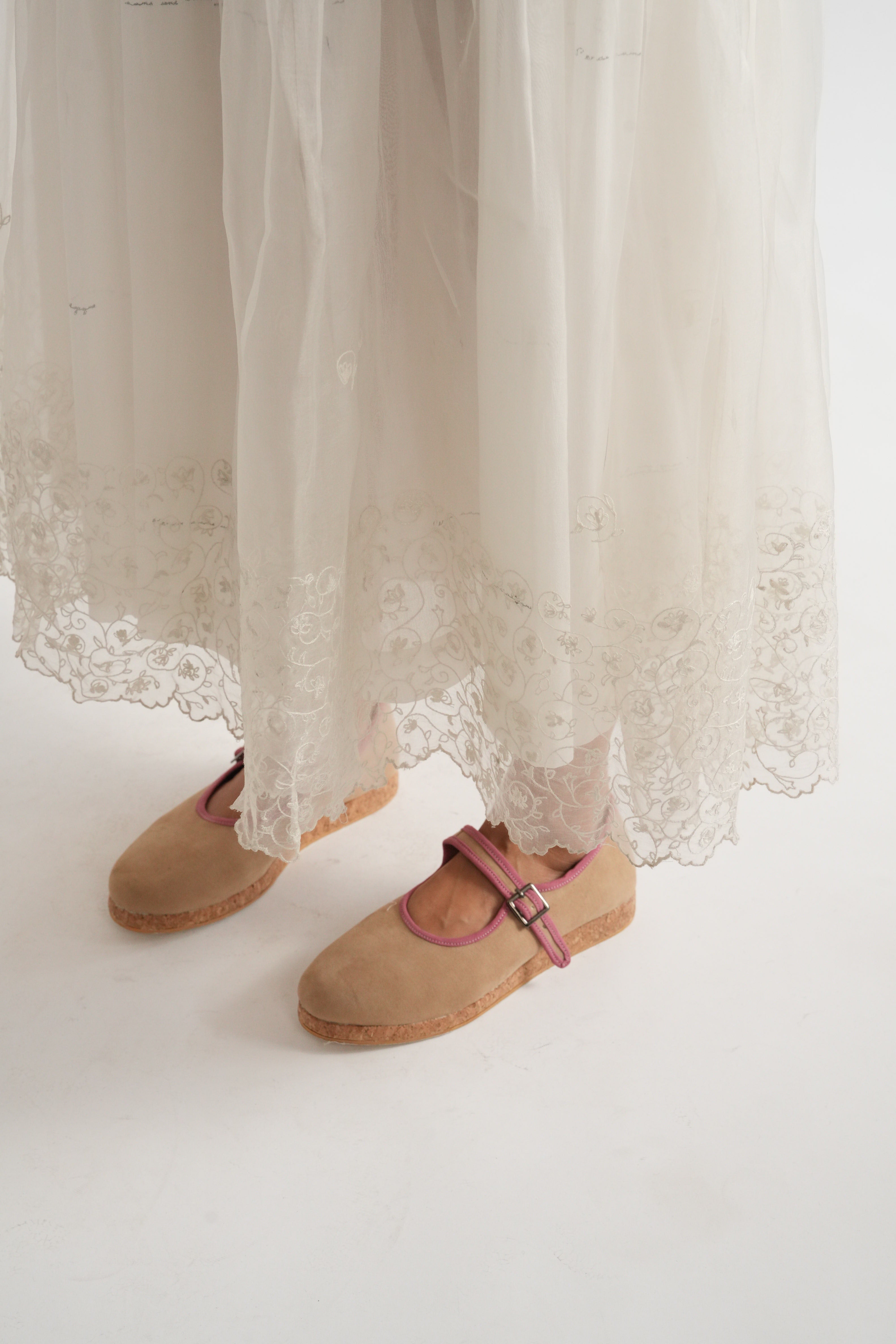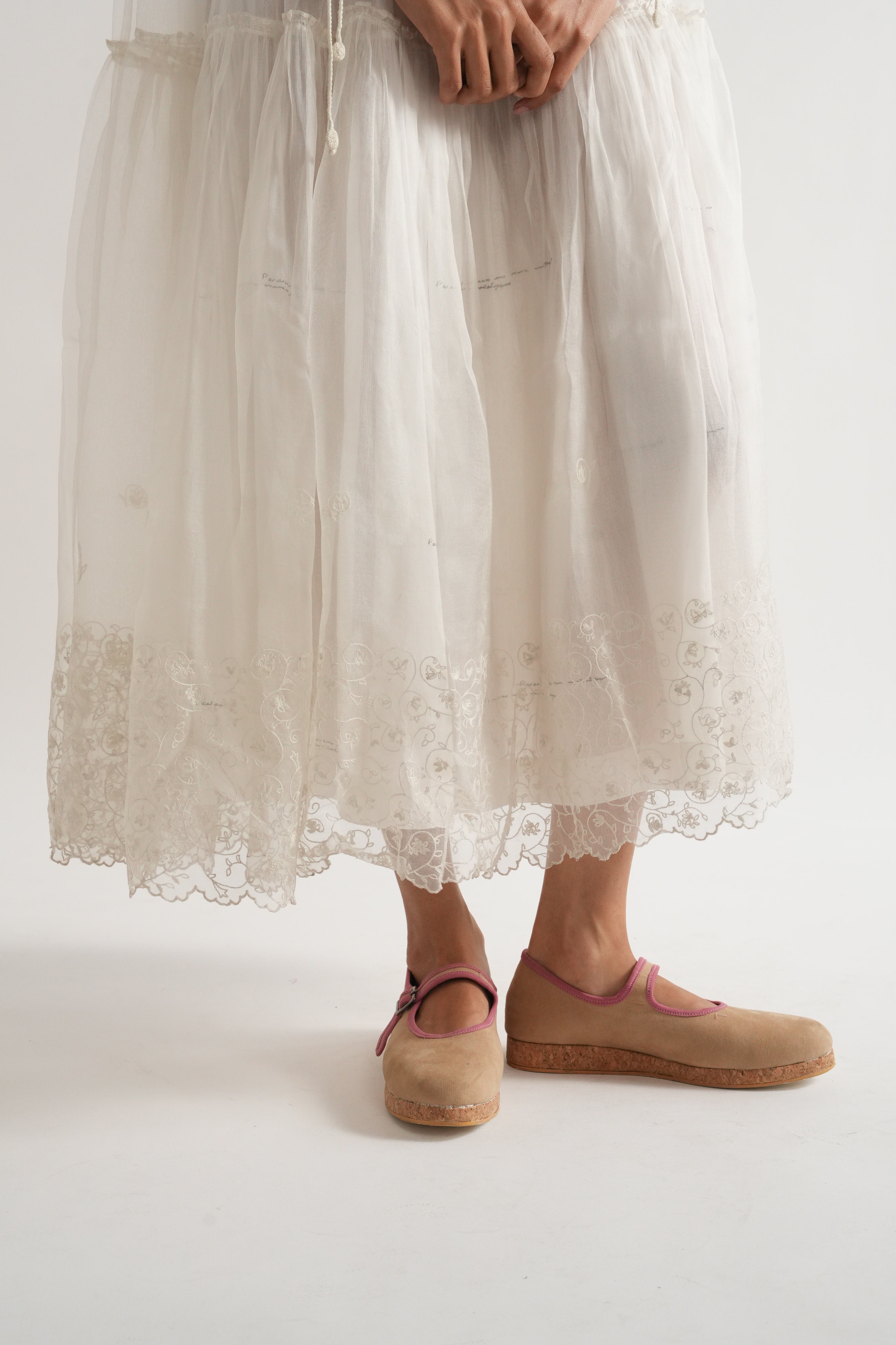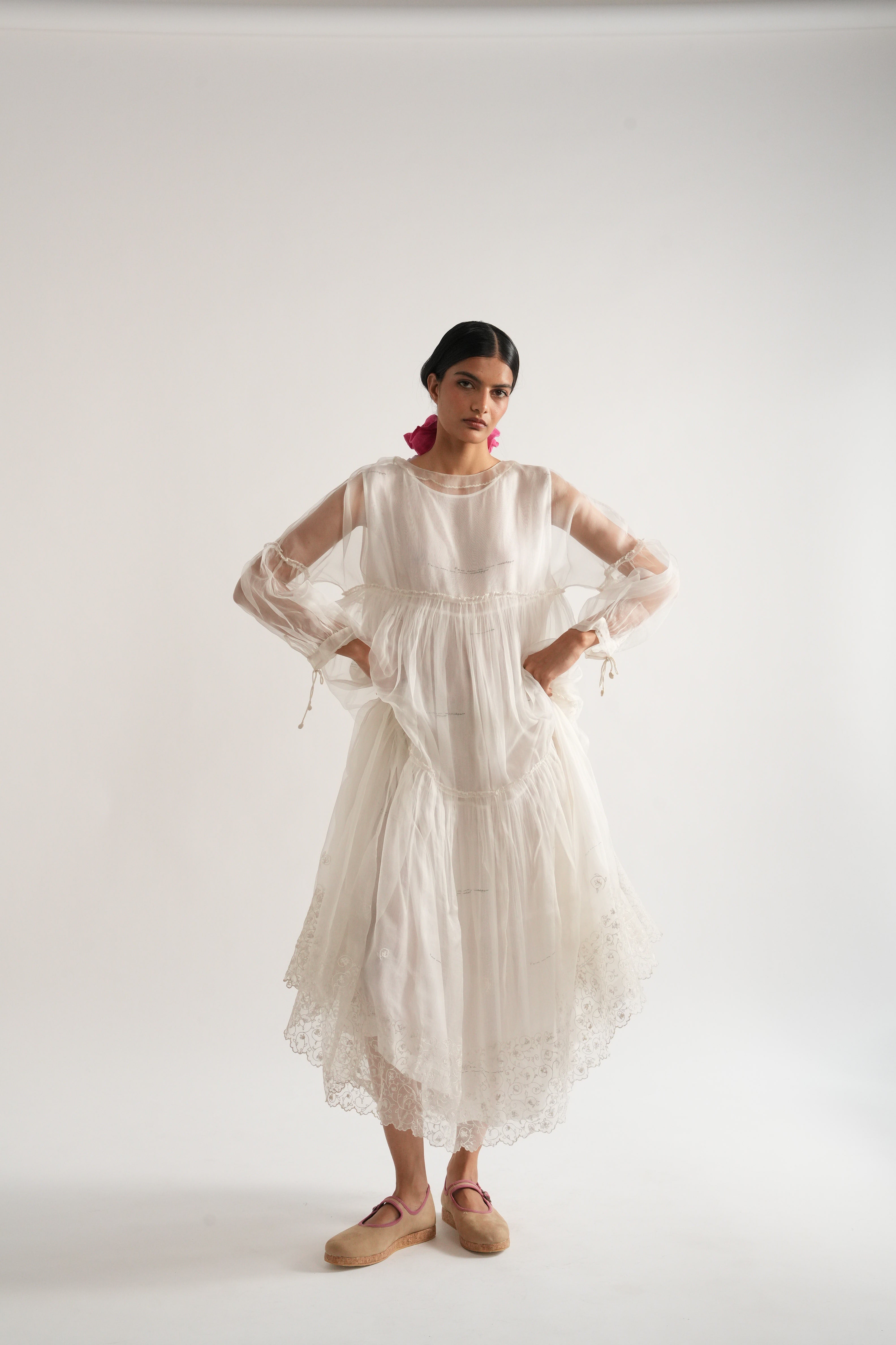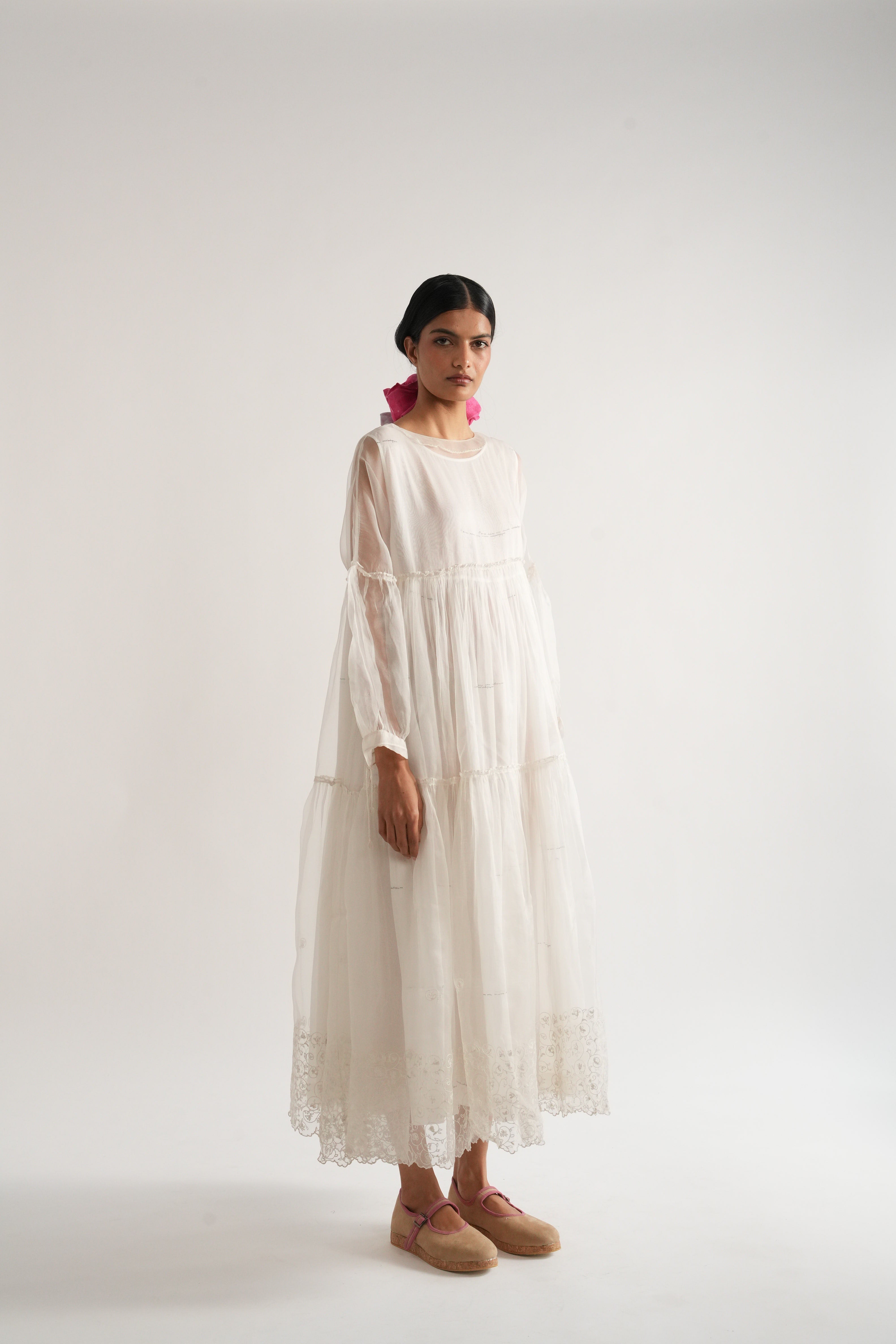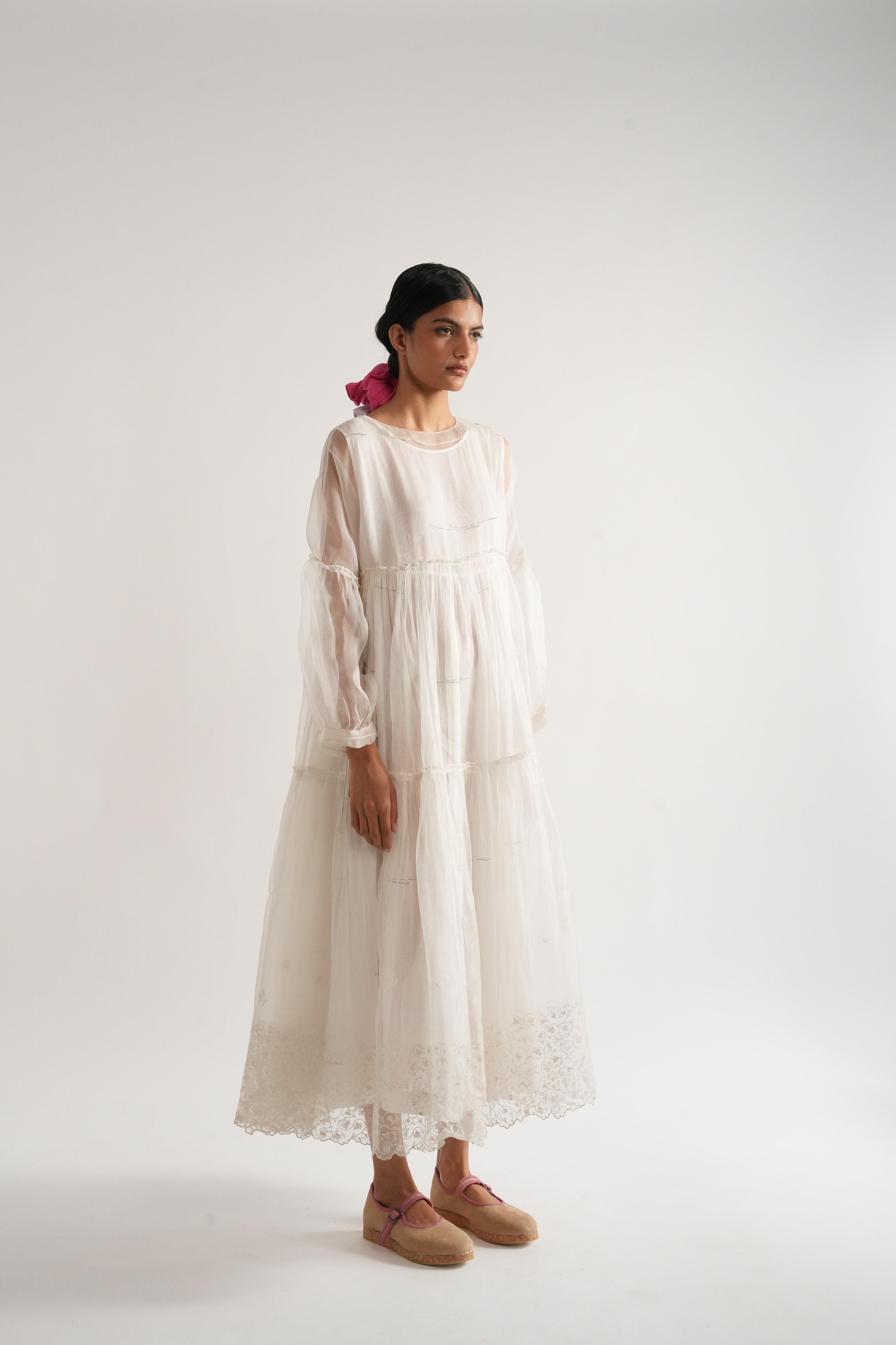 A tiered and gathered dress in organza with hand embroidery detail at the hem
