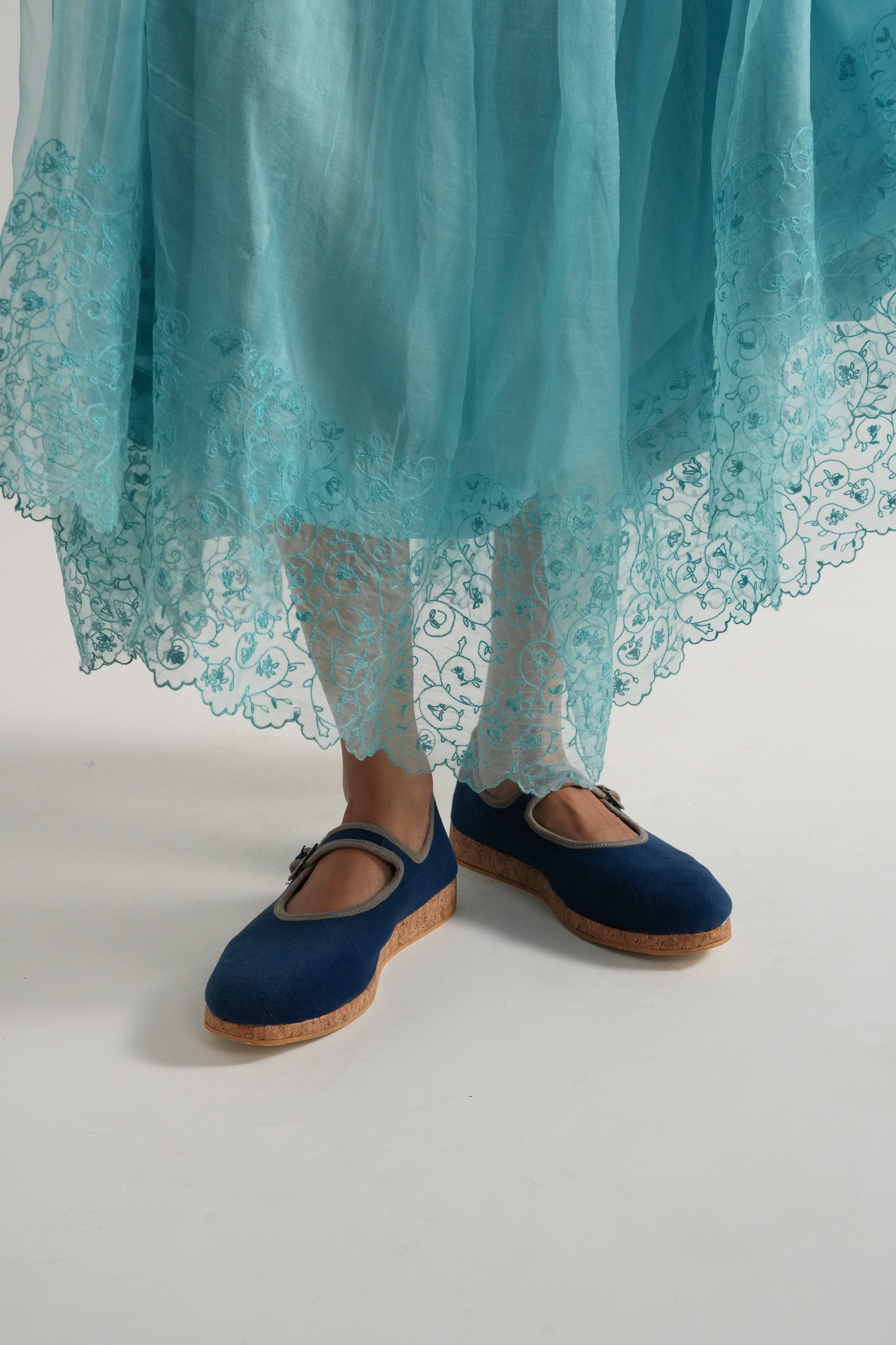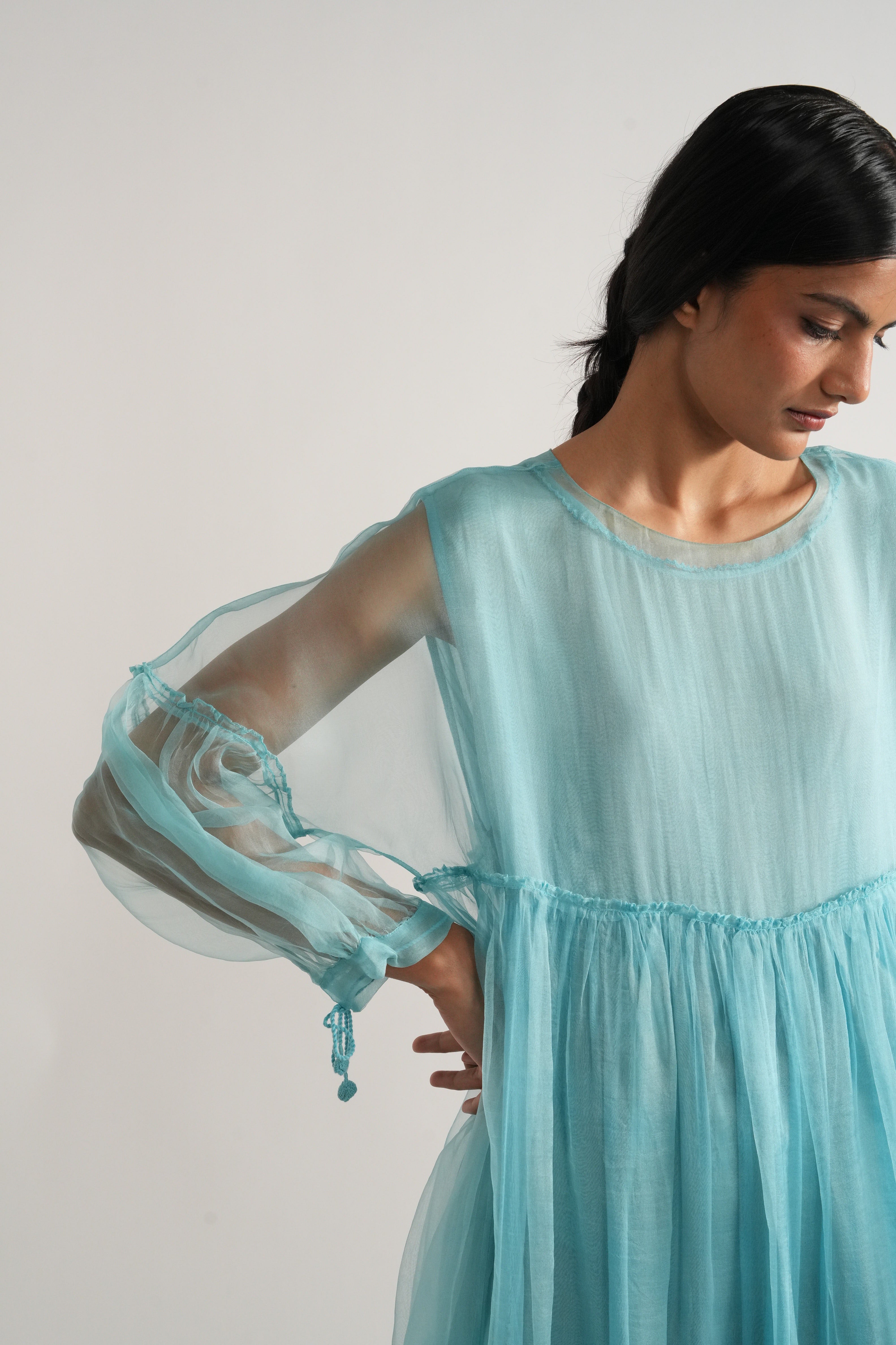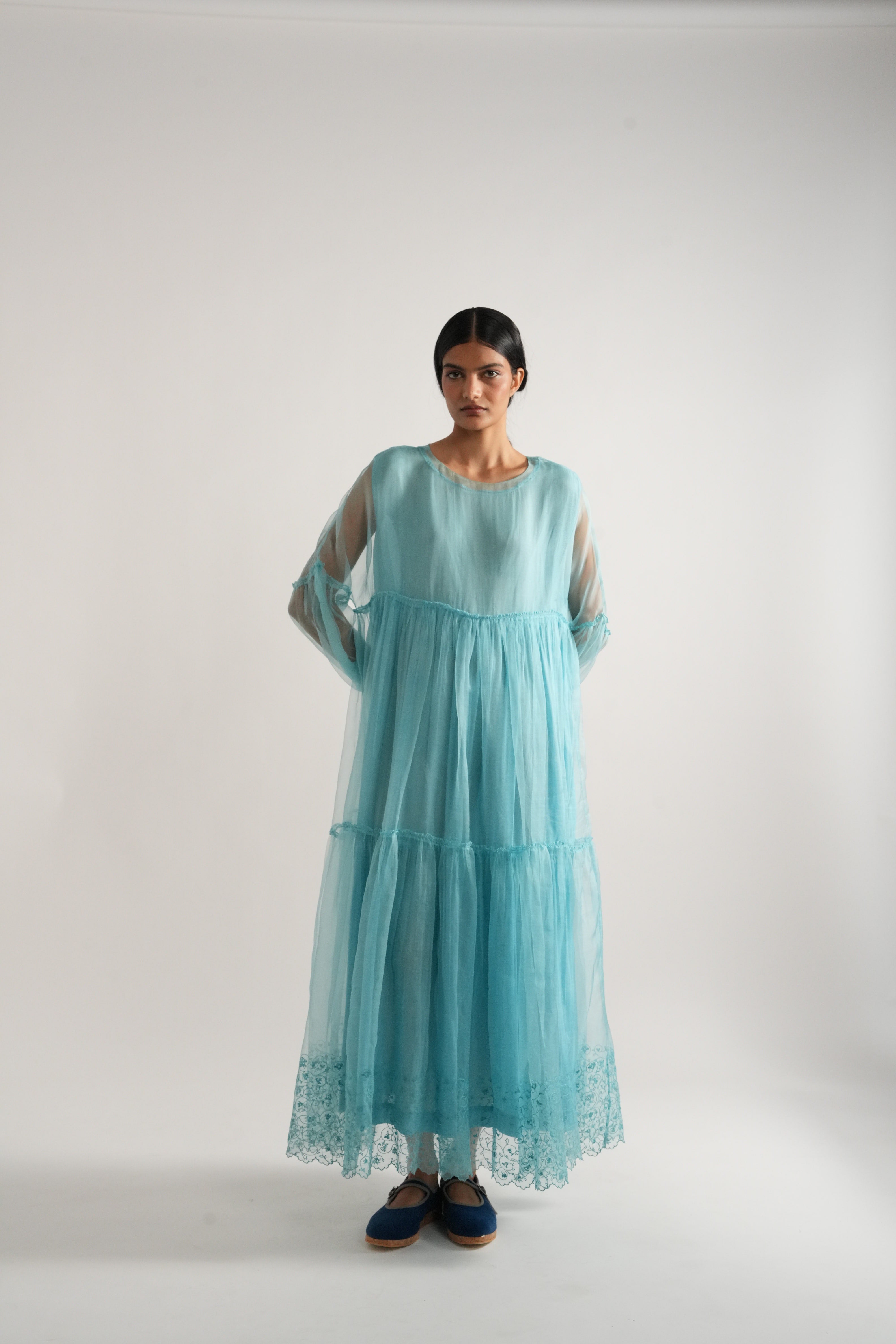 A tiered and gathered dress in organza with hand embroidery detail at the hem