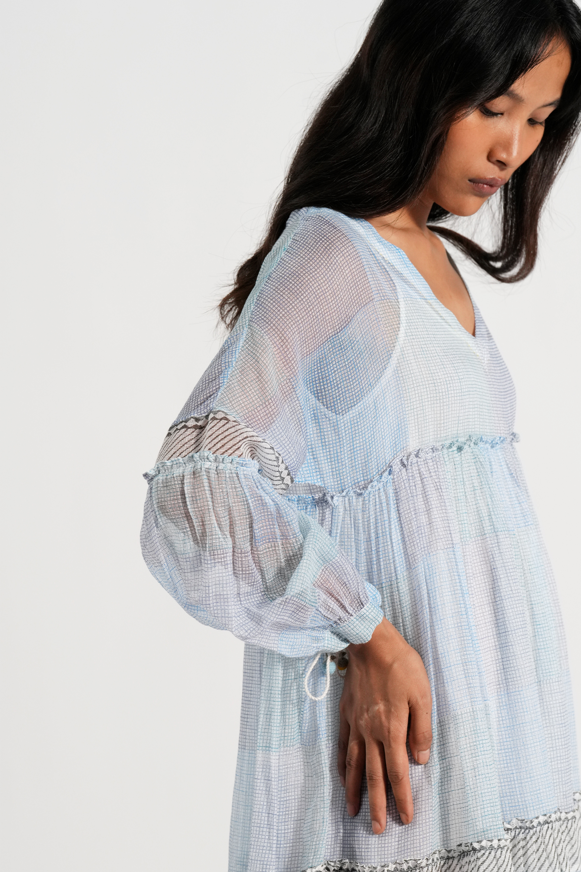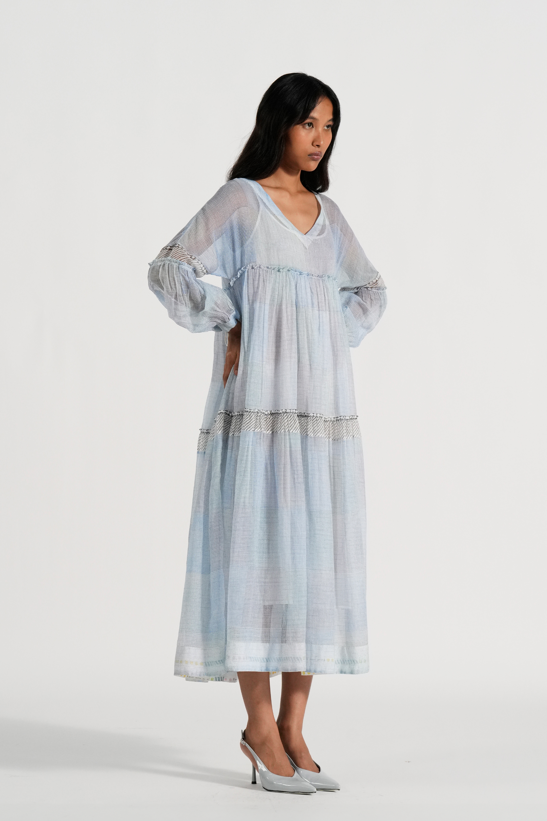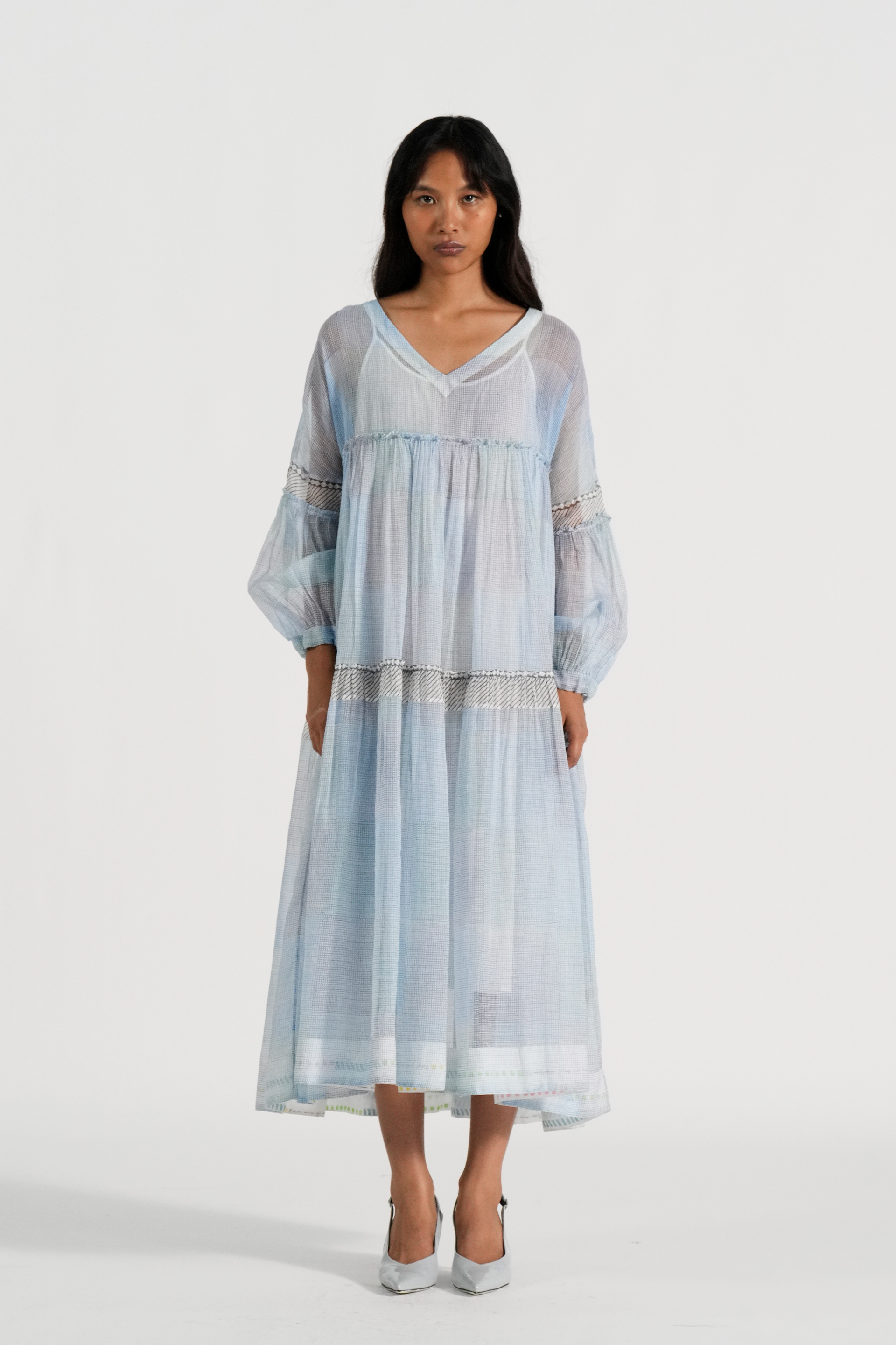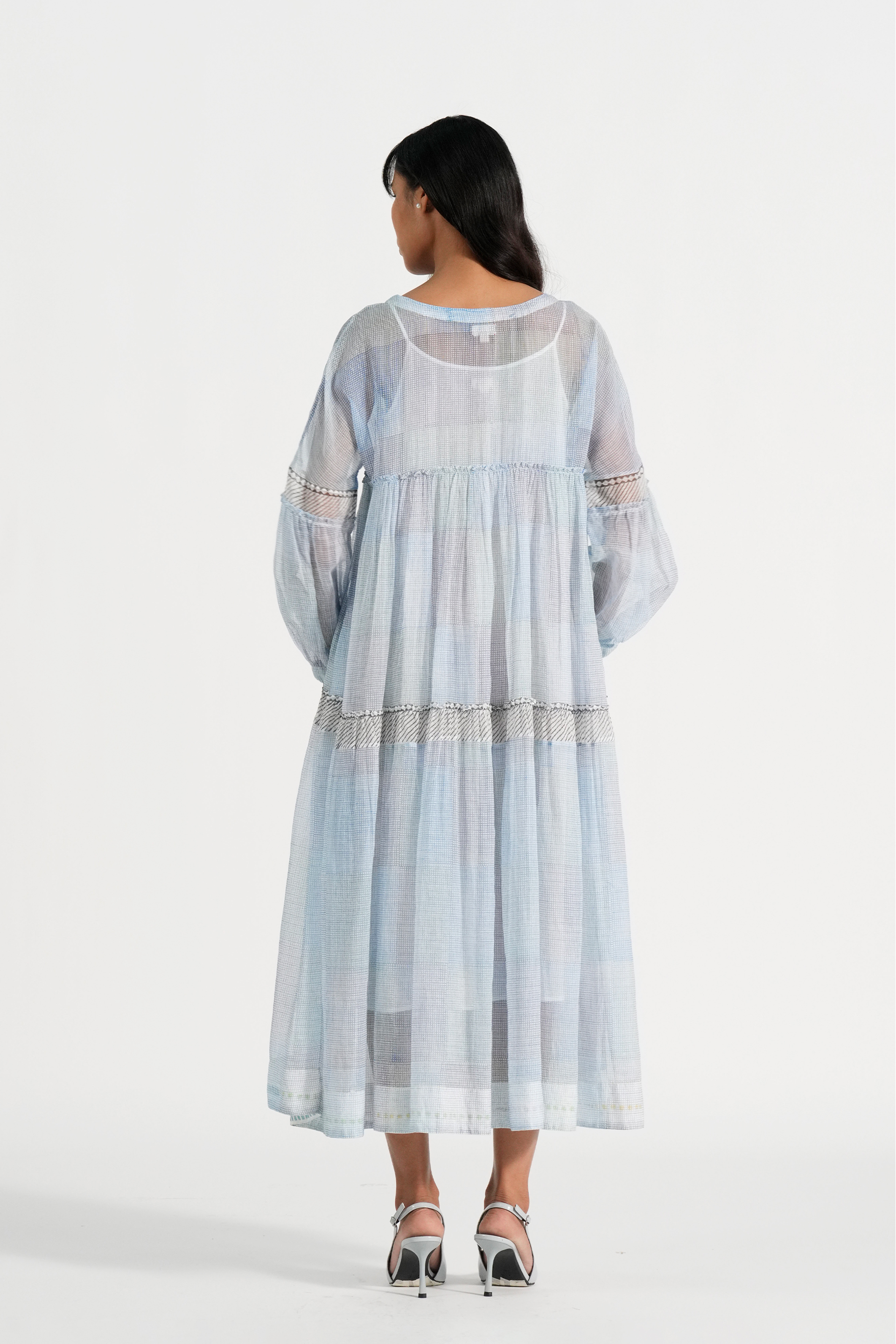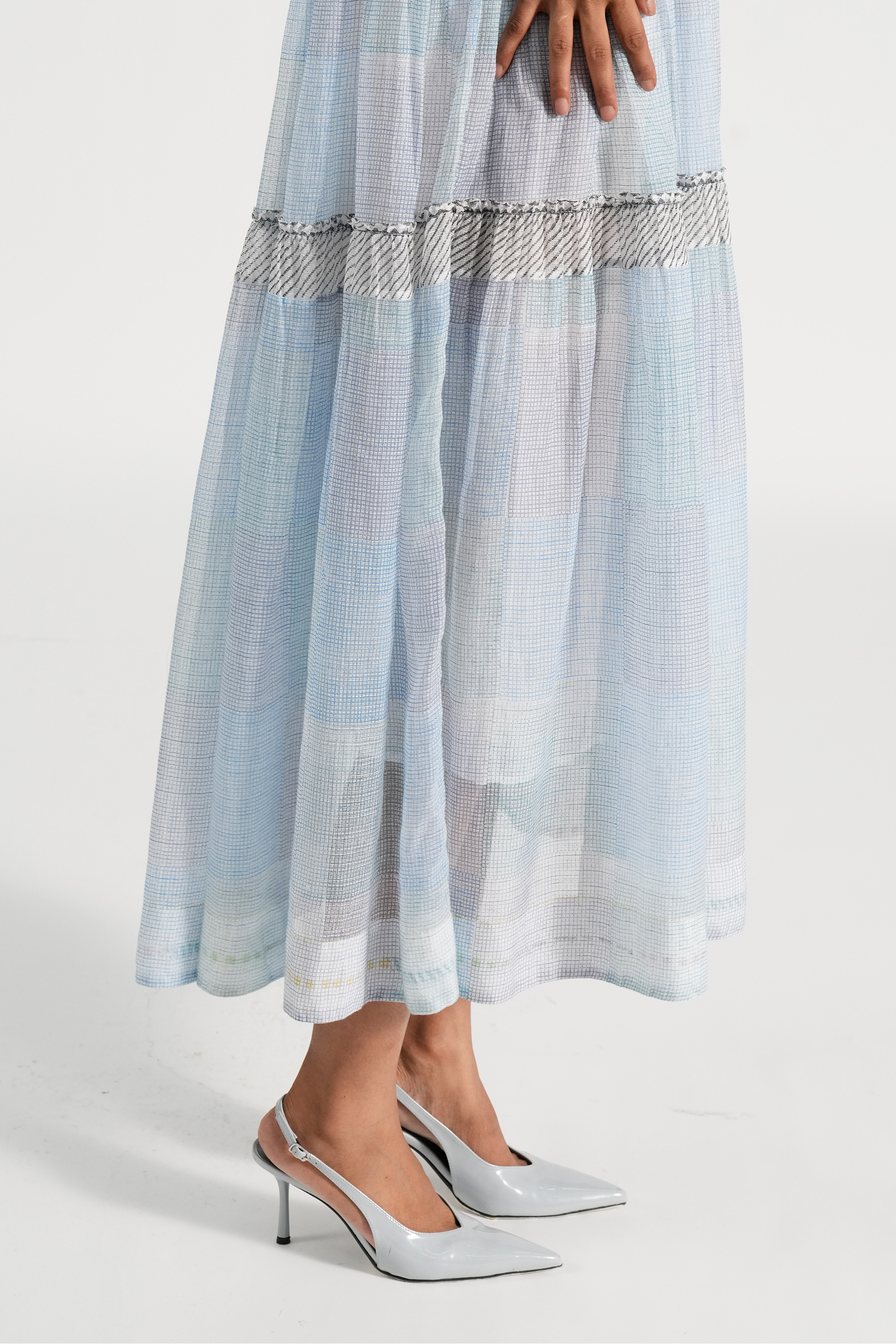 Tiered maxi dress in diagonal hand block printed stripes with crochet berry tassels. Comes with a complimentary lining