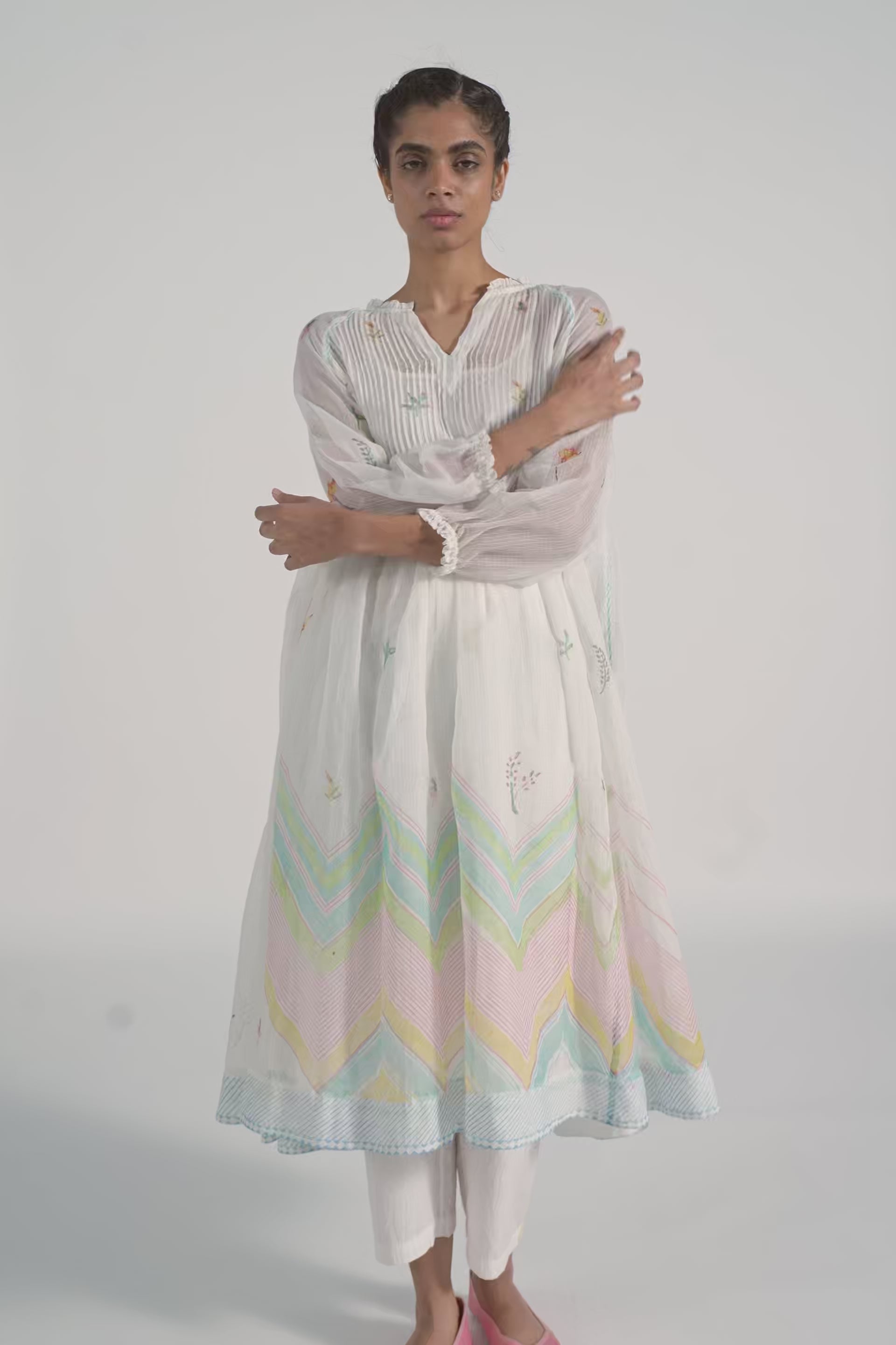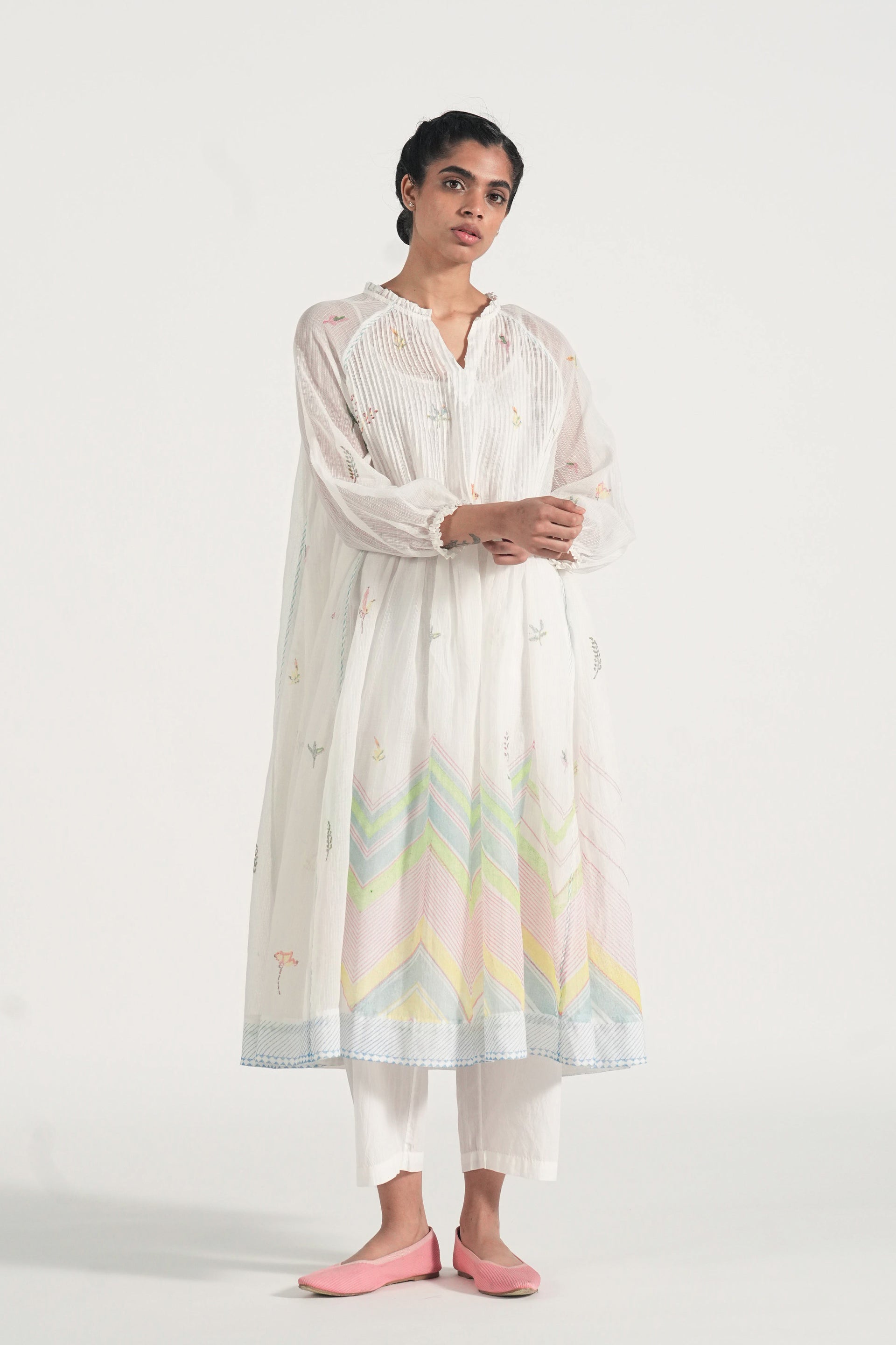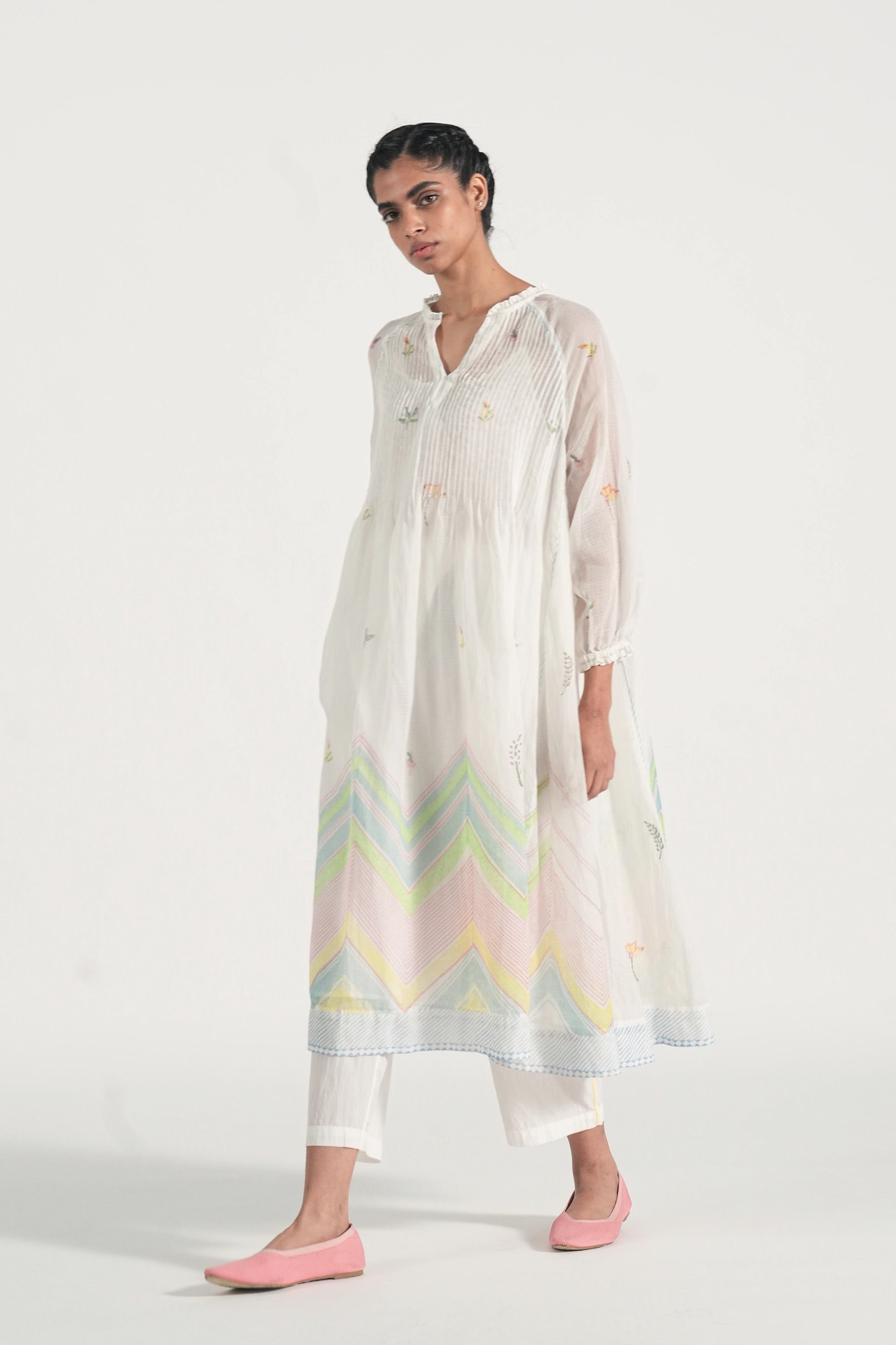 Midi dress with allover pintucks with hand block printed multi chevron print and contrasting binding detail comes with a complimentary lining and pants.