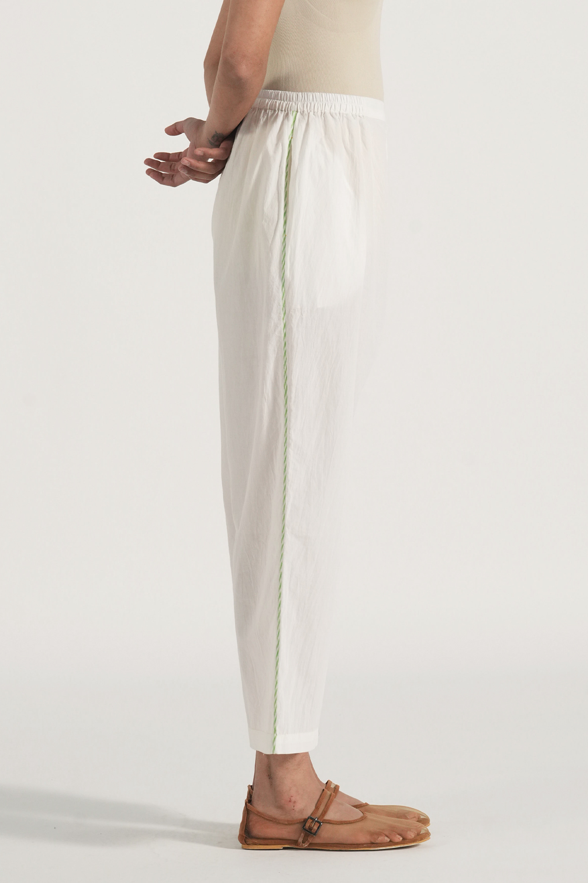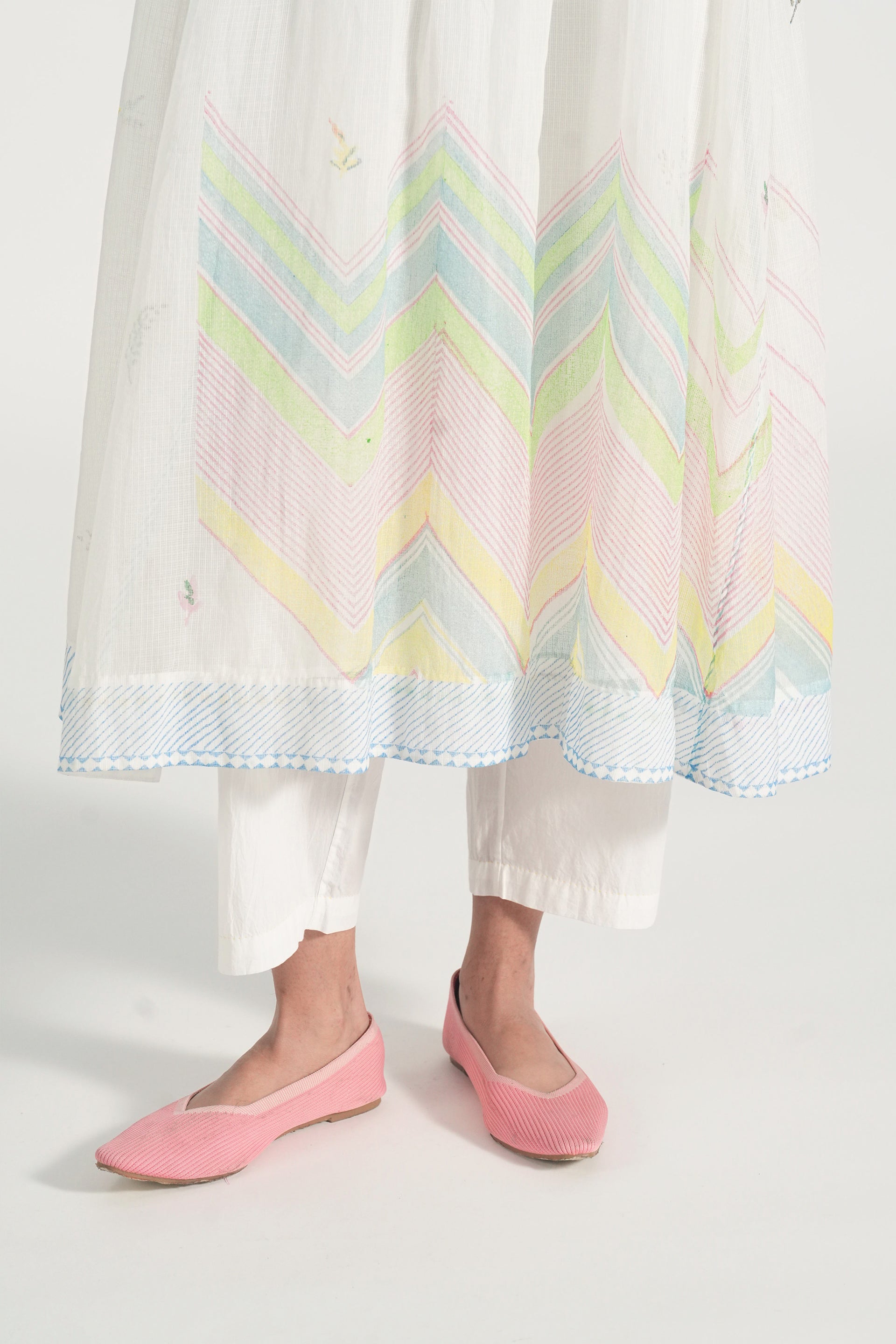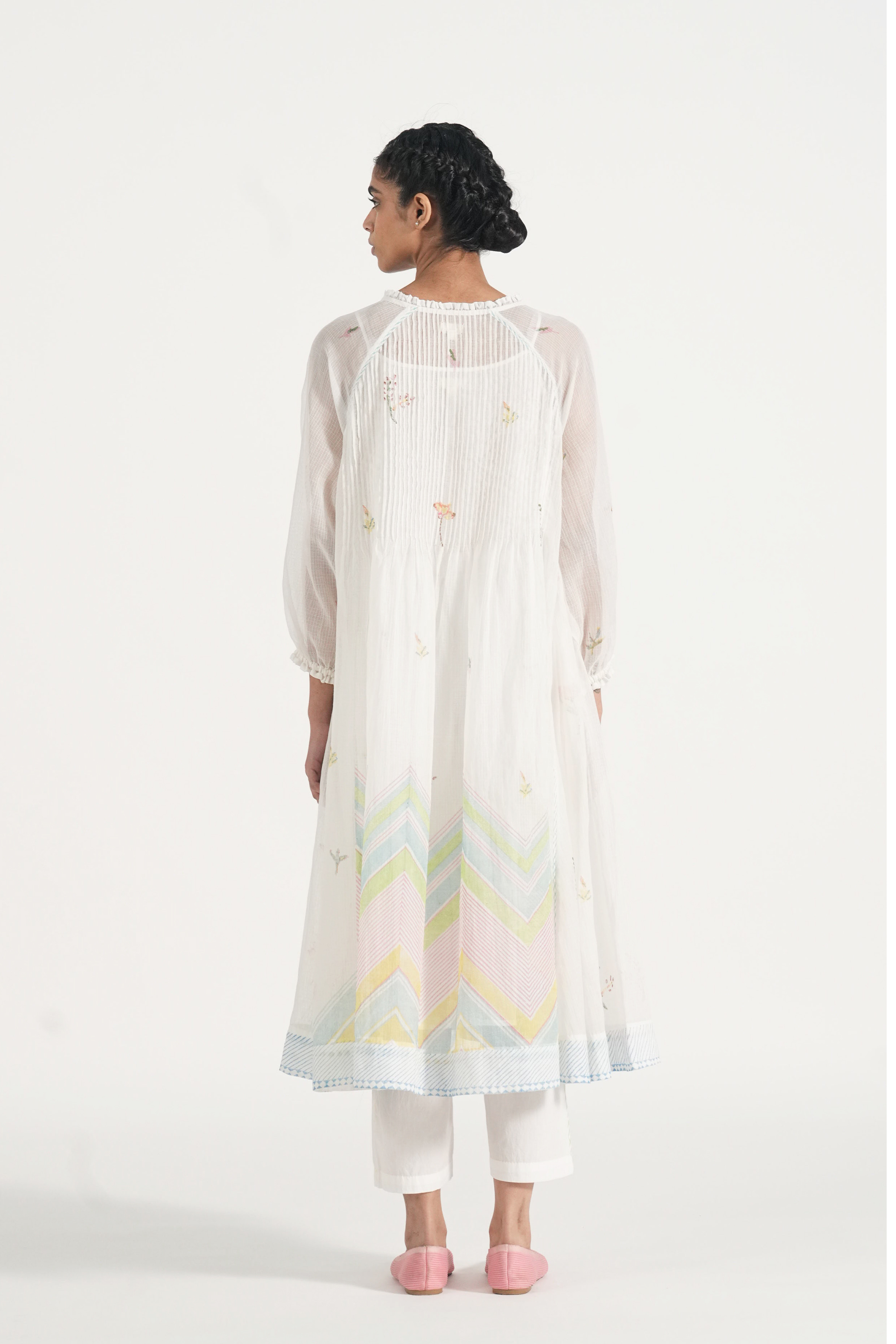 Midi dress with allover pintucks with hand block printed multi chevron print and contrasting binding detail comes with a complimentary lining and pants.