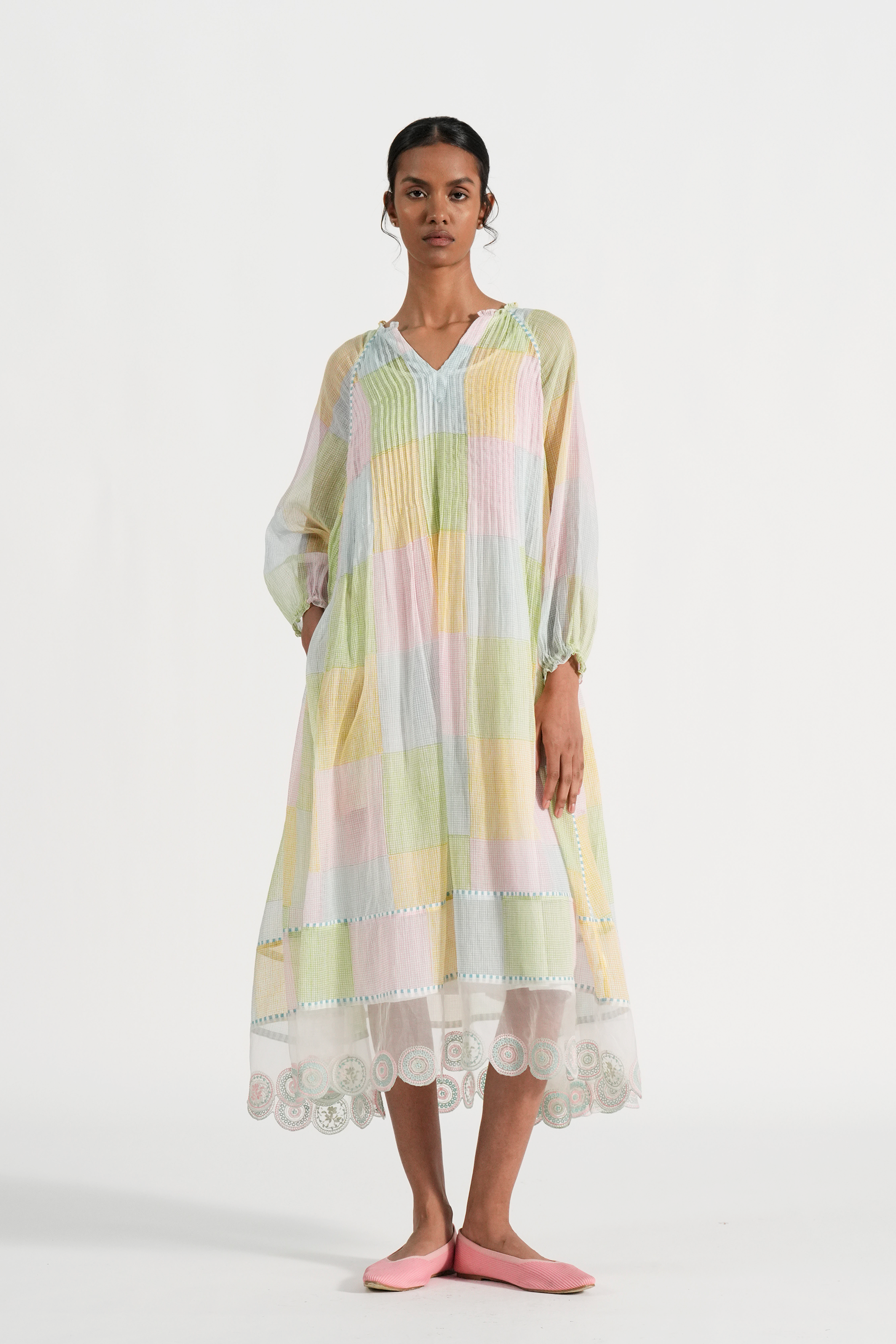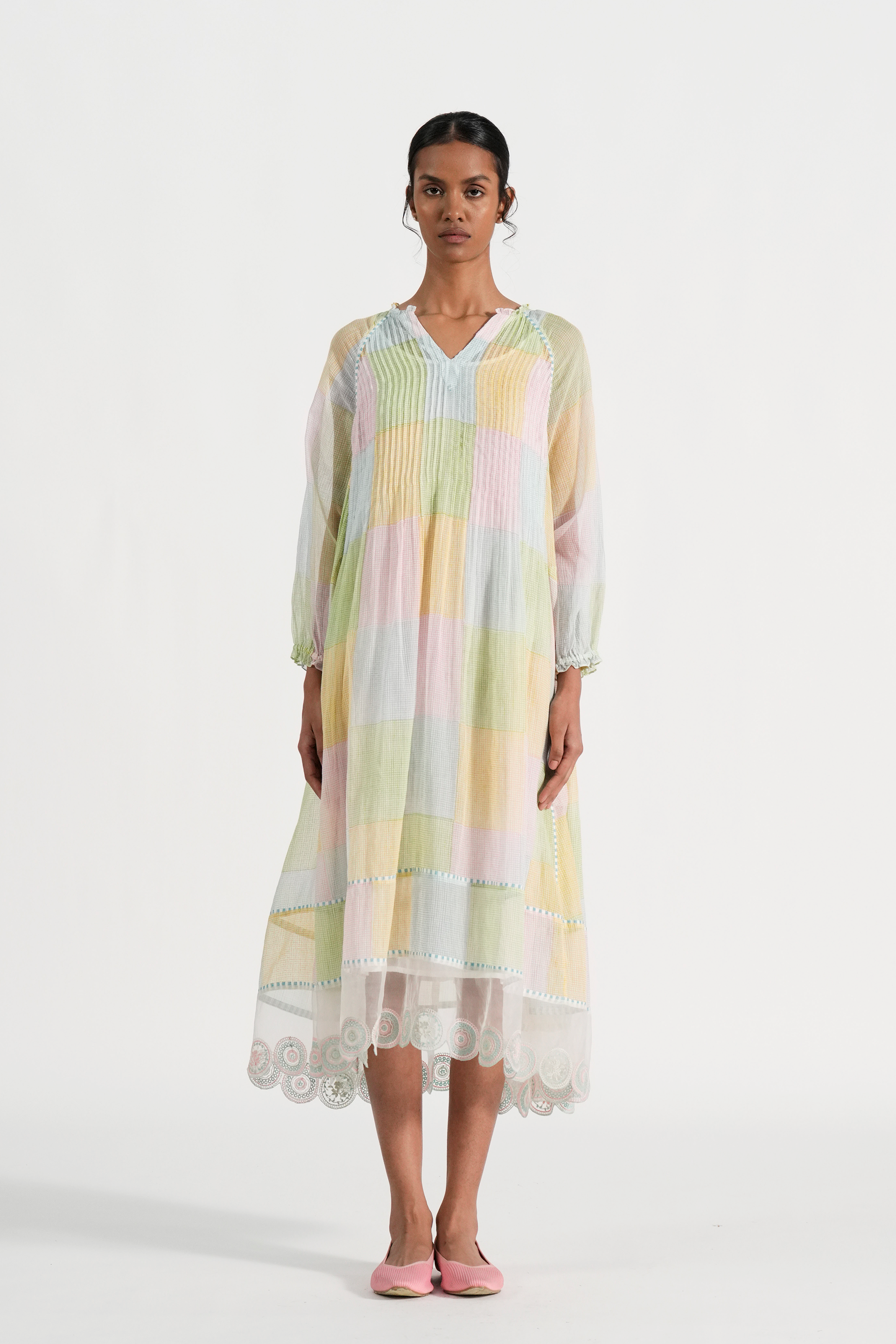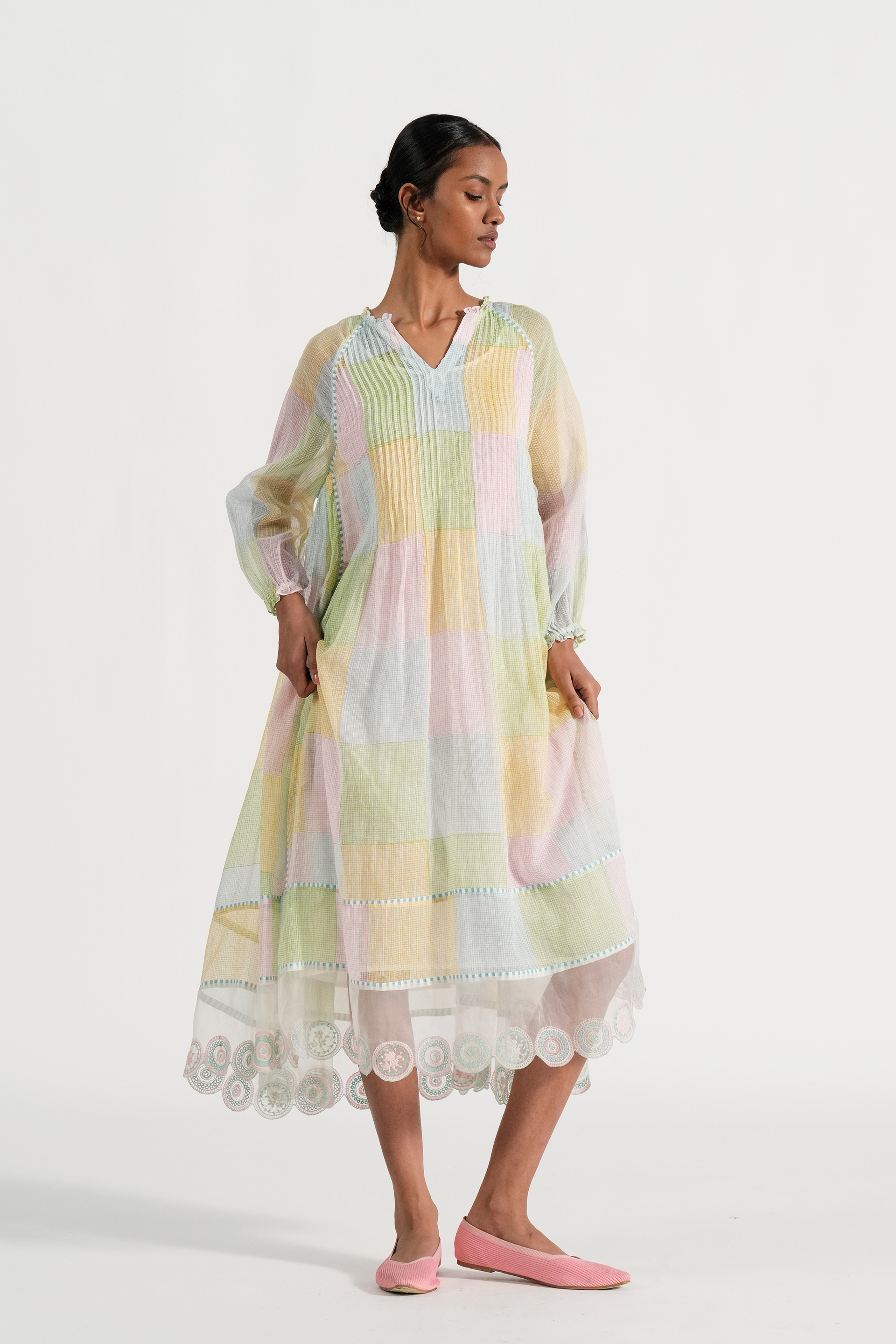 Midi dress with allover pintucks with hand block printed multicolor check- print and contrasting binding detail comes with a complimentary lining.