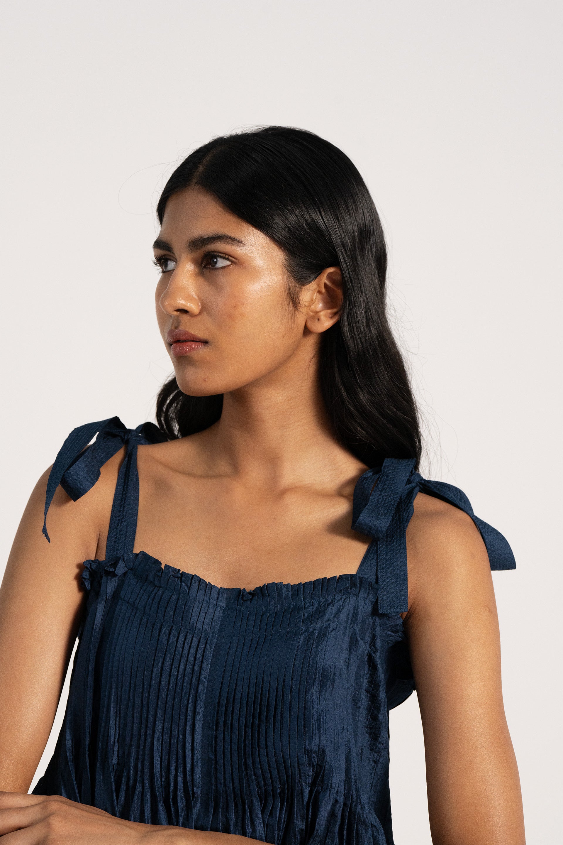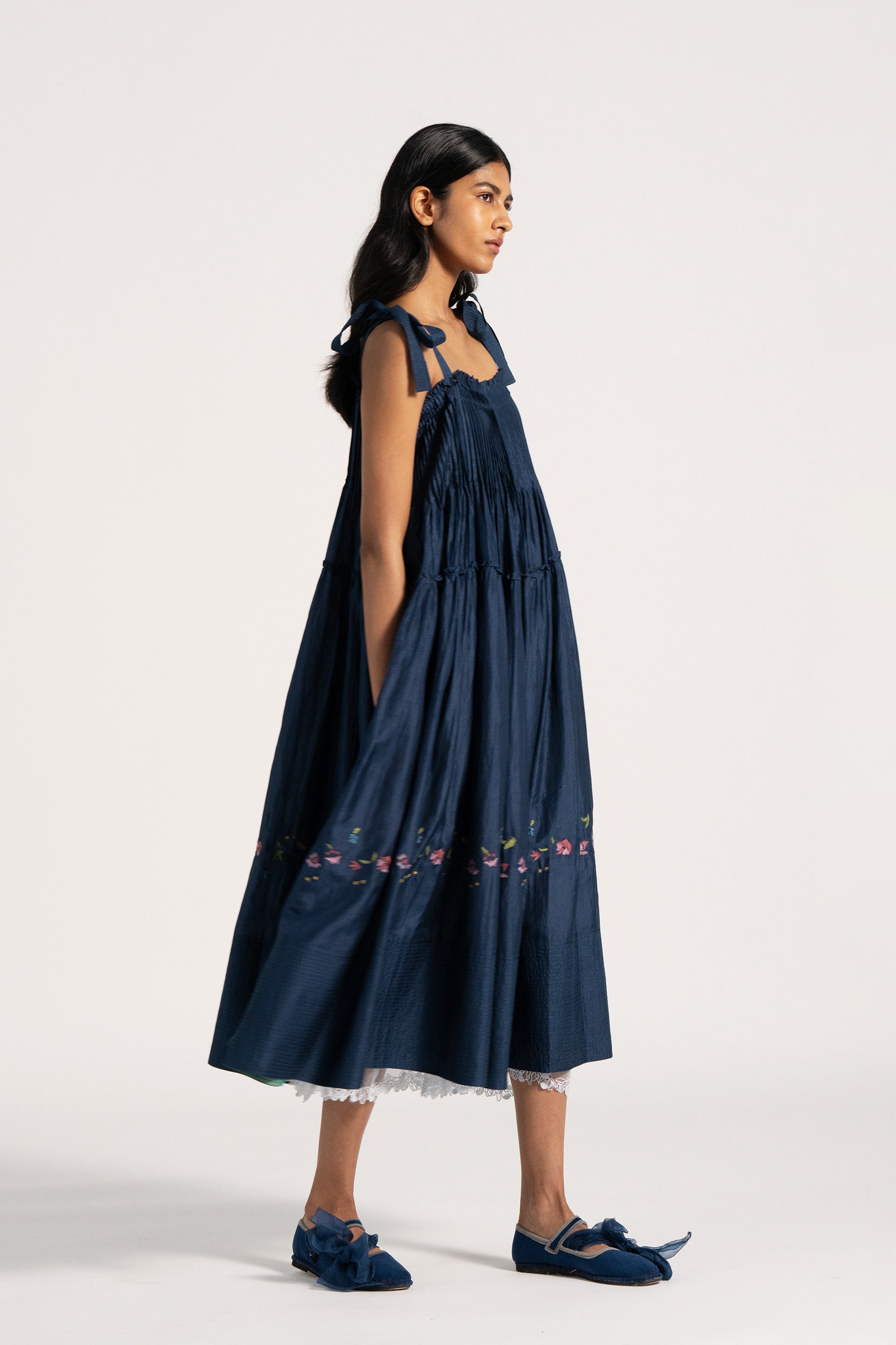All over pintuck detail dress with tie-up straps in 100% silk and scatter multicolor floral embroidery.
