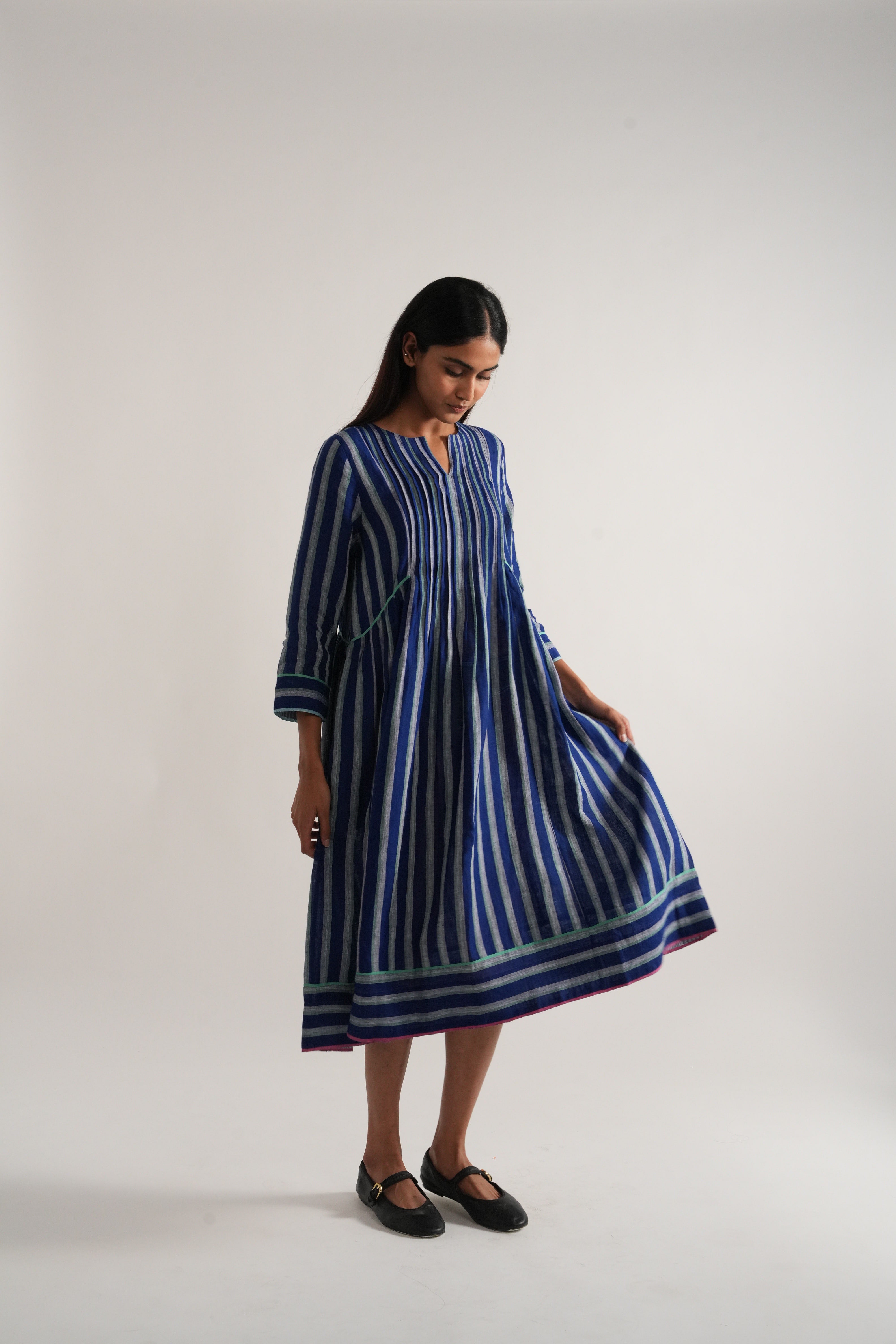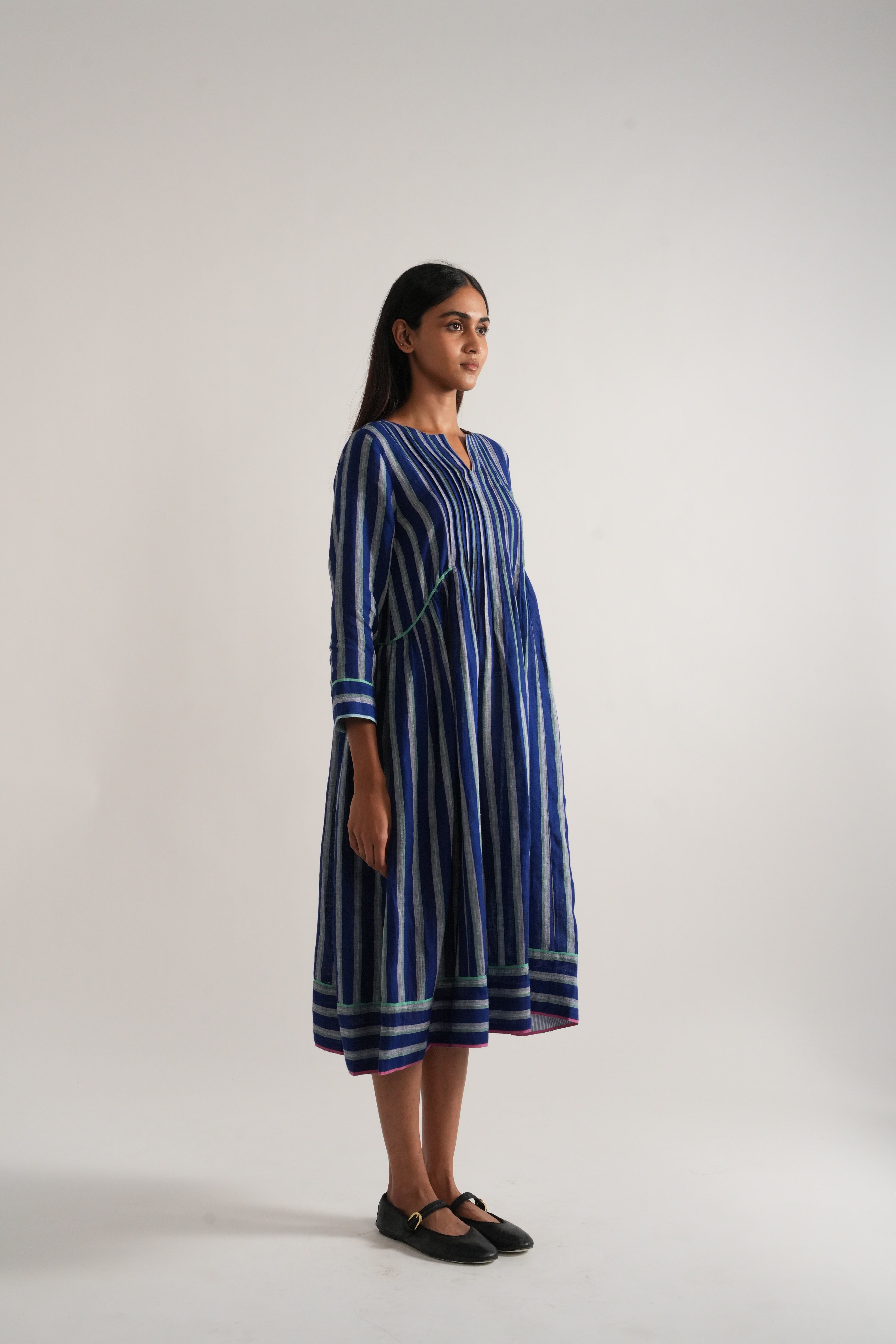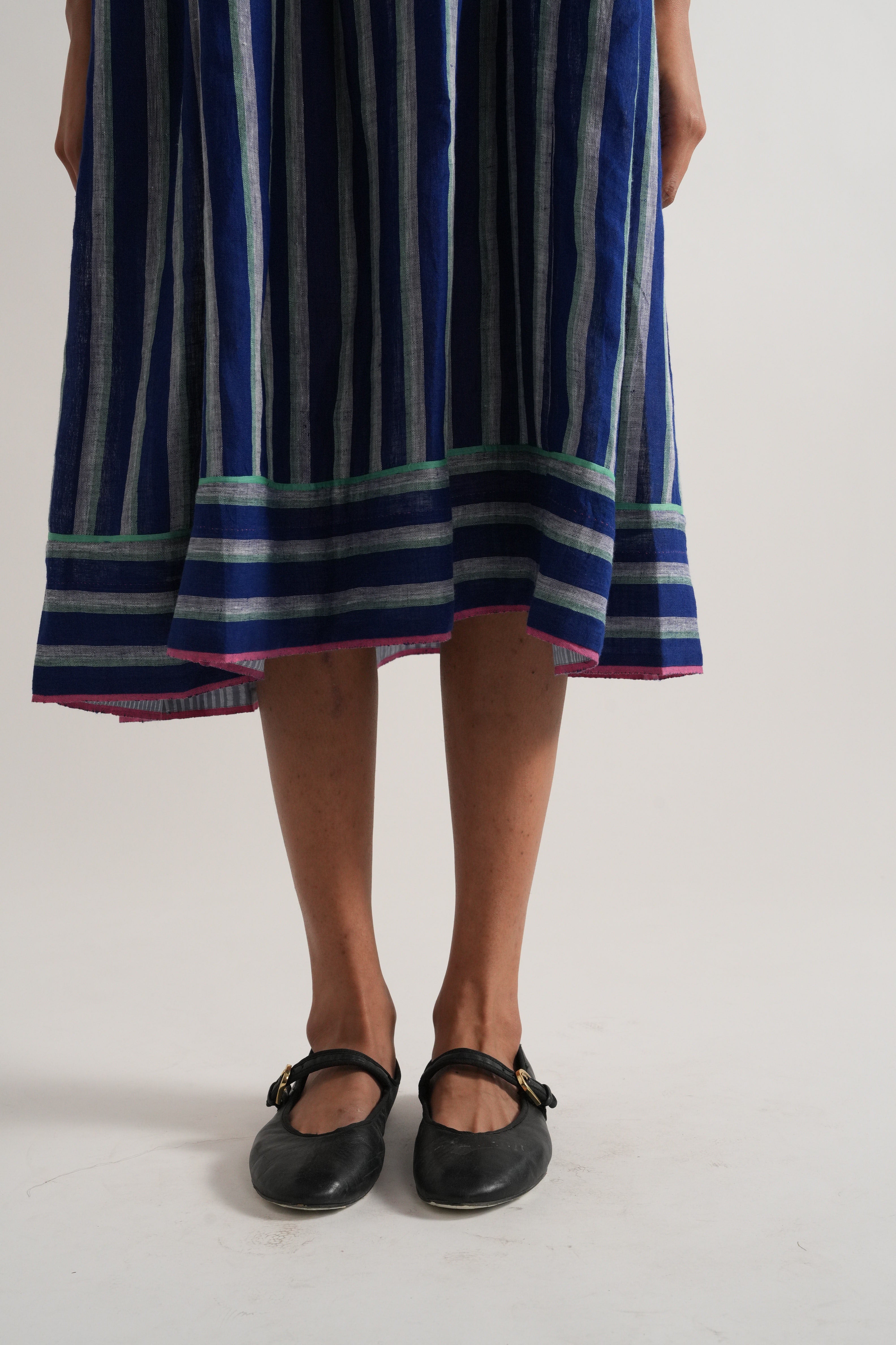 Round neck with centre cut midi length dress in striper yarn dyed linen with contrasting binding detail