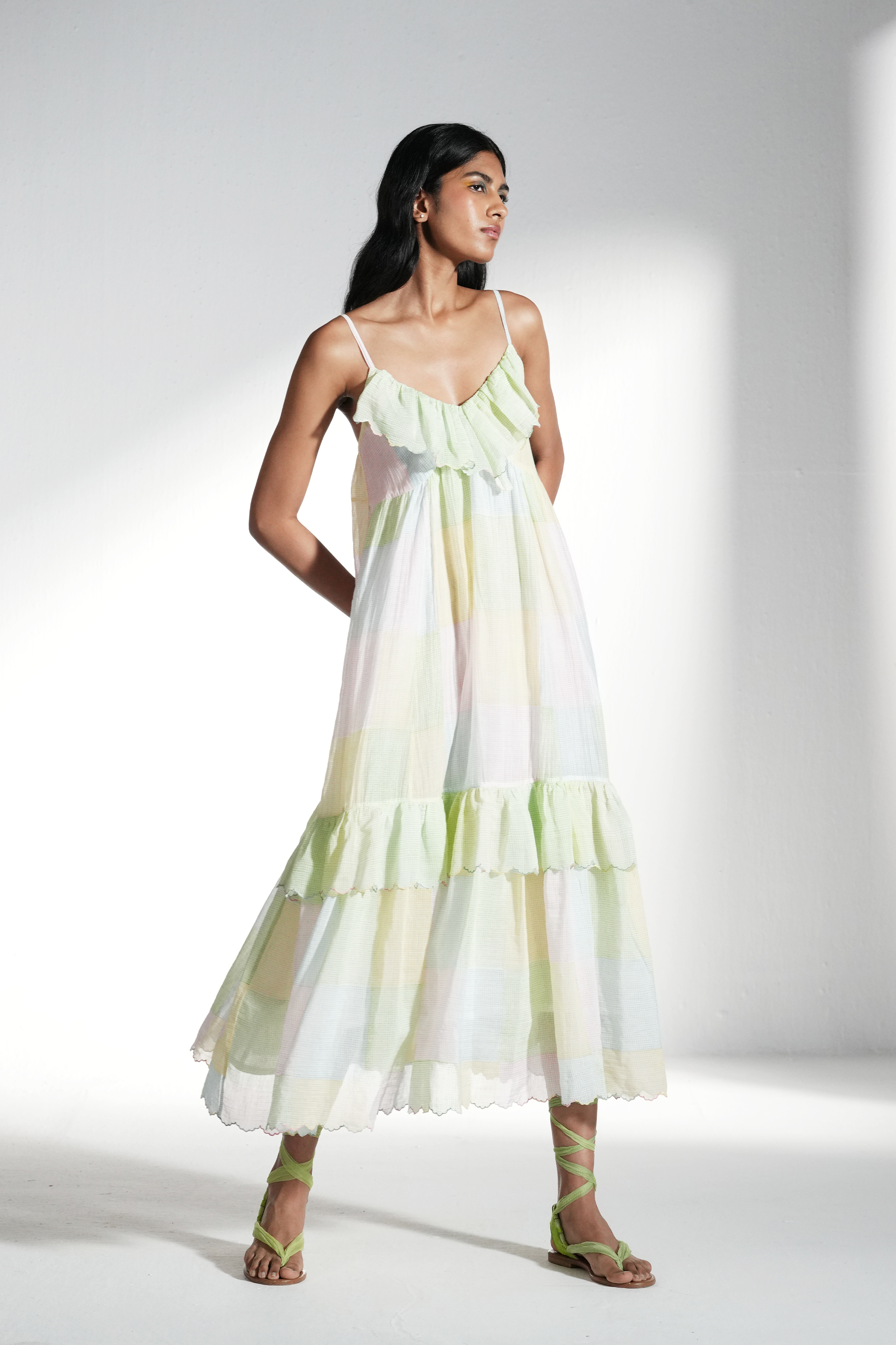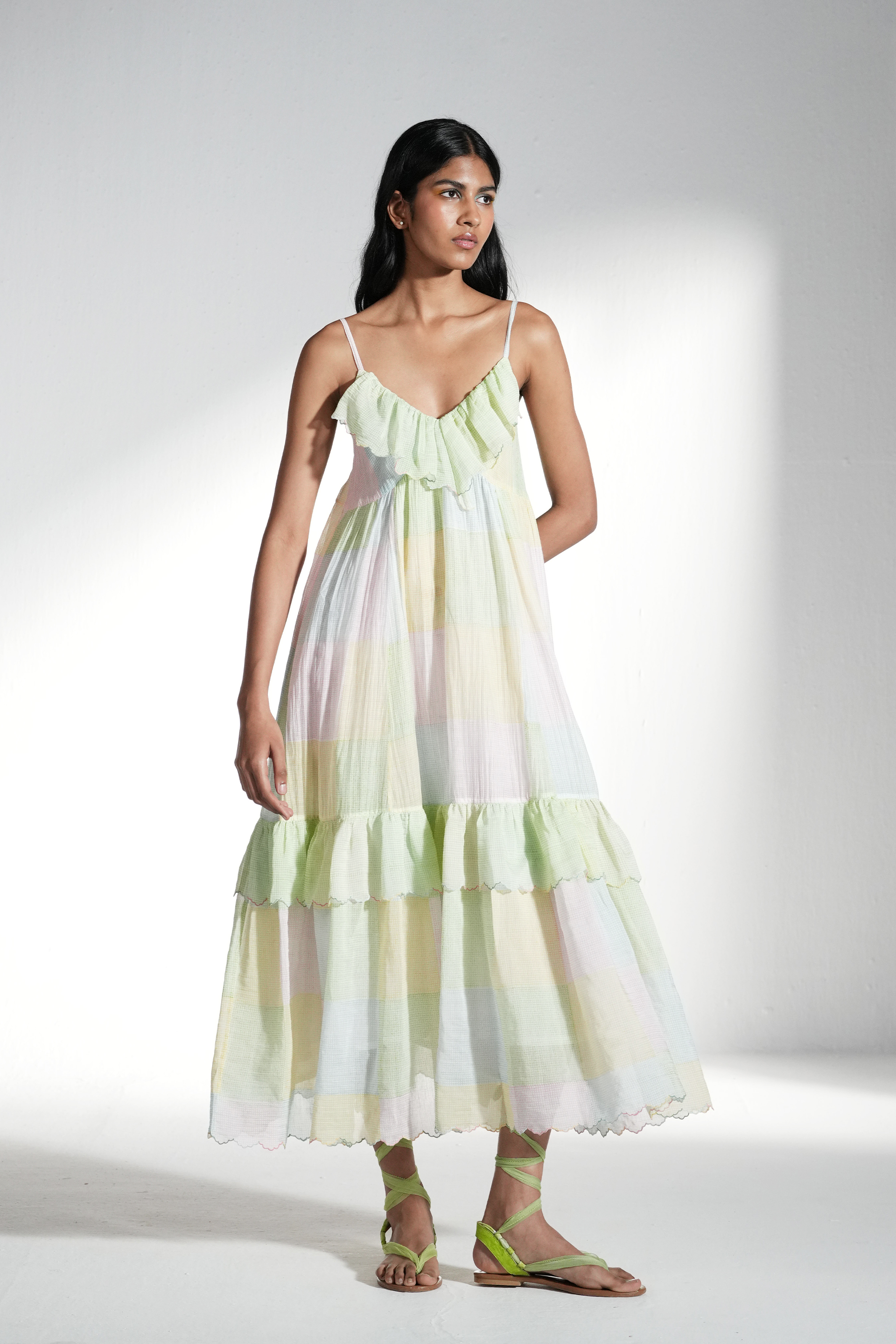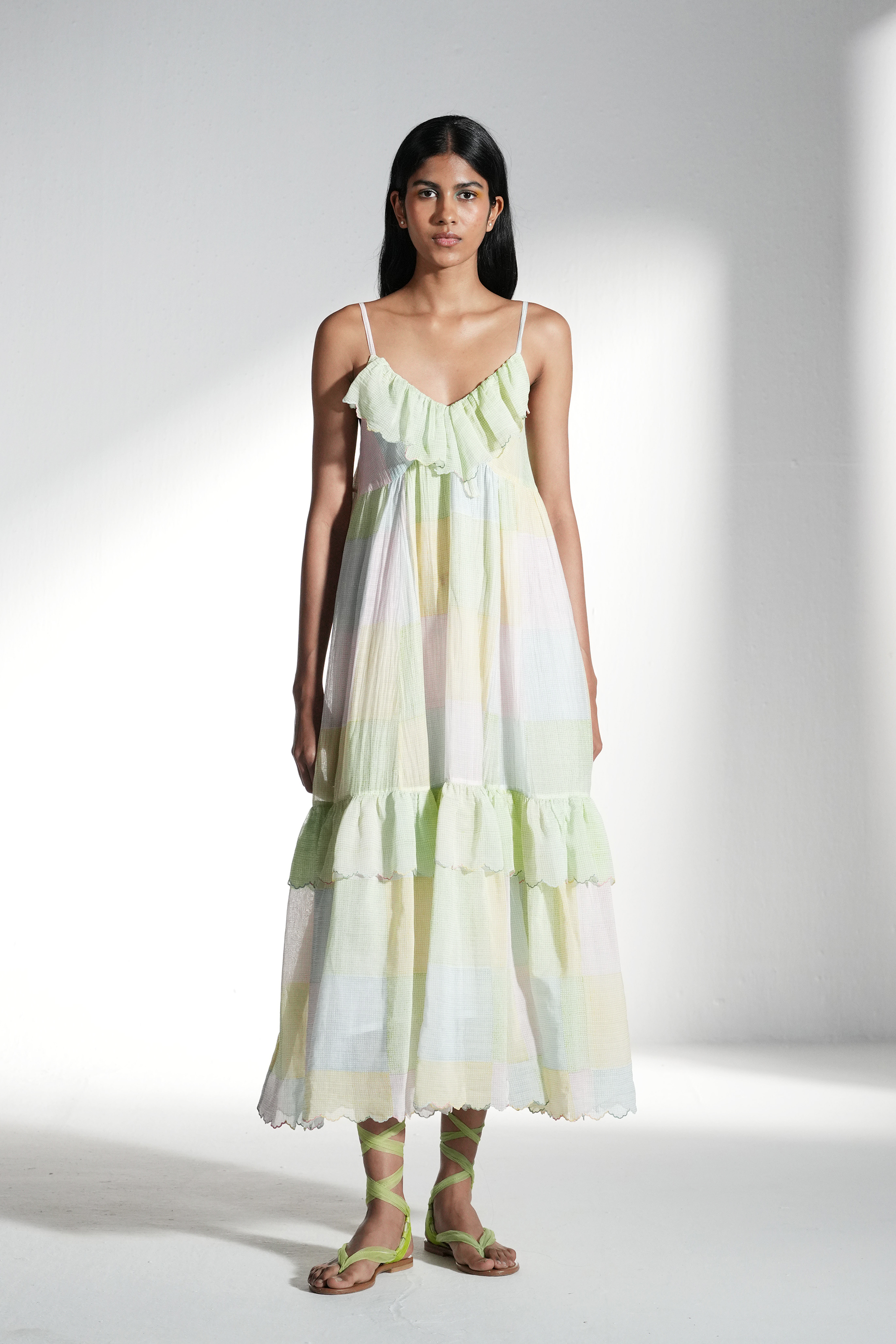 Tier dress with gathersand ruffled embroidery inserts. Multicolor collage print. Lined with printed co silk..