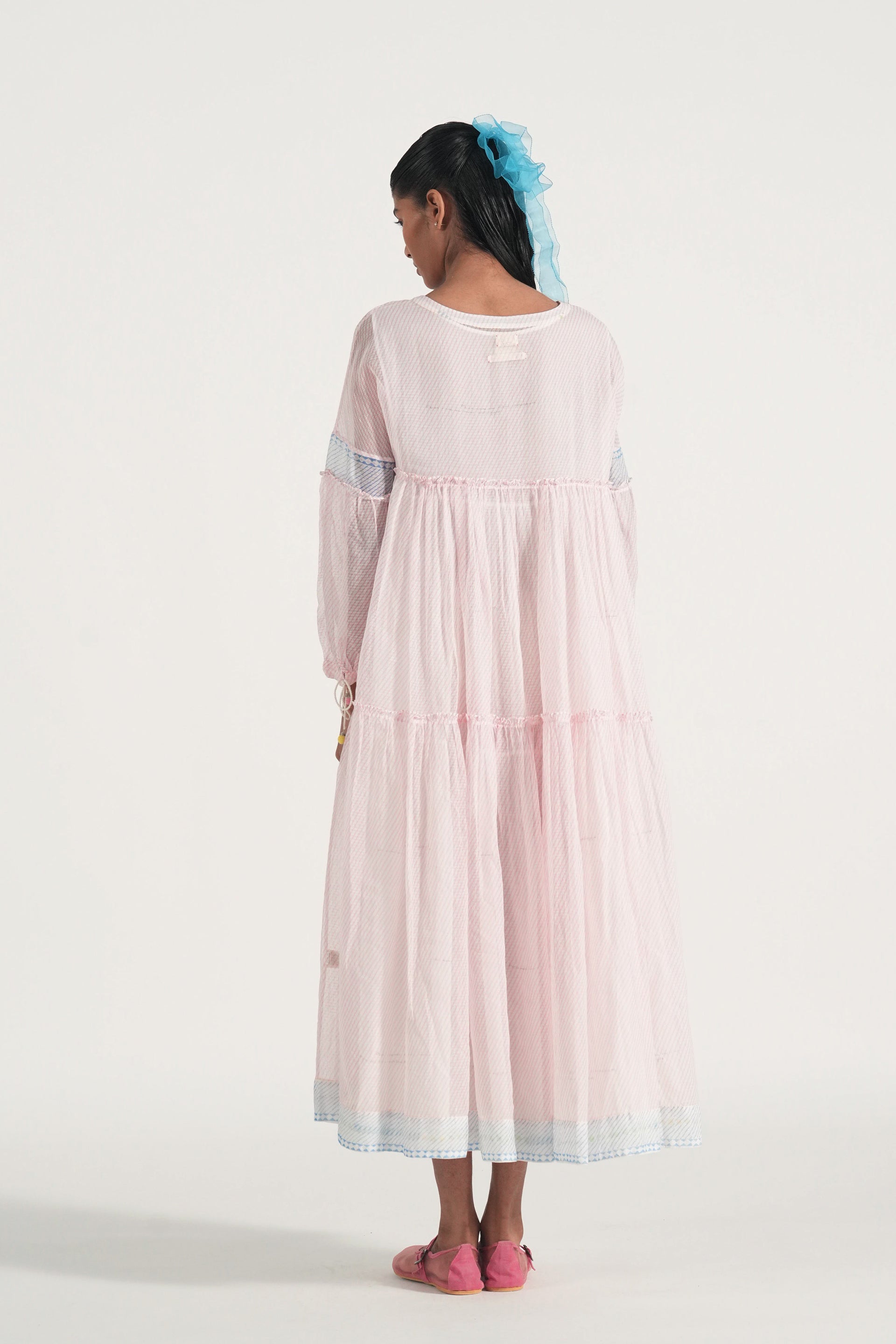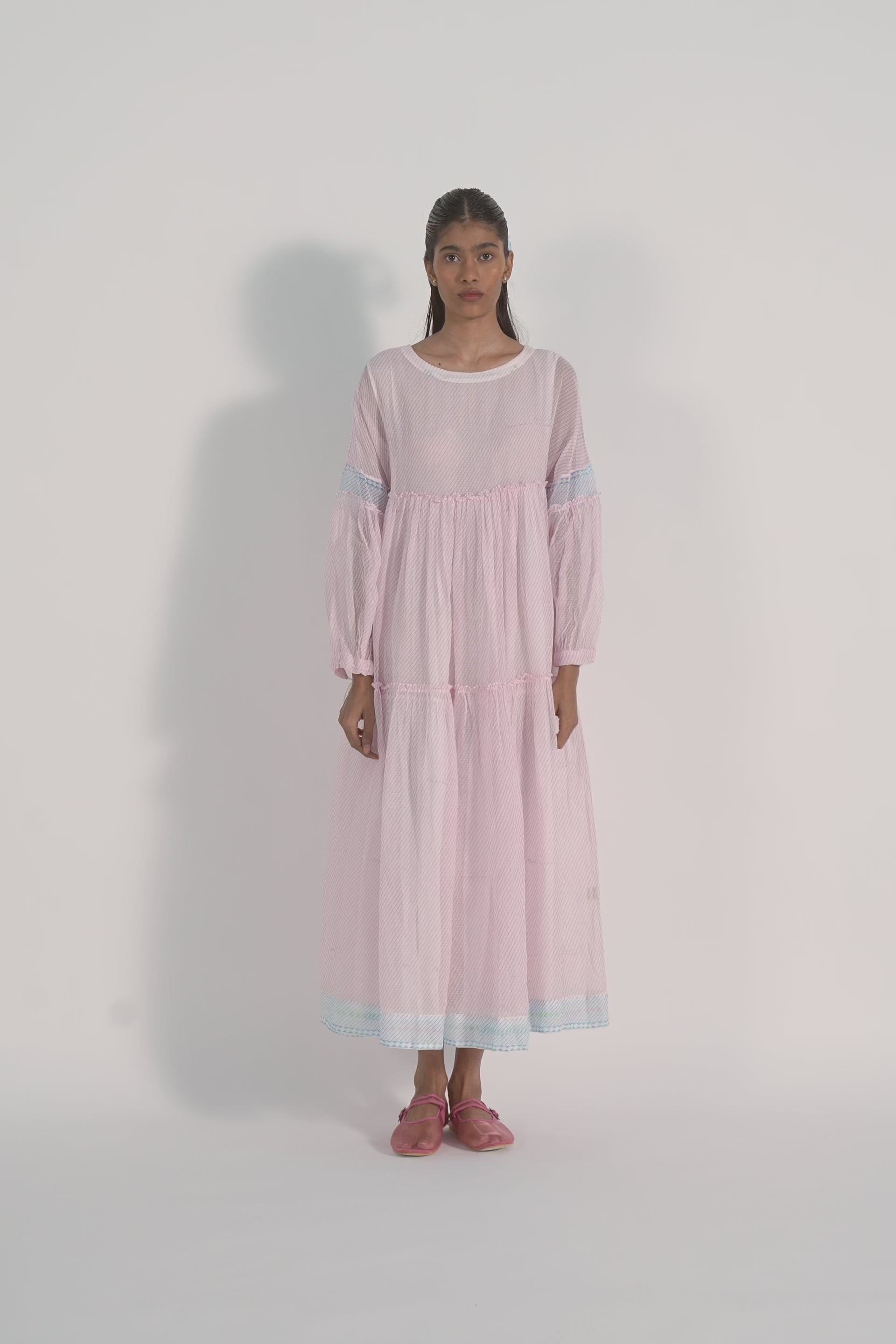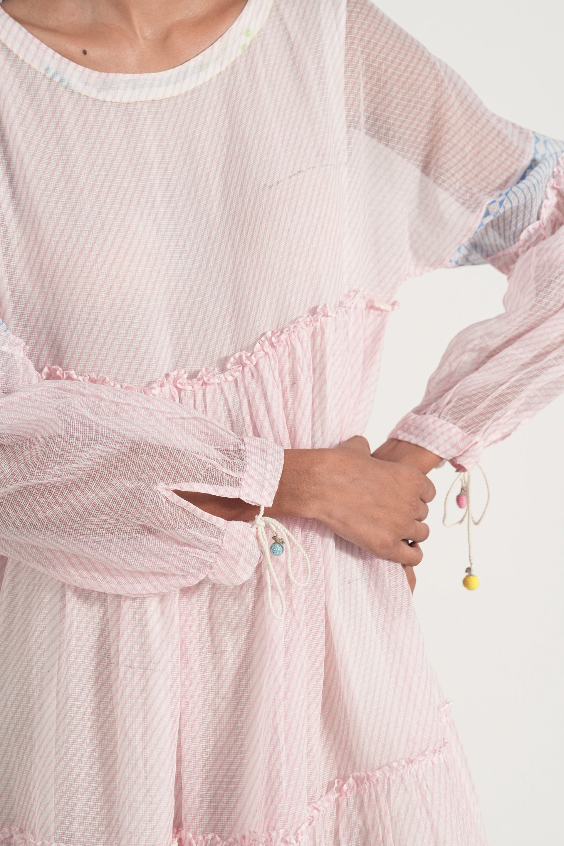 Tiered maxi dress in diagonal hand block printed stripes with crochet berry tassels. Comes with a complimentary lining.