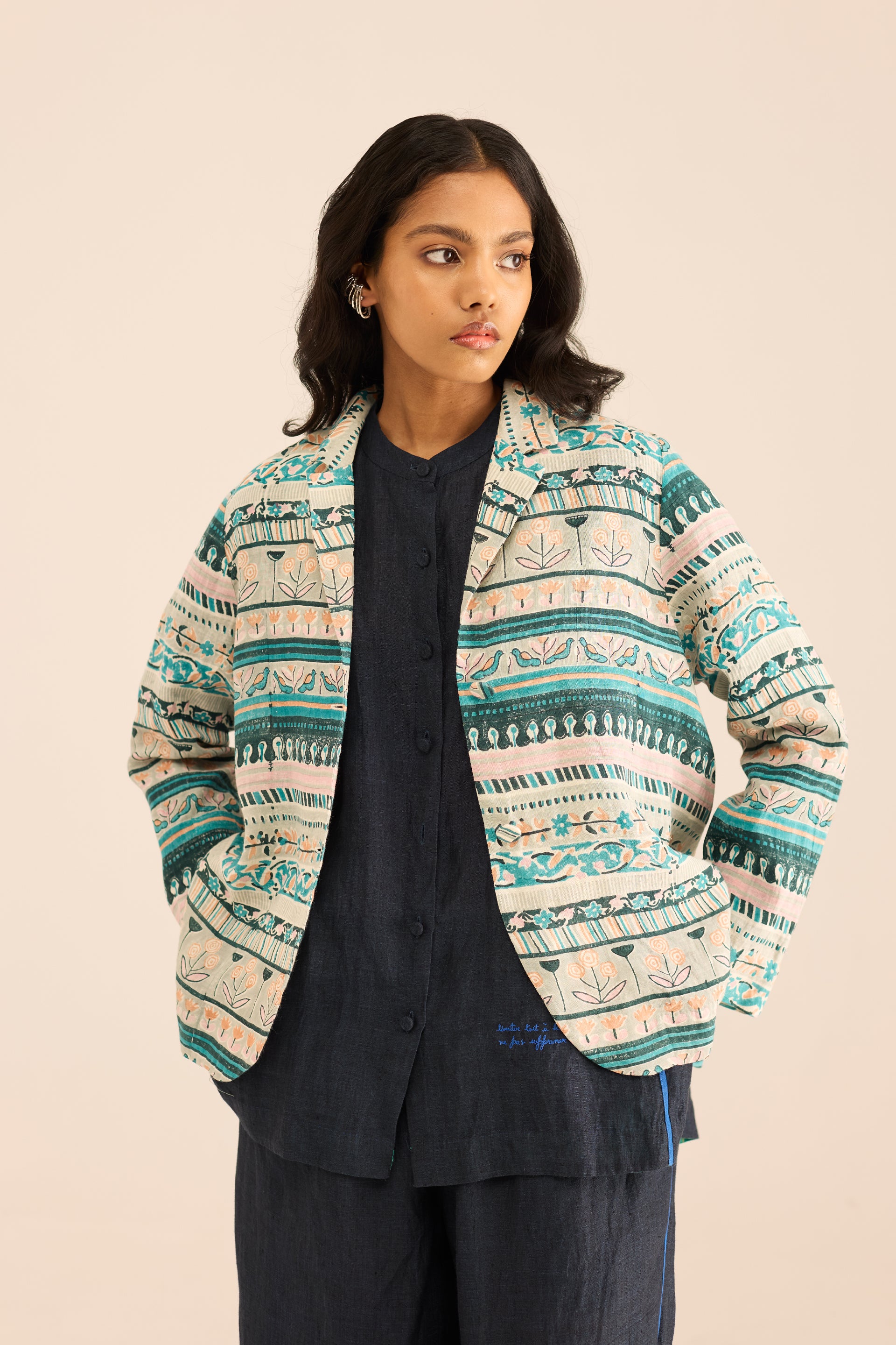A short jacket with a notch collar and a curved-edge placket detail, made from 100% linen fabric. The piece features a vibrant multicolor handblock print, where 17 distinct hand blocks are carefully combined to form a unique, panelled design.