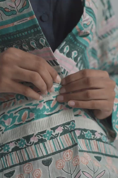 Motifs inspired by the diverse floral elements of Amer were first translated into hand-drawn watercolour paintings. These designs were then meticulously adapted into hand-carved blocks, carefully considering the limitations of the medium. The play with negative-positive space, color separation, and outlining led to both singular motifs and intricate, multi-layered repeats. As many as 80 small and large wooden blocks were used to create pattern repeats for a single garment.