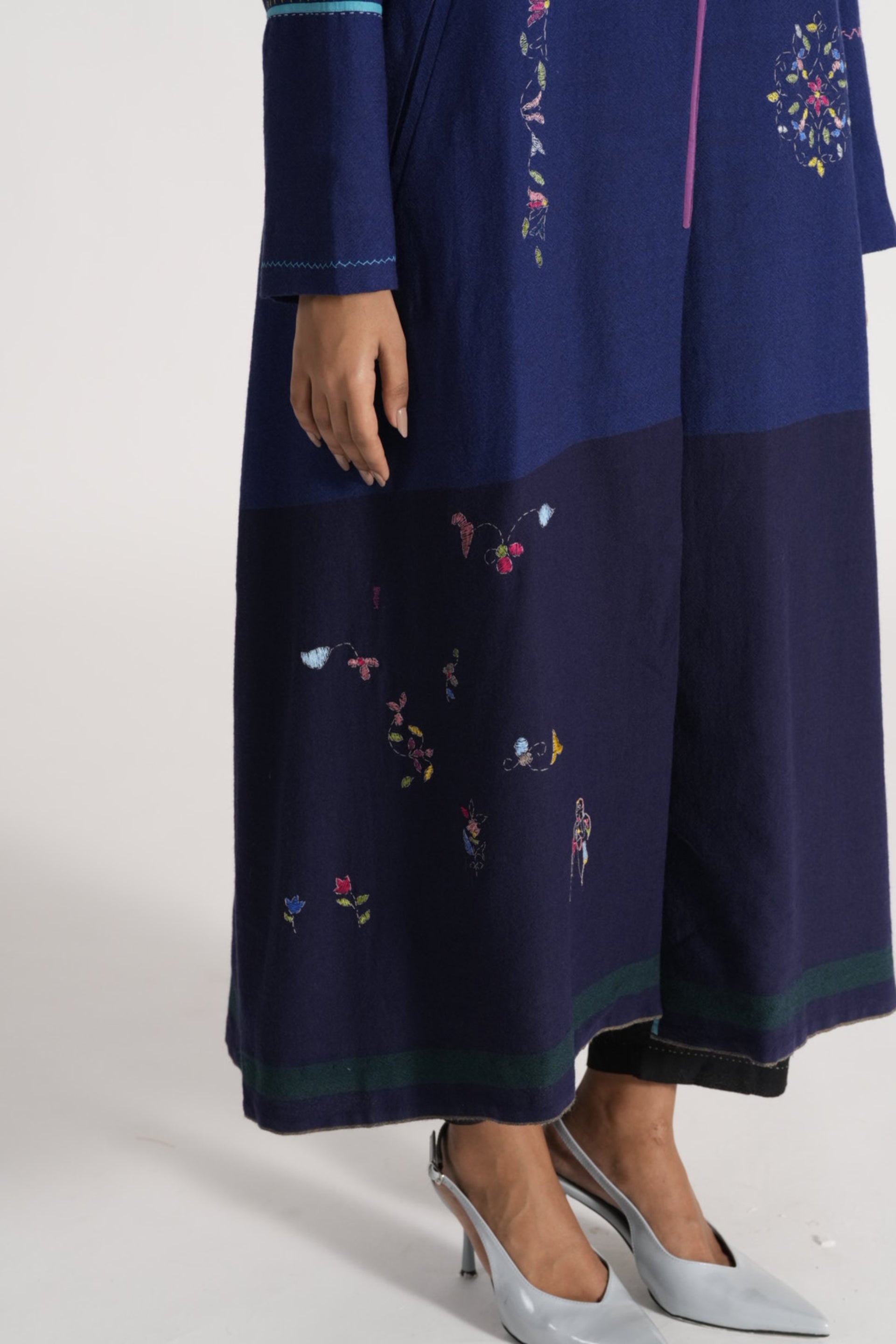 Button Down Straight Fit Long Jacket With Multicolor Delicate Hand Stitch Details And Floral Placement Hand Embroidery On 100% Merino Wool. Lined With Handblock Printed 100% Silk