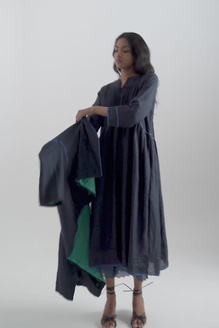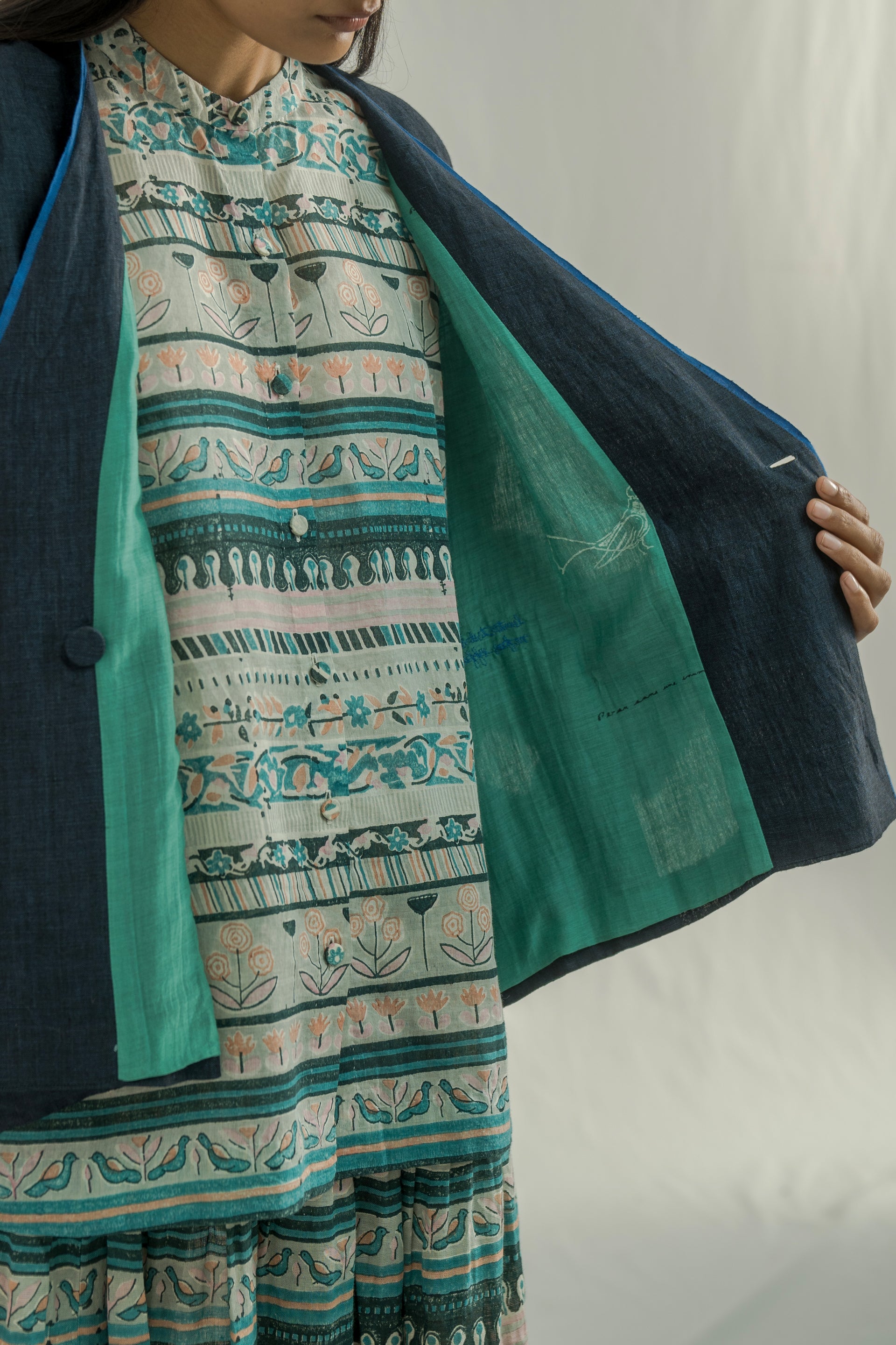 A relaxed-fit, double-breasted V-neck short jacket with a drop shoulder design. It features front pockets, contrast piping along the placket and sleeves. Crafted in 100% linen, having placement handblock printed cotton silk lining.
