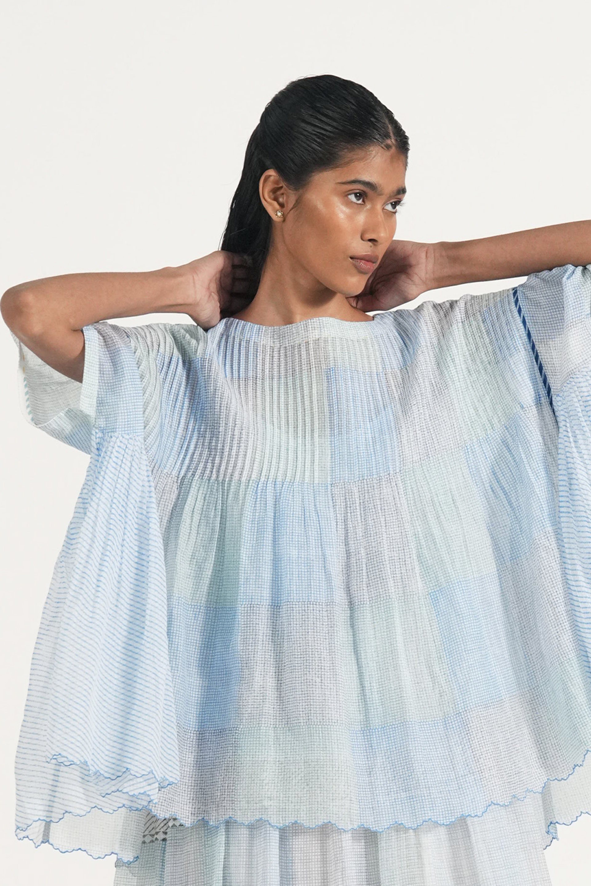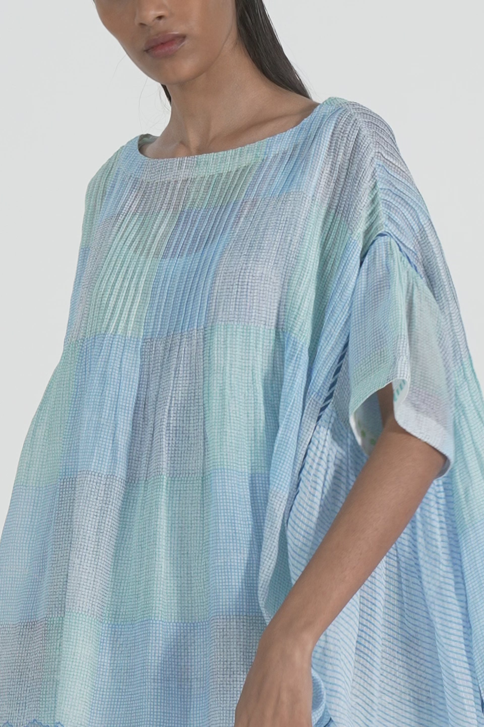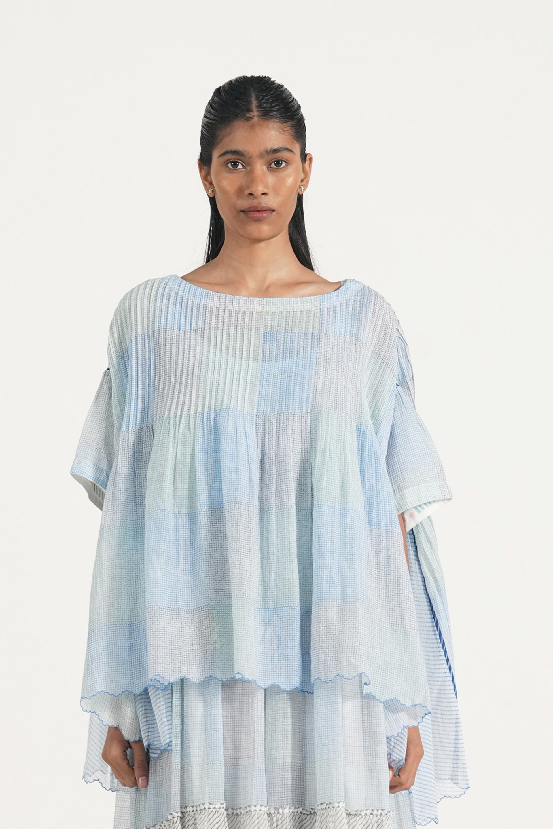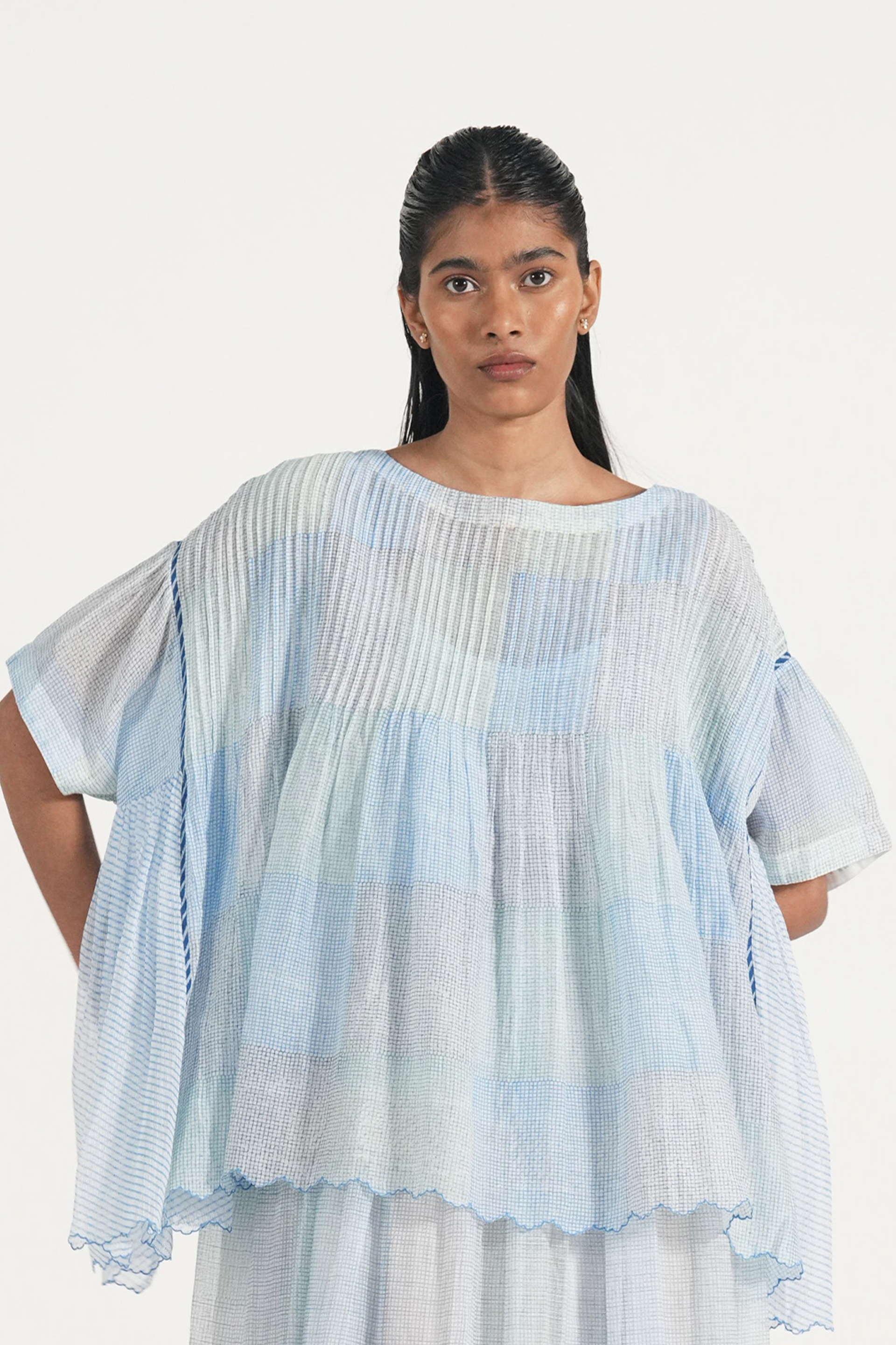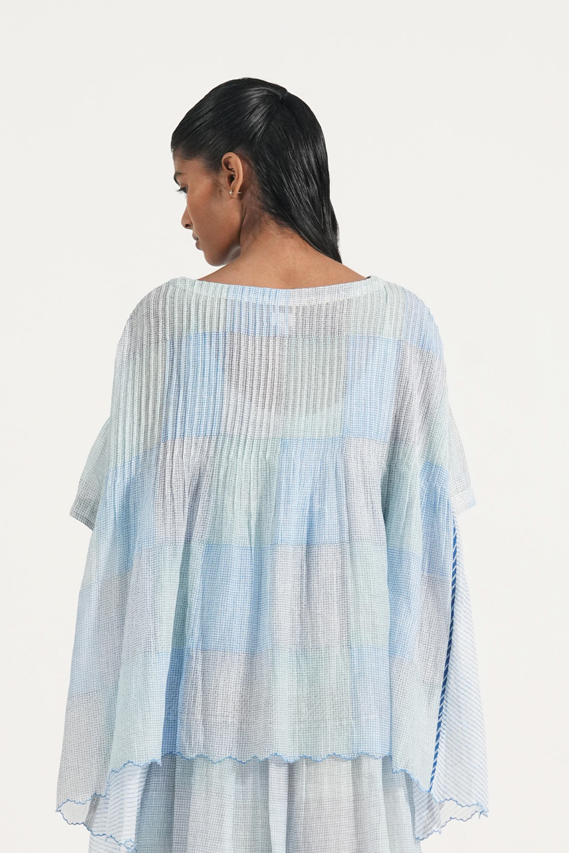 Relaxed fit pintuck top with hand block printed- multicolor checks. Comes with a complimentary lining.