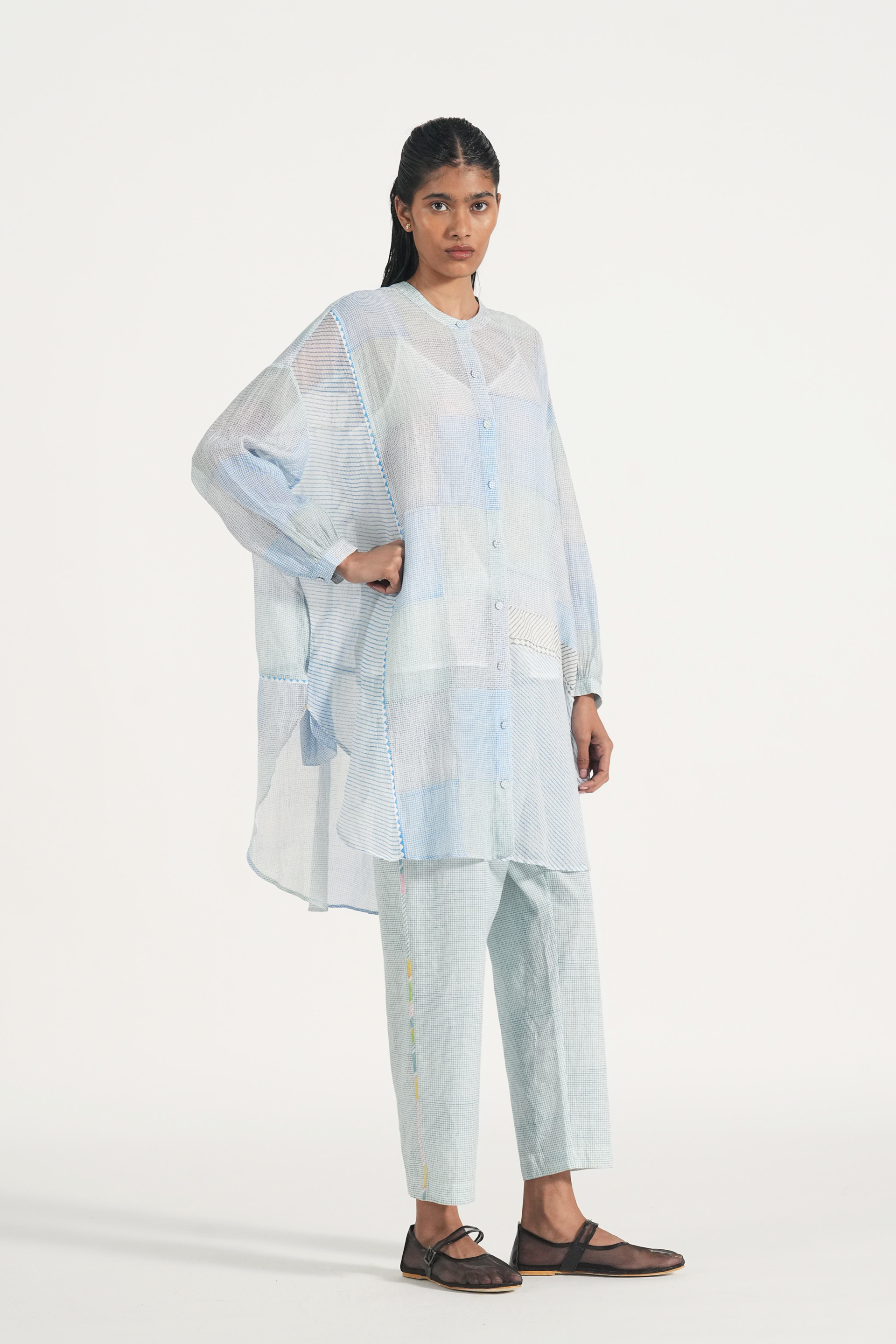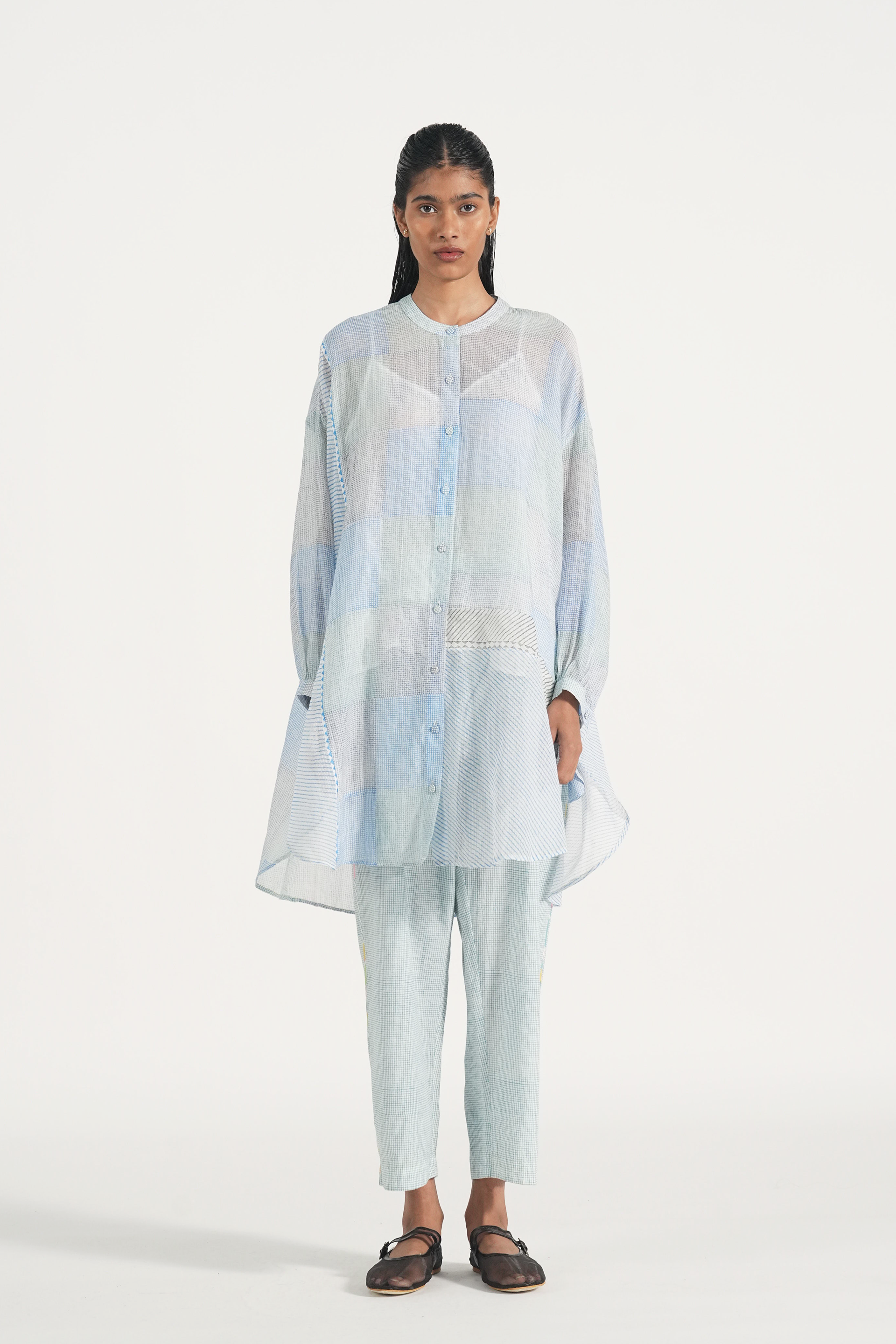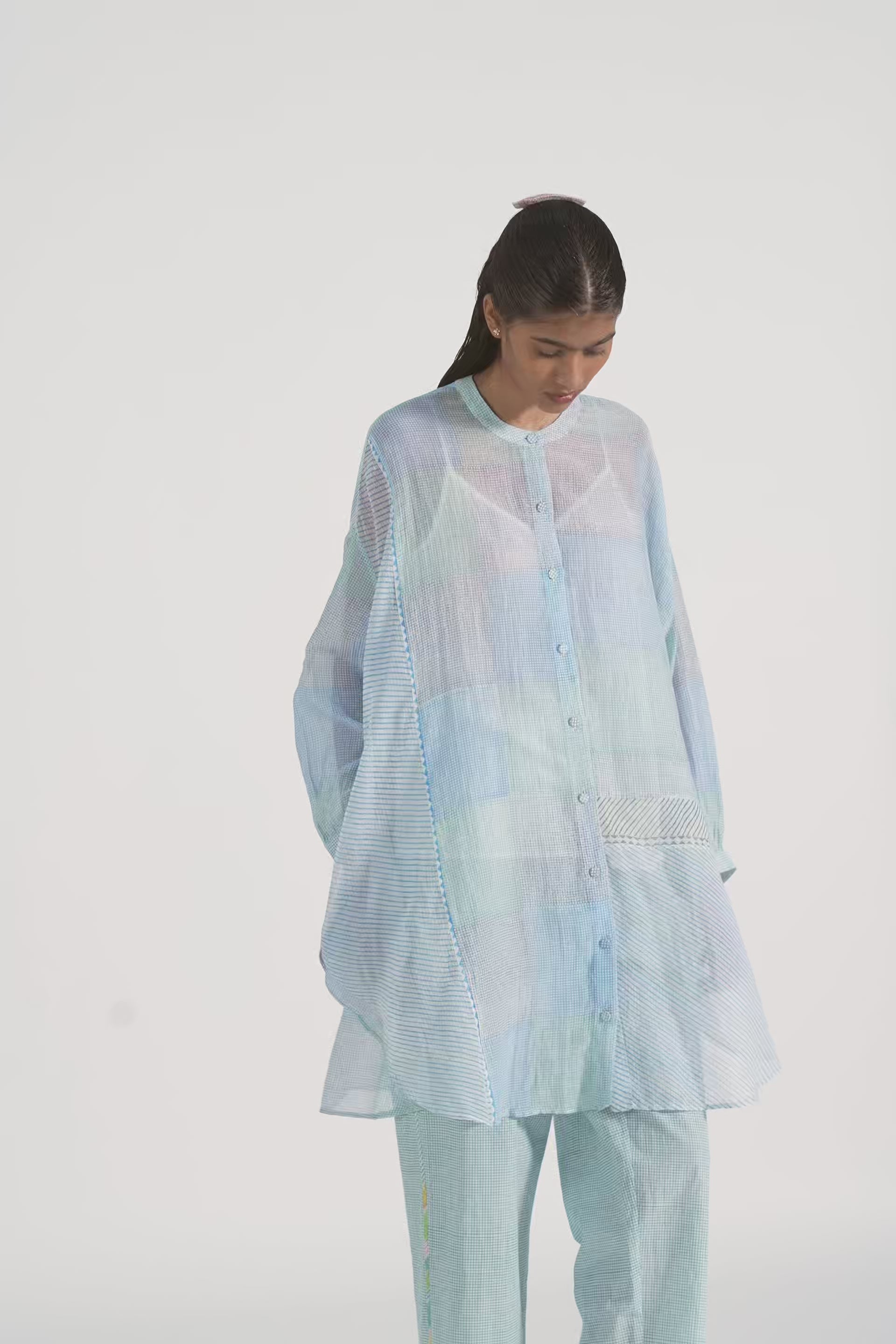 Oversized long summer shirt in patchwork handblock printed fine checks and diagonal stripes, finished with piping details. Comes with a complimentary lining and a pair of pants.