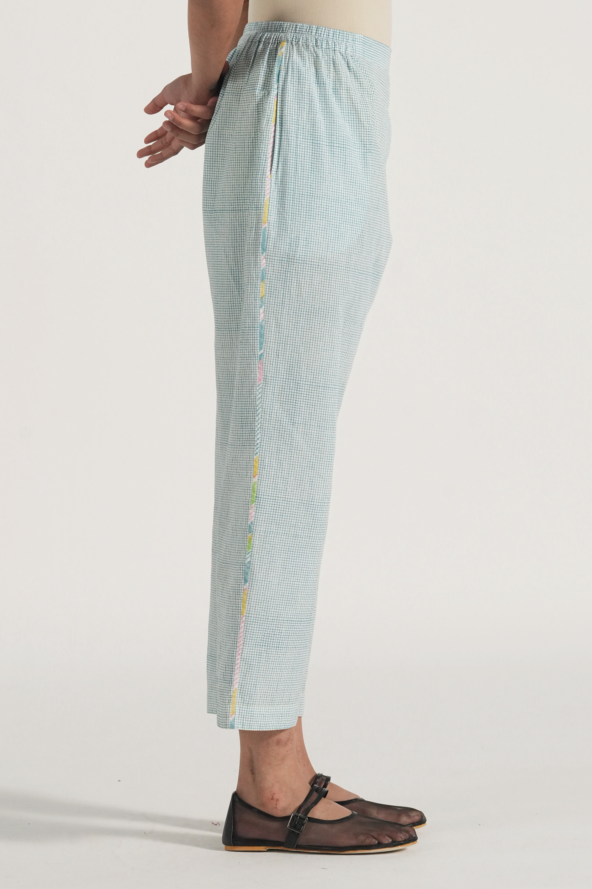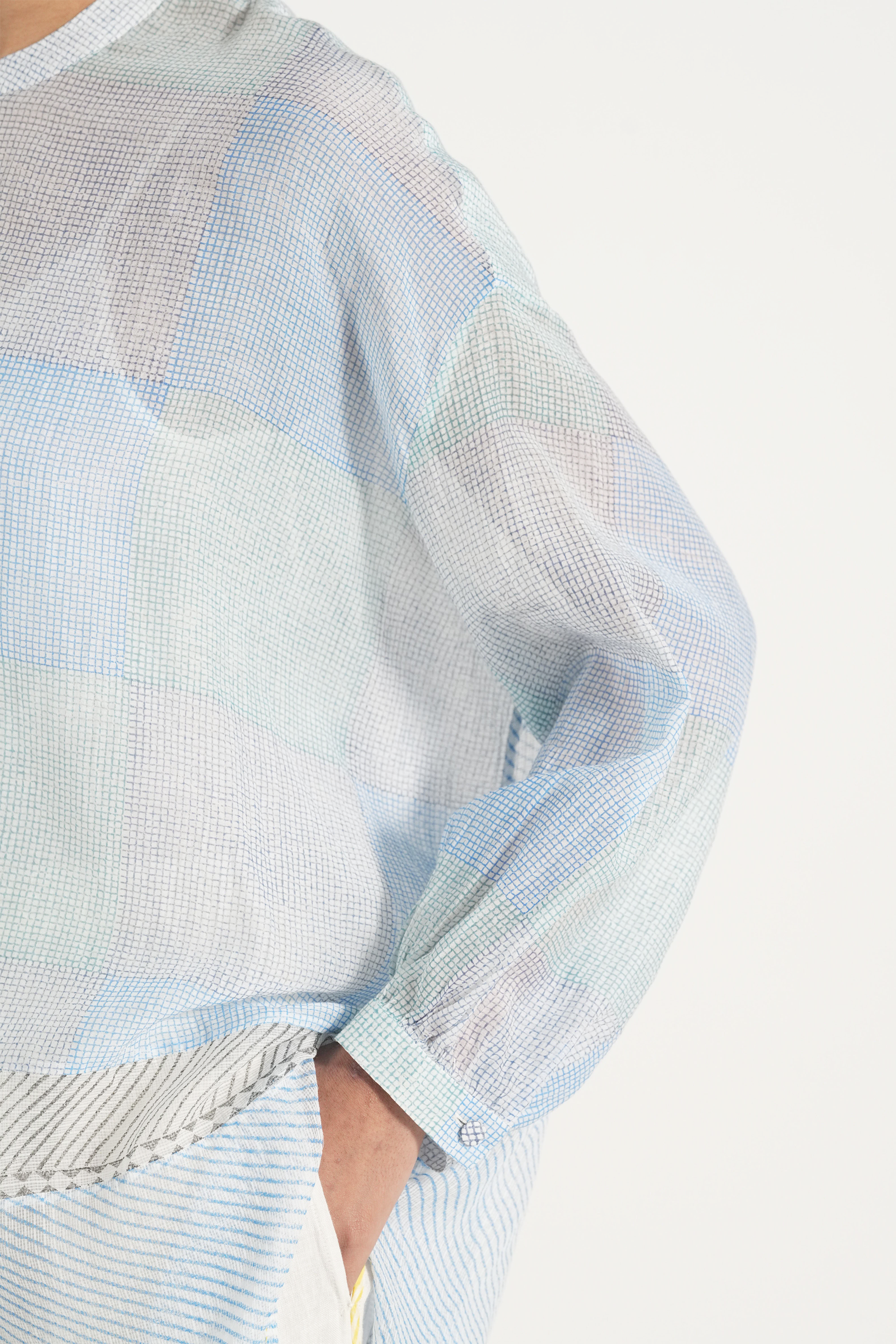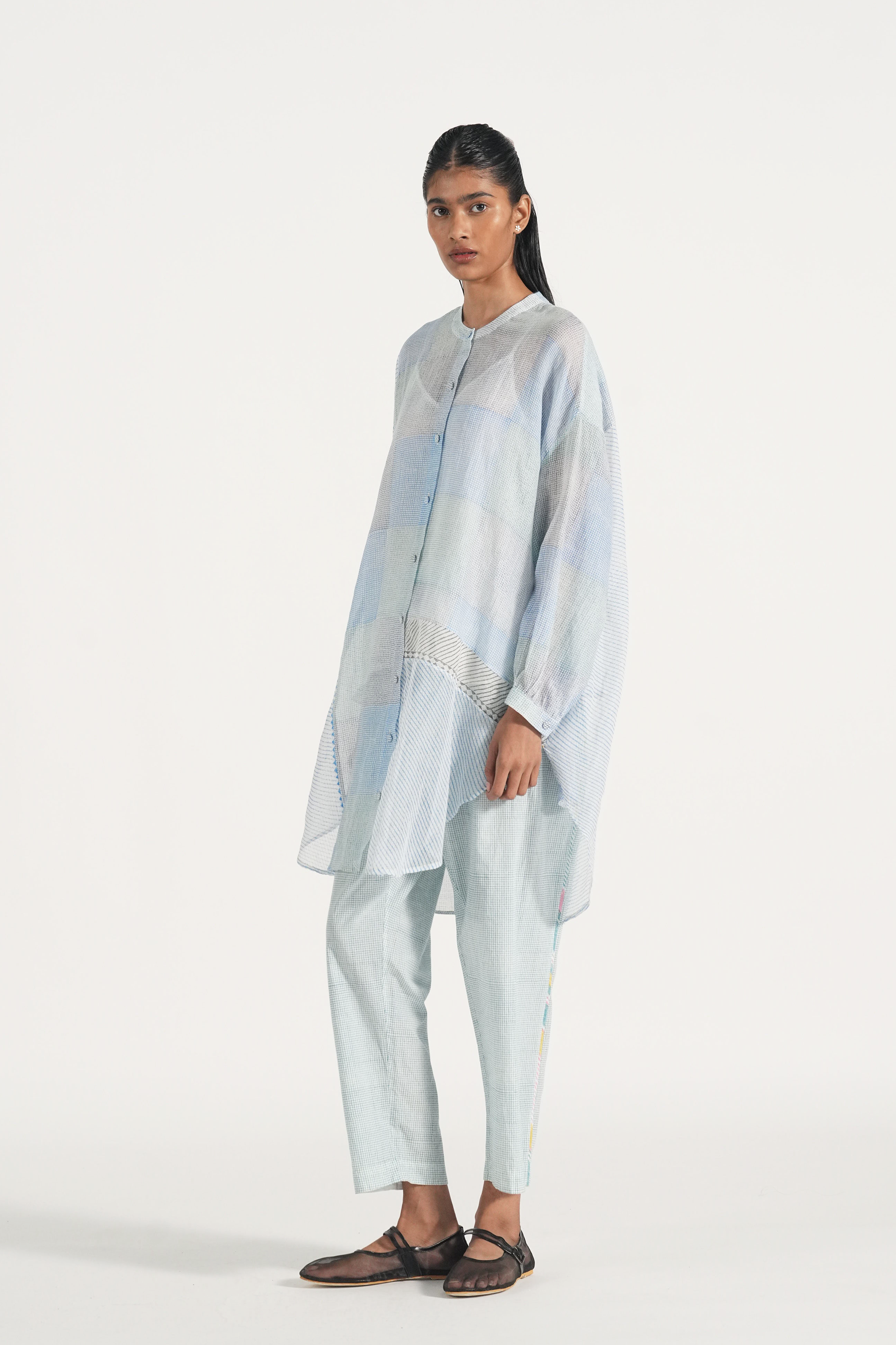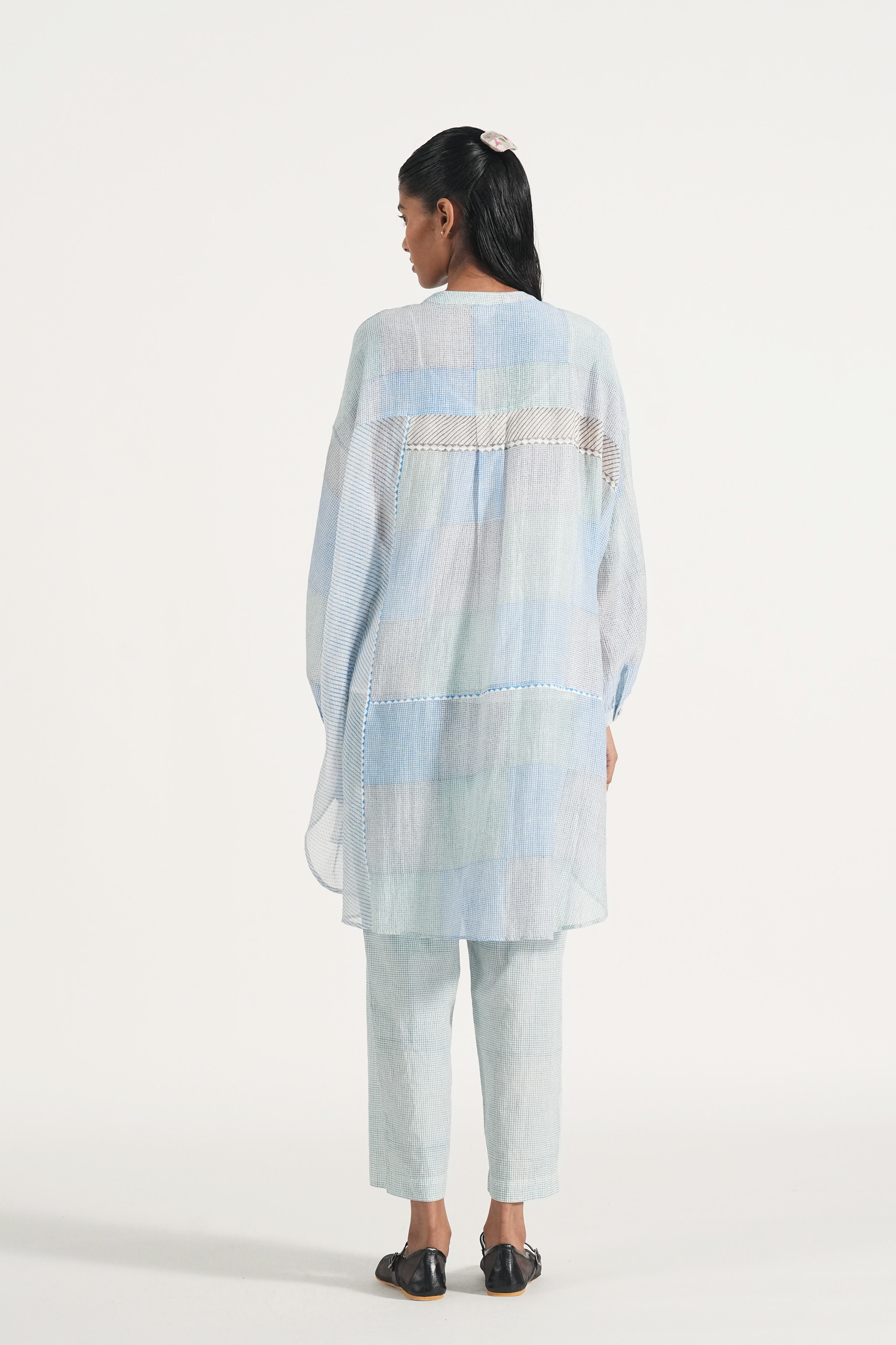 Oversized long summer shirt in patchwork handblock printed fine checks and diagonal stripes, finished with piping details. Comes with a complimentary lining and a pair of pants.