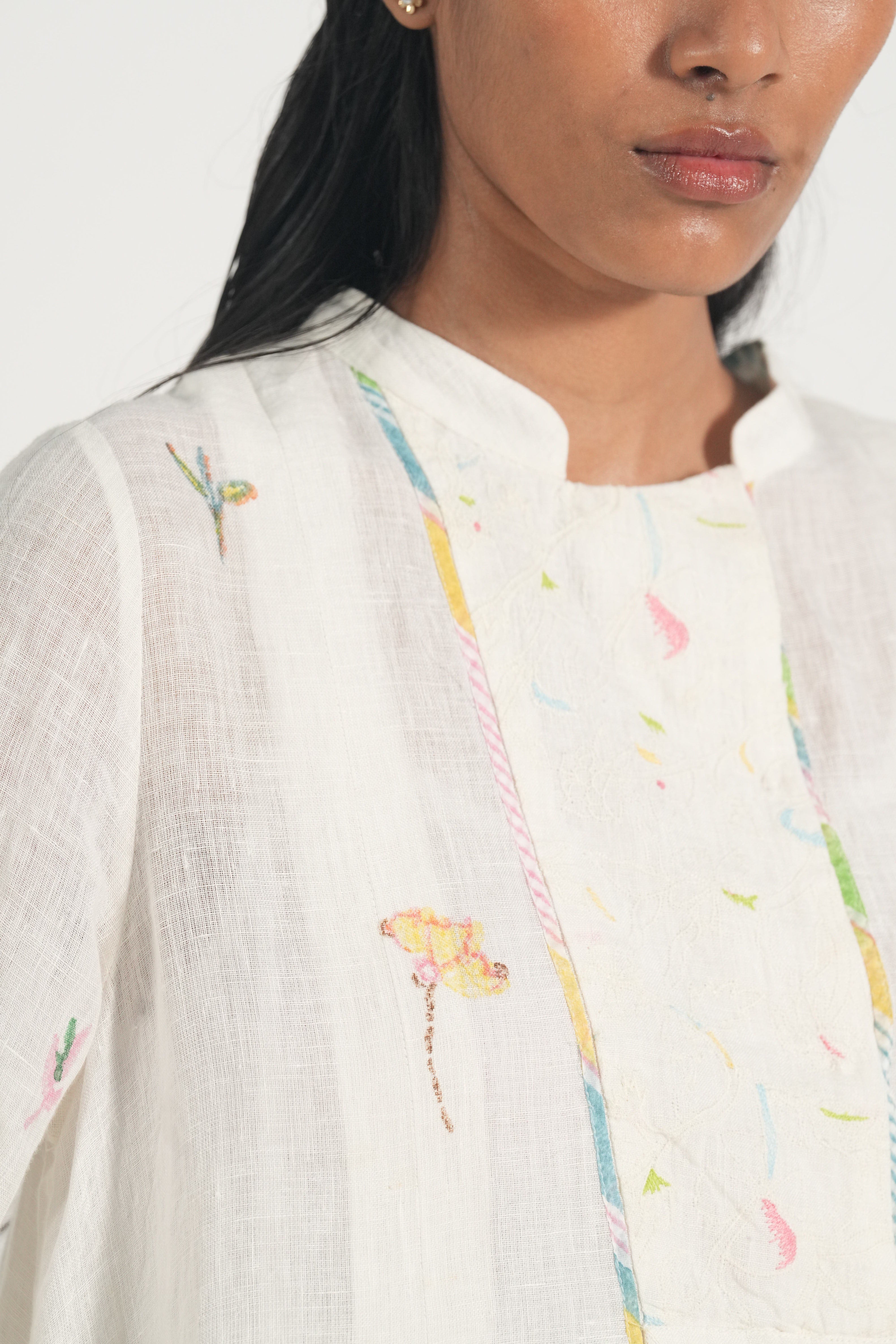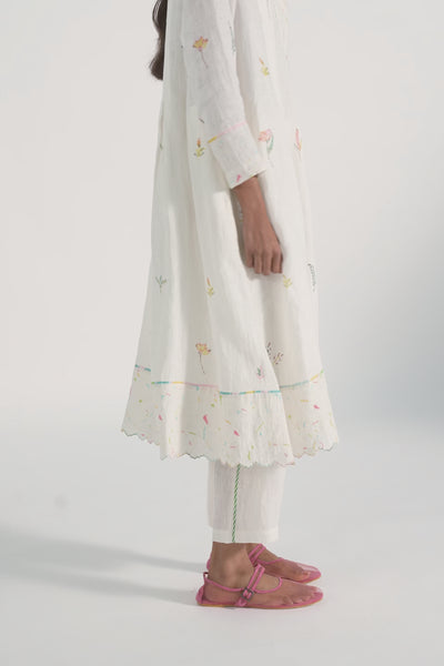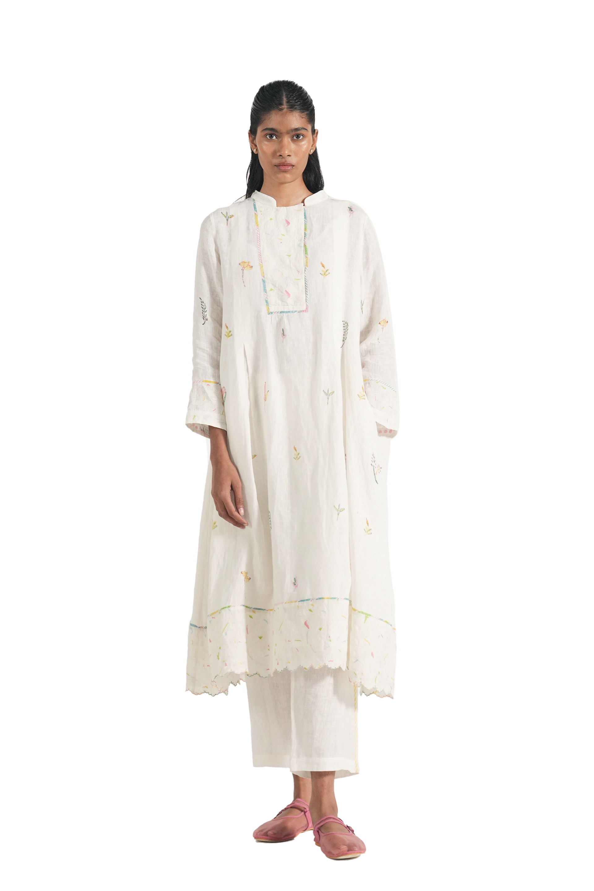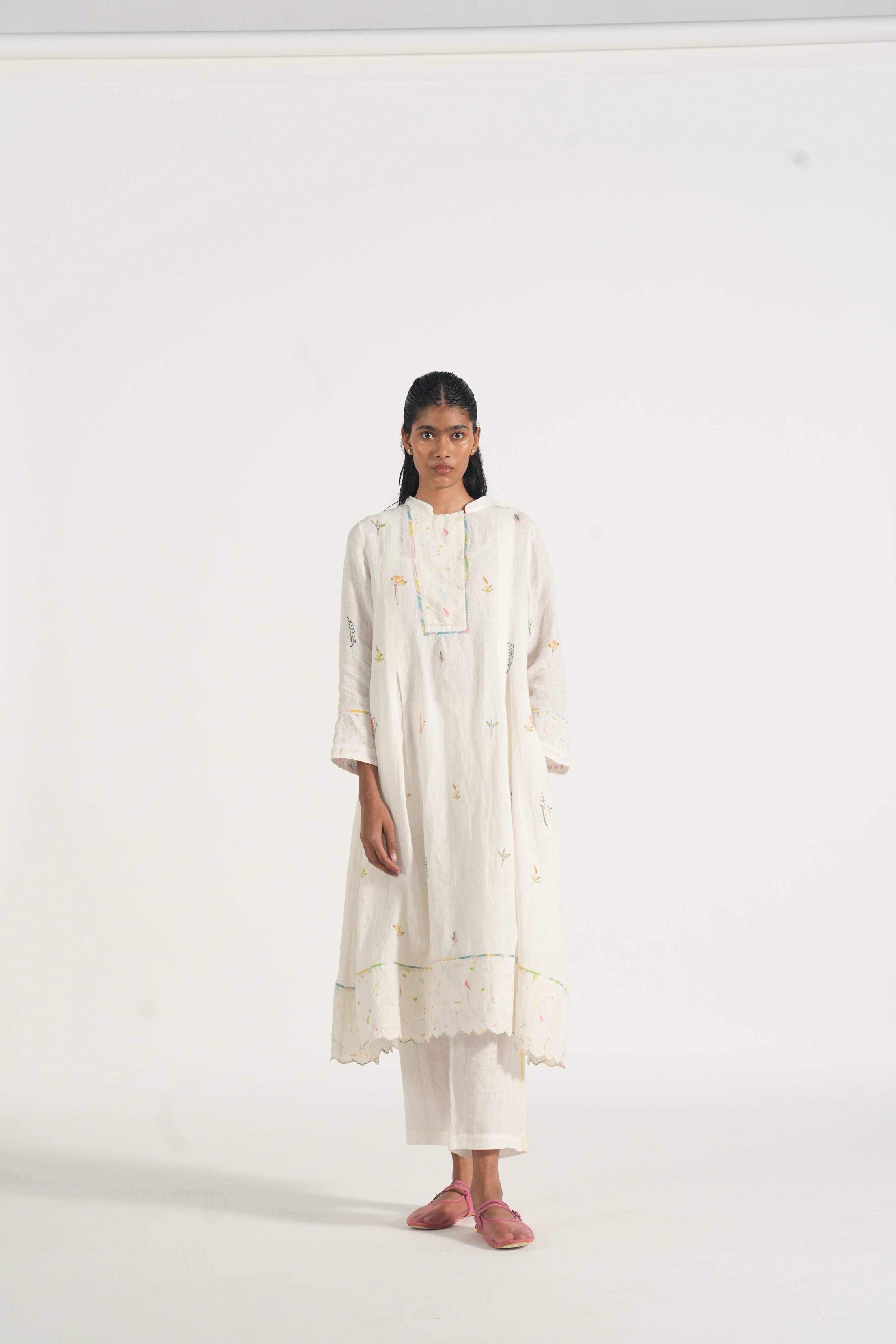 Mandarin collar straight kurta with embroidery and binding details in the placket and hemline, comes along with a pair of white pants with scallop detail.