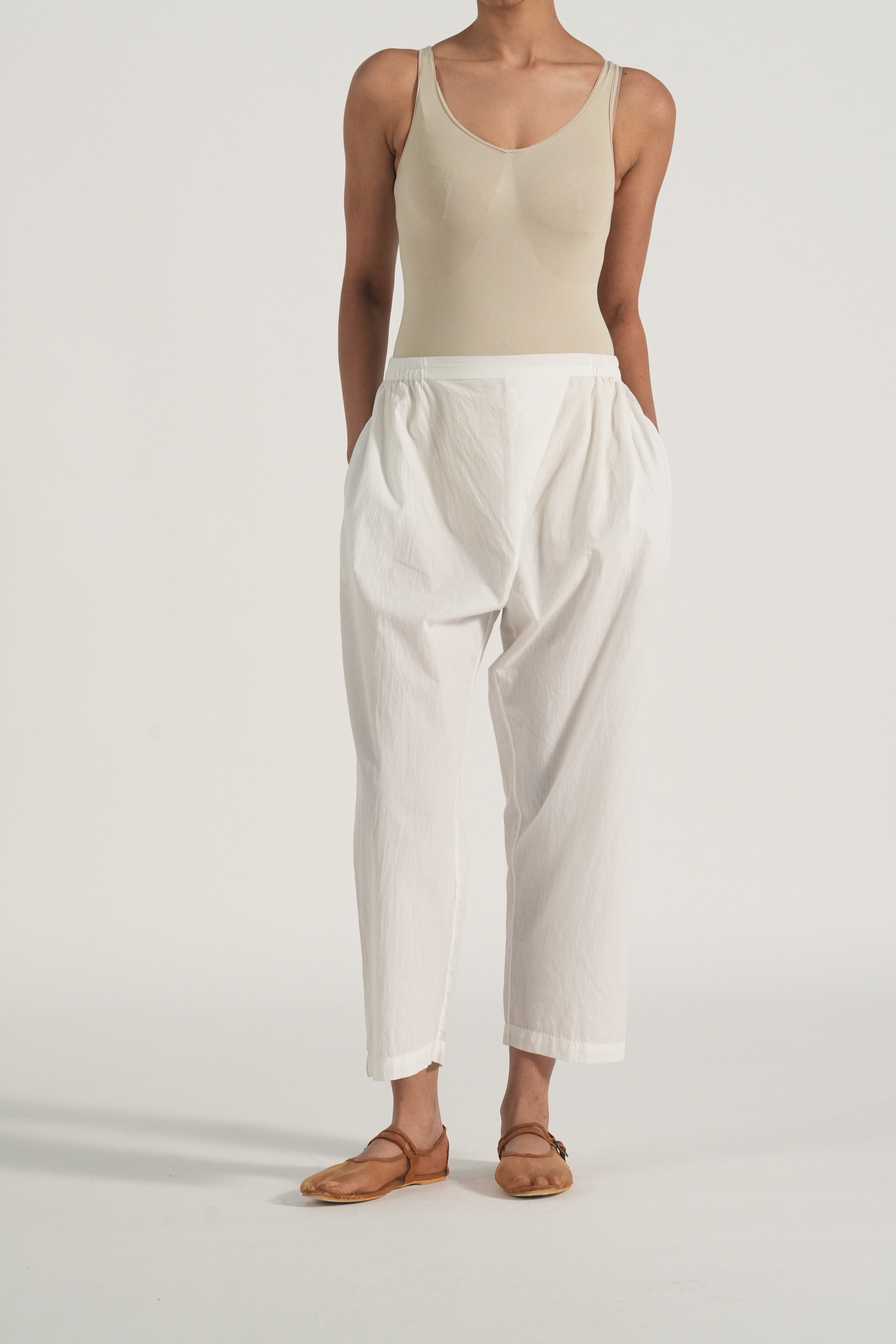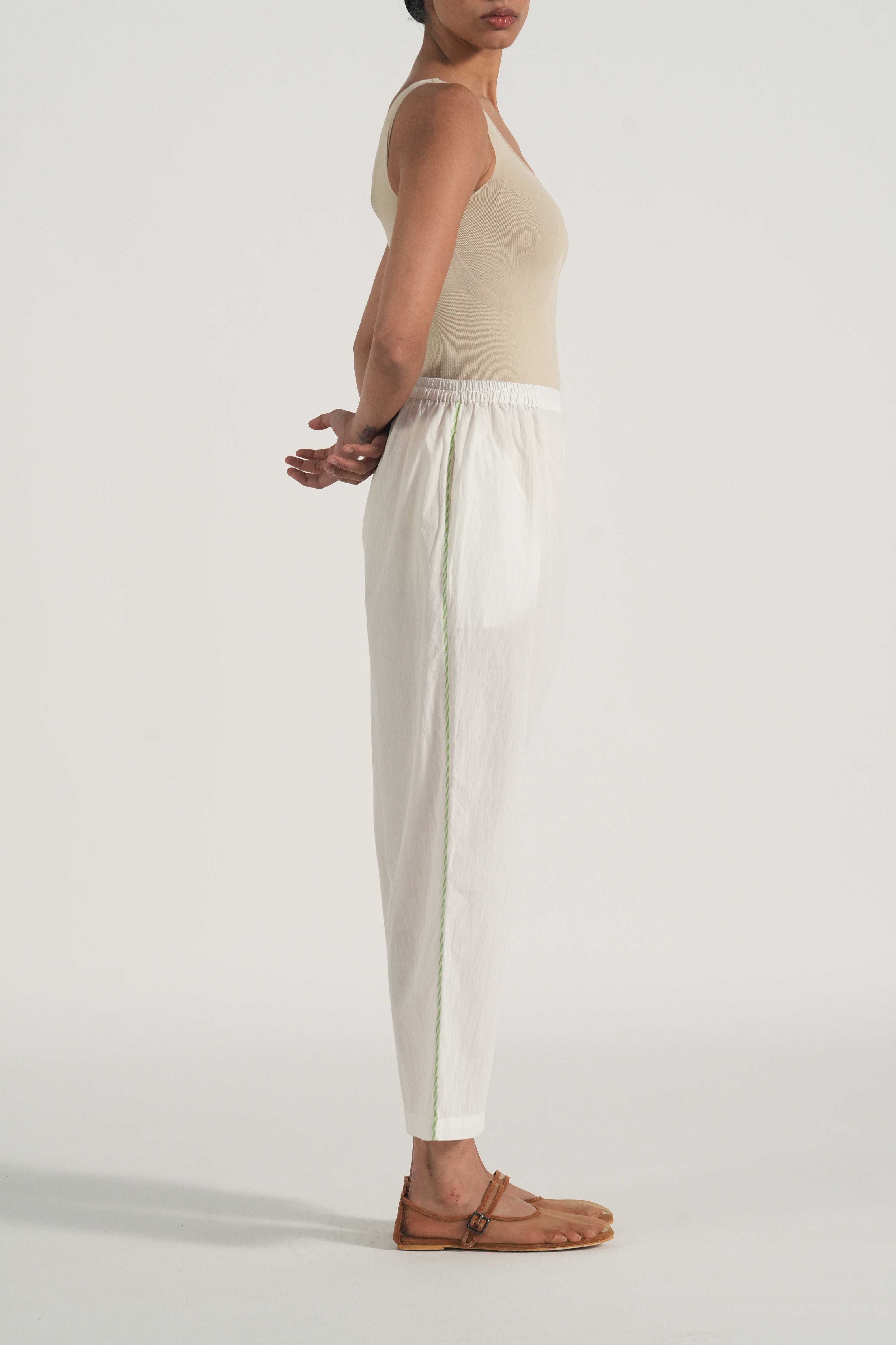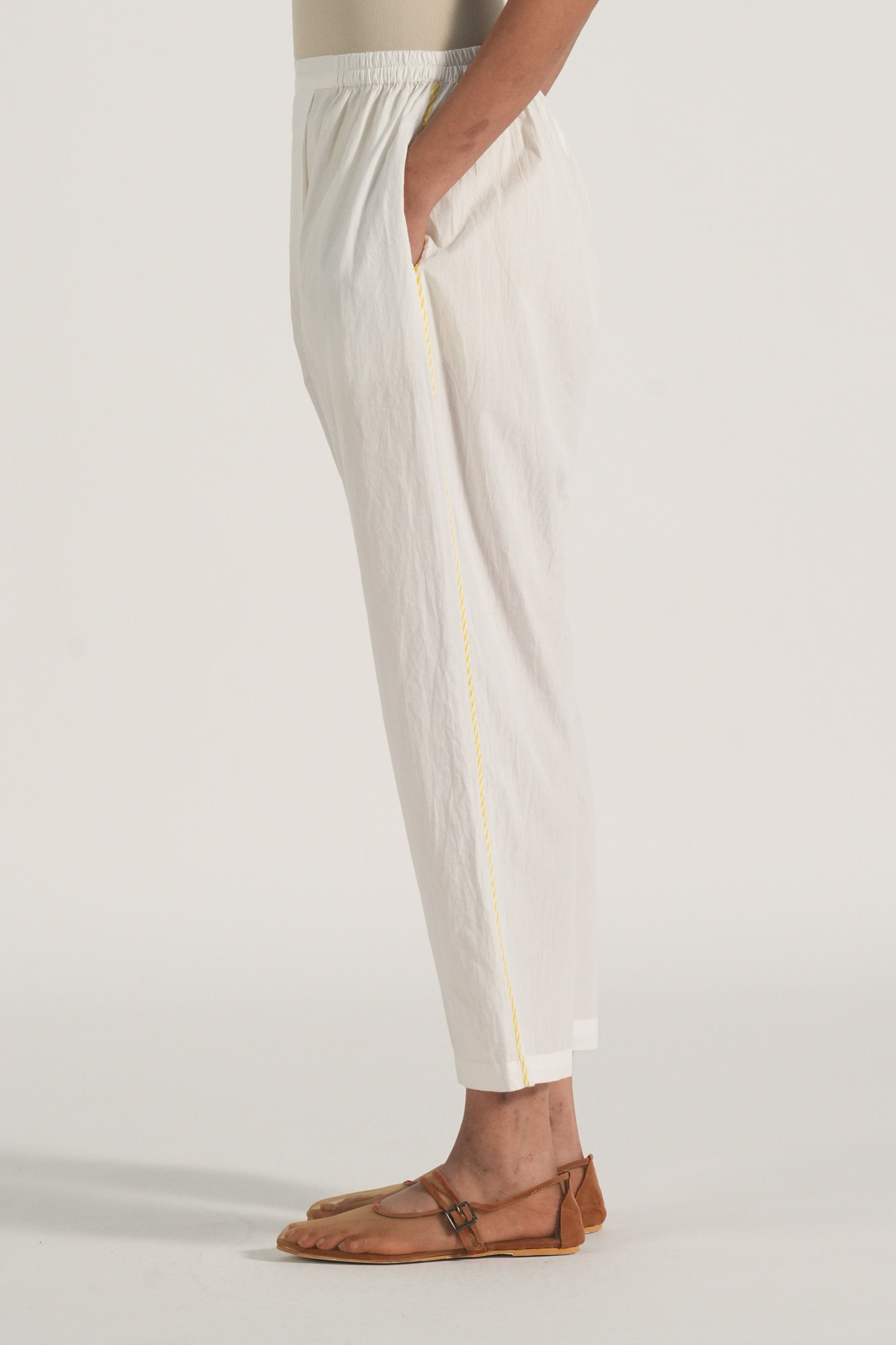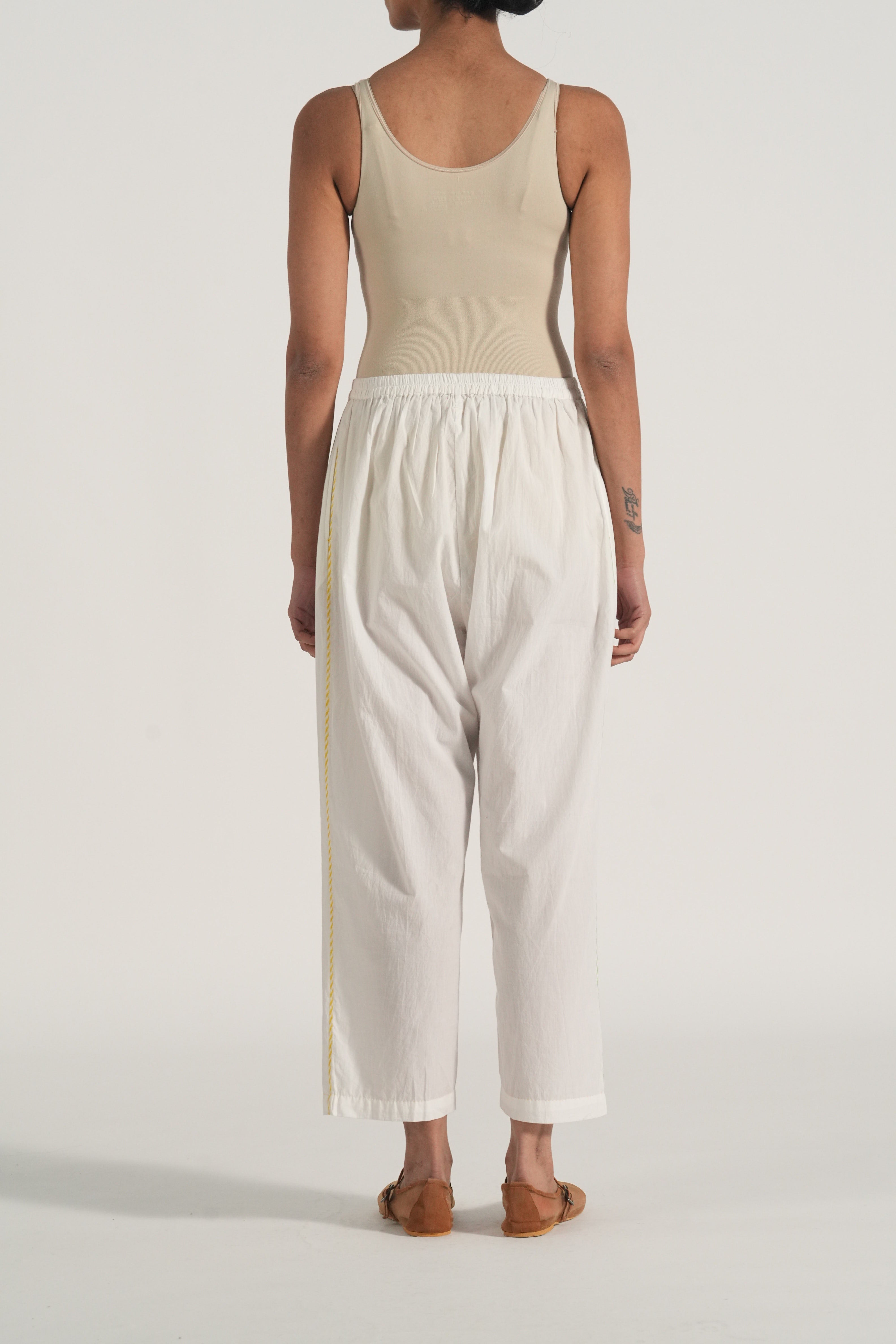 Mandarin collar straight kurta with embroidery and binding details in the placket and hemline, comes along with a pair of white pants with scallop detail.