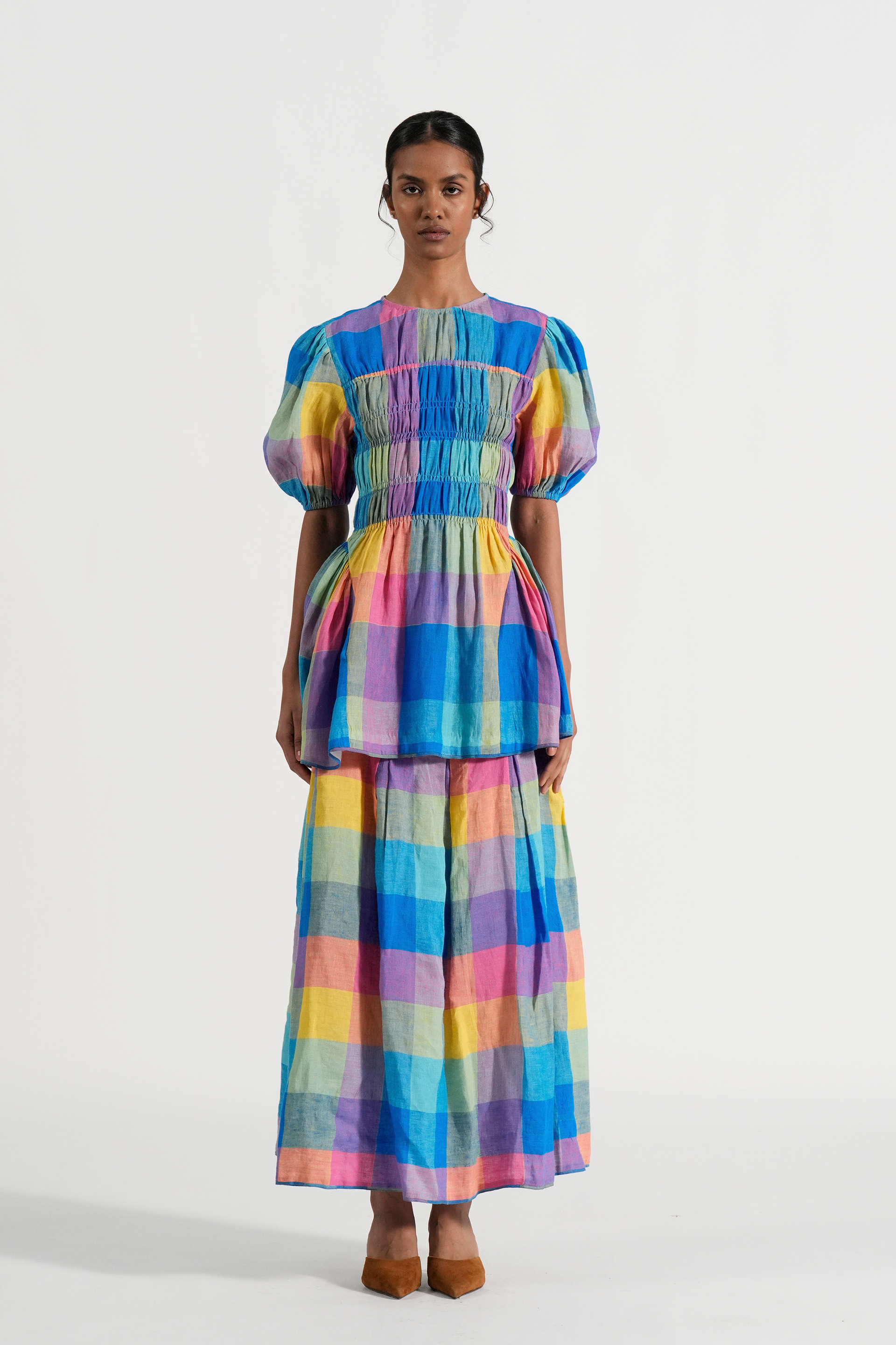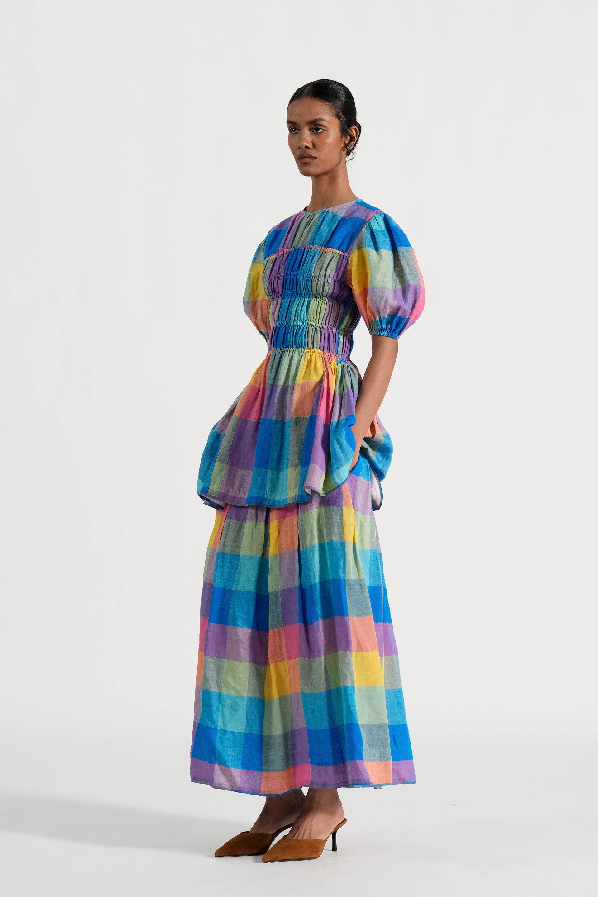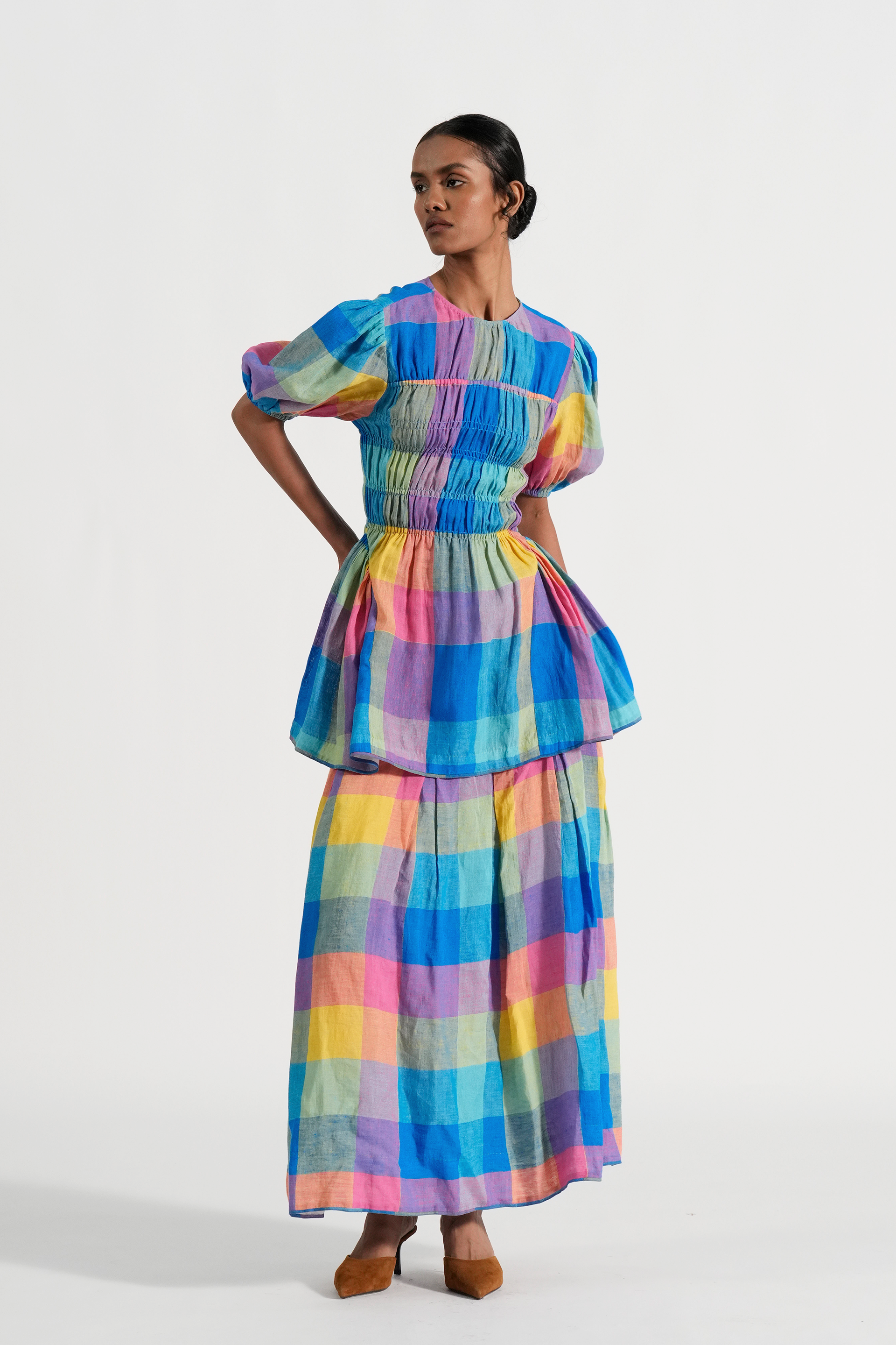 Pleated midi skirt in multicolor linen chunky checks. Not lined