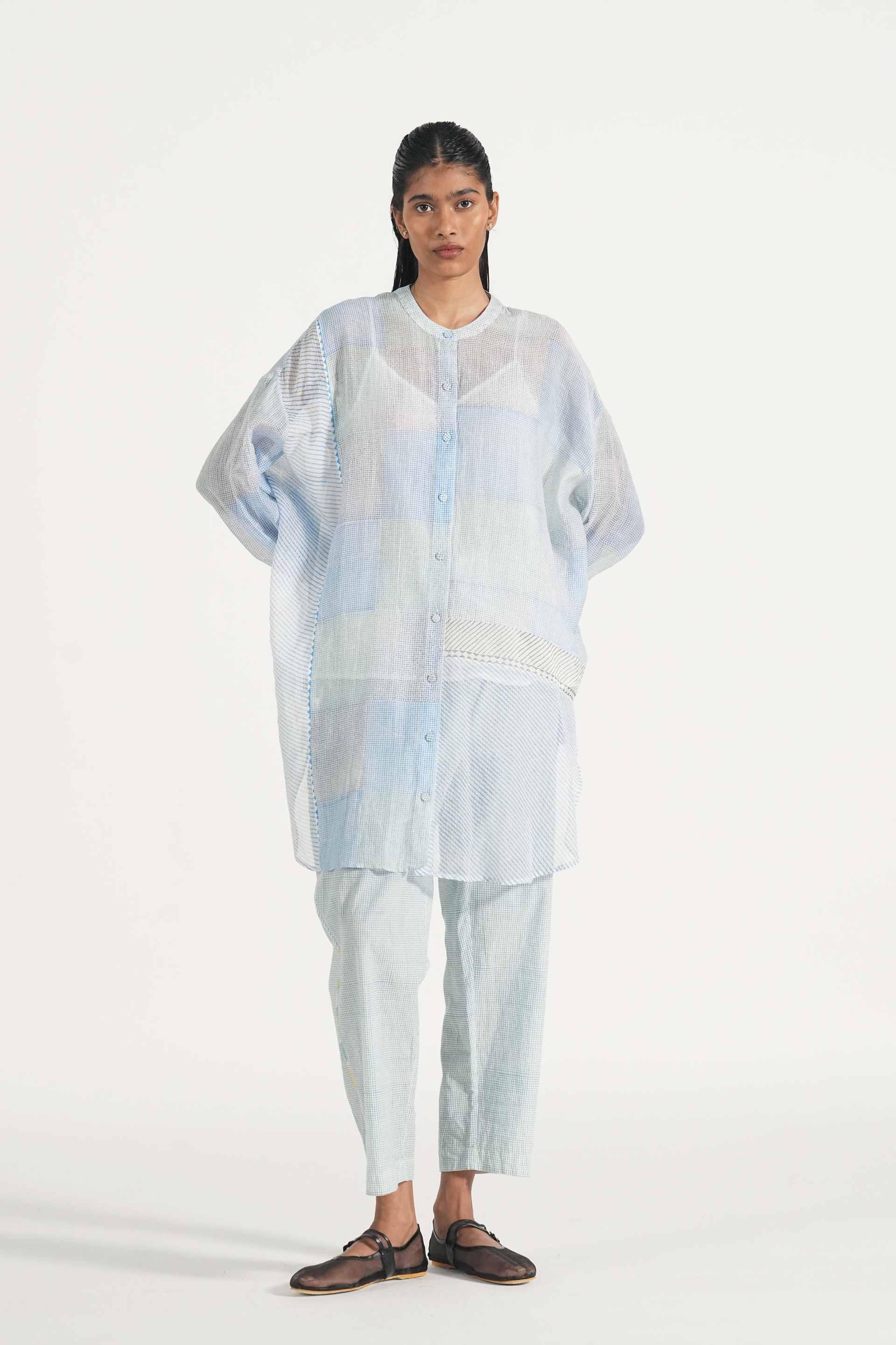 Straight fit pants in hand blocked checks print accentuated with multicolor block print binding on the side seams