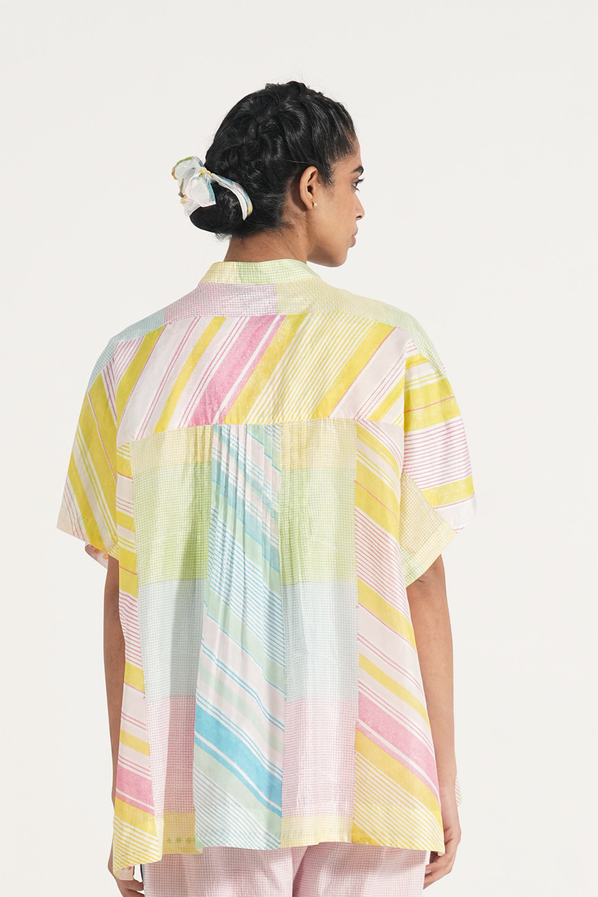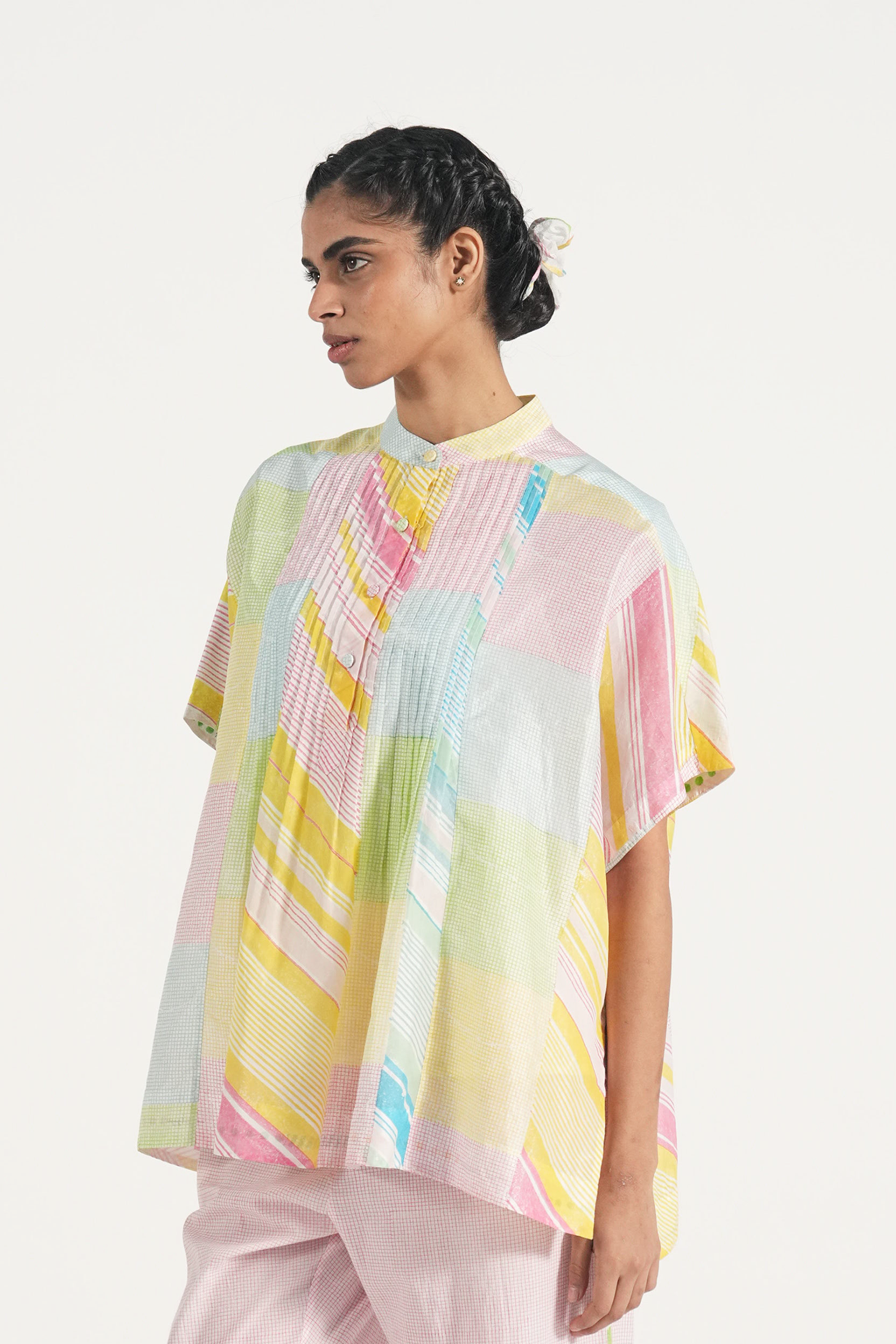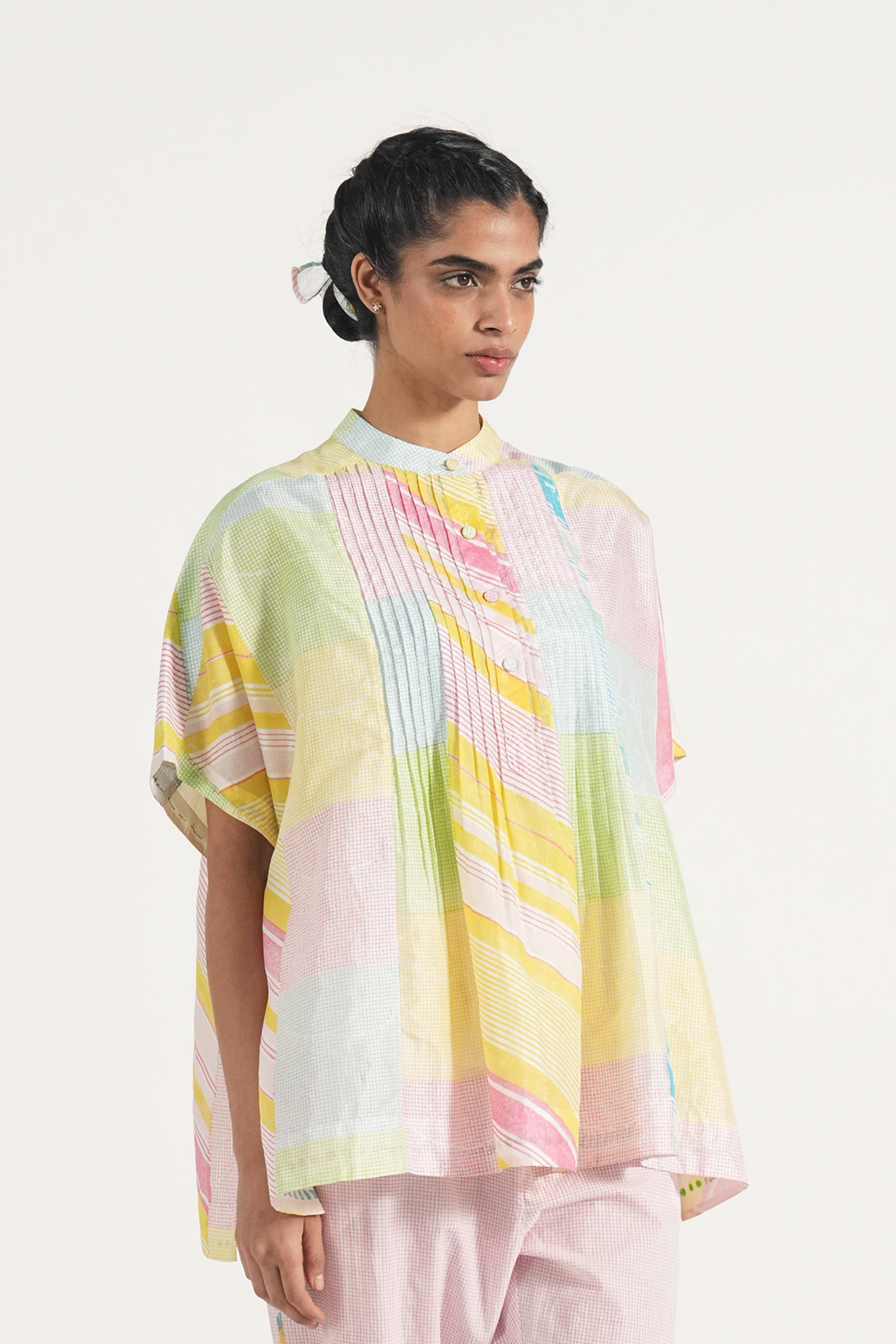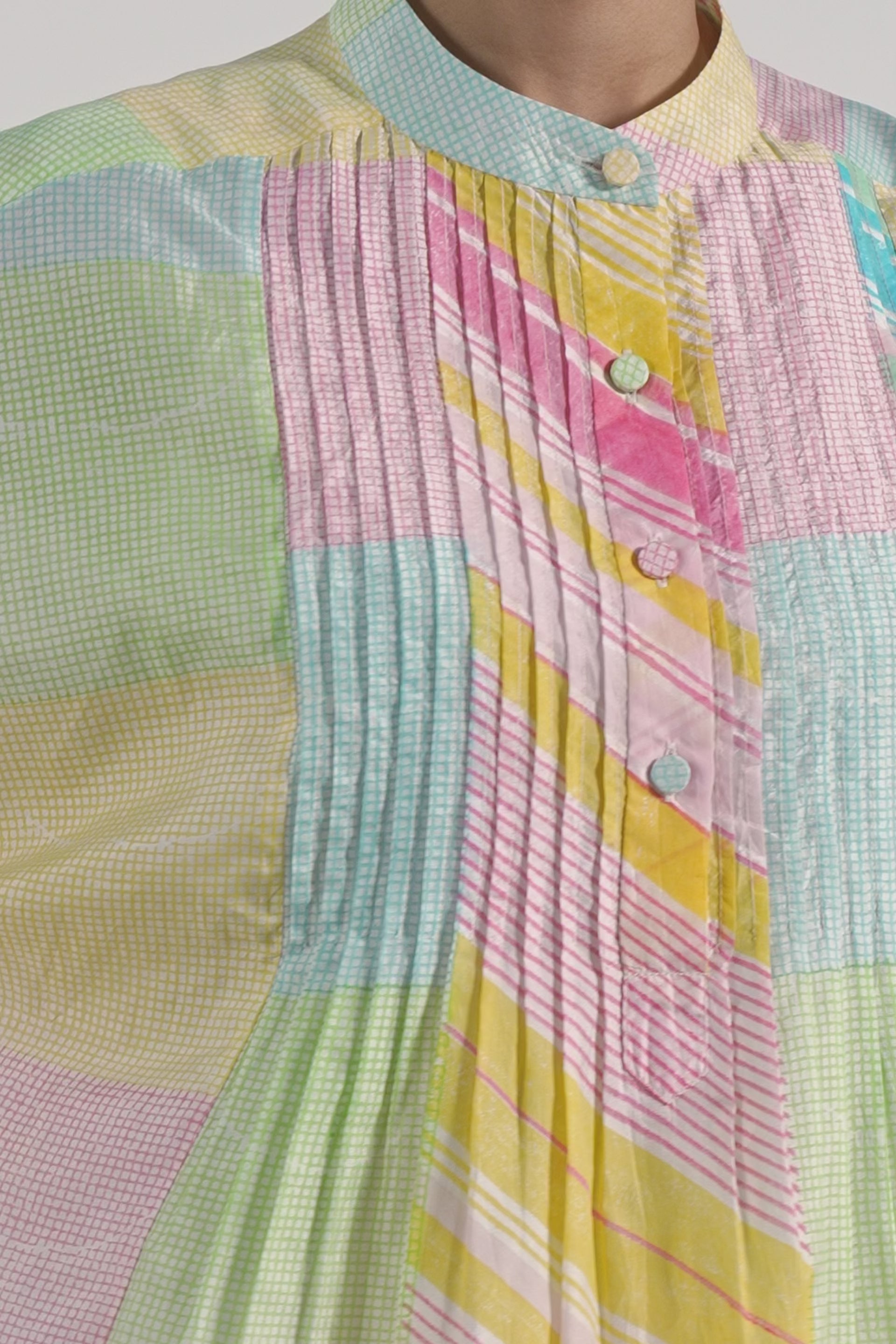 Front open pintuck top in hand block printed fine checks and diagonal stripe.