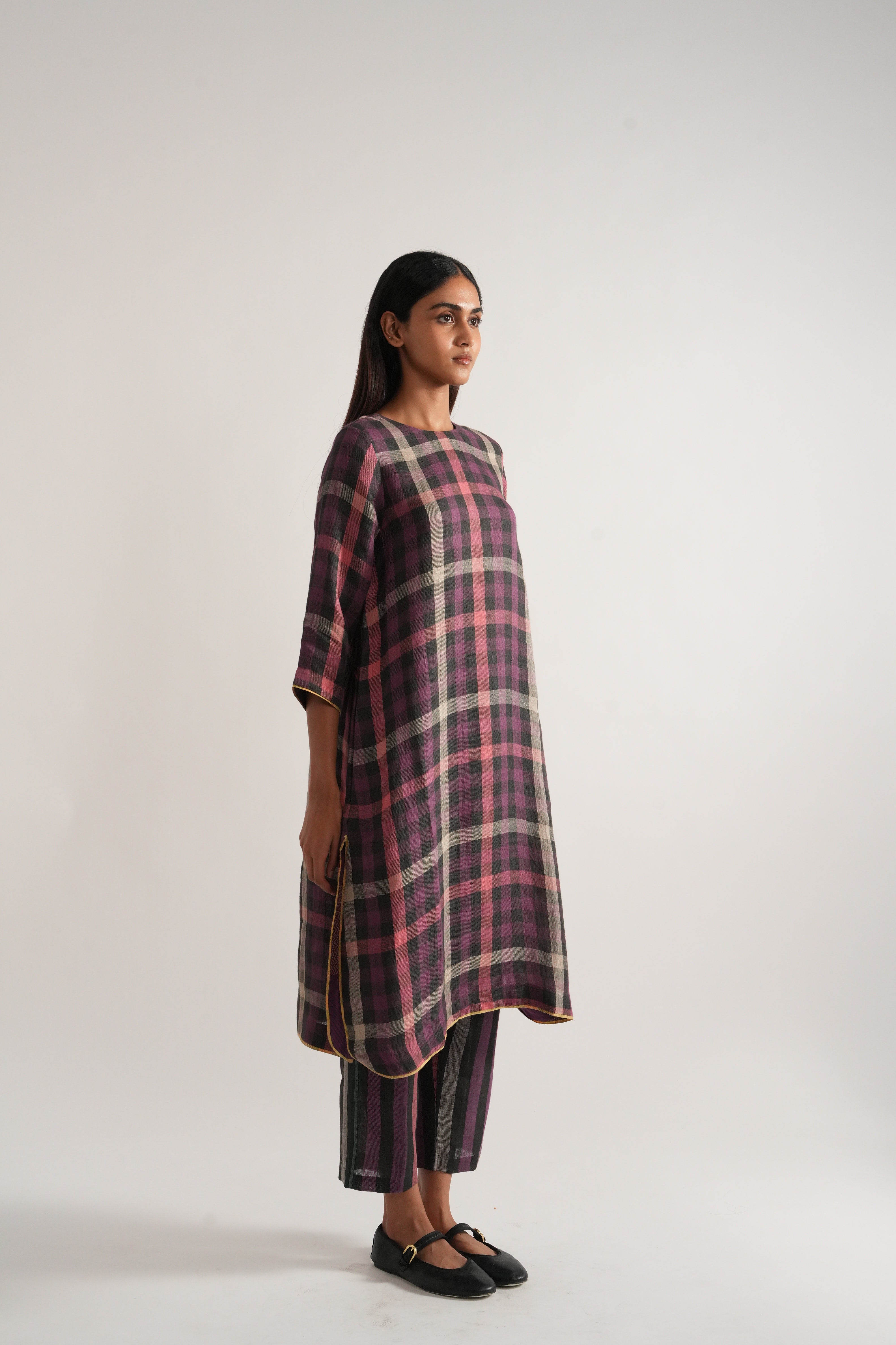 Straight fit round hem kurta in handwoven wool linen yarn dyed checks comes as a set with a pair of straight fit striped pants