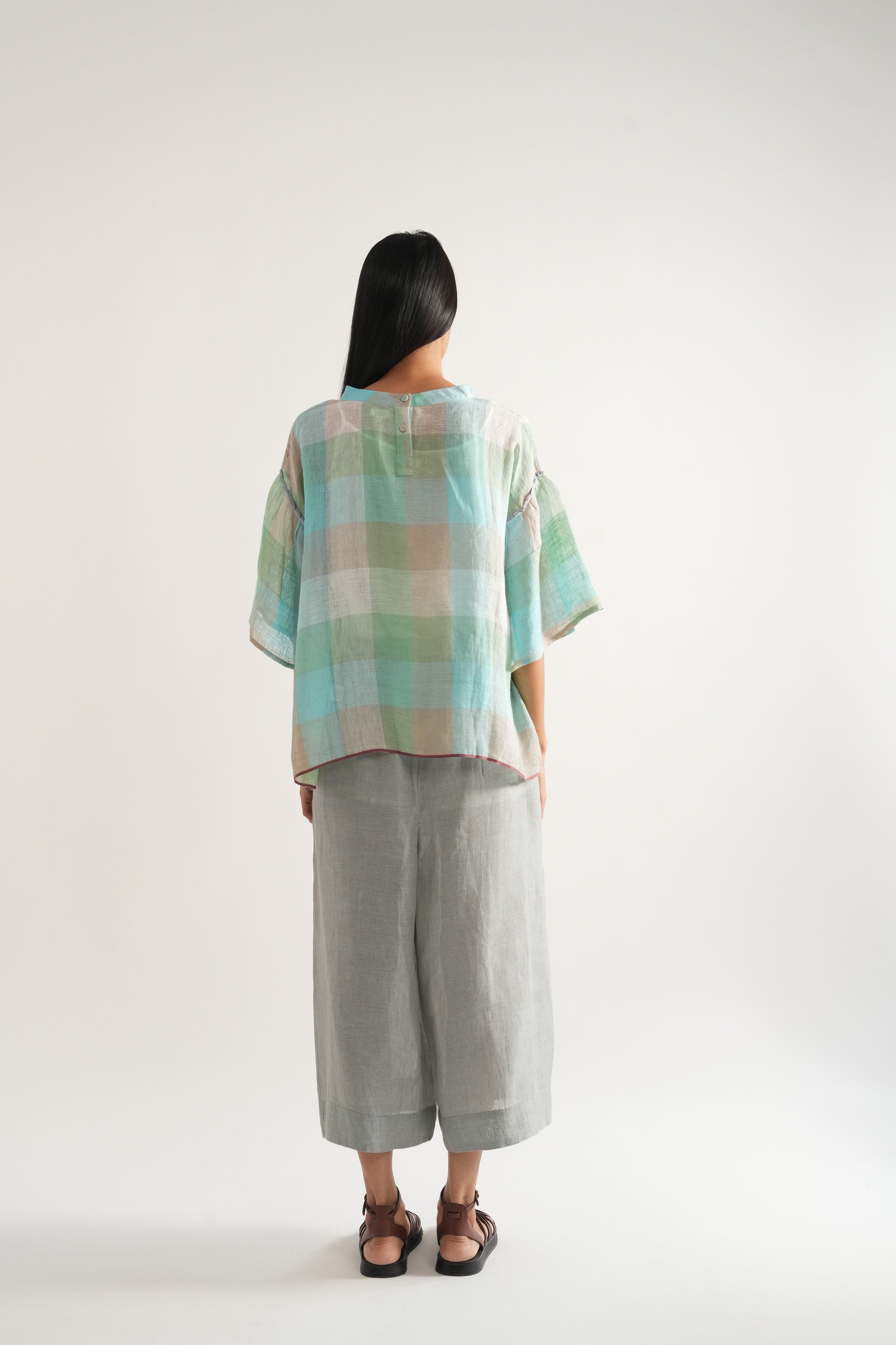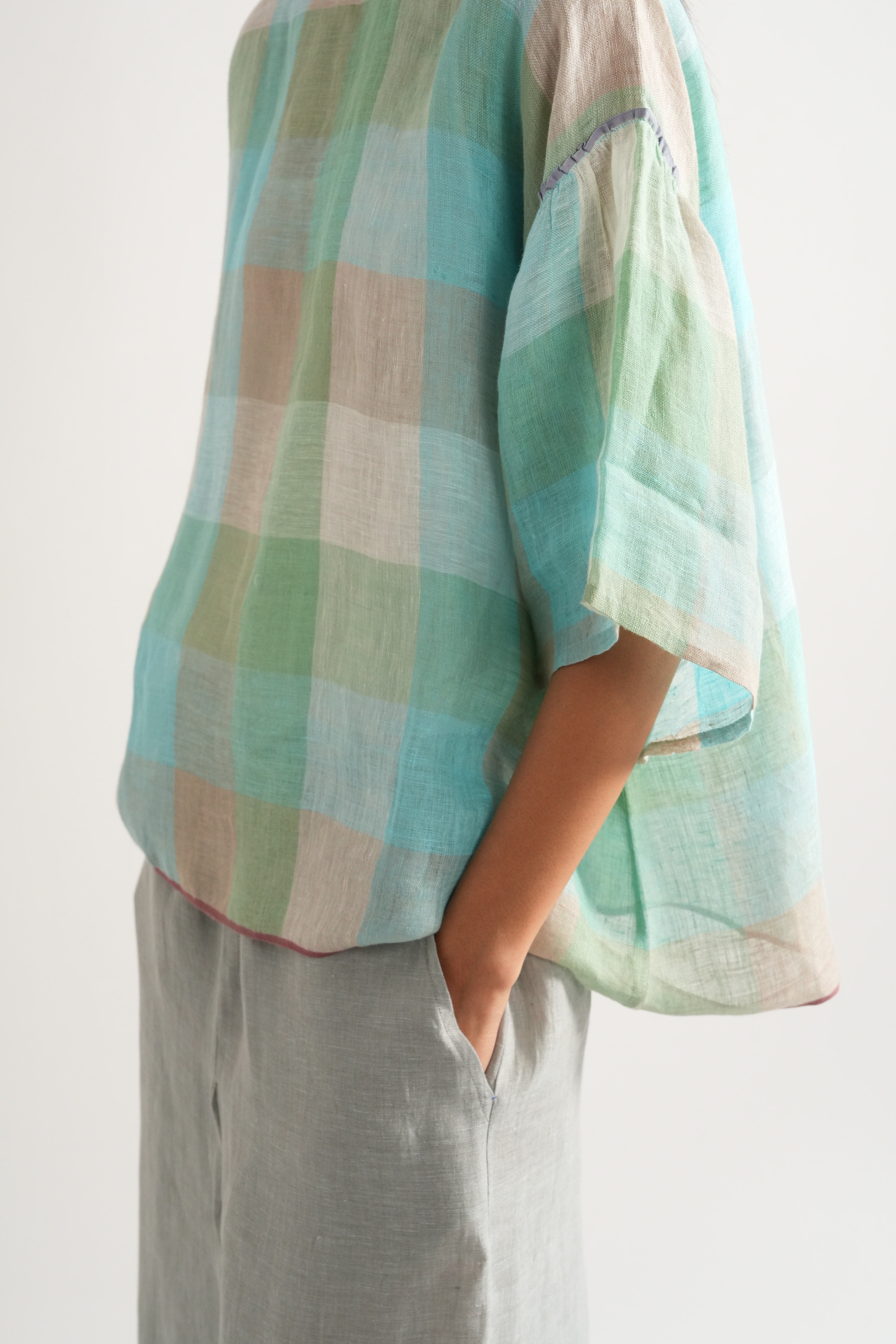 Relaxed fit short summer top in handwoven linen checks with selvage details comes with a pair of relaxed fit culottes