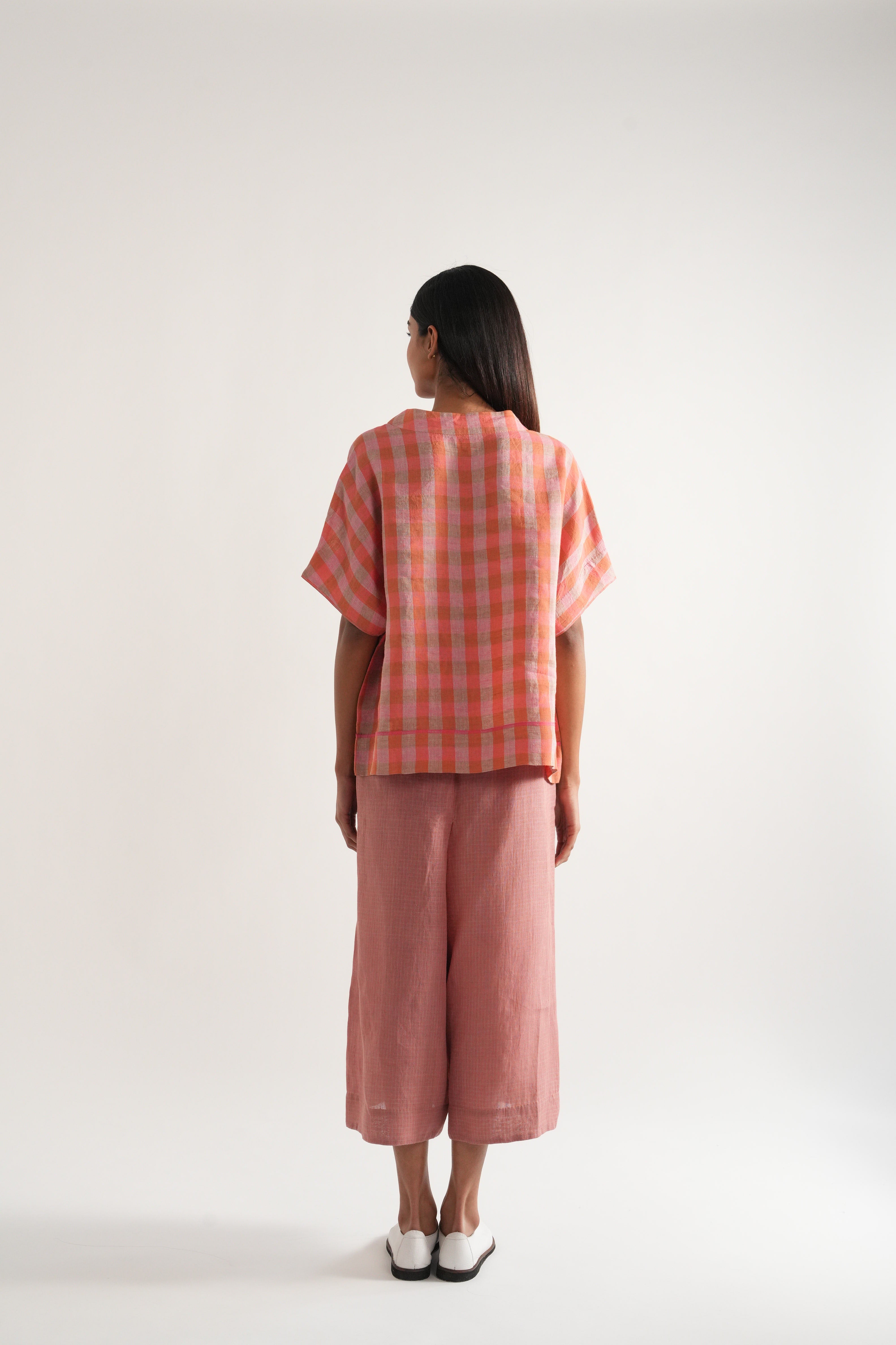 Relaxed fit short summer top in handwoven linen checks with selvage details comes with a pair of relaxed fit culottes